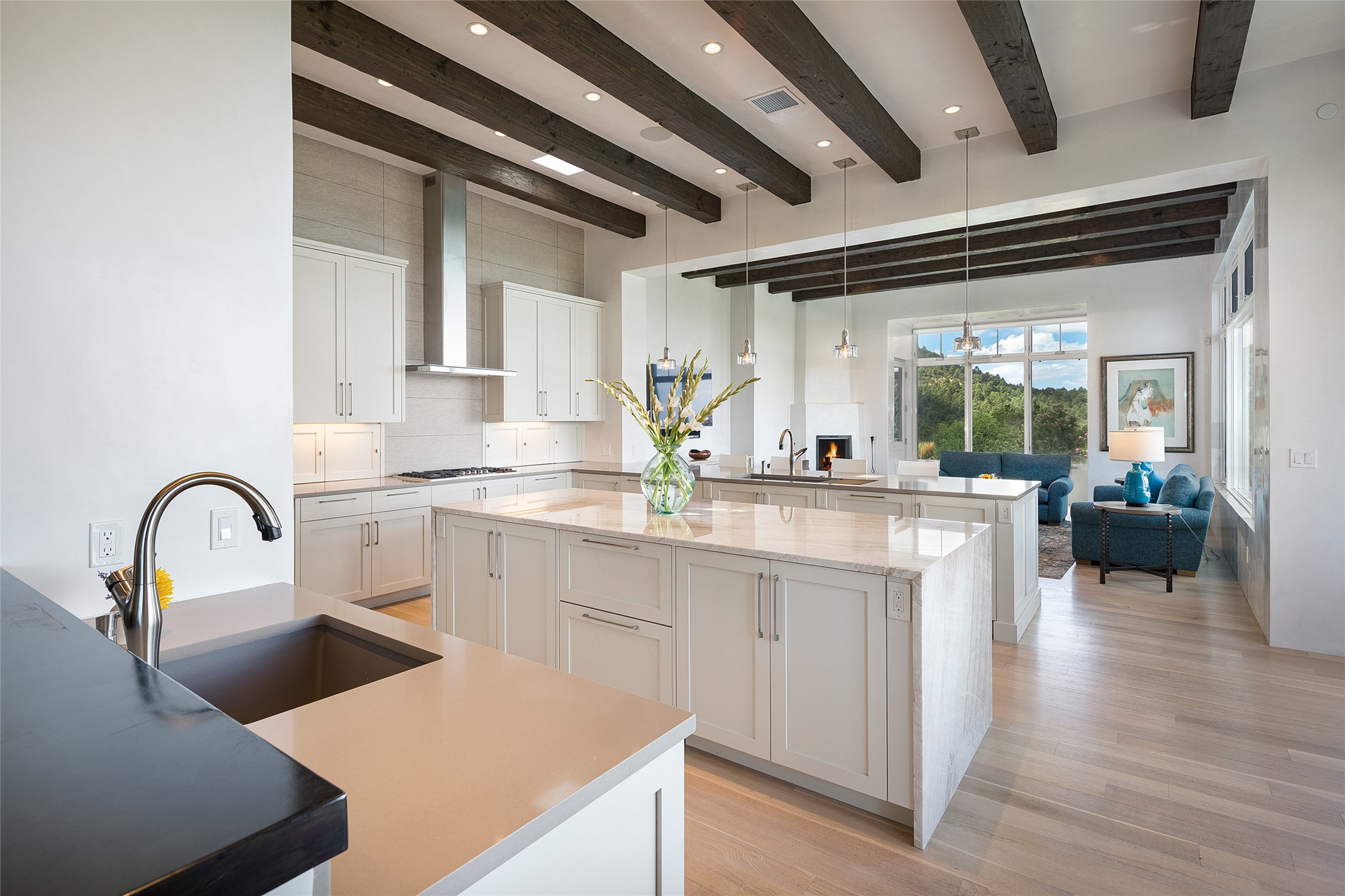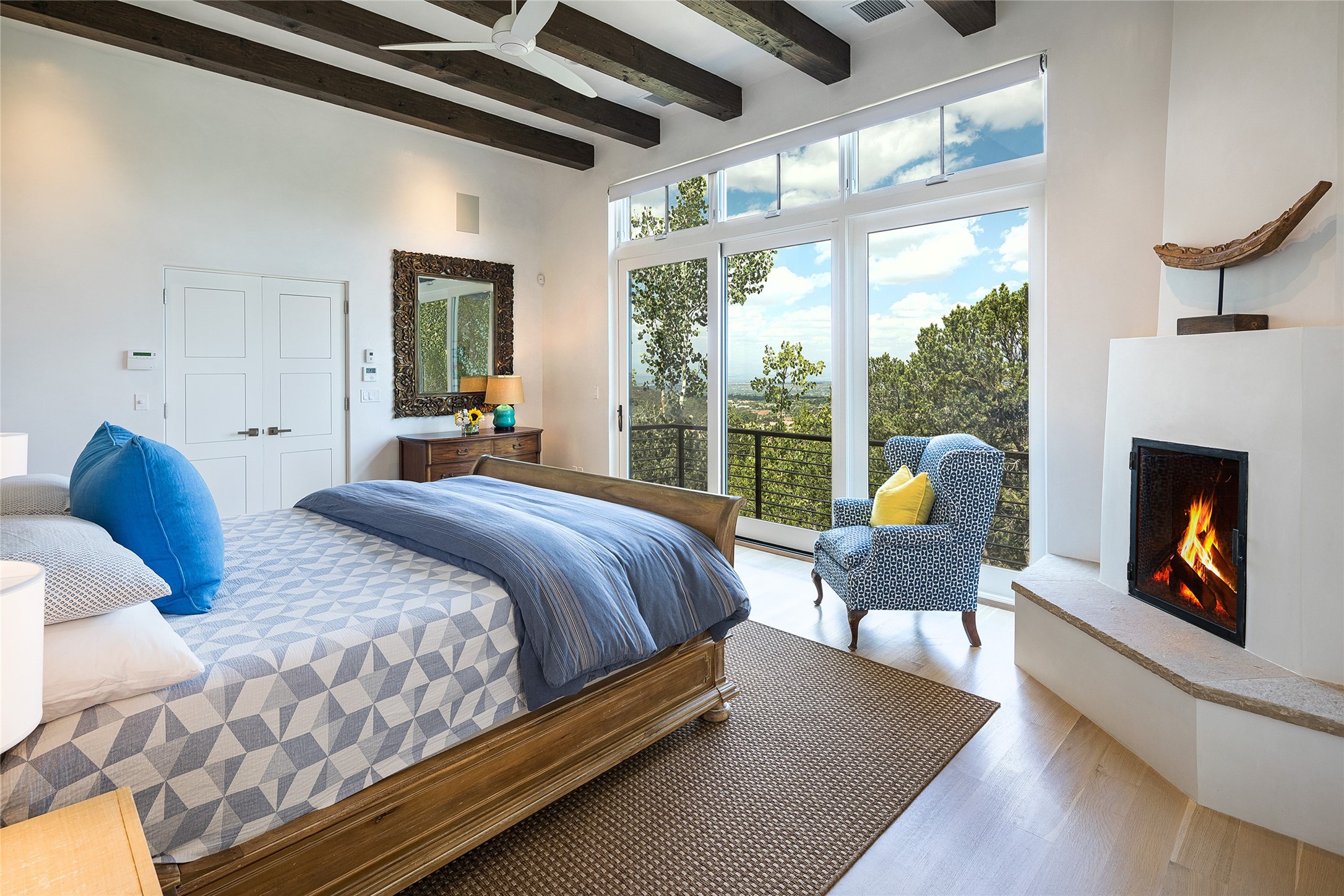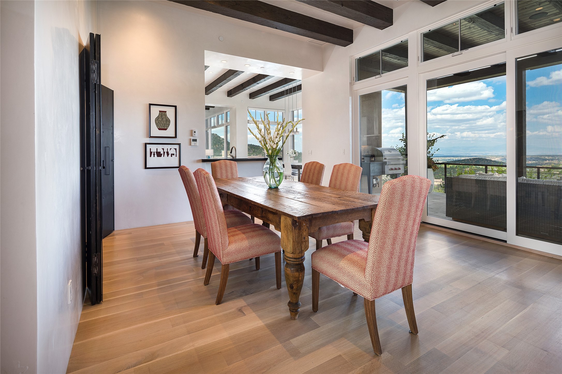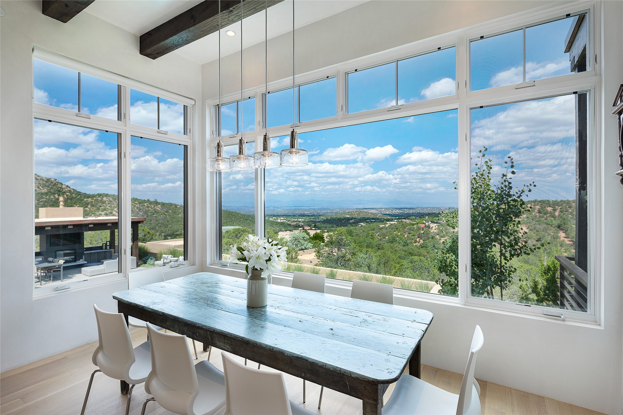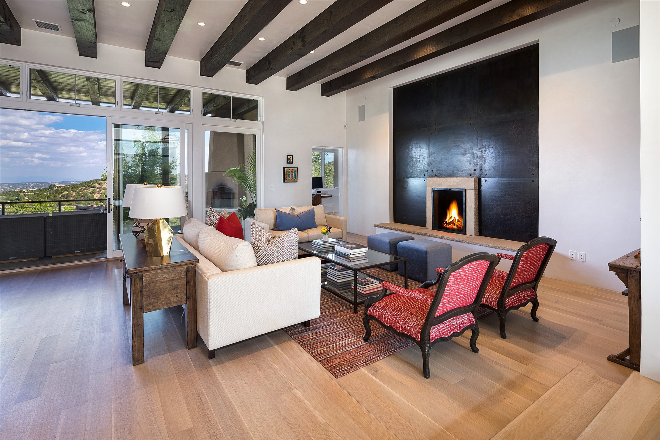 One of the most extraordinary estates in all of Santa Fe, this exceptional 2018-built residence by the awarding winning, Woods Design Builders excites and captivates with powerful architecture, stunning, expansive views mountain, city and sunset views, and a rare resort-style diving pool, spa, and cabana. Located within Wilderness Gate, and sited on a superior, elevated 5 acre view lot, this exquisite gated residence, exemplifies the unique blend of sophisticated contemporary design with inherent Santa Fe warmth. Designed with a grand open concept living experience, with seamless surround view windows, this fabulous home stuns upon entering through the glass and metal pivot front entrance door into the living room and dining room, complete with a custom metal accent wall, fireplace, wet bar, wine cooler, and sliding glass doors which open to the epic mountain and city views and the the outdoor covered portal with a BBQ and fireplace. The ultimate entertainer's kitchen delights with an expansive island with waterfall Taj Mahal counters, pantry, dual sinks, and luxury appliances, which opens to a casual dining and living room with a fireplace. The luxurious owner's suite delights with majestic views, private portal, an attached office area, sitting room or an ideal media room, and a state-of-the art bath complete with a jetted tub, steam shower, and generous walk-in closet. Separate from the owner's suite are two well-appointed guest bedroom ensuites, plus an additional living room with an office niche. The newly installed heated pool and spa with a fully equipped cabana defines excellence, with resistance swim jets, an outdoor kitchen, fireplace and media center. Additional luxury features include white oak flooring, lush vibrant surround gardens with multiple outdoor entertainment areas, plaster walls, and rich beams with steel accents throughout, and all within minutes from the Plaza, steps away from Atalaya Mnt, St. Johns College, and the Dale Ball trail system.