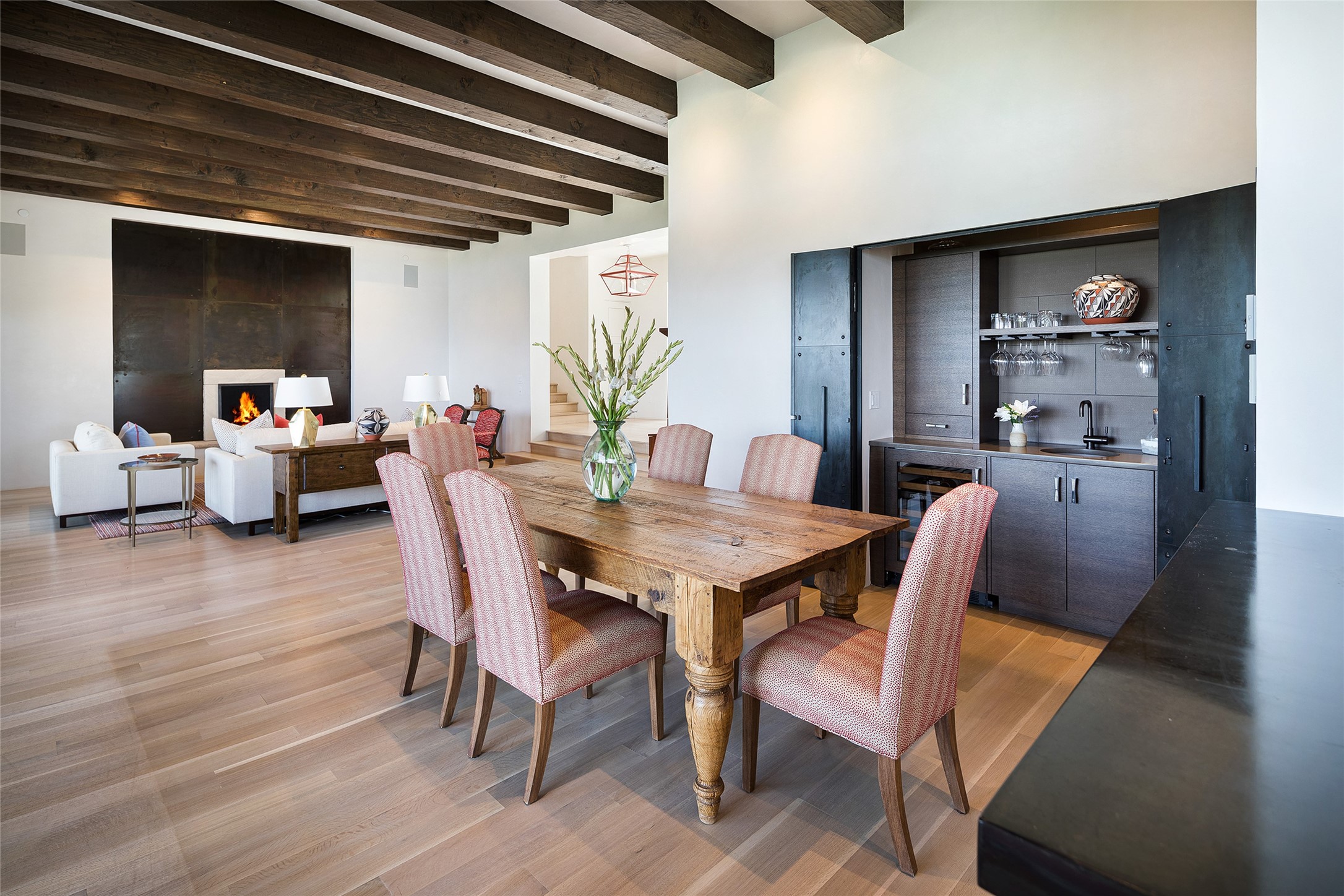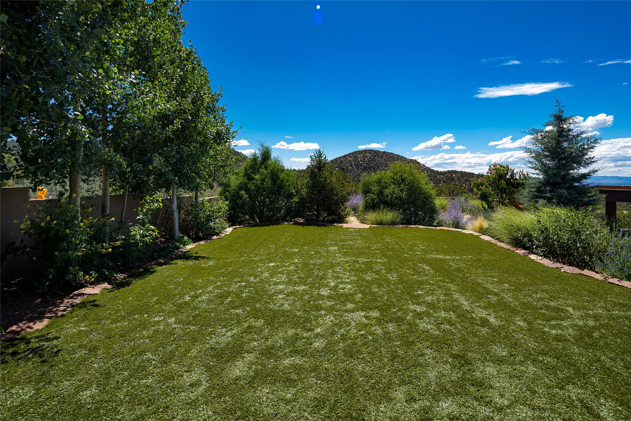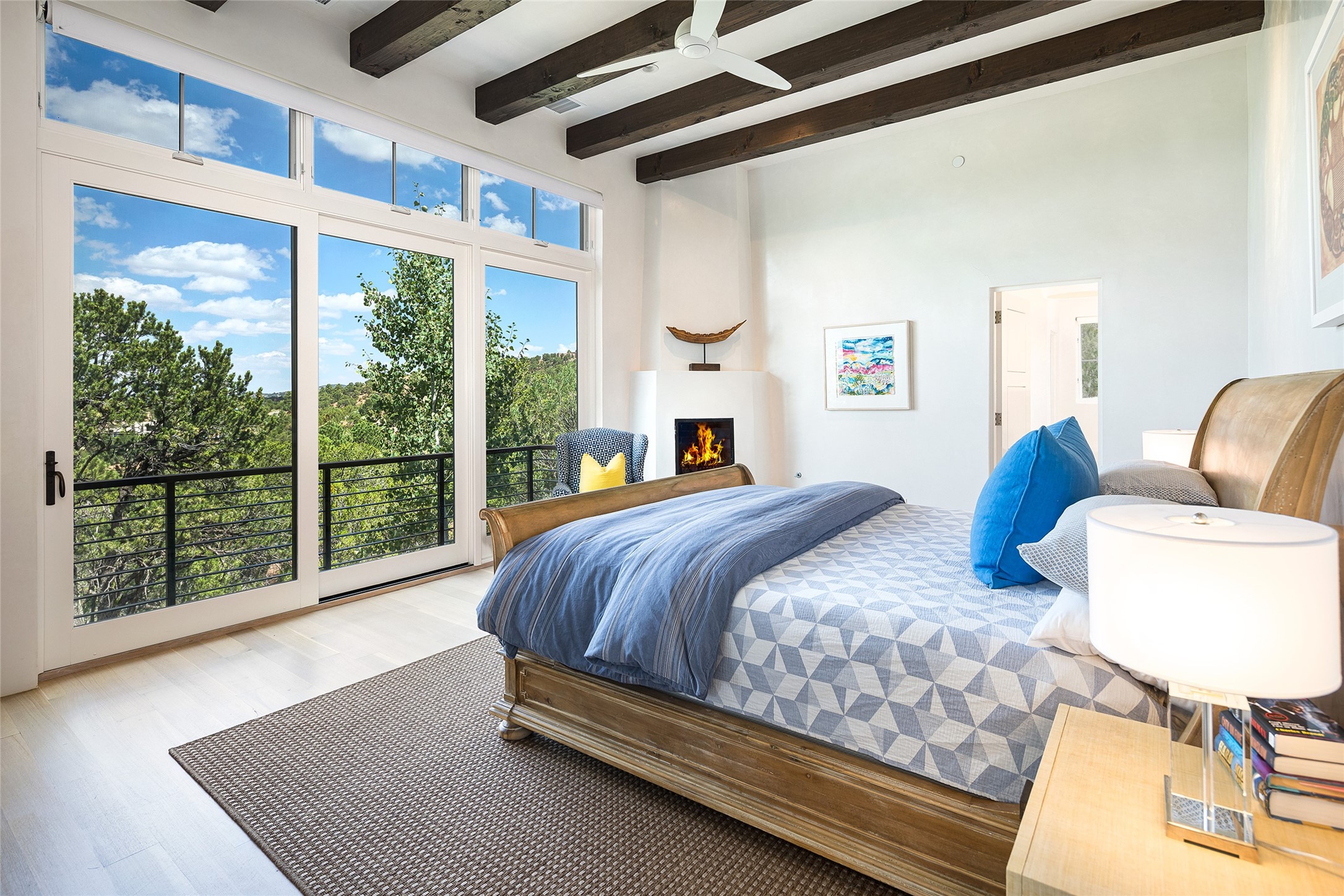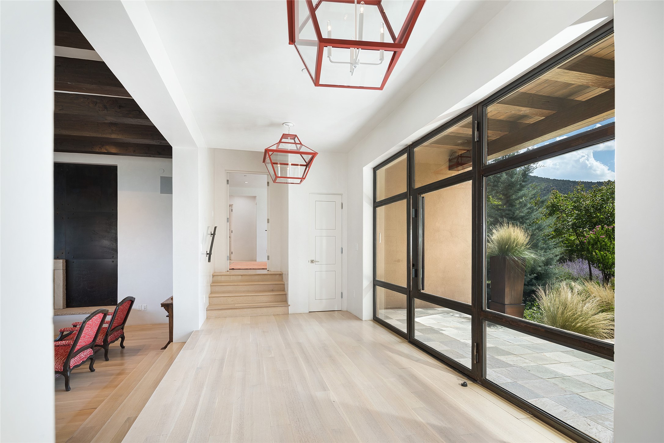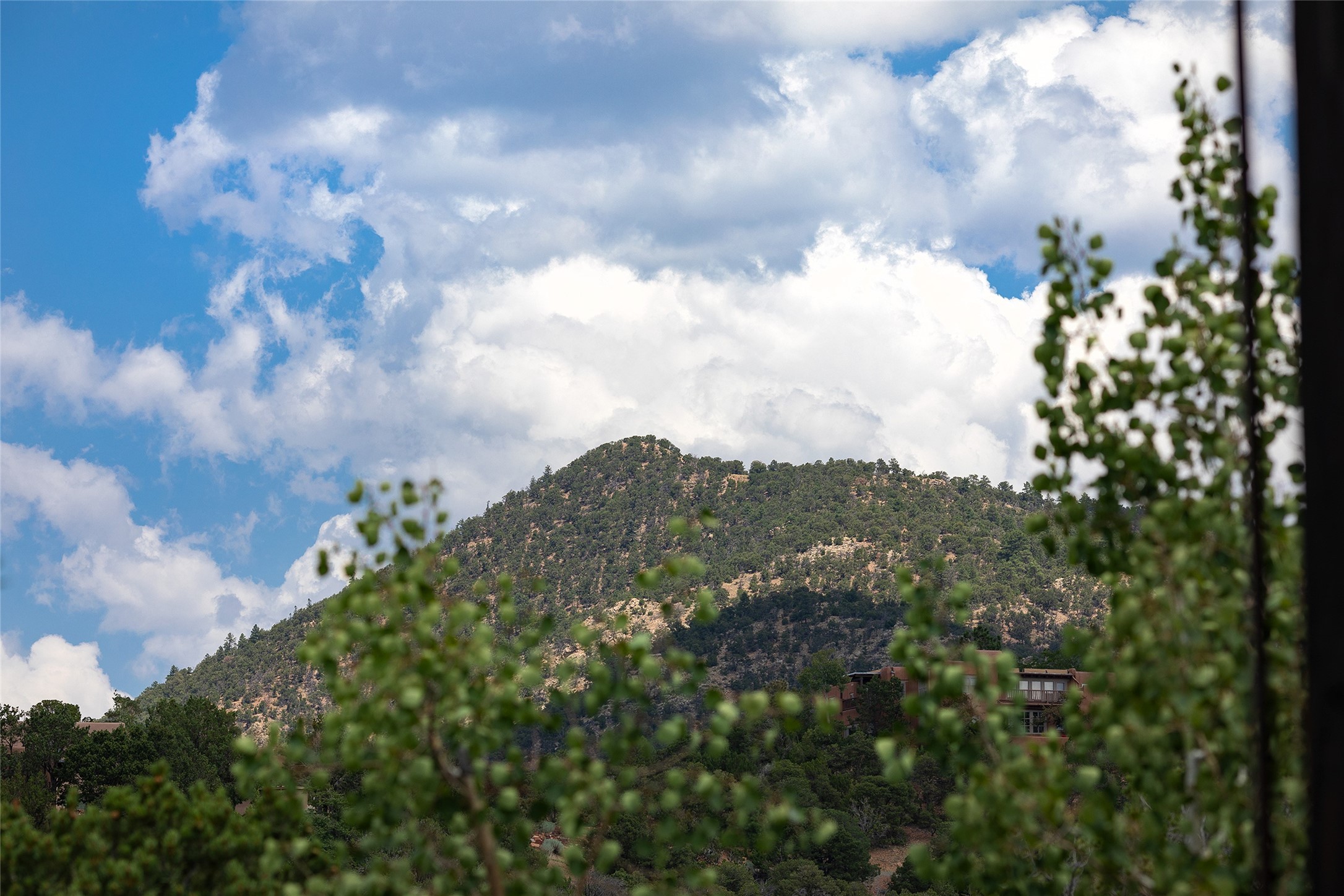 One of the most extraordinary estates in all of Santa Fe, this exceptional 2018-built residence by the awarding winning, Woods Design Builders excites and captivates with powerful architecture, stunning, expansive views mountain, city and sunset views, and a rare resort-style diving pool, spa, and cabana. Located within Wilderness Gate, and sited on a superior, elevated 5 acre view lot, this exquisite gated residence, exemplifies the unique blend of sophisticated contemporary design with inherent Santa Fe warmth. Designed with a grand open concept living experience, with seamless surround view windows, this fabulous home stuns upon entering through the glass and metal pivot front entrance door into the living room and dining room, complete with a custom metal accent wall, fireplace, wet bar, wine cooler, and sliding glass doors which open to the epic mountain and city views and the the outdoor covered portal with a BBQ and fireplace. The ultimate entertainer's kitchen delights with an expansive island with waterfall Taj Mahal counters, pantry, dual sinks, and luxury appliances, which opens to a casual dining and living room with a fireplace. The luxurious owner's suite delights with majestic views, private portal, an attached office area, sitting room or an ideal media room, and a state-of-the art bath complete with a jetted tub, steam shower, and generous walk-in closet. Separate from the owner's suite are two well-appointed guest bedroom ensuites, plus an additional living room with an office niche. The newly installed heated pool and spa with a fully equipped cabana defines excellence, with resistance swim jets, an outdoor kitchen, fireplace and media center. Additional luxury features include white oak flooring, lush vibrant surround gardens with multiple outdoor entertainment areas, plaster walls, and rich beams with steel accents throughout, and all within minutes from the Plaza, steps away from Atalaya Mnt, St. Johns College, and the Dale Ball trail system.