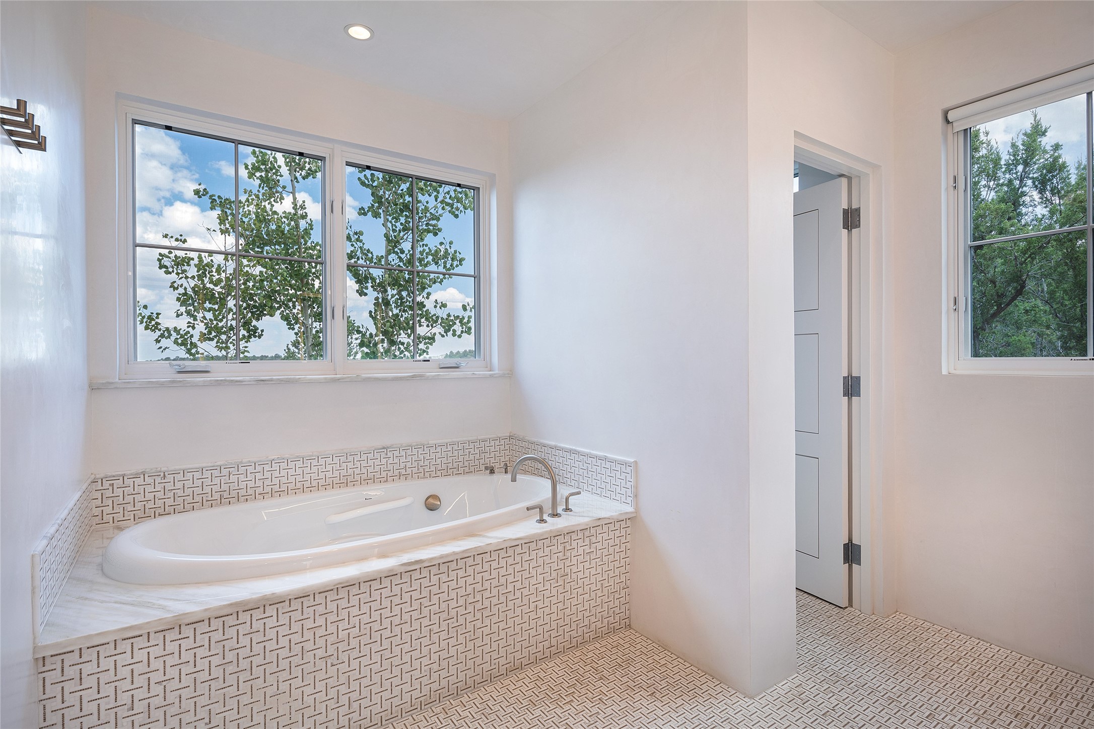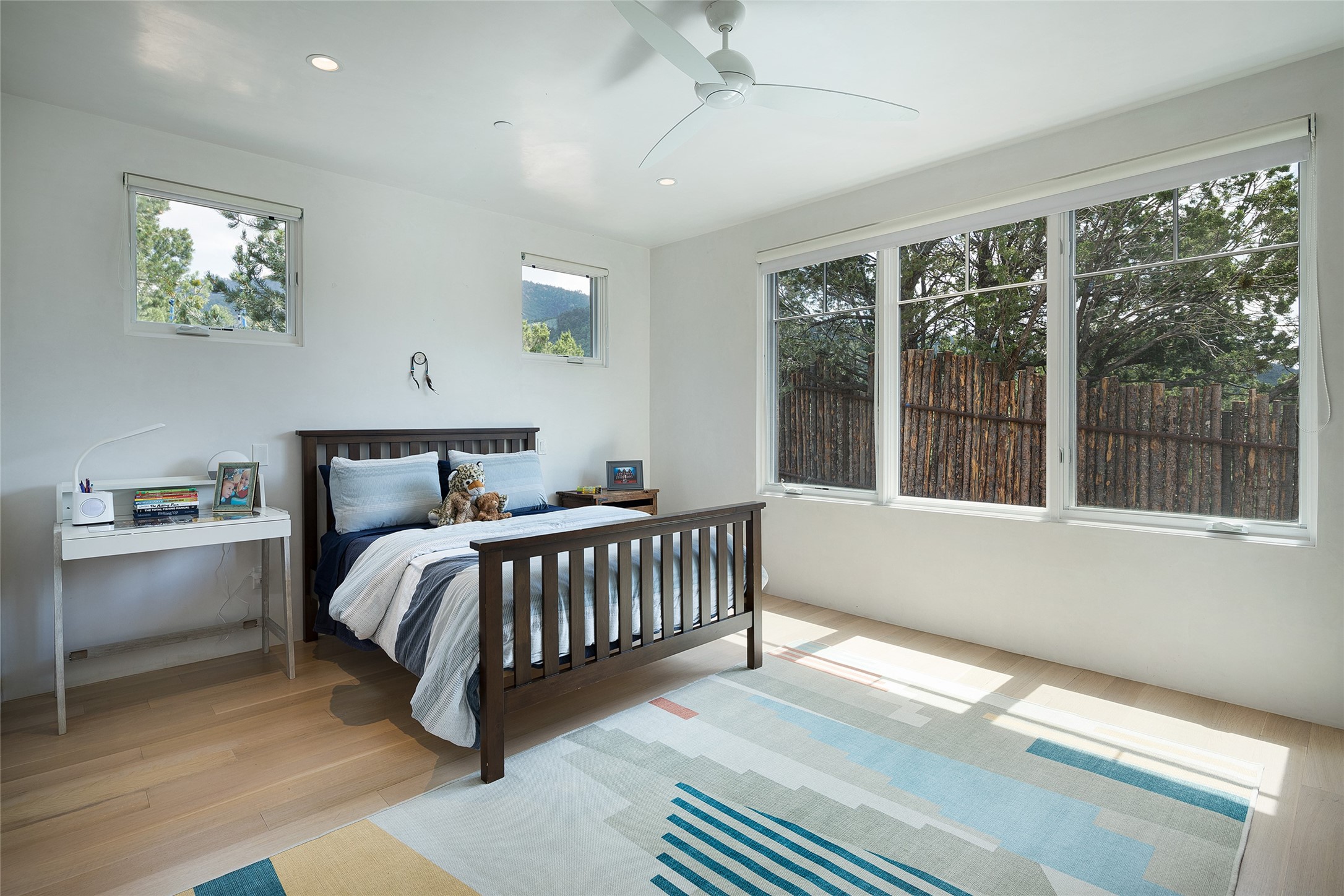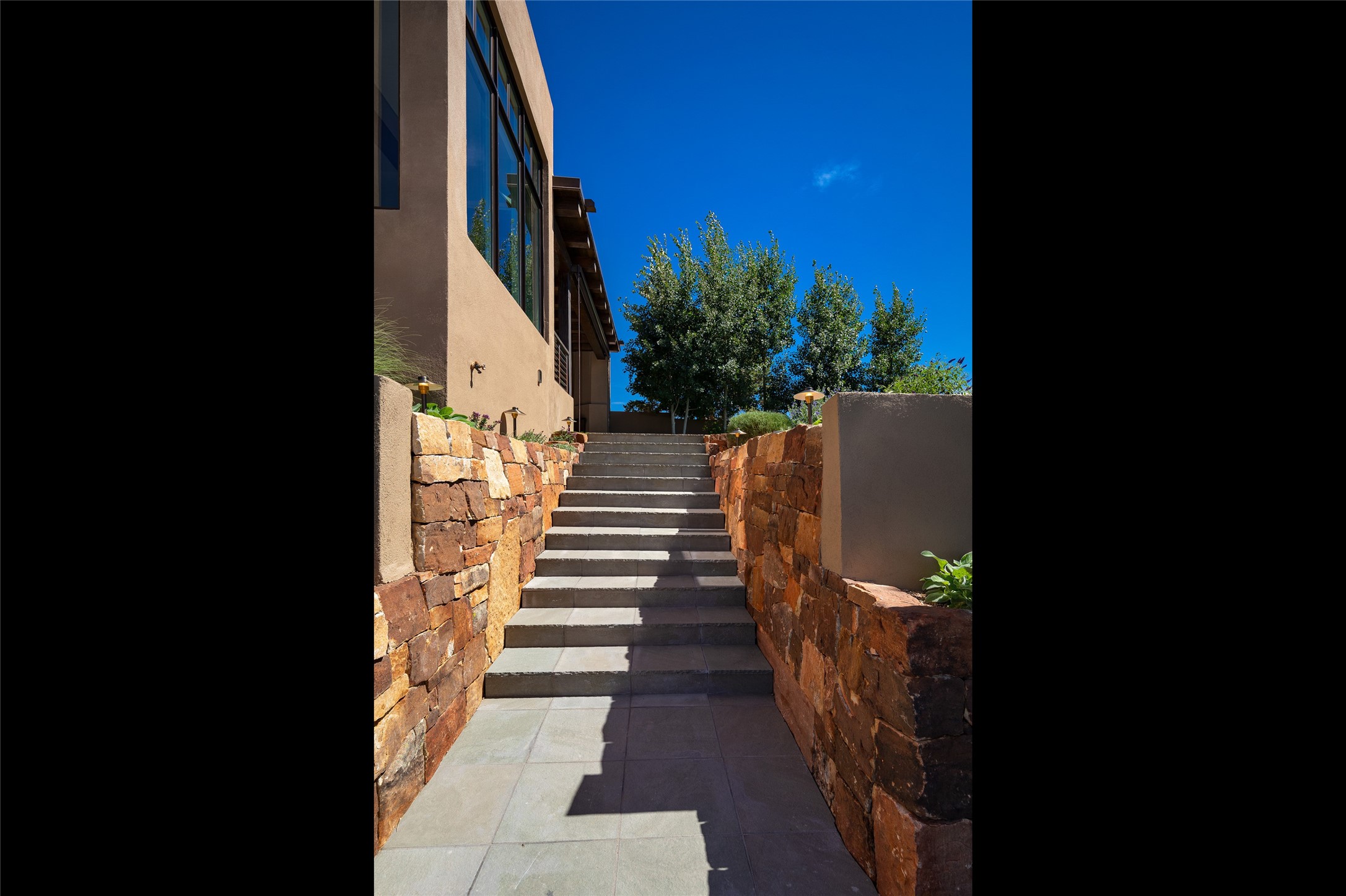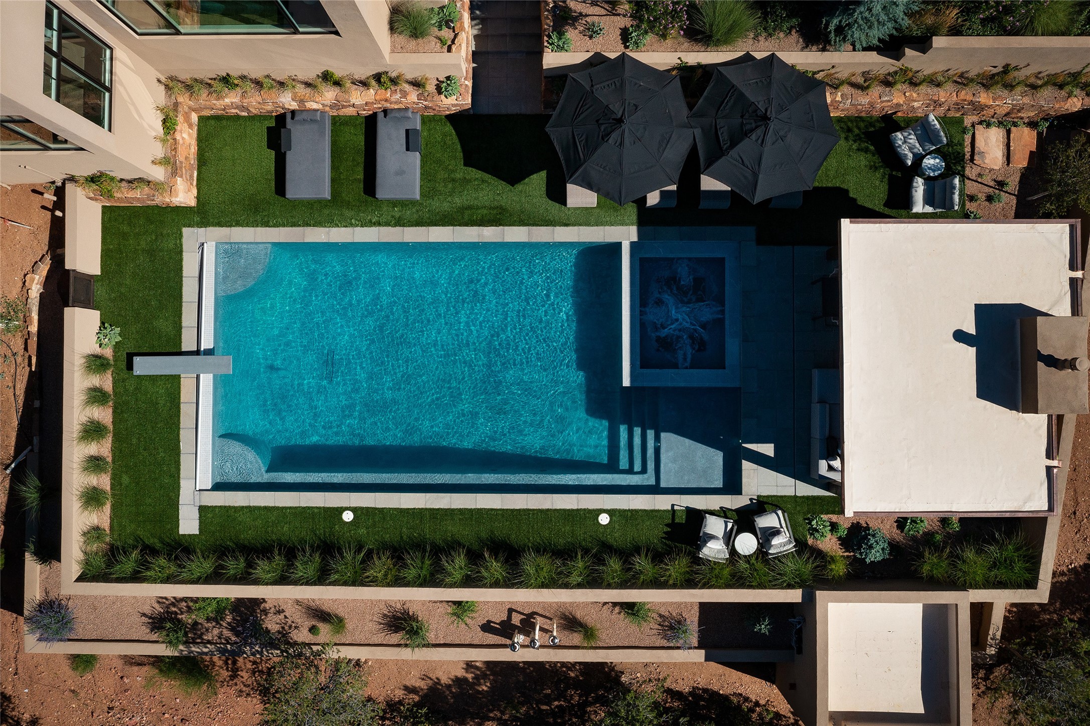 One of the most extraordinary estates in all of Santa Fe, this exceptional 2018-built residence by the awarding winning, Woods Design Builders excites and captivates with powerful architecture, stunning, expansive views mountain, city and sunset views, and a rare resort-style diving pool, spa, and cabana. Located within Wilderness Gate, and sited on a superior, elevated 5 acre view lot, this exquisite gated residence, exemplifies the unique blend of sophisticated contemporary design with inherent Santa Fe warmth. Designed with a grand open concept living experience, with seamless surround view windows, this fabulous home stuns upon entering through the glass and metal pivot front entrance door into the living room and dining room, complete with a custom metal accent wall, fireplace, wet bar, wine cooler, and sliding glass doors which open to the epic mountain and city views and the the outdoor covered portal with a BBQ and fireplace. The ultimate entertainer's kitchen delights with an expansive island with waterfall Taj Mahal counters, pantry, dual sinks, and luxury appliances, which opens to a casual dining and living room with a fireplace. The luxurious owner's suite delights with majestic views, private portal, an attached office area, sitting room or an ideal media room, and a state-of-the art bath complete with a jetted tub, steam shower, and generous walk-in closet. Separate from the owner's suite are two well-appointed guest bedroom ensuites, plus an additional living room with an office niche. The newly installed heated pool and spa with a fully equipped cabana defines excellence, with resistance swim jets, an outdoor kitchen, fireplace and media center. Additional luxury features include white oak flooring, lush vibrant surround gardens with multiple outdoor entertainment areas, plaster walls, and rich beams with steel accents throughout, and all within minutes from the Plaza, steps away from Atalaya Mnt, St. Johns College, and the Dale Ball trail system.