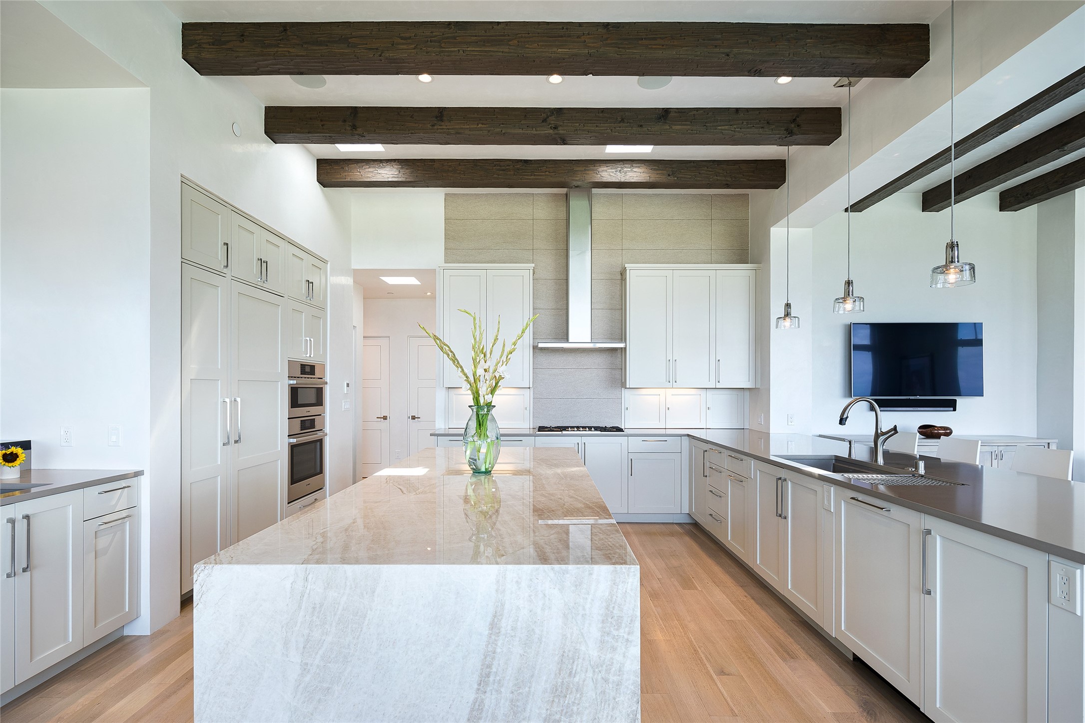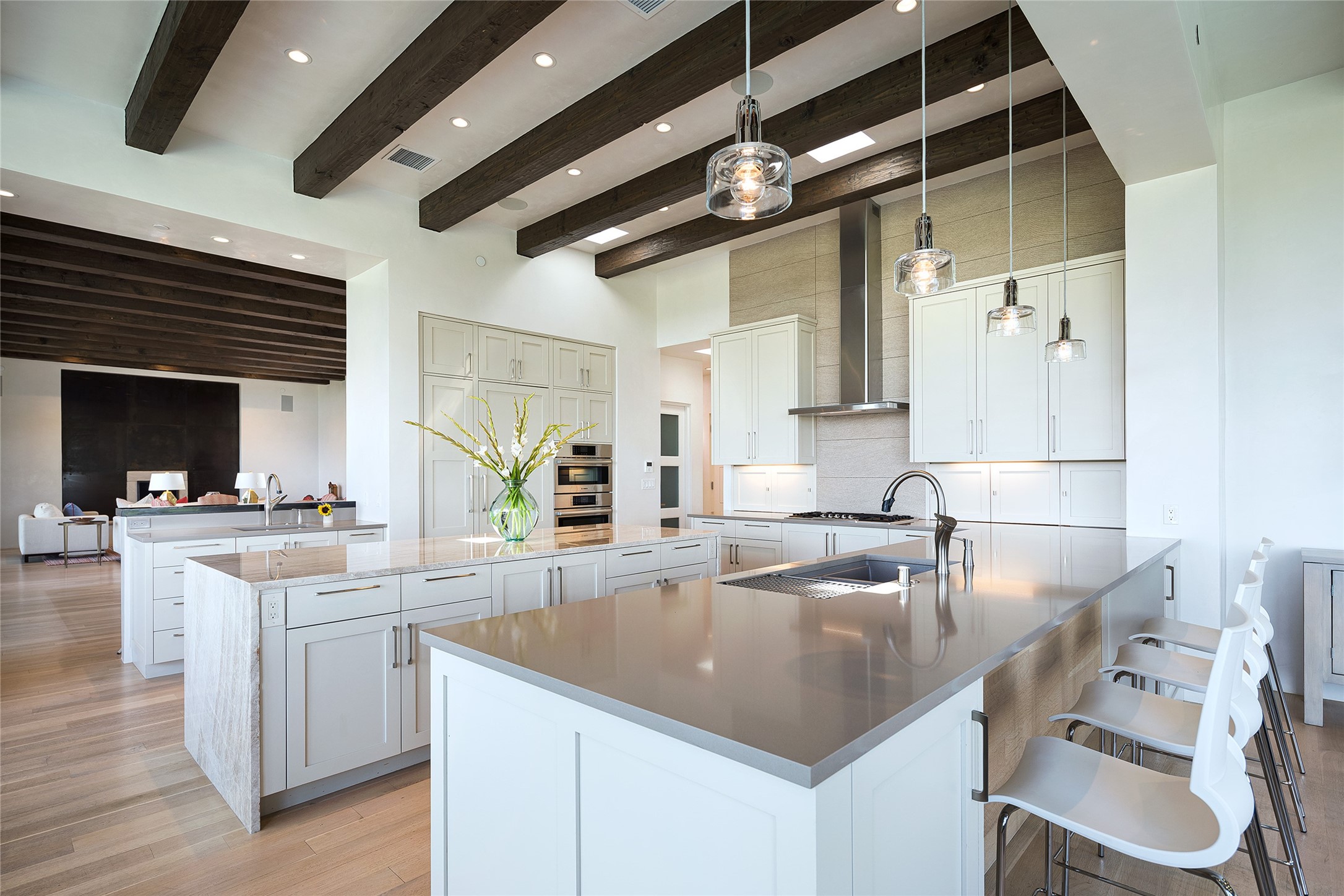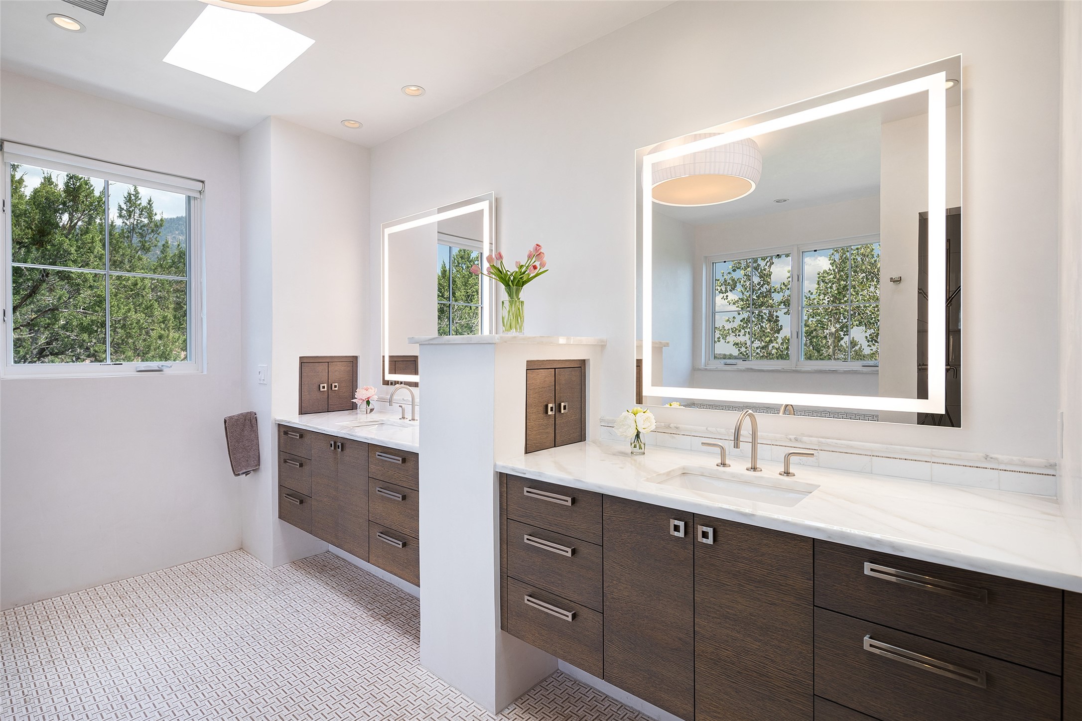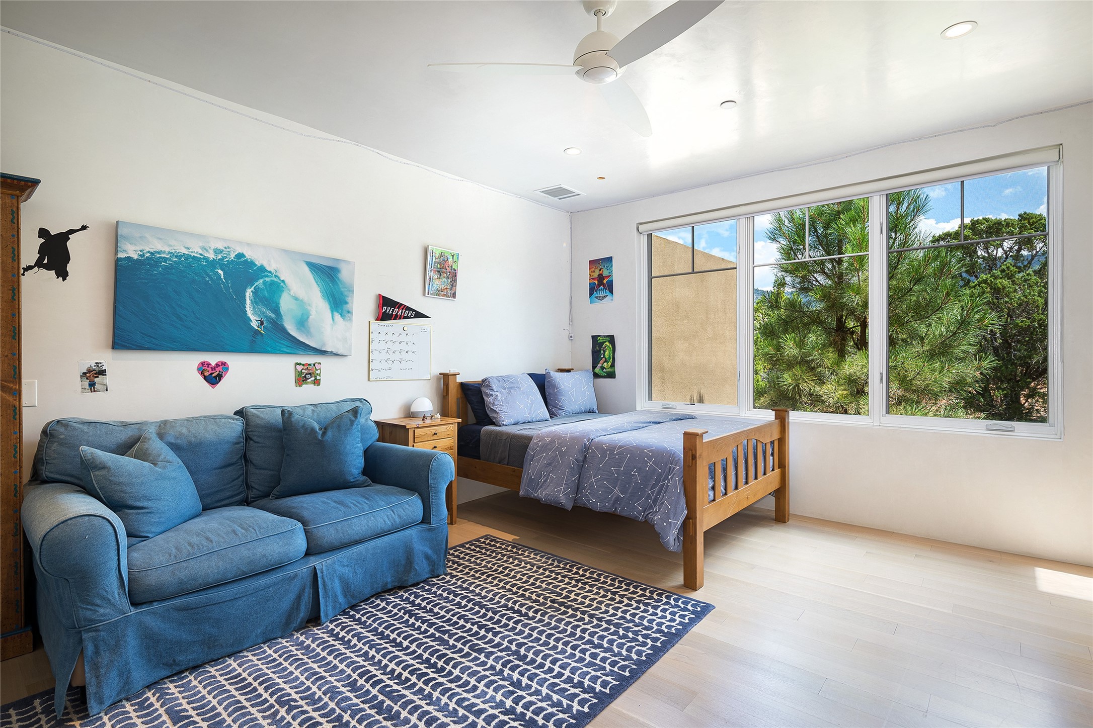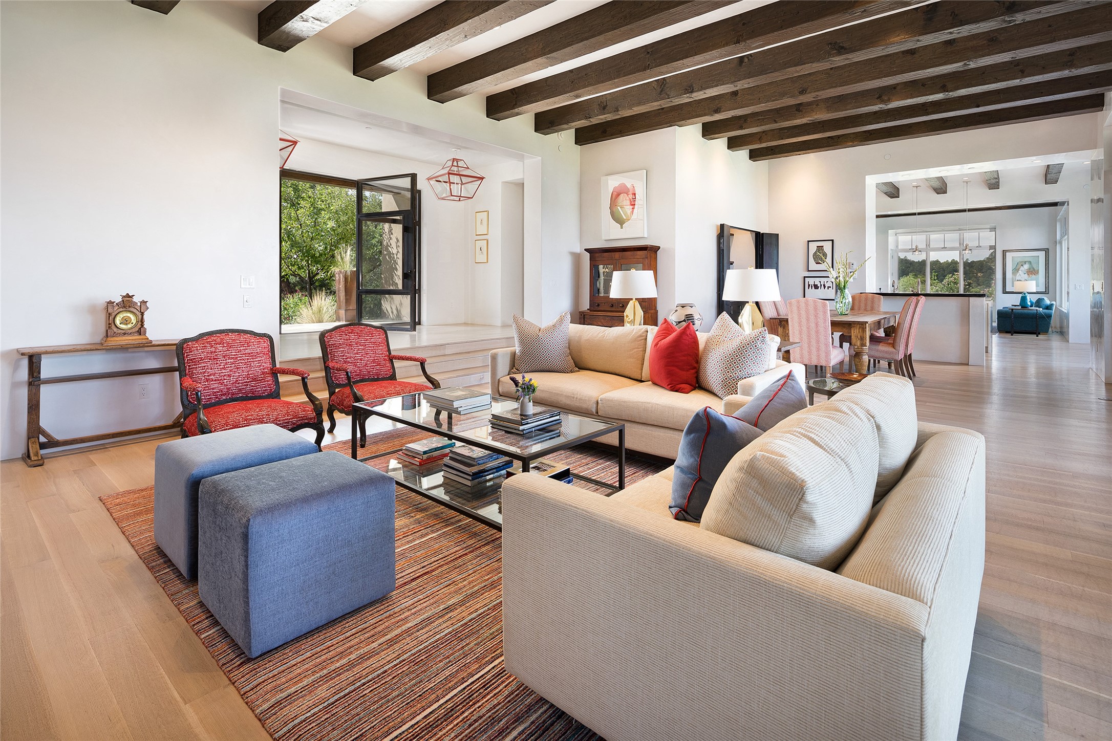 One of the most extraordinary estates in all of Santa Fe, this exceptional 2018-built residence by the awarding winning, Woods Design Builders excites and captivates with powerful architecture, stunning, expansive views mountain, city and sunset views, and a rare resort-style diving pool, spa, and cabana. Located within Wilderness Gate, and sited on a superior, elevated 5 acre view lot, this exquisite gated residence, exemplifies the unique blend of sophisticated contemporary design with inherent Santa Fe warmth. Designed with a grand open concept living experience, with seamless surround view windows, this fabulous home stuns upon entering through the glass and metal pivot front entrance door into the living room and dining room, complete with a custom metal accent wall, fireplace, wet bar, wine cooler, and sliding glass doors which open to the epic mountain and city views and the the outdoor covered portal with a BBQ and fireplace. The ultimate entertainer's kitchen delights with an expansive island with waterfall Taj Mahal counters, pantry, dual sinks, and luxury appliances, which opens to a casual dining and living room with a fireplace. The luxurious owner's suite delights with majestic views, private portal, an attached office area, sitting room or an ideal media room, and a state-of-the art bath complete with a jetted tub, steam shower, and generous walk-in closet. Separate from the owner's suite are two well-appointed guest bedroom ensuites, plus an additional living room with an office niche. The newly installed heated pool and spa with a fully equipped cabana defines excellence, with resistance swim jets, an outdoor kitchen, fireplace and media center. Additional luxury features include white oak flooring, lush vibrant surround gardens with multiple outdoor entertainment areas, plaster walls, and rich beams with steel accents throughout, and all within minutes from the Plaza, steps away from Atalaya Mnt, St. Johns College, and the Dale Ball trail system.