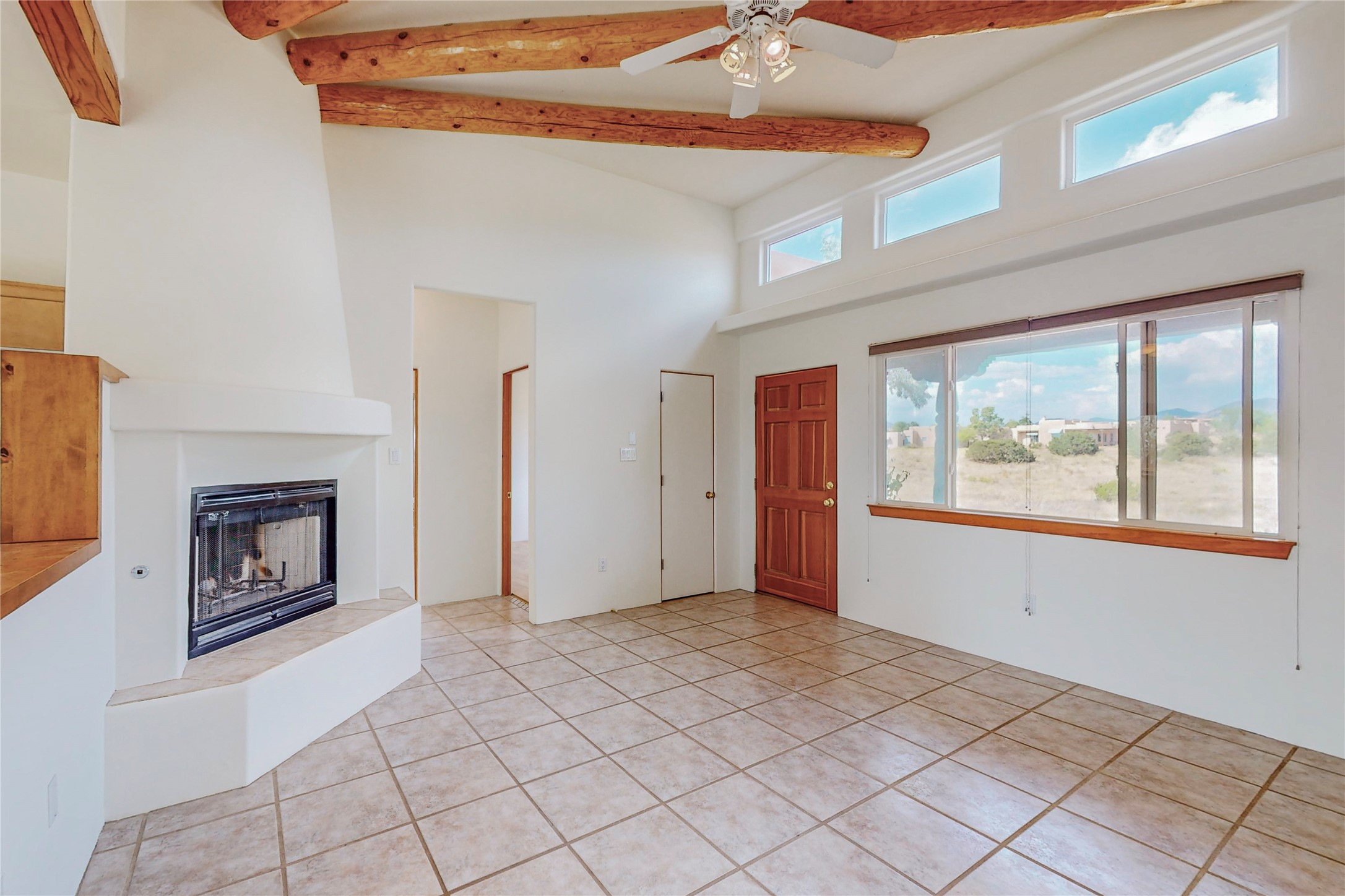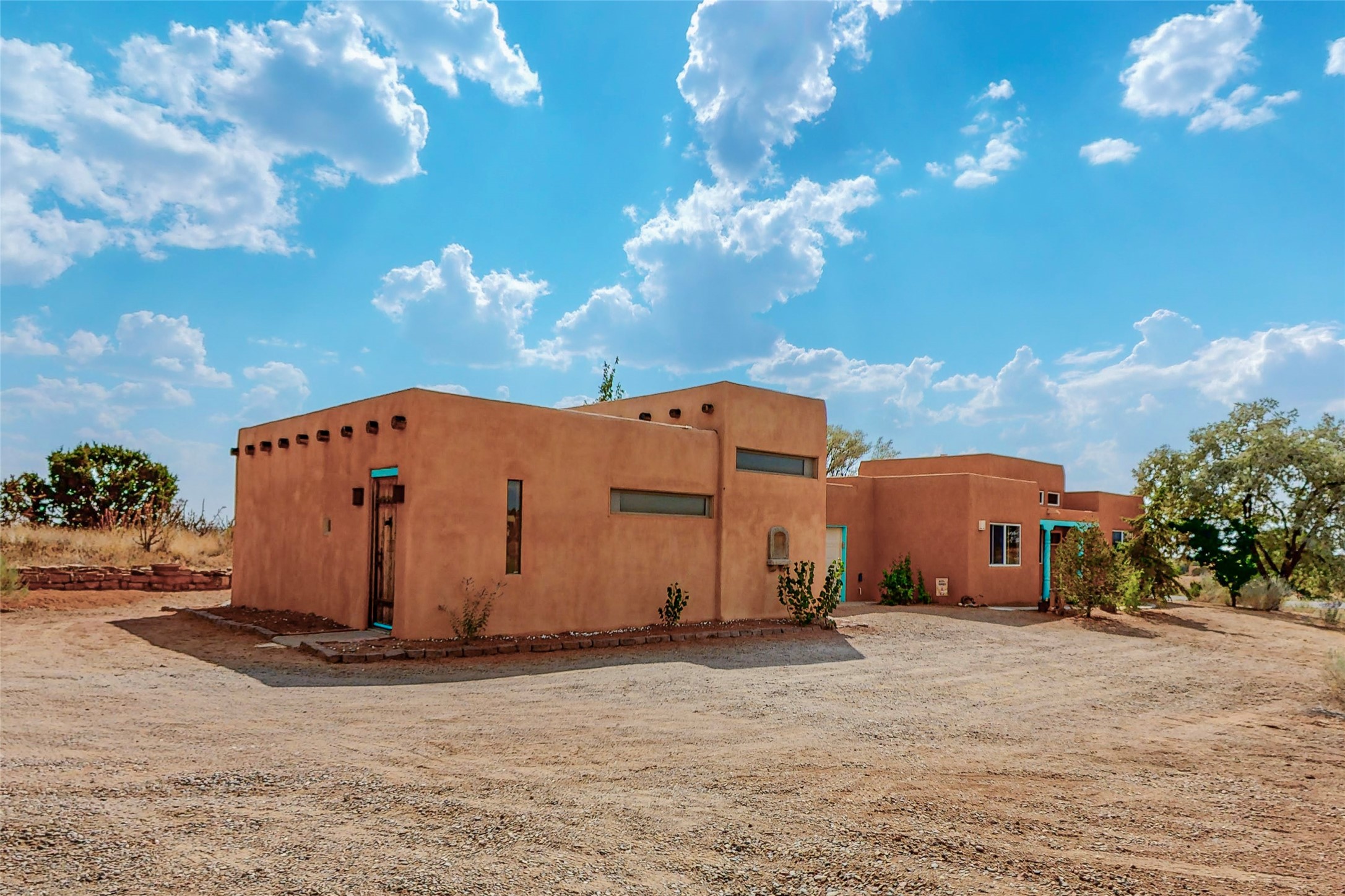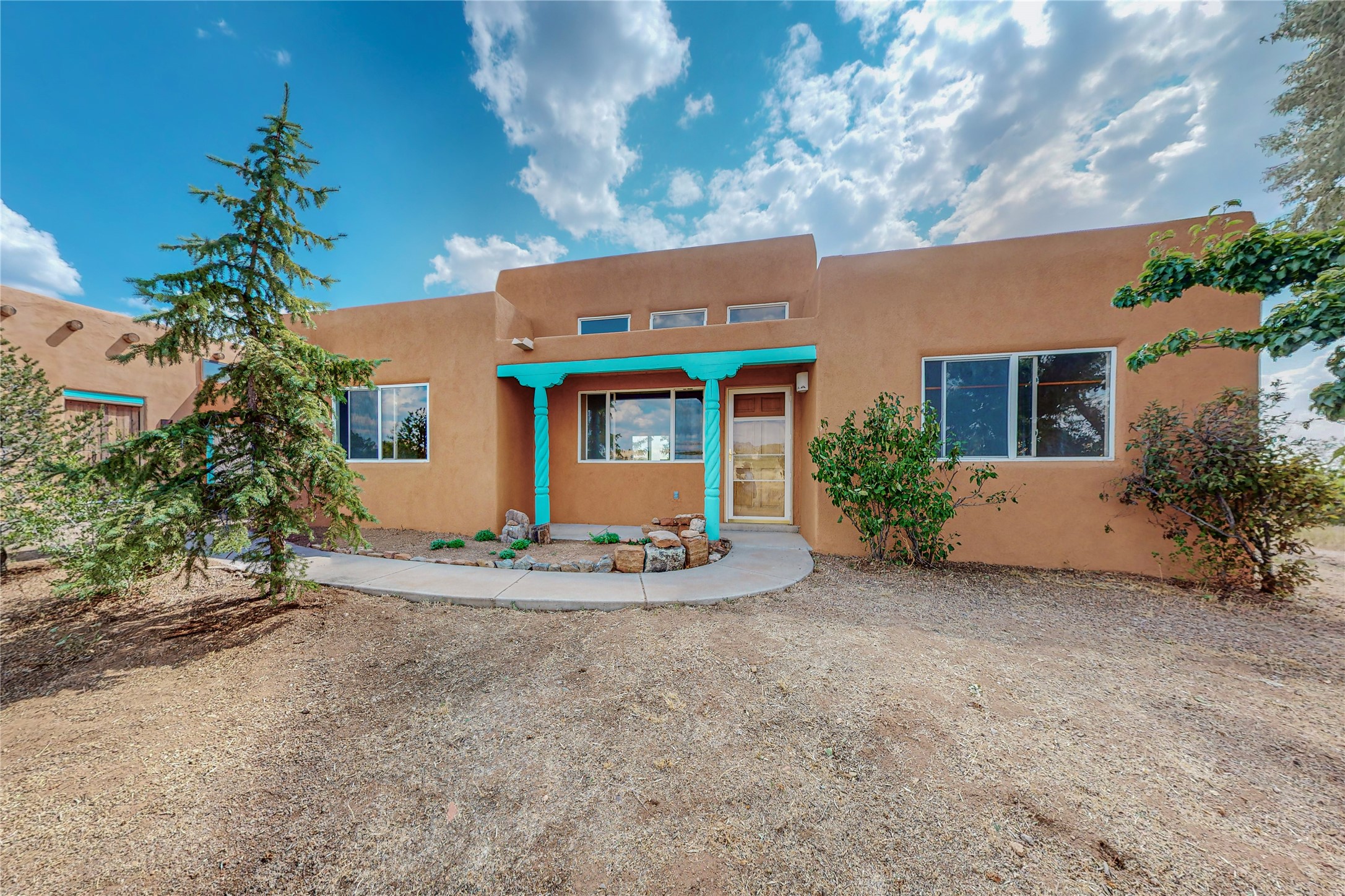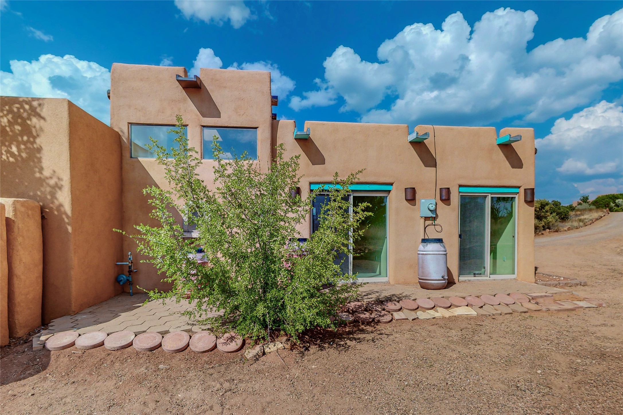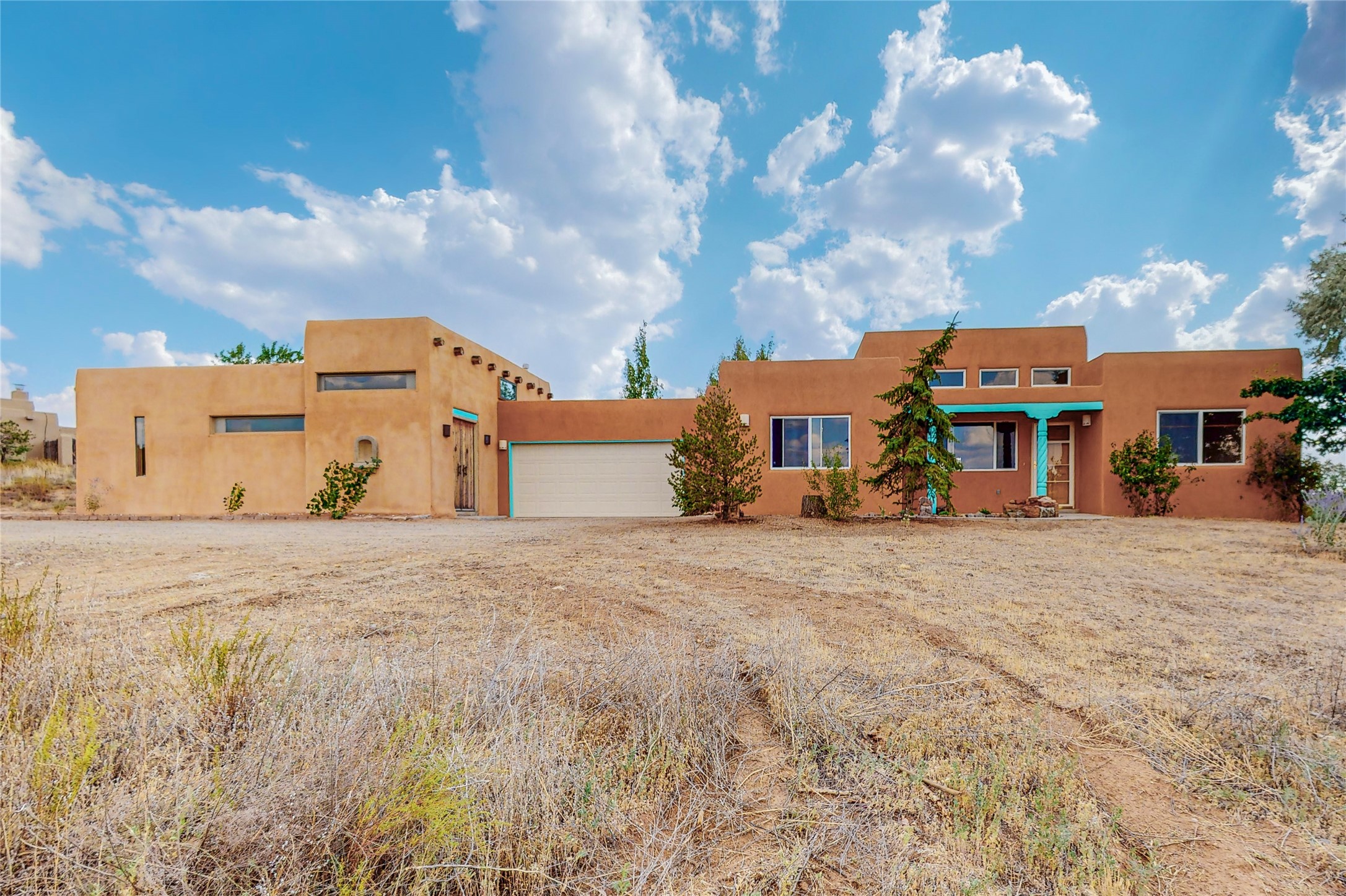 Open plan, split 3 bedroom, 2 bath home attached 800 sqft. 2 heated studios with huge high ceilings. Although small the high ceilings create a spacious feel. A sunburst design viga ceiling and corner living room fireplace opens to the kitchen and dining areas. The surrounding landscape is ready and invites your personal touches, and has sweeping mountain and sunset views. A large 2-car garage and plenty of guest parking adds convenience. Privately located on a cul de sac bordering a large greenbelt yet close to paved access roads leading to local shopping, restaurants, schools, senior center, and library. This home accesses all of Eldorado community activities and trails plus only minutes into Santa Fe.