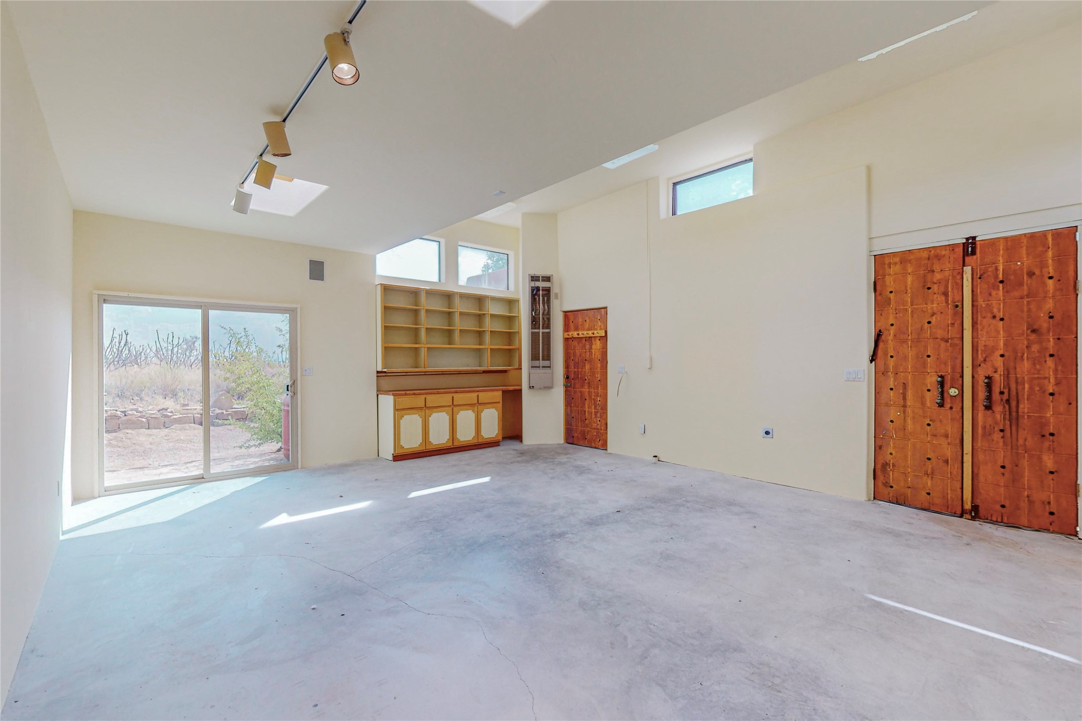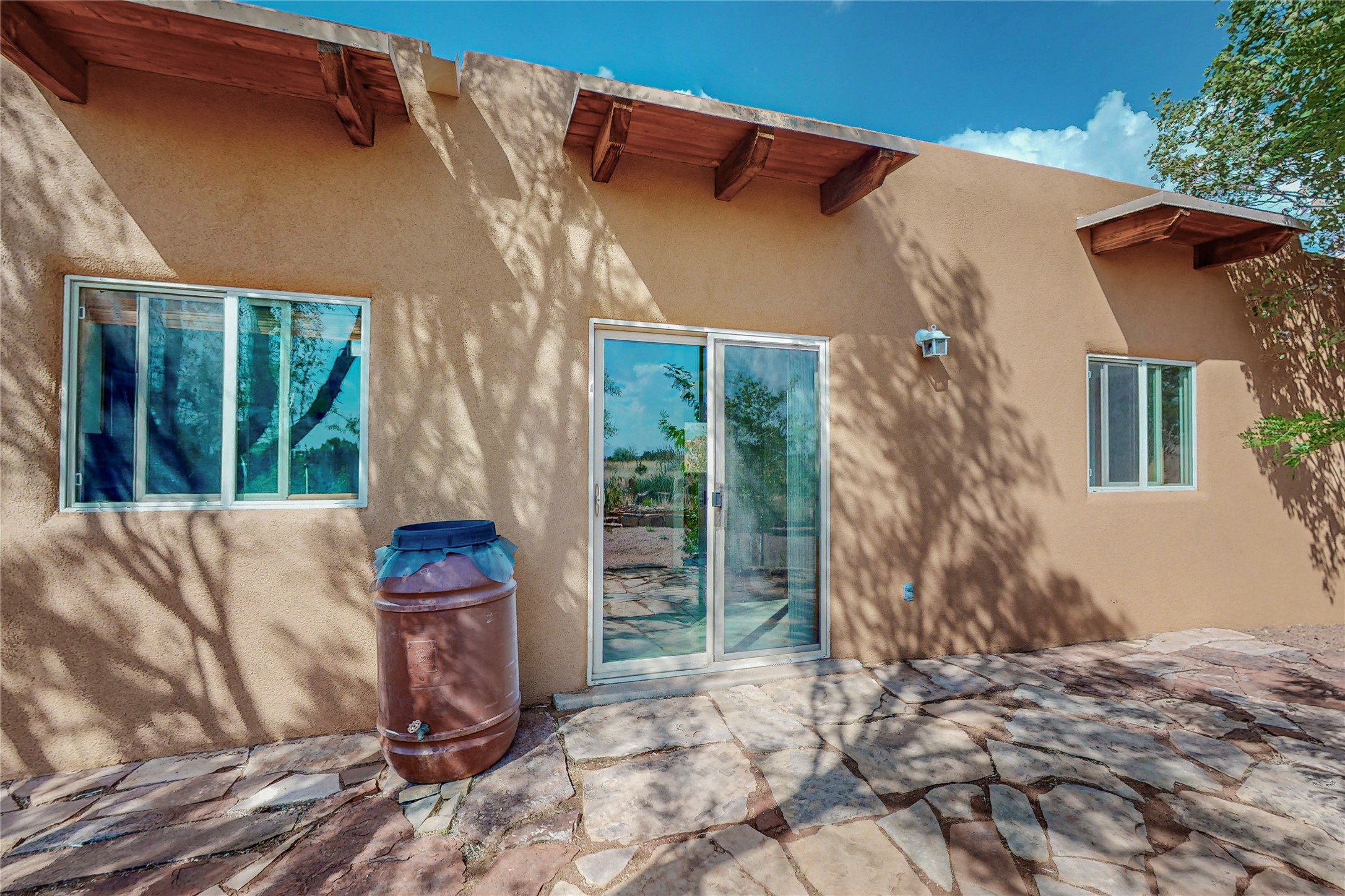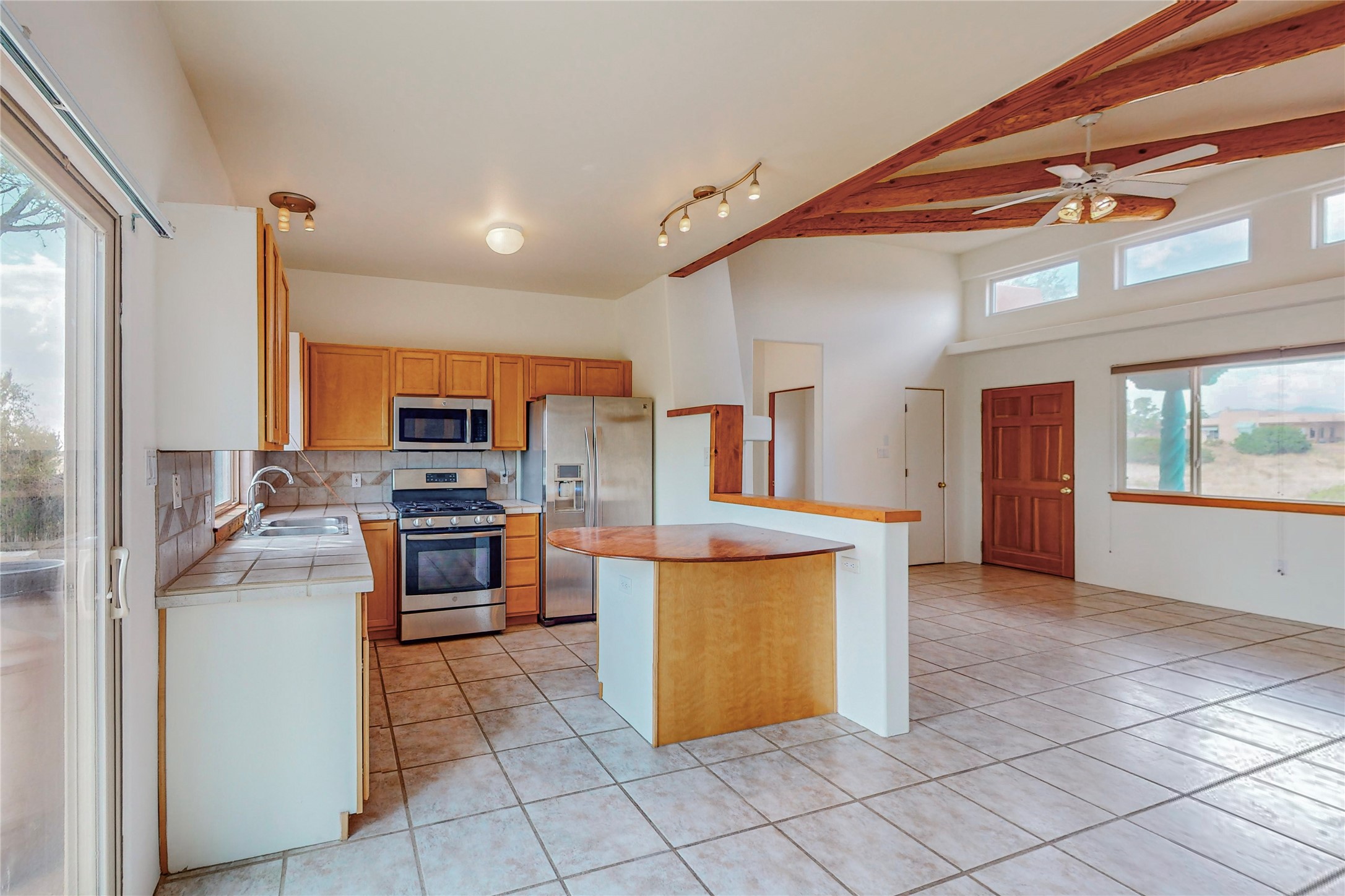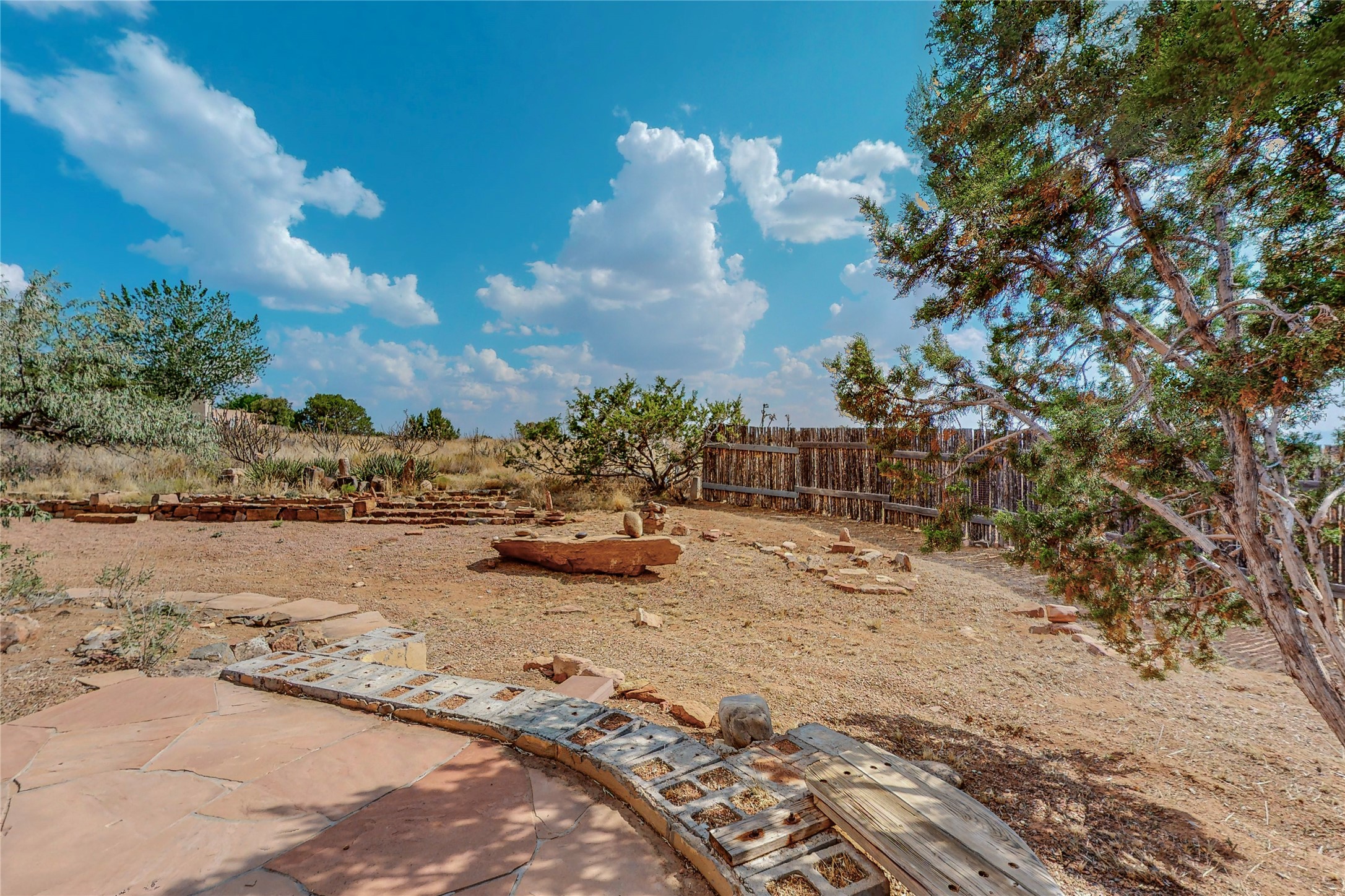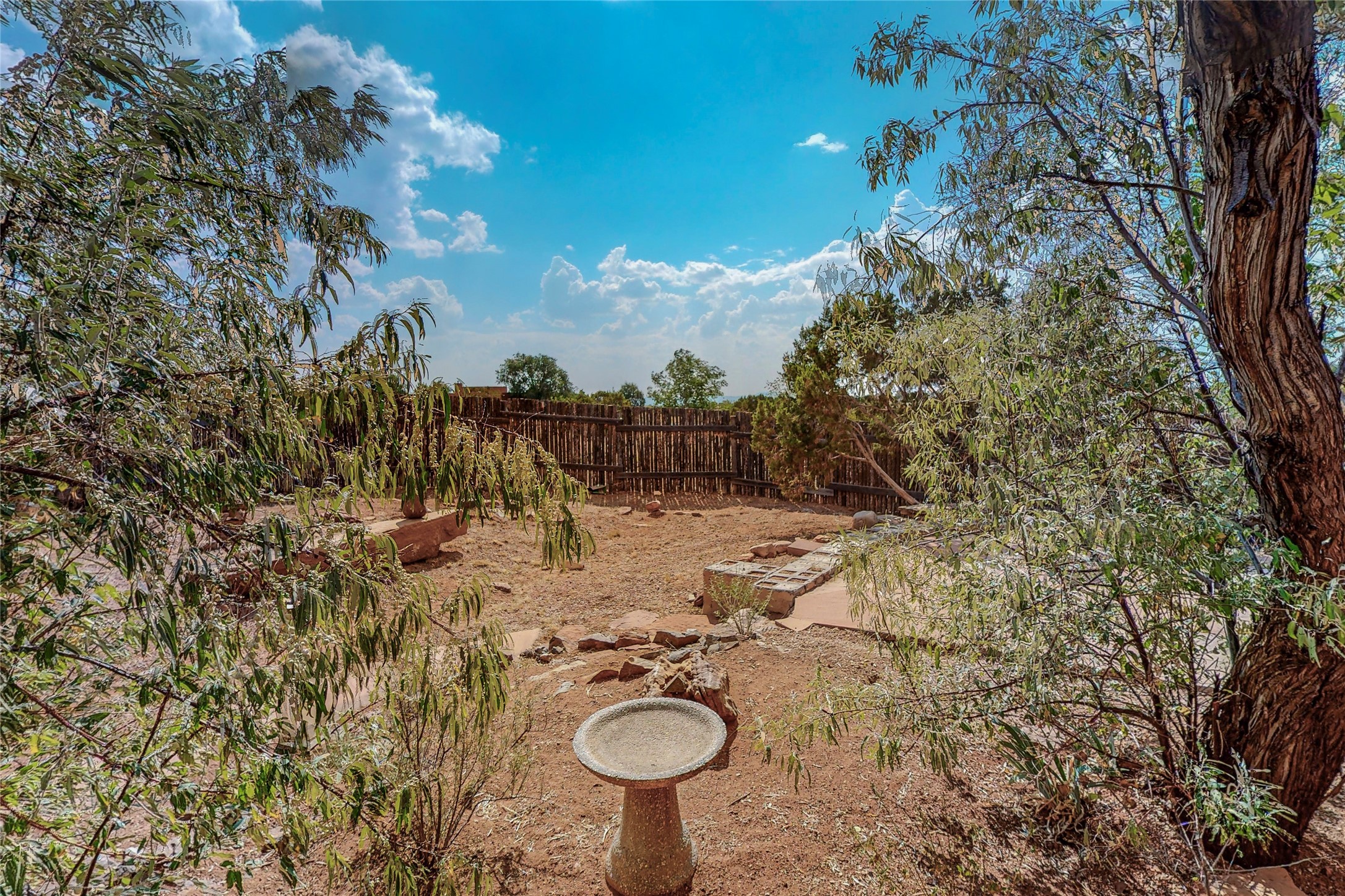 Open plan, split 3 bedroom, 2 bath home attached 800 sqft. 2 heated studios with huge high ceilings. Although small the high ceilings create a spacious feel. A sunburst design viga ceiling and corner living room fireplace opens to the kitchen and dining areas. The surrounding landscape is ready and invites your personal touches, and has sweeping mountain and sunset views. A large 2-car garage and plenty of guest parking adds convenience. Privately located on a cul de sac bordering a large greenbelt yet close to paved access roads leading to local shopping, restaurants, schools, senior center, and library. This home accesses all of Eldorado community activities and trails plus only minutes into Santa Fe.