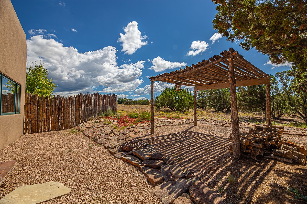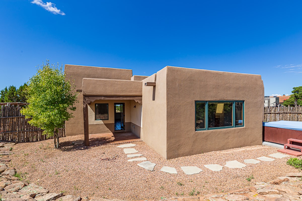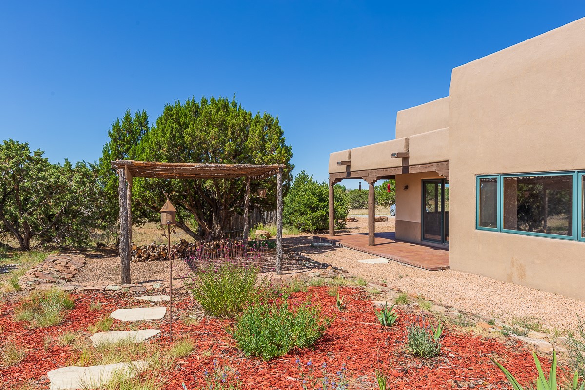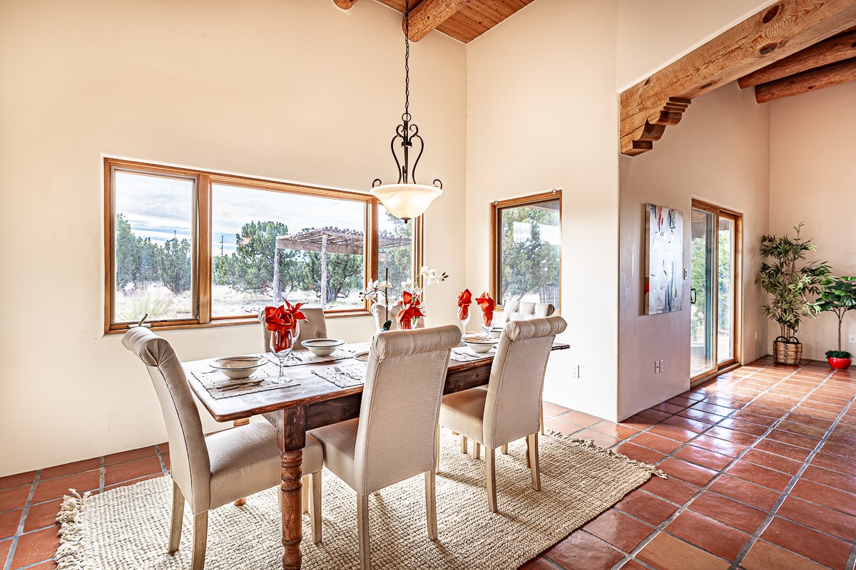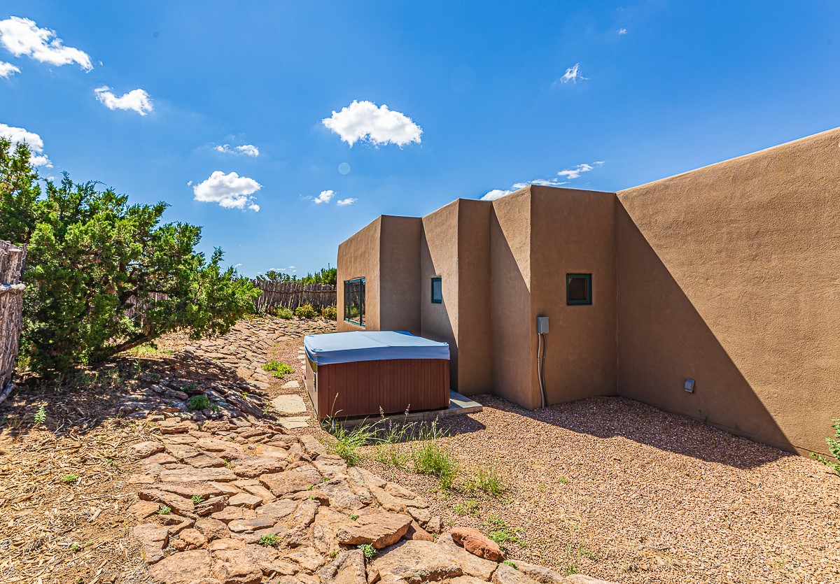 Motivated seller! This light filled home in Eldorado has high ceilings and features vigas, a kiva fireplace, saltillo tile floors, and tile bathroom counters and tub surrounds. There is comfortable outdoor living with two portals off the living room/entry and the dining room. Enjoy the outdoor space under a gazebo or in a hot tub to look at the stars. The house is situated to get plenty of warmth from the sun in the winter and little direct sun in the summer. There is lots to see in this well designed home.