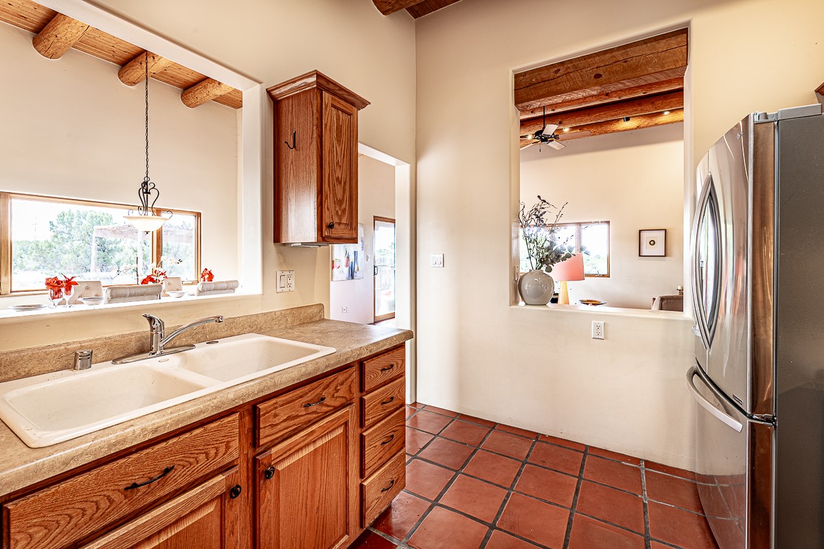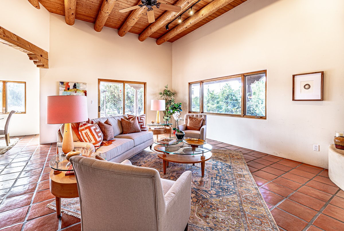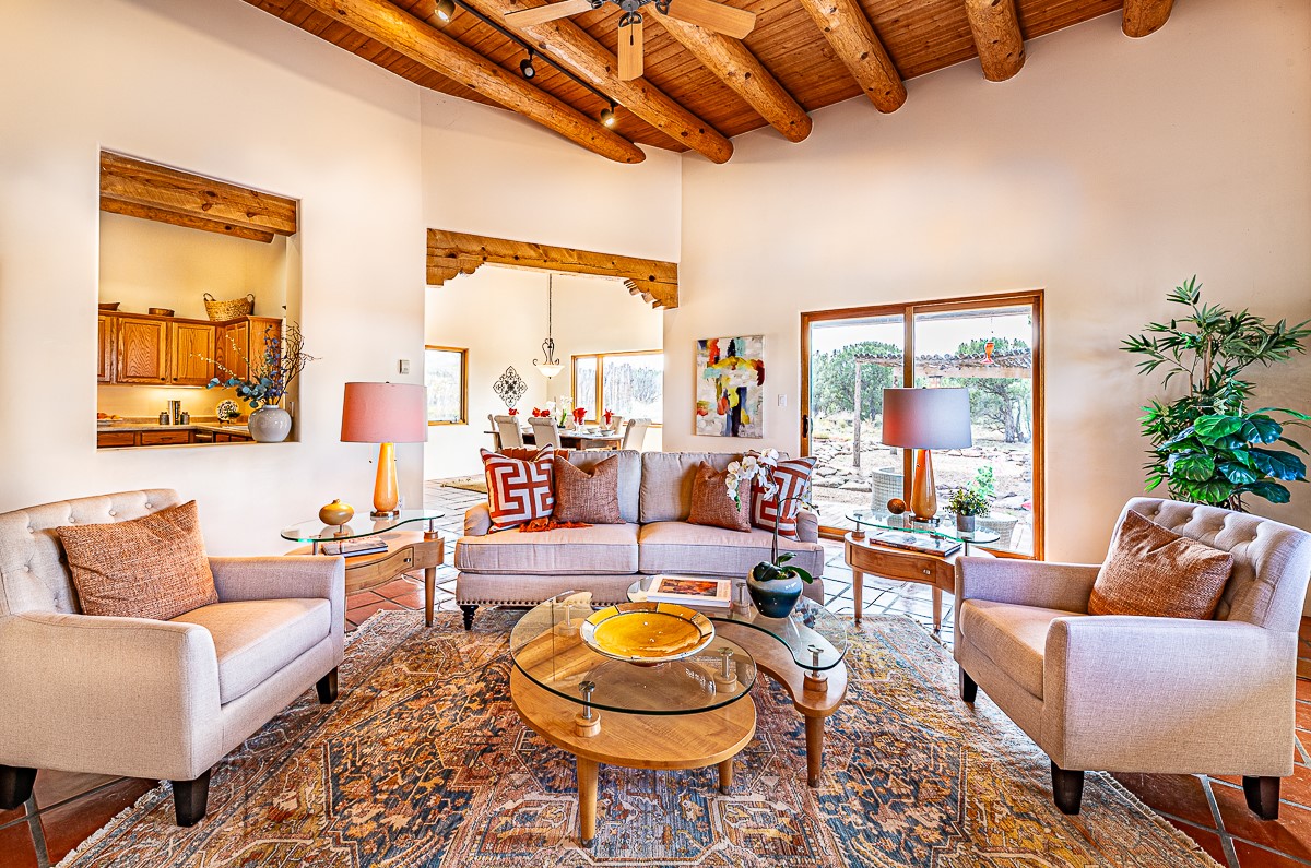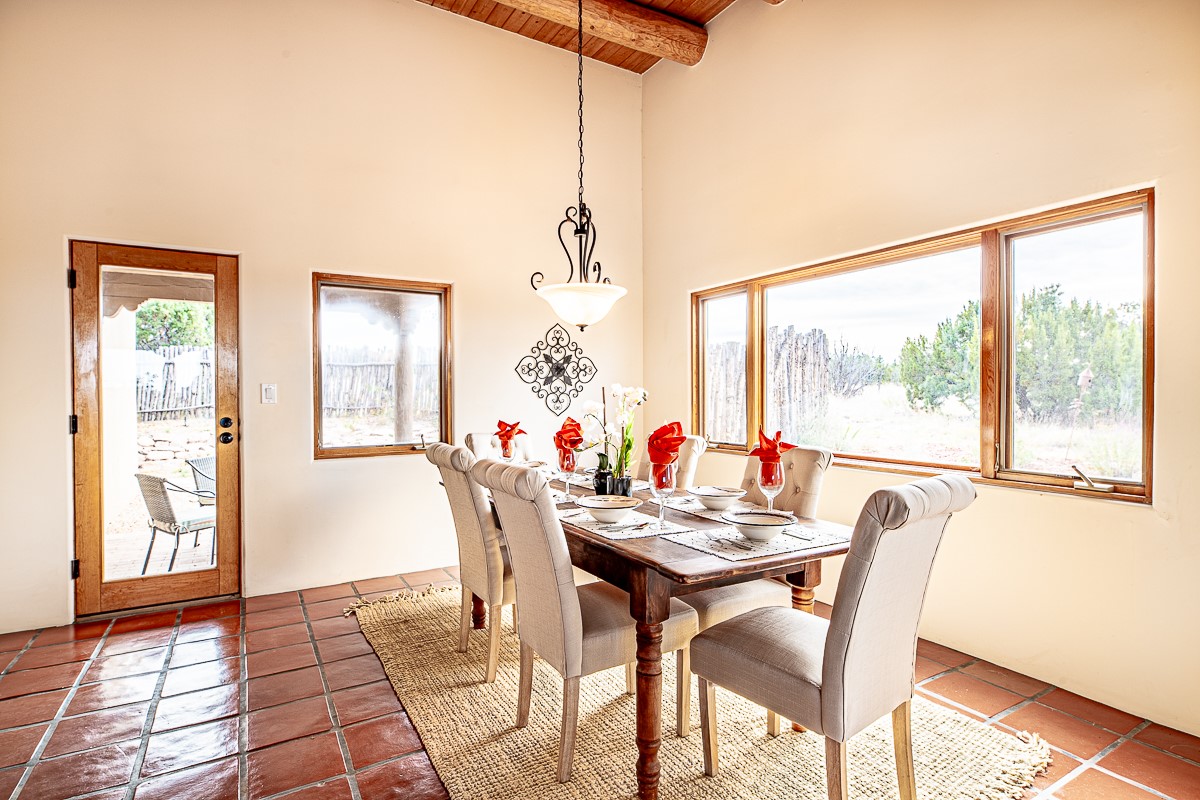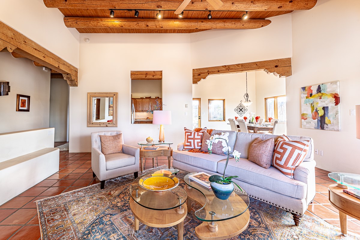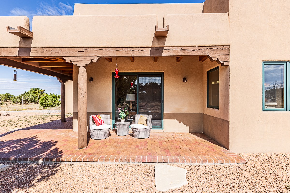 Motivated seller! This light filled home in Eldorado has high ceilings and features vigas, a kiva fireplace, saltillo tile floors, and tile bathroom counters and tub surrounds. There is comfortable outdoor living with two portals off the living room/entry and the dining room. Enjoy the outdoor space under a gazebo or in a hot tub to look at the stars. The house is situated to get plenty of warmth from the sun in the winter and little direct sun in the summer. There is lots to see in this well designed home.