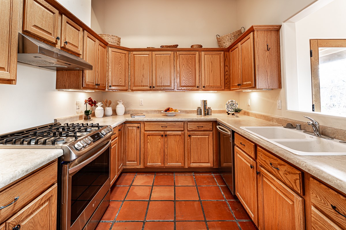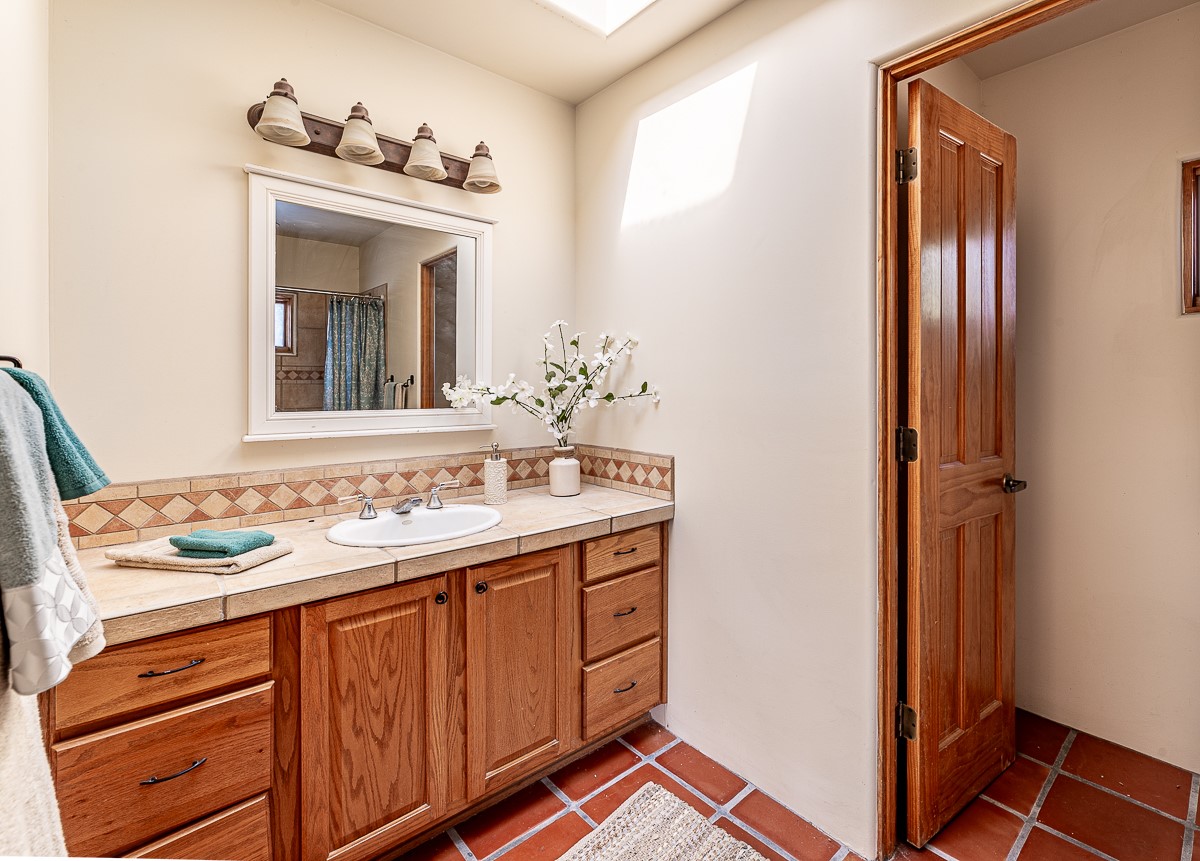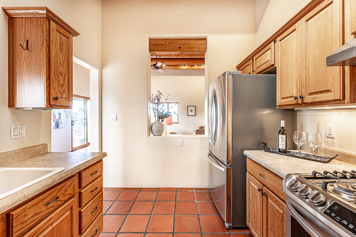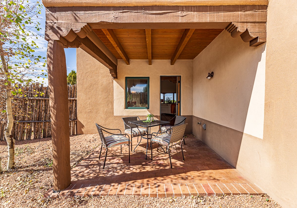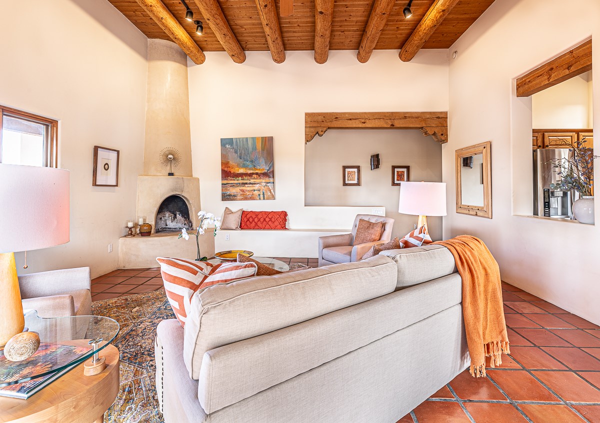 Motivated seller! This light filled home in Eldorado has high ceilings and features vigas, a kiva fireplace, saltillo tile floors, and tile bathroom counters and tub surrounds. There is comfortable outdoor living with two portals off the living room/entry and the dining room. Enjoy the outdoor space under a gazebo or in a hot tub to look at the stars. The house is situated to get plenty of warmth from the sun in the winter and little direct sun in the summer. There is lots to see in this well designed home.