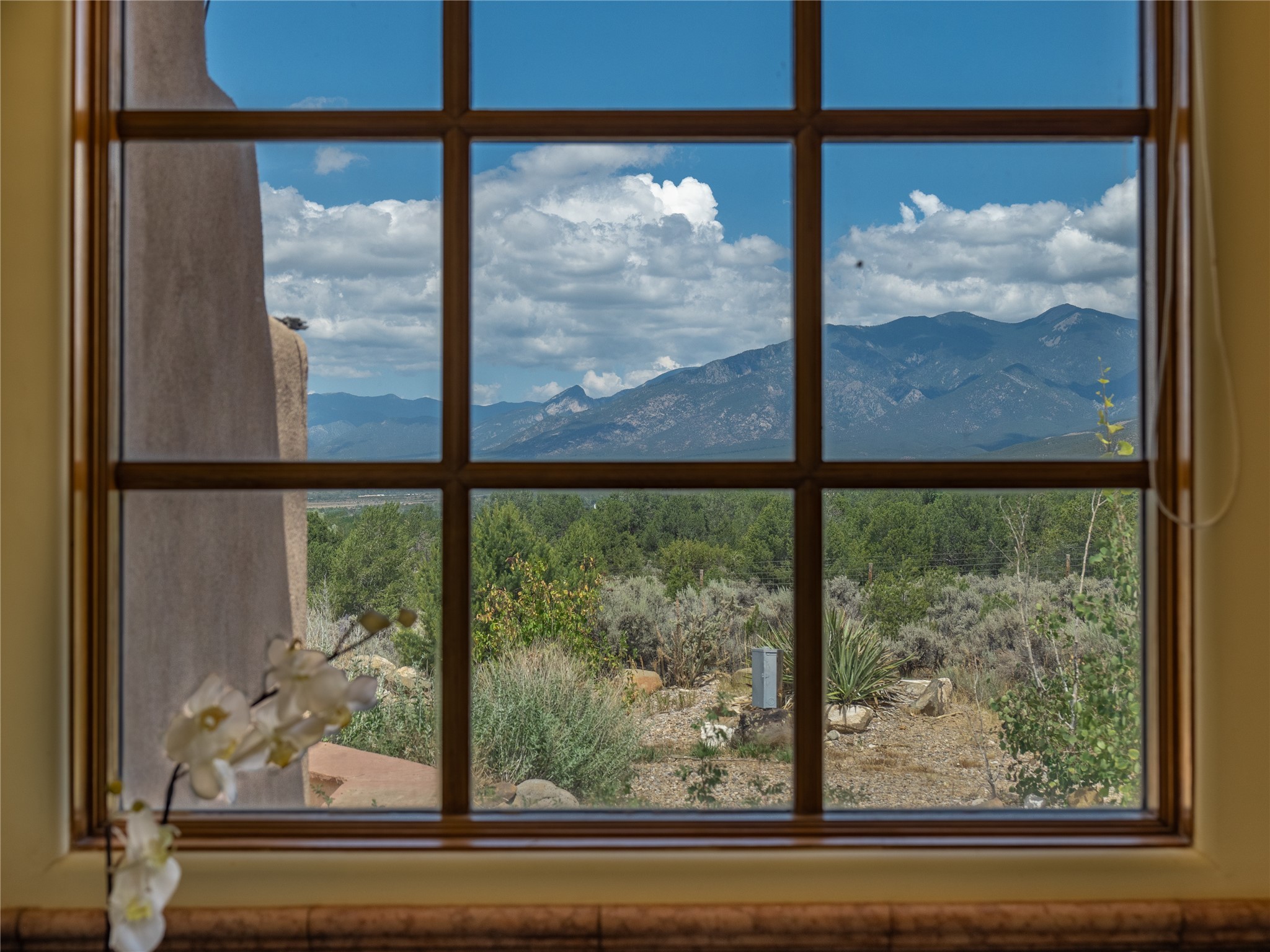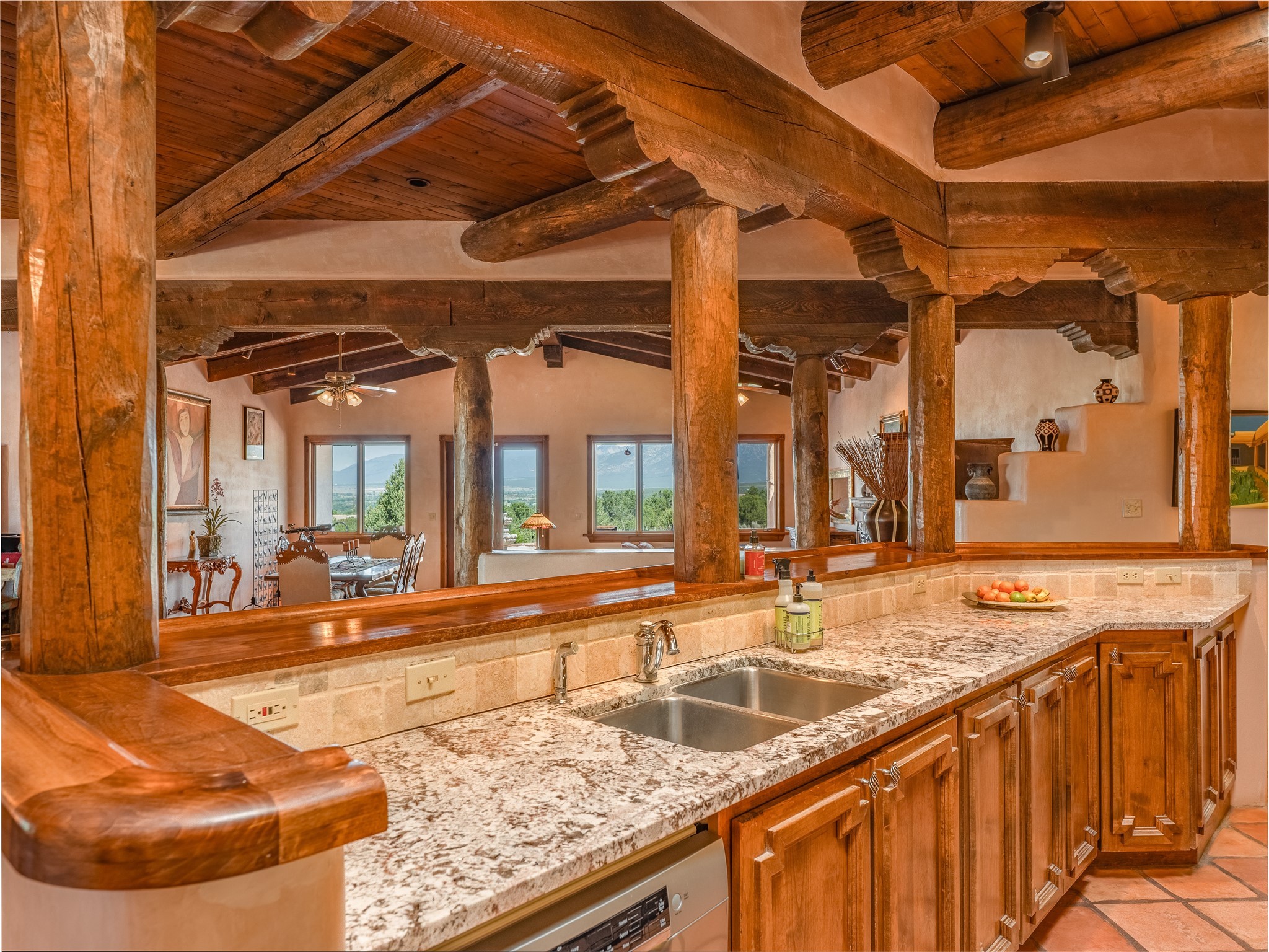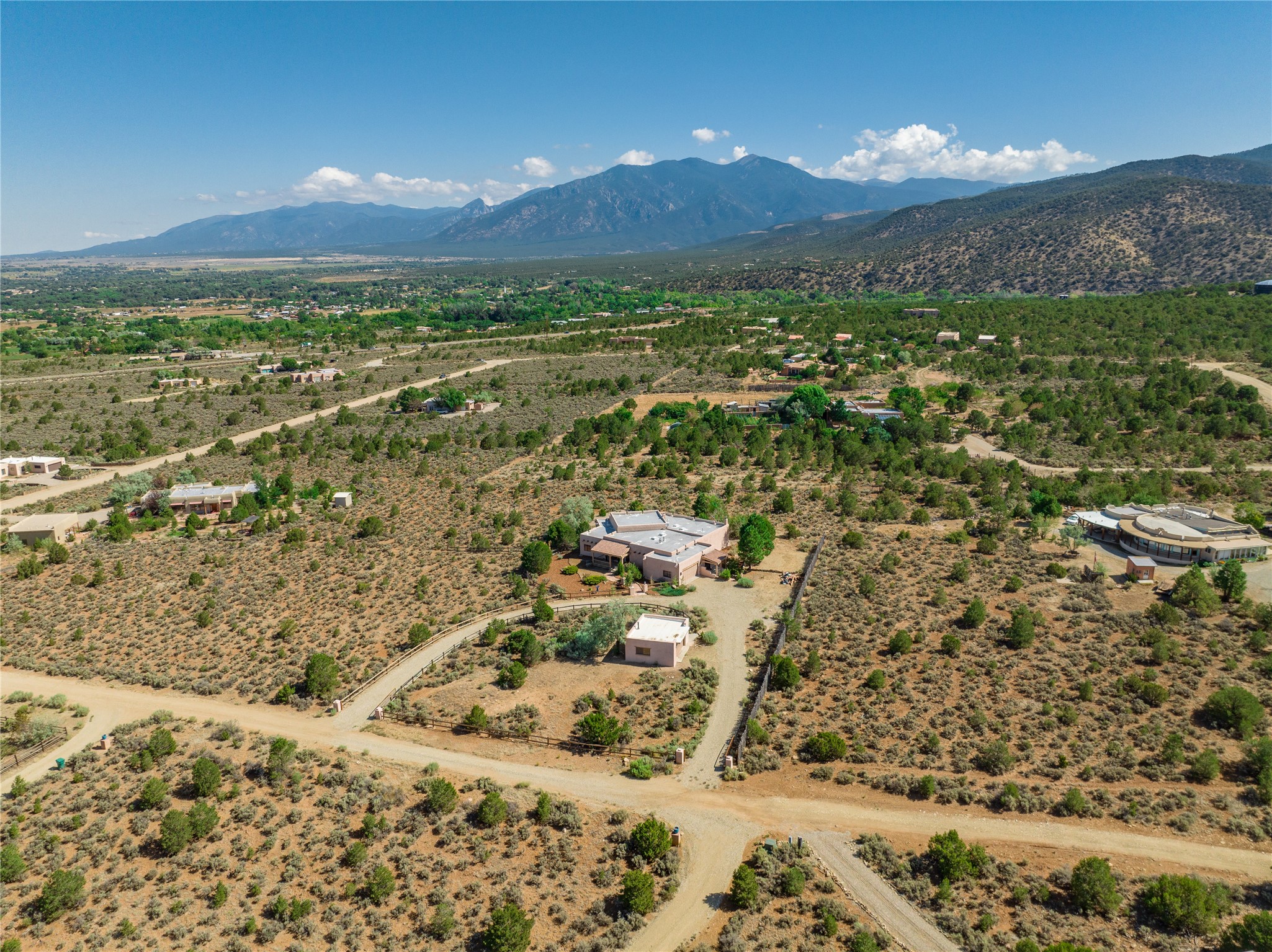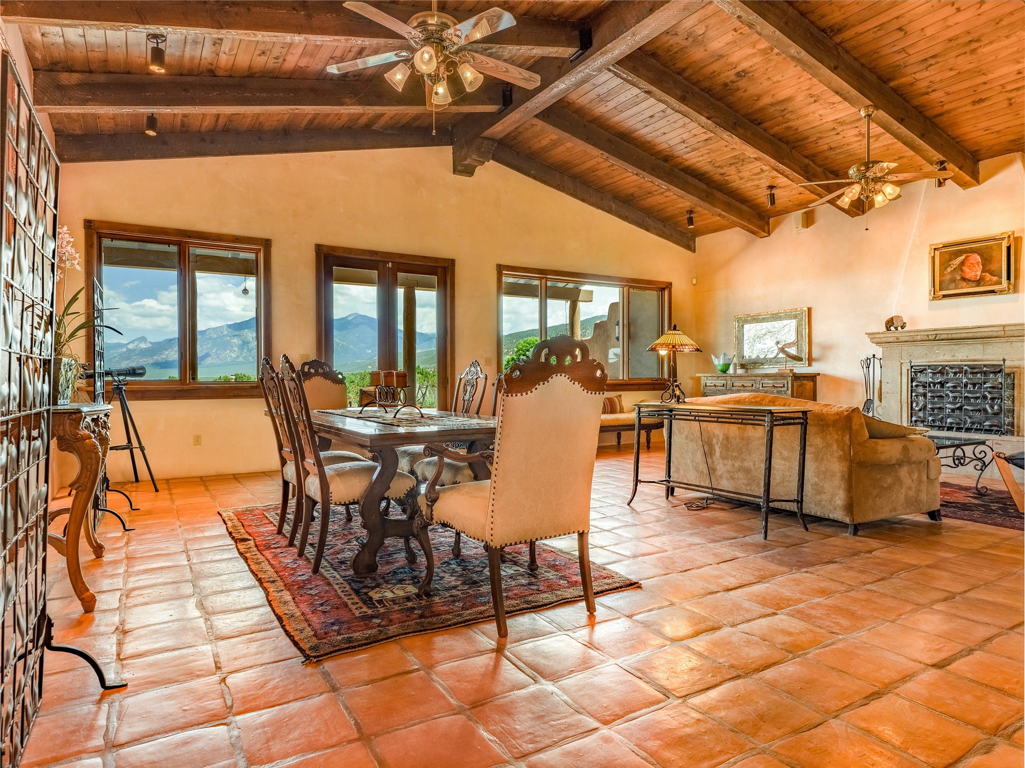 Come see this stunning Taos property before it's gone! Set on 3 acres in the Weimer neighborhood, the beautiful adobe-style home comes with excellent views of the Sangre de Cristo mountains. Inside, enjoy iconic Southwestern features such as saltillo tile floors, plaster walls, and large vigas throughout the entire home. Marvel at the unobstructed views of the mountains from the spacious living area with a vaulted ceiling, wood-burning fireplace, and access to the covered patio. The large kitchen offers beautiful wood cabinetry and tilework, a large pantry, and ample space for creating gourmet meals on the granite countertops. The primary bedroom has a kiva-style fireplace and the ensuite bathroom features a walk-in shower and large tub with luxury tiling and a massive walk-in closet. Two guest bedrooms with ensuite bathrooms offer plenty of room for the entire family. Additional features include a fourth bedroom that is currently setup as a billiards room and a laundry room with full size washer and dryer. An attached garage has room for two vehicles, and a separate outbuilding can store two more vehicles or be finished out as a studio or workshop. Enjoy the comforts of southwestern luxury with 1101 Hennings Street!