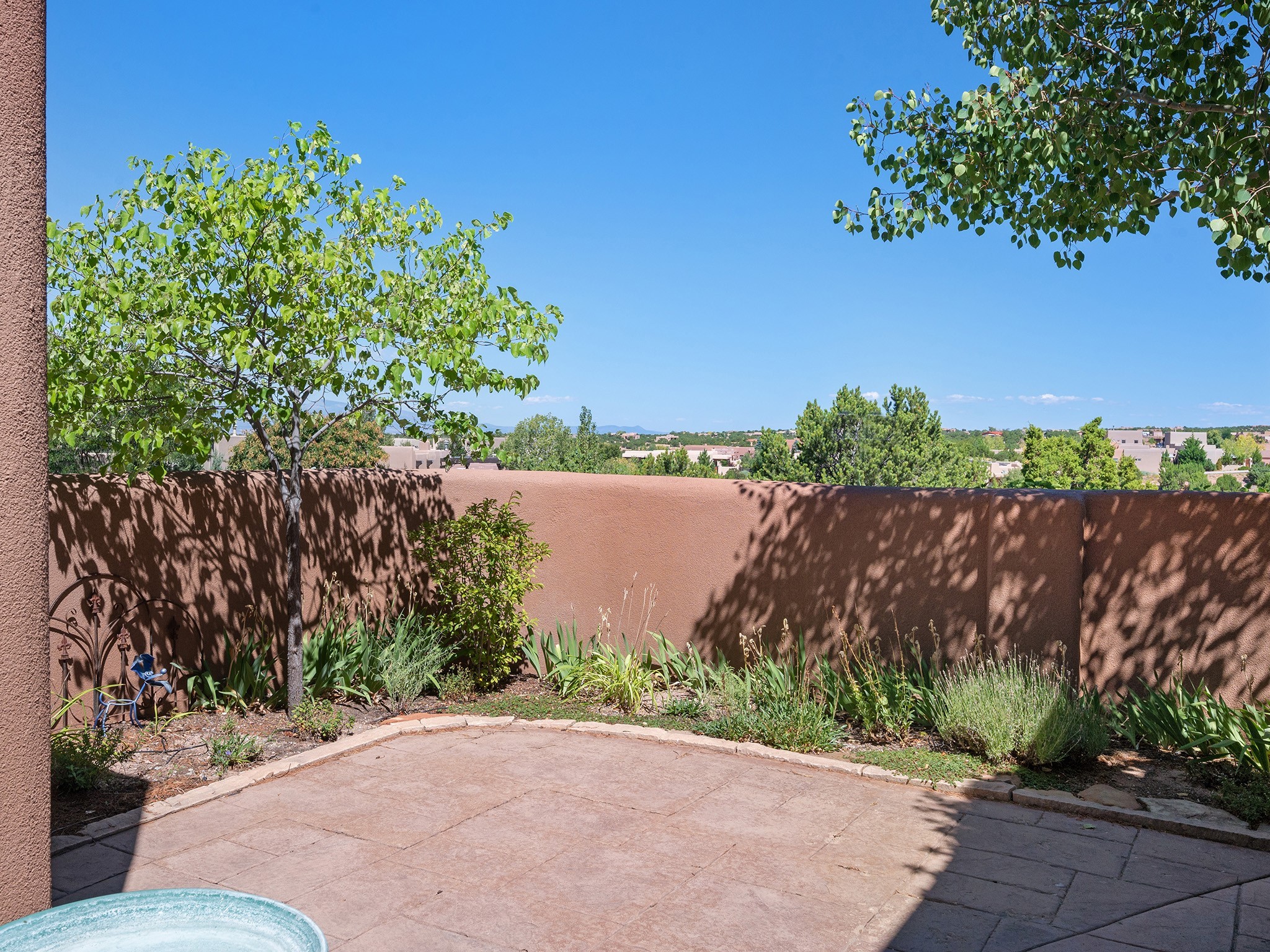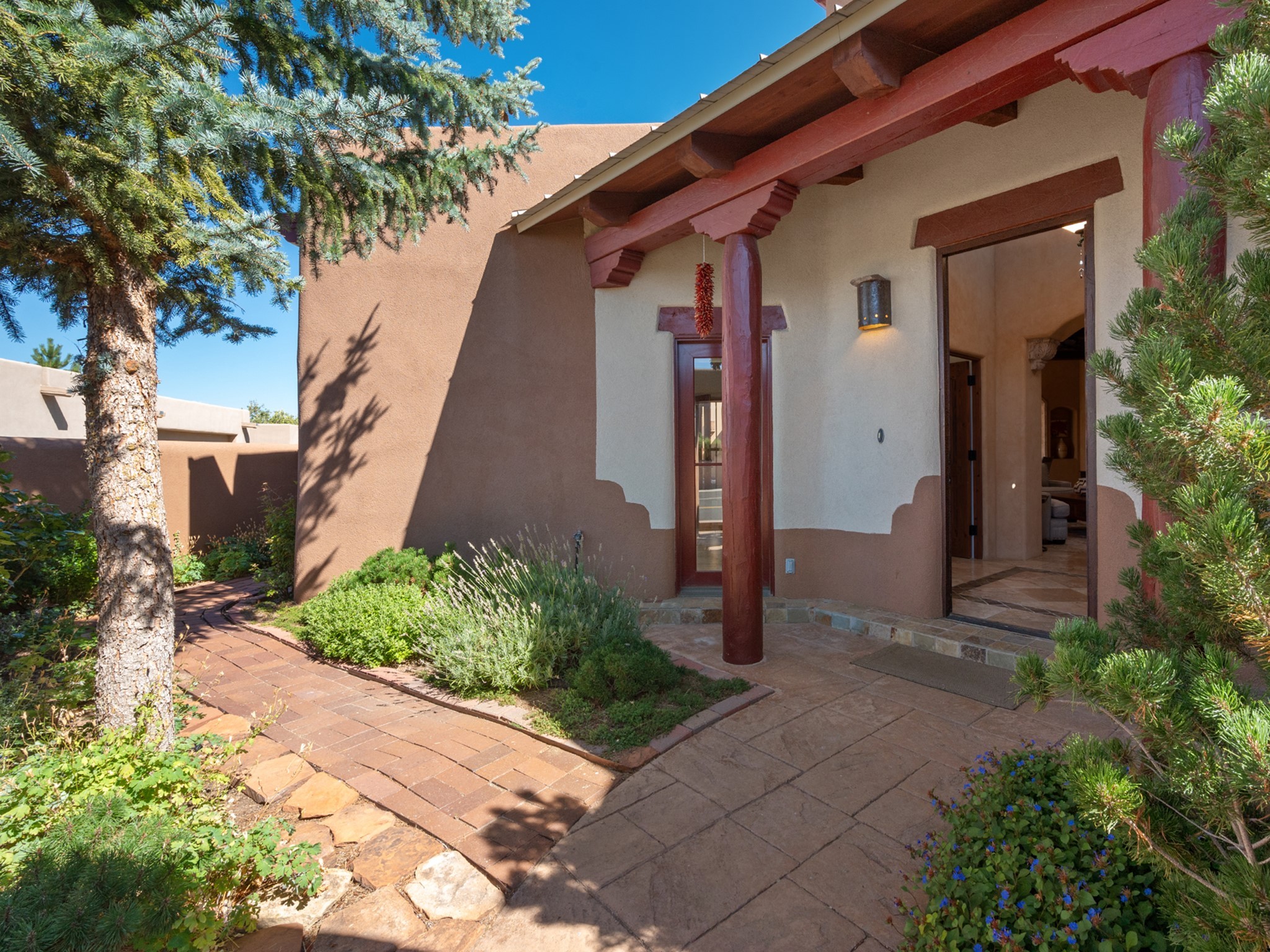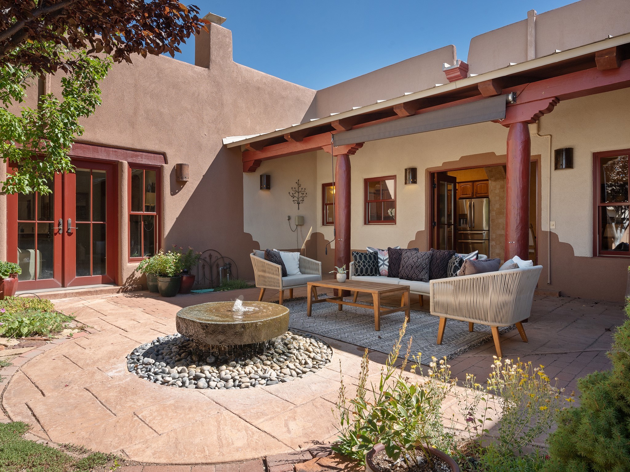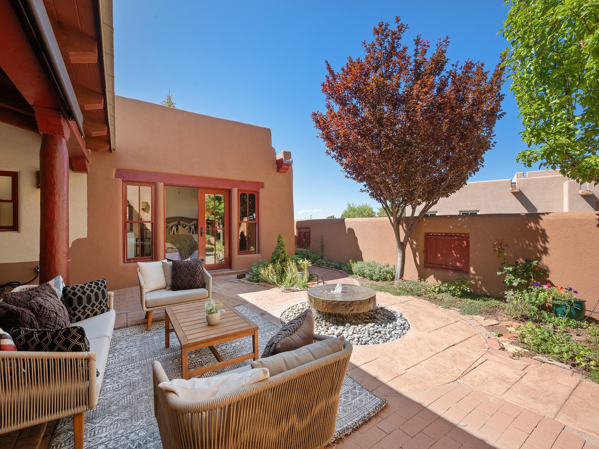 Enter through the front door into this Old Mexico inspired courtyard home. Here you will find 2371 sf, 3 bedroom and 3/1/2 Baths. This romantic home features and open floor plan with 12 foot beamed ceilings, travertine floors a gas fireplace in the living room,lovely golden plaster walls and cantera stone accents found in the corbels and on the fireplace hearth. Off of the dining room there are french doors that lead to a lovely courtyard that lives like a outdoor living room where you can relax and entertain under the covered portal. You will also enjoy the calming sound of the bubbling fountain from stone forest. The kitchen has granite tile counters a gas range and tile backsplash. There are plenty of warm honey color cabinets and a bar that looks out into the courtyard. This is a great area to do work at home and take advantage of the high speed internet Aldea offers. There are two bedroom at the front of the house are spacious. One leads to the courtyard and the other has a separate entrance so you can use it as an office. The Primary bedroom is in the opposite side of the house and also has french doors that also lead to the courtyard. The primary bathroom has been upgraded with a walk in shower and a solid surface countertop. The laundry room is also conveniently located and includes cabinets, shelving and a nice sized sink.The 2 car garage is located off of the ally way with direct entry into the house. The house was stuccoed by Tesuque Stucco in April of 2014 and has some time left on the 10 year warranty. Here there is also another courtyard where you can view the sunset over the mountains. This gorgeous home finishes add to the ambiance of a special place set apart.