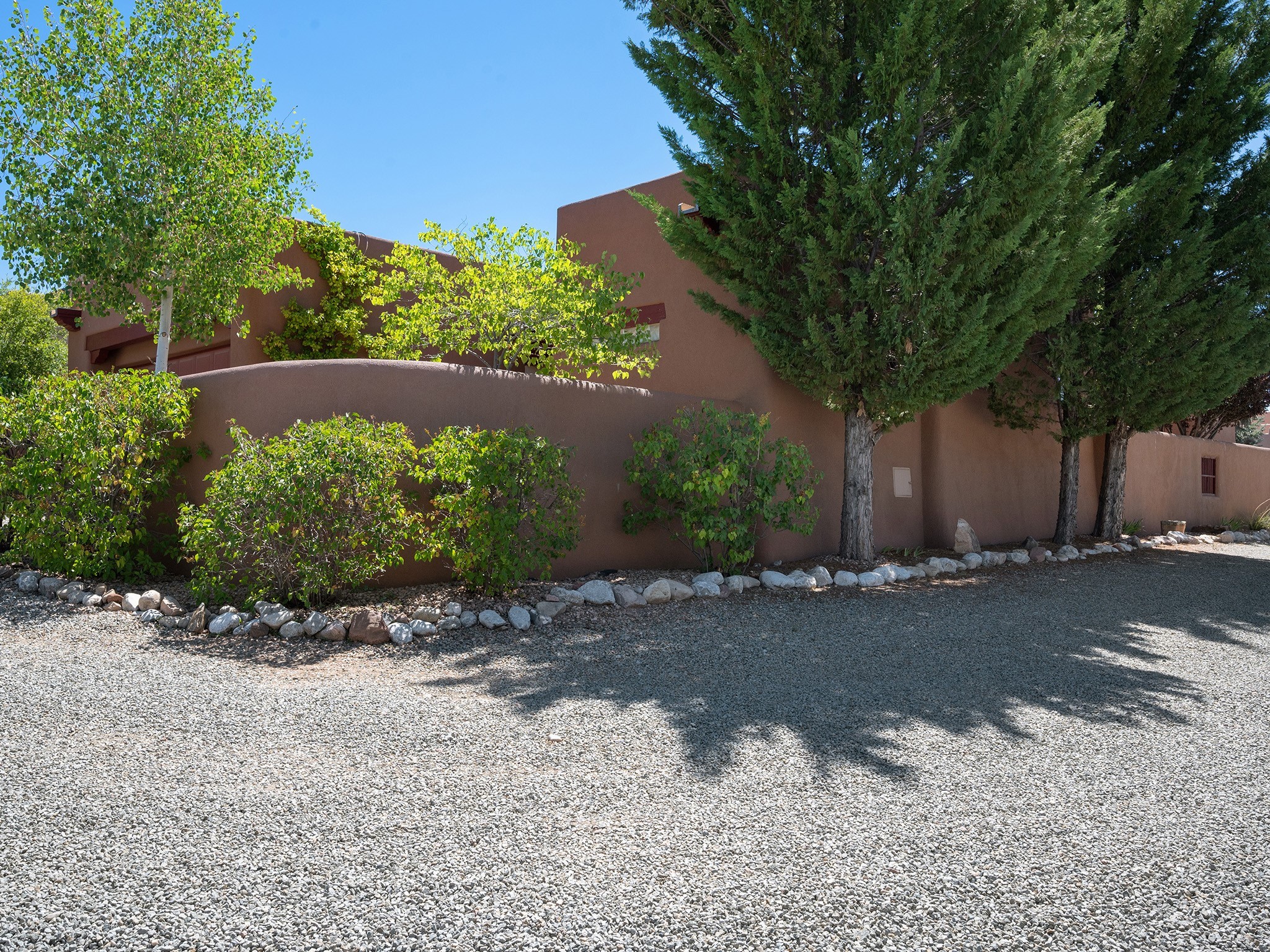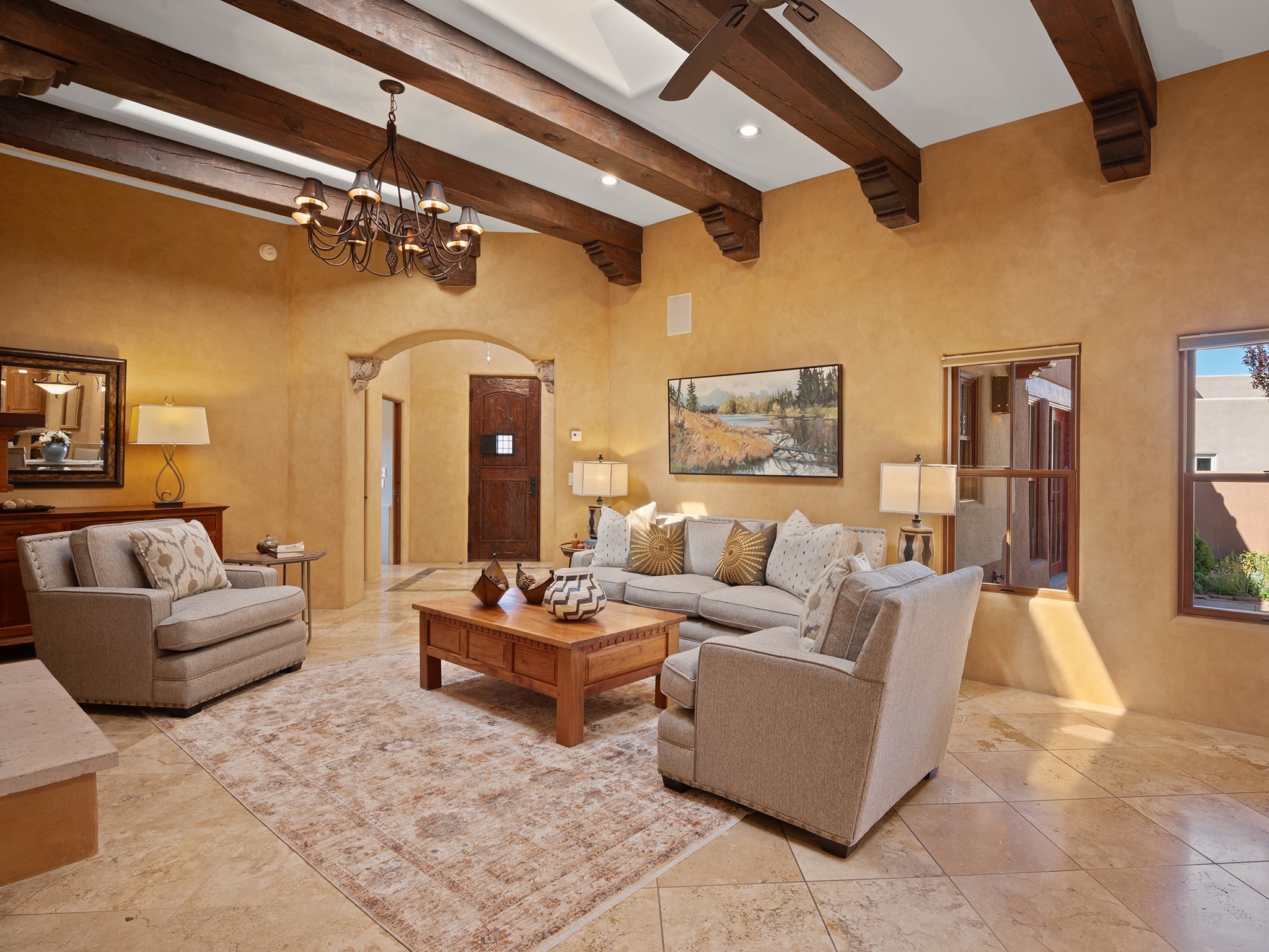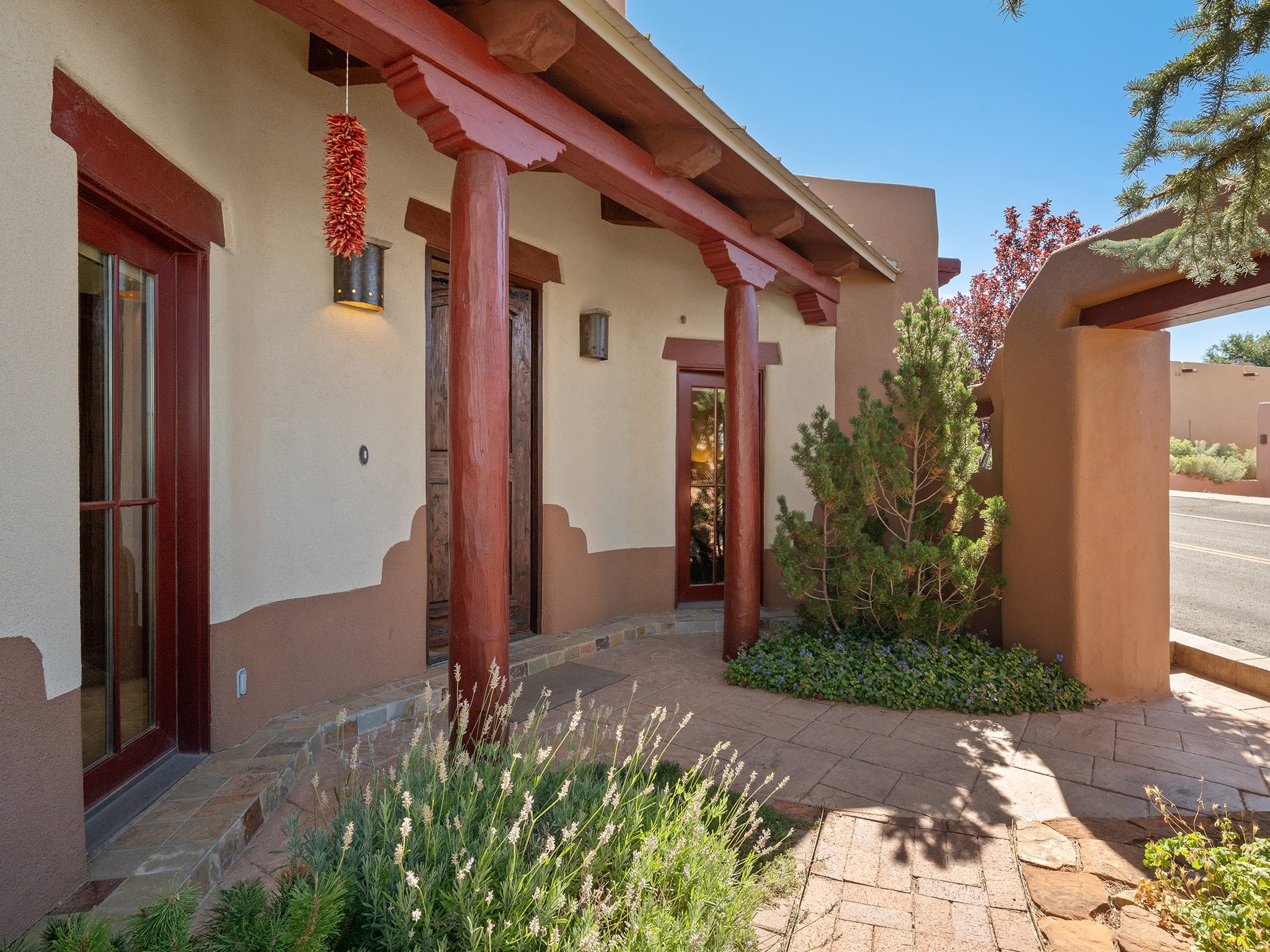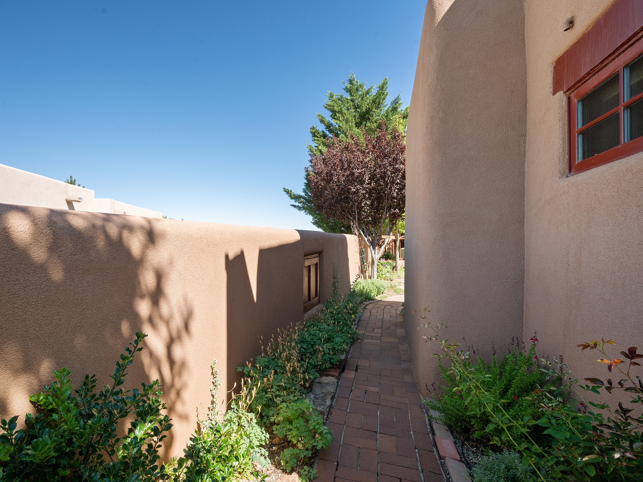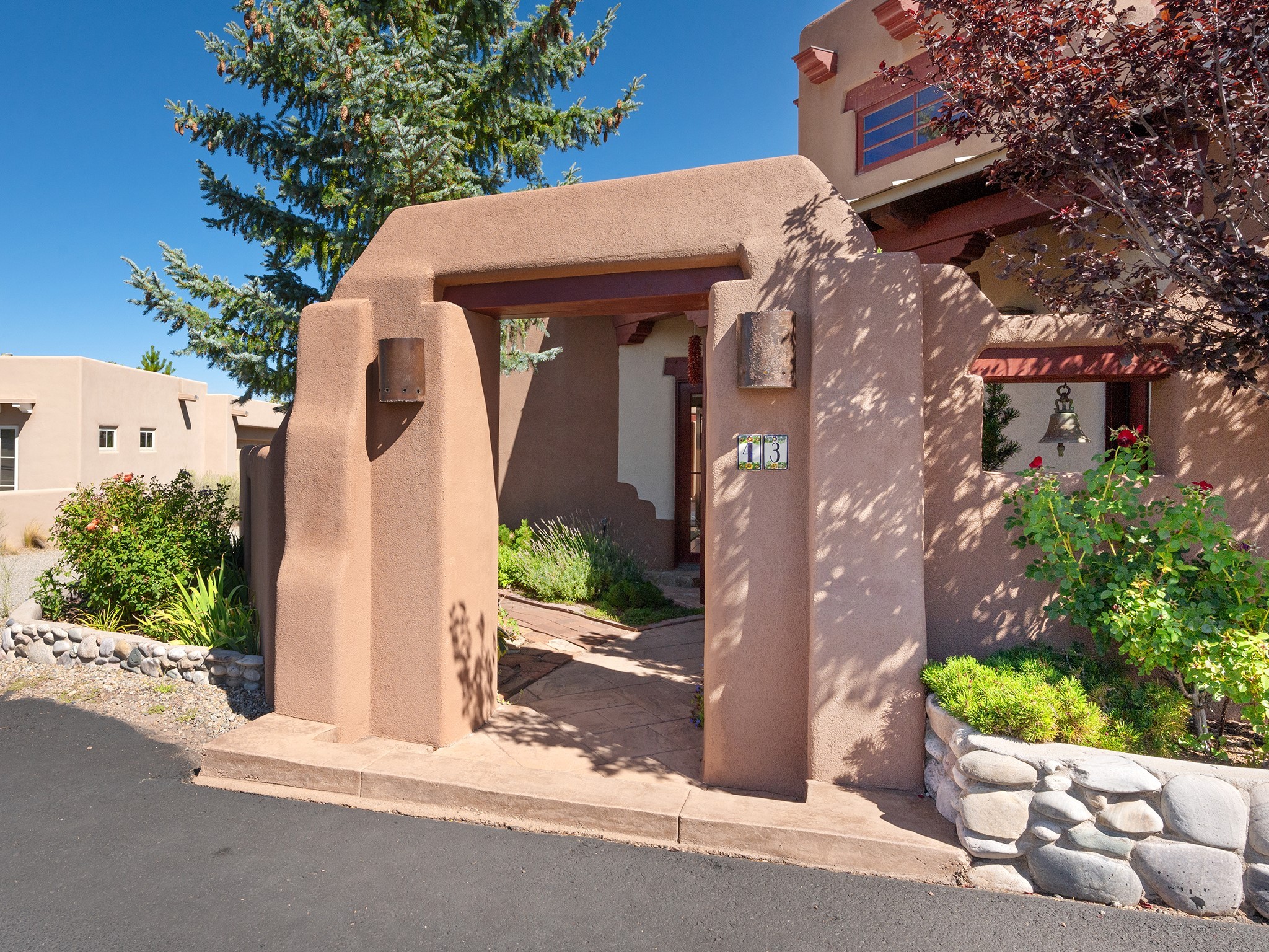 Enter through the front door into this Old Mexico inspired courtyard home. Here you will find 2371 sf, 3 bedroom and 3/1/2 Baths. This romantic home features and open floor plan with 12 foot beamed ceilings, travertine floors a gas fireplace in the living room,lovely golden plaster walls and cantera stone accents found in the corbels and on the fireplace hearth. Off of the dining room there are french doors that lead to a lovely courtyard that lives like a outdoor living room where you can relax and entertain under the covered portal. You will also enjoy the calming sound of the bubbling fountain from stone forest. The kitchen has granite tile counters a gas range and tile backsplash. There are plenty of warm honey color cabinets and a bar that looks out into the courtyard. This is a great area to do work at home and take advantage of the high speed internet Aldea offers. There are two bedroom at the front of the house are spacious. One leads to the courtyard and the other has a separate entrance so you can use it as an office. The Primary bedroom is in the opposite side of the house and also has french doors that also lead to the courtyard. The primary bathroom has been upgraded with a walk in shower and a solid surface countertop. The laundry room is also conveniently located and includes cabinets, shelving and a nice sized sink.The 2 car garage is located off of the ally way with direct entry into the house. The house was stuccoed by Tesuque Stucco in April of 2014 and has some time left on the 10 year warranty. Here there is also another courtyard where you can view the sunset over the mountains. This gorgeous home finishes add to the ambiance of a special place set apart.