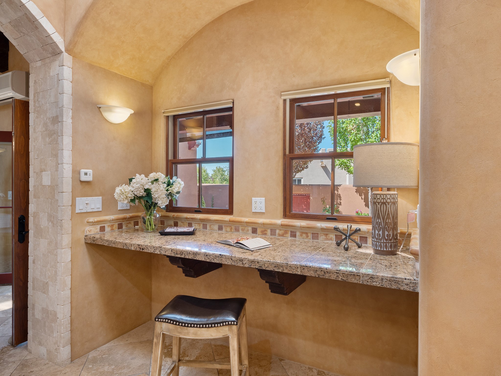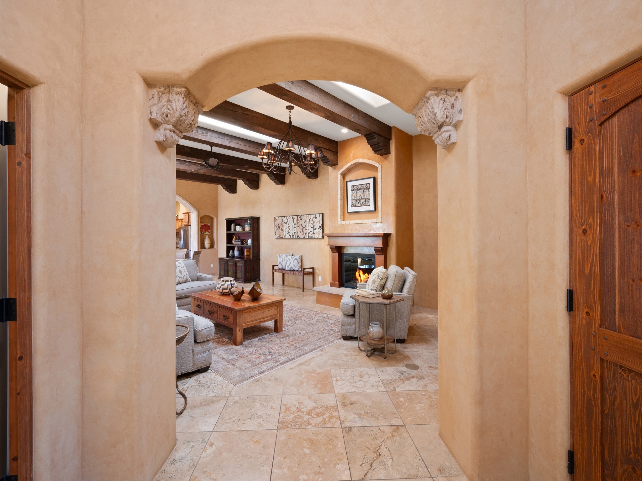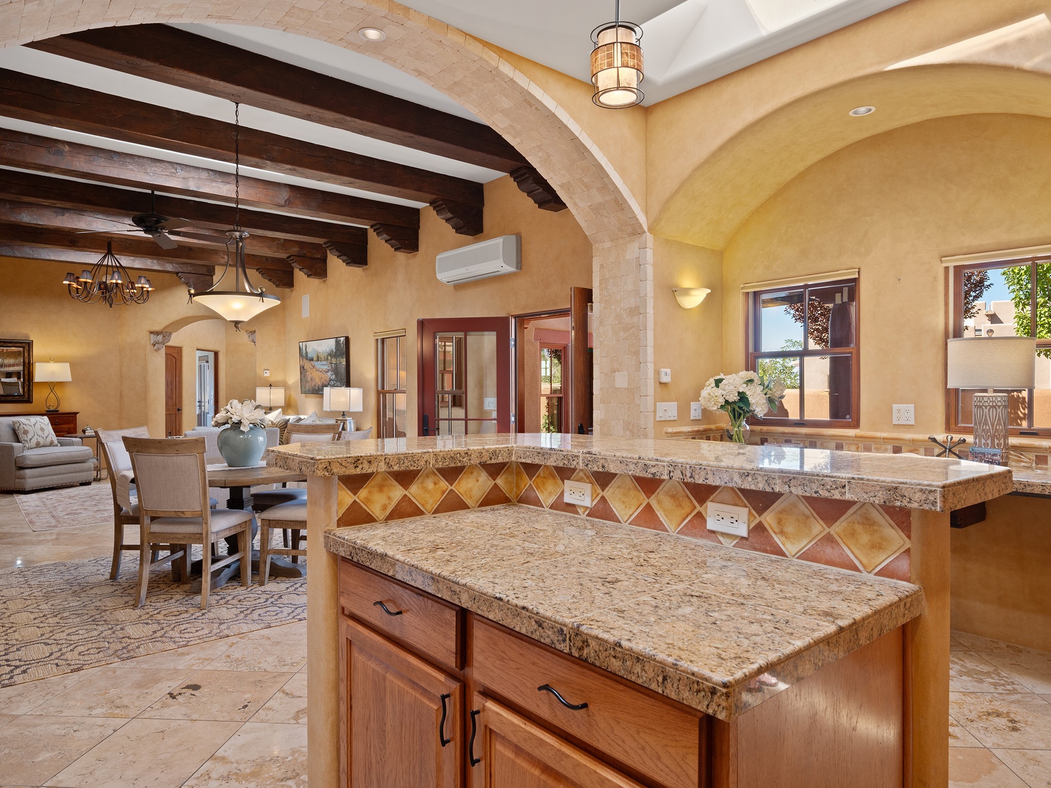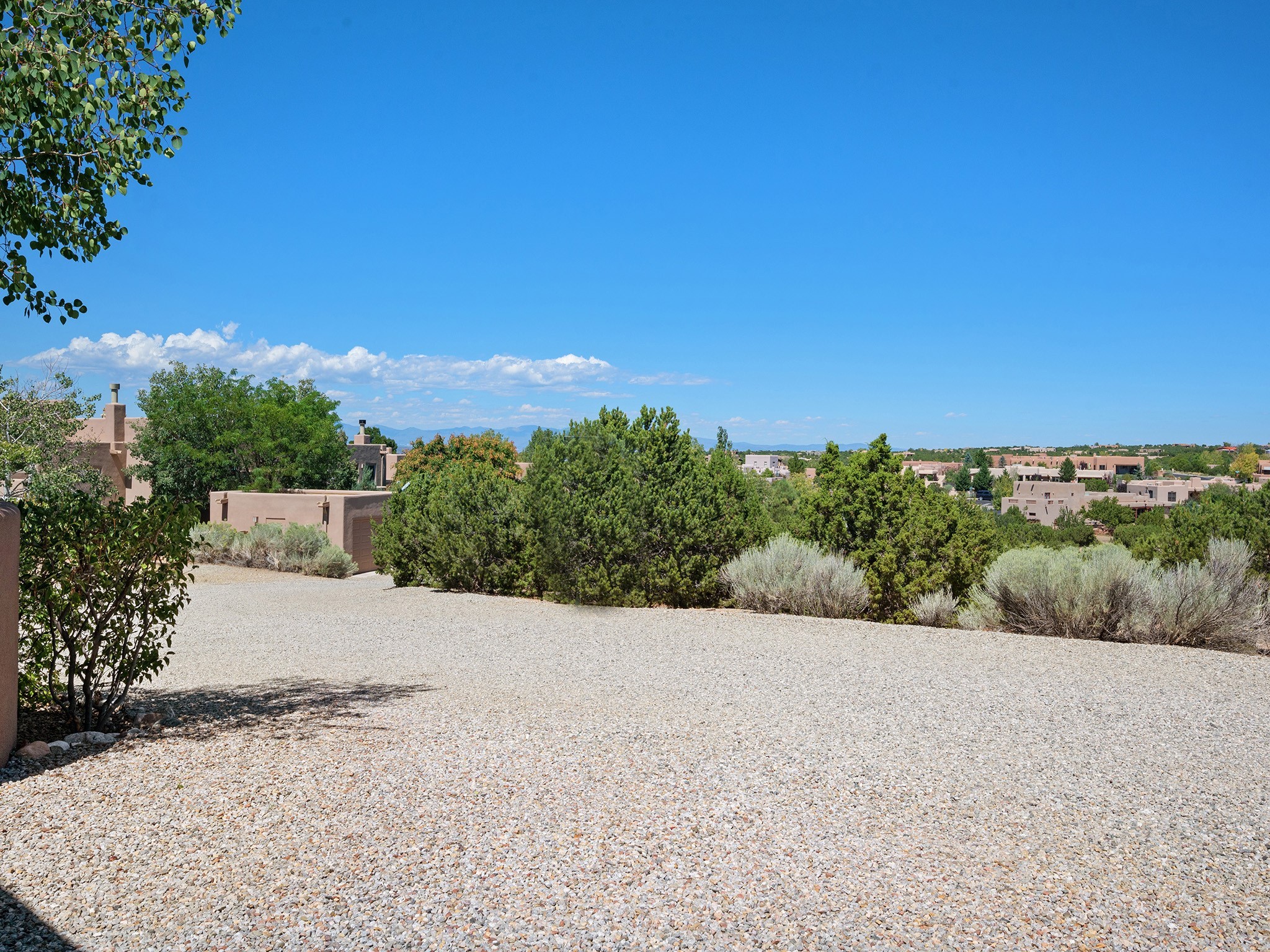 Enter through the front door into this Old Mexico inspired courtyard home. Here you will find 2371 sf, 3 bedroom and 3/1/2 Baths. This romantic home features and open floor plan with 12 foot beamed ceilings, travertine floors a gas fireplace in the living room,lovely golden plaster walls and cantera stone accents found in the corbels and on the fireplace hearth. Off of the dining room there are french doors that lead to a lovely courtyard that lives like a outdoor living room where you can relax and entertain under the covered portal. You will also enjoy the calming sound of the bubbling fountain from stone forest. The kitchen has granite tile counters a gas range and tile backsplash. There are plenty of warm honey color cabinets and a bar that looks out into the courtyard. This is a great area to do work at home and take advantage of the high speed internet Aldea offers. There are two bedroom at the front of the house are spacious. One leads to the courtyard and the other has a separate entrance so you can use it as an office. The Primary bedroom is in the opposite side of the house and also has french doors that also lead to the courtyard. The primary bathroom has been upgraded with a walk in shower and a solid surface countertop. The laundry room is also conveniently located and includes cabinets, shelving and a nice sized sink.The 2 car garage is located off of the ally way with direct entry into the house. The house was stuccoed by Tesuque Stucco in April of 2014 and has some time left on the 10 year warranty. Here there is also another courtyard where you can view the sunset over the mountains. This gorgeous home finishes add to the ambiance of a special place set apart.