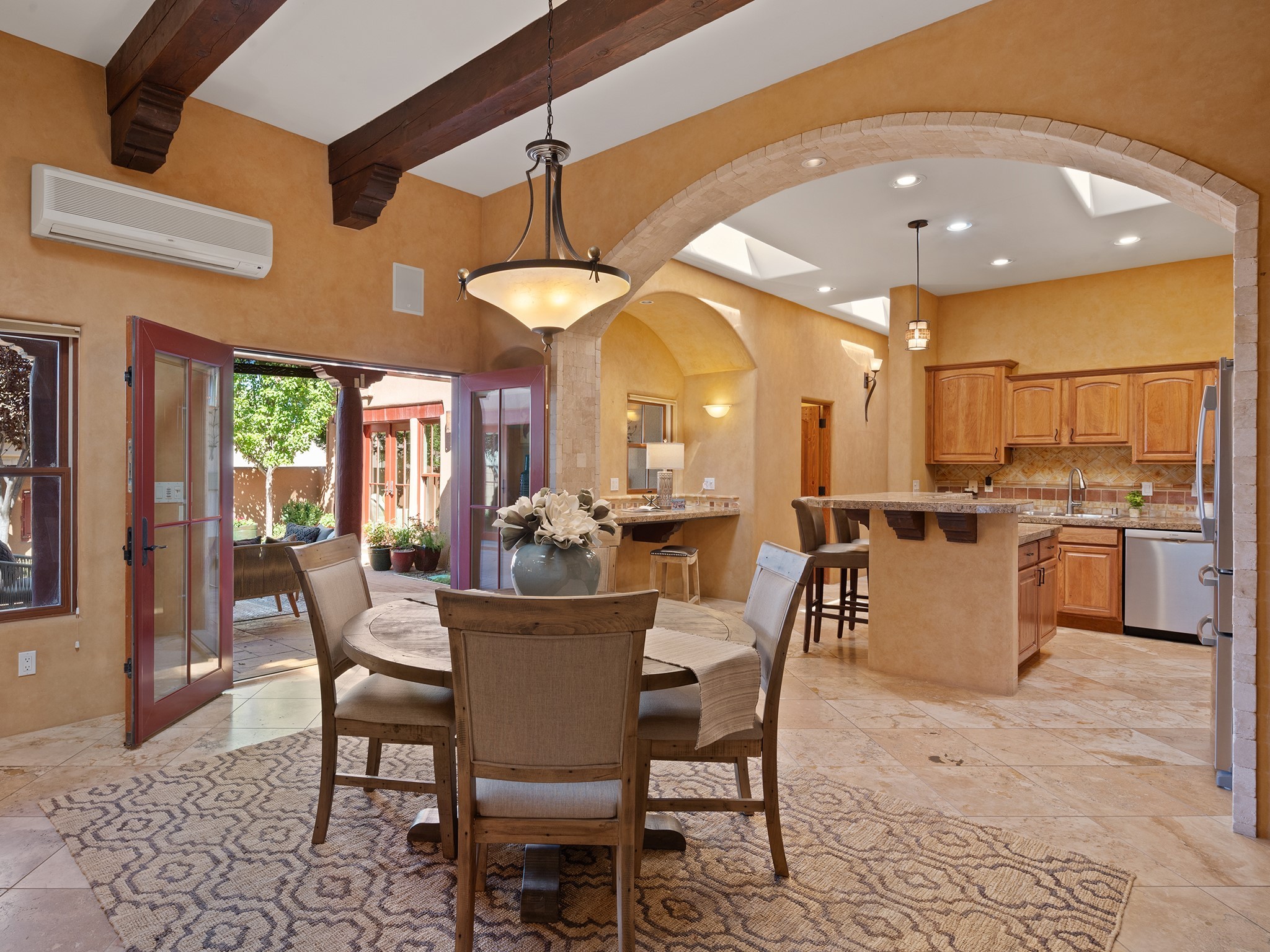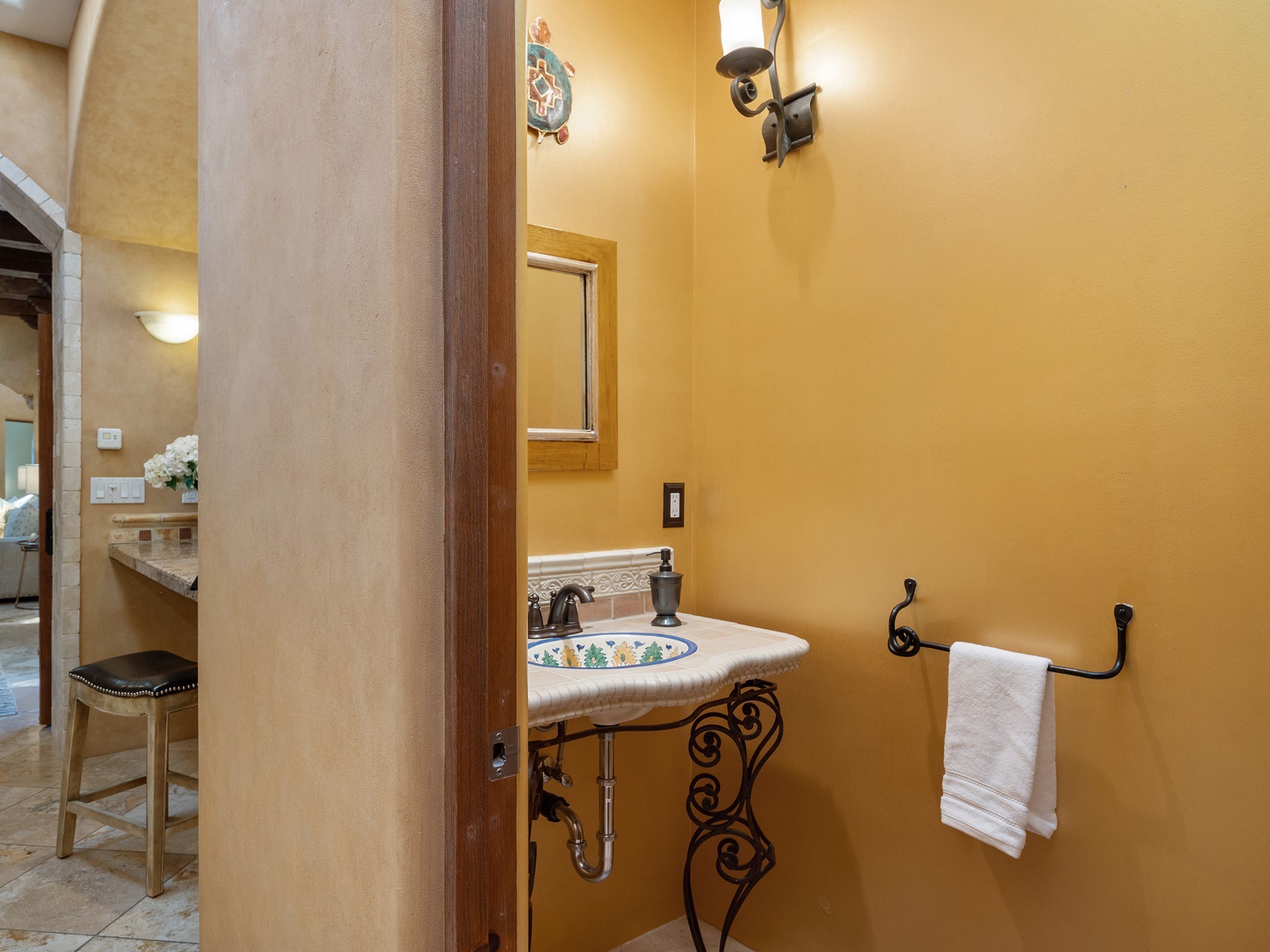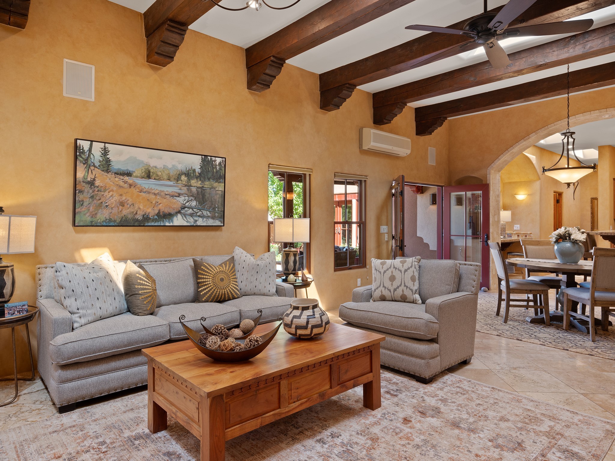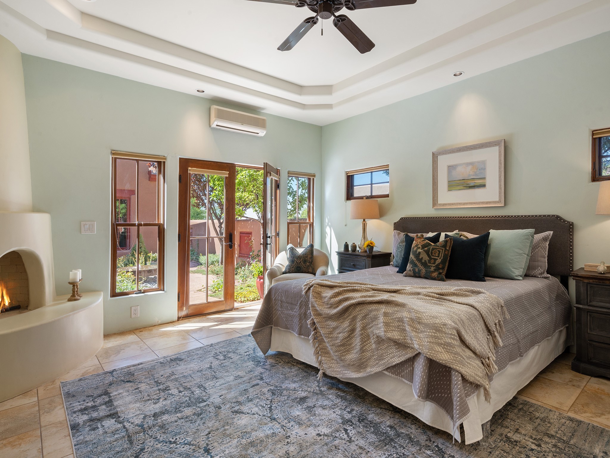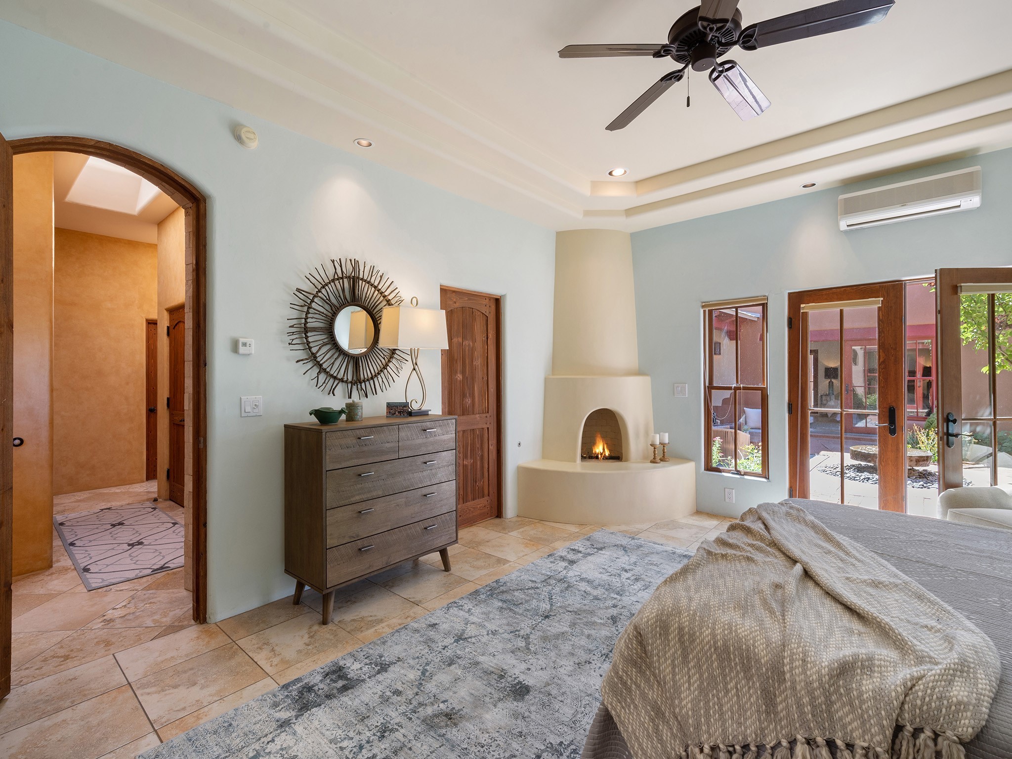 Enter through the front door into this Old Mexico inspired courtyard home. Here you will find 2371 sf, 3 bedroom and 3/1/2 Baths. This romantic home features and open floor plan with 12 foot beamed ceilings, travertine floors a gas fireplace in the living room,lovely golden plaster walls and cantera stone accents found in the corbels and on the fireplace hearth. Off of the dining room there are french doors that lead to a lovely courtyard that lives like a outdoor living room where you can relax and entertain under the covered portal. You will also enjoy the calming sound of the bubbling fountain from stone forest. The kitchen has granite tile counters a gas range and tile backsplash. There are plenty of warm honey color cabinets and a bar that looks out into the courtyard. This is a great area to do work at home and take advantage of the high speed internet Aldea offers. There are two bedroom at the front of the house are spacious. One leads to the courtyard and the other has a separate entrance so you can use it as an office. The Primary bedroom is in the opposite side of the house and also has french doors that also lead to the courtyard. The primary bathroom has been upgraded with a walk in shower and a solid surface countertop. The laundry room is also conveniently located and includes cabinets, shelving and a nice sized sink.The 2 car garage is located off of the ally way with direct entry into the house. The house was stuccoed by Tesuque Stucco in April of 2014 and has some time left on the 10 year warranty. Here there is also another courtyard where you can view the sunset over the mountains. This gorgeous home finishes add to the ambiance of a special place set apart.