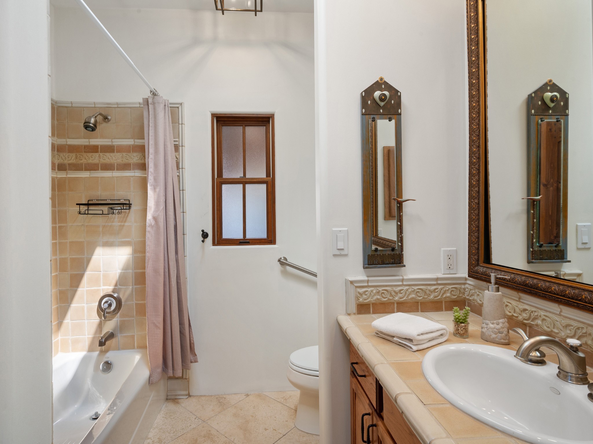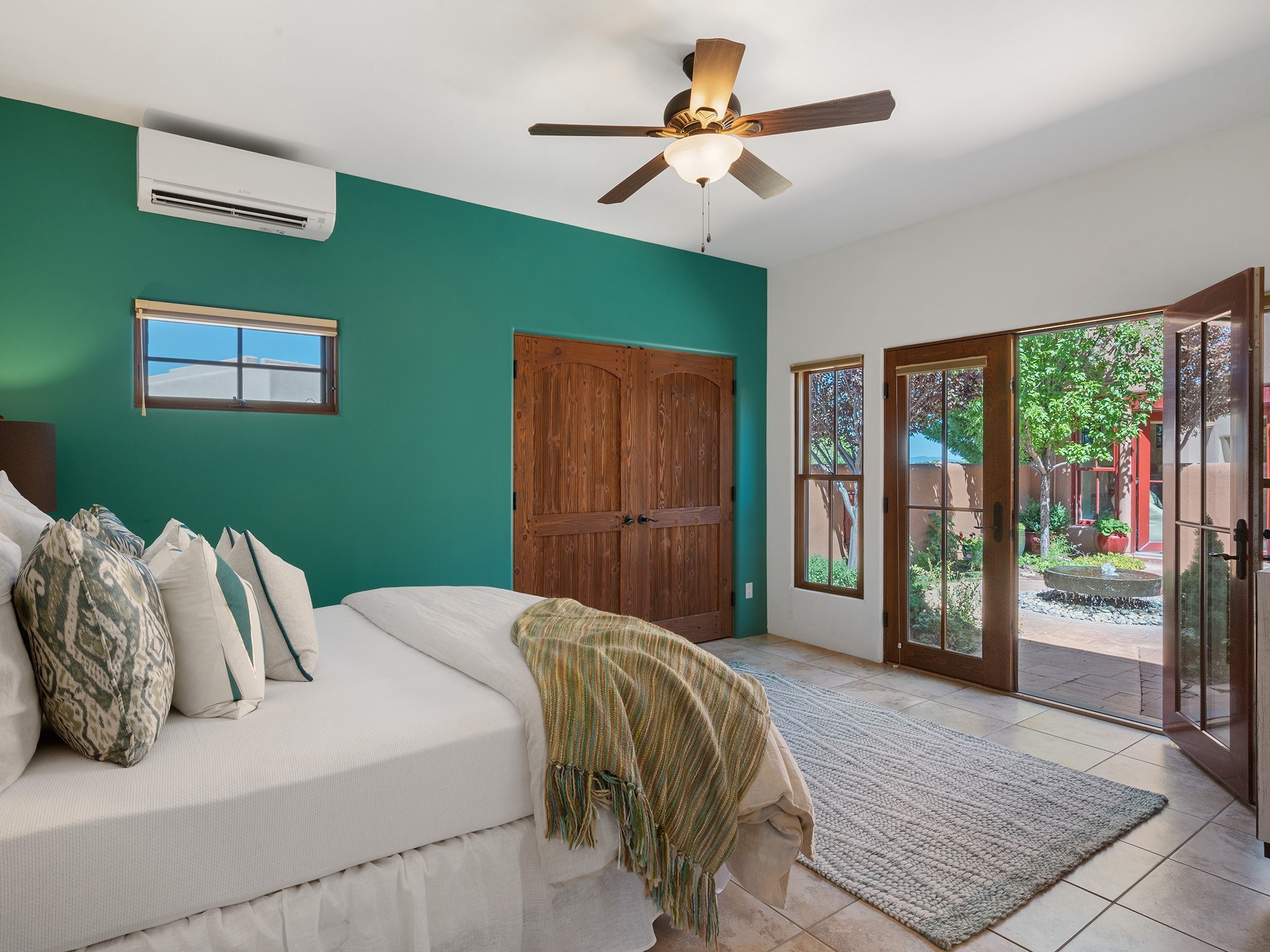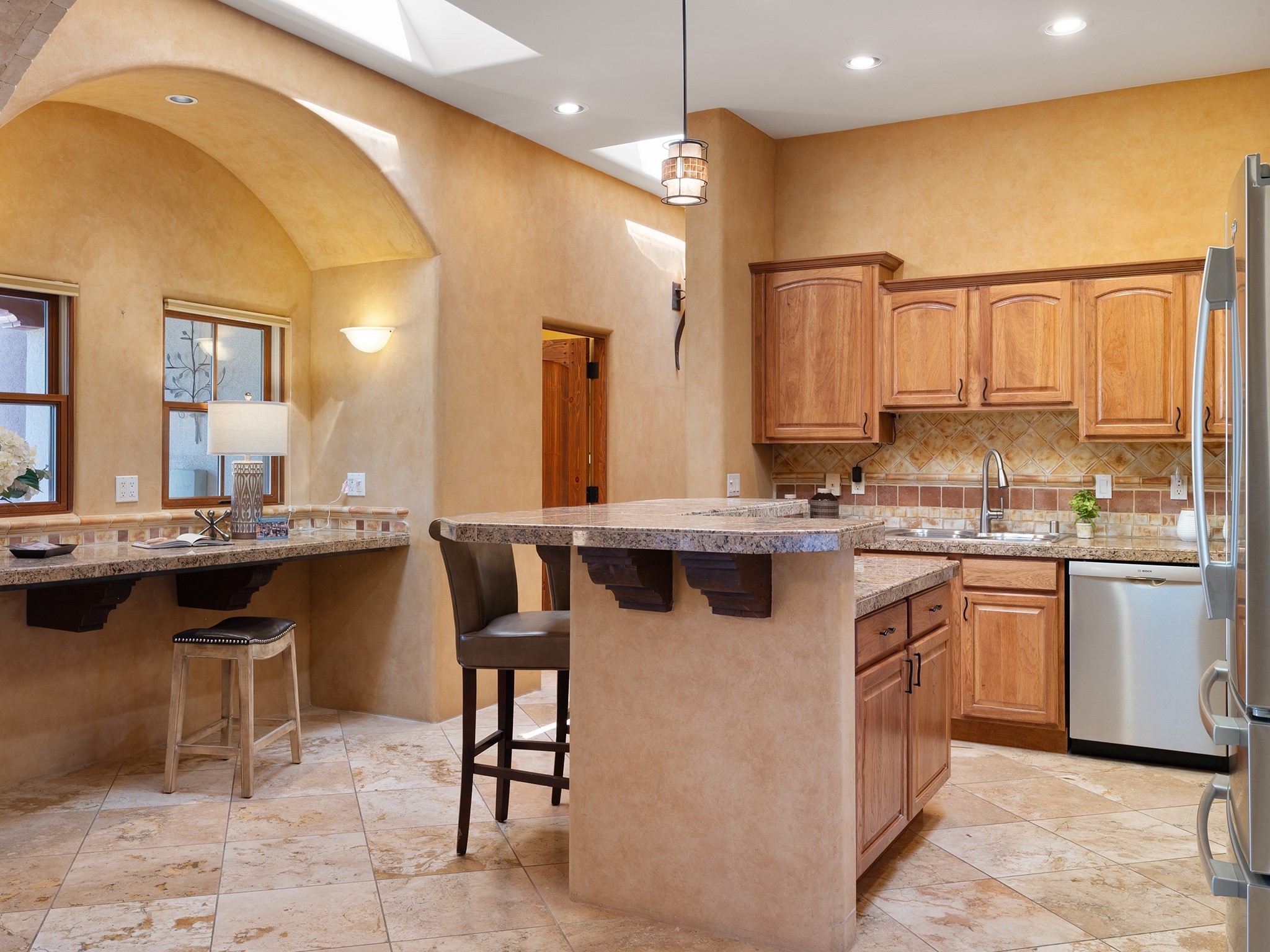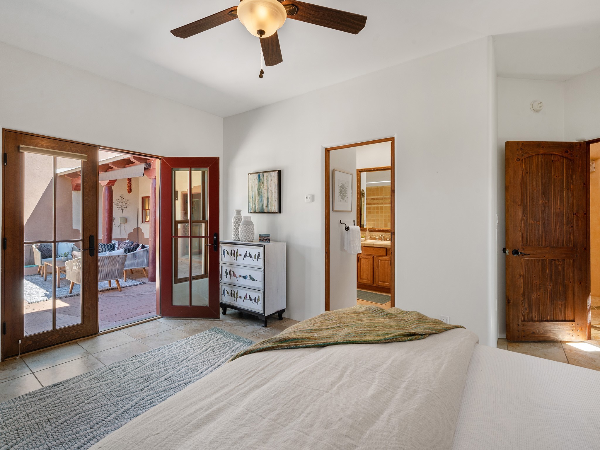 Enter through the front door into this Old Mexico inspired courtyard home. Here you will find 2371 sf, 3 bedroom and 3/1/2 Baths. This romantic home features and open floor plan with 12 foot beamed ceilings, travertine floors a gas fireplace in the living room,lovely golden plaster walls and cantera stone accents found in the corbels and on the fireplace hearth. Off of the dining room there are french doors that lead to a lovely courtyard that lives like a outdoor living room where you can relax and entertain under the covered portal. You will also enjoy the calming sound of the bubbling fountain from stone forest. The kitchen has granite tile counters a gas range and tile backsplash. There are plenty of warm honey color cabinets and a bar that looks out into the courtyard. This is a great area to do work at home and take advantage of the high speed internet Aldea offers. There are two bedroom at the front of the house are spacious. One leads to the courtyard and the other has a separate entrance so you can use it as an office. The Primary bedroom is in the opposite side of the house and also has french doors that also lead to the courtyard. The primary bathroom has been upgraded with a walk in shower and a solid surface countertop. The laundry room is also conveniently located and includes cabinets, shelving and a nice sized sink.The 2 car garage is located off of the ally way with direct entry into the house. The house was stuccoed by Tesuque Stucco in April of 2014 and has some time left on the 10 year warranty. Here there is also another courtyard where you can view the sunset over the mountains. This gorgeous home finishes add to the ambiance of a special place set apart.