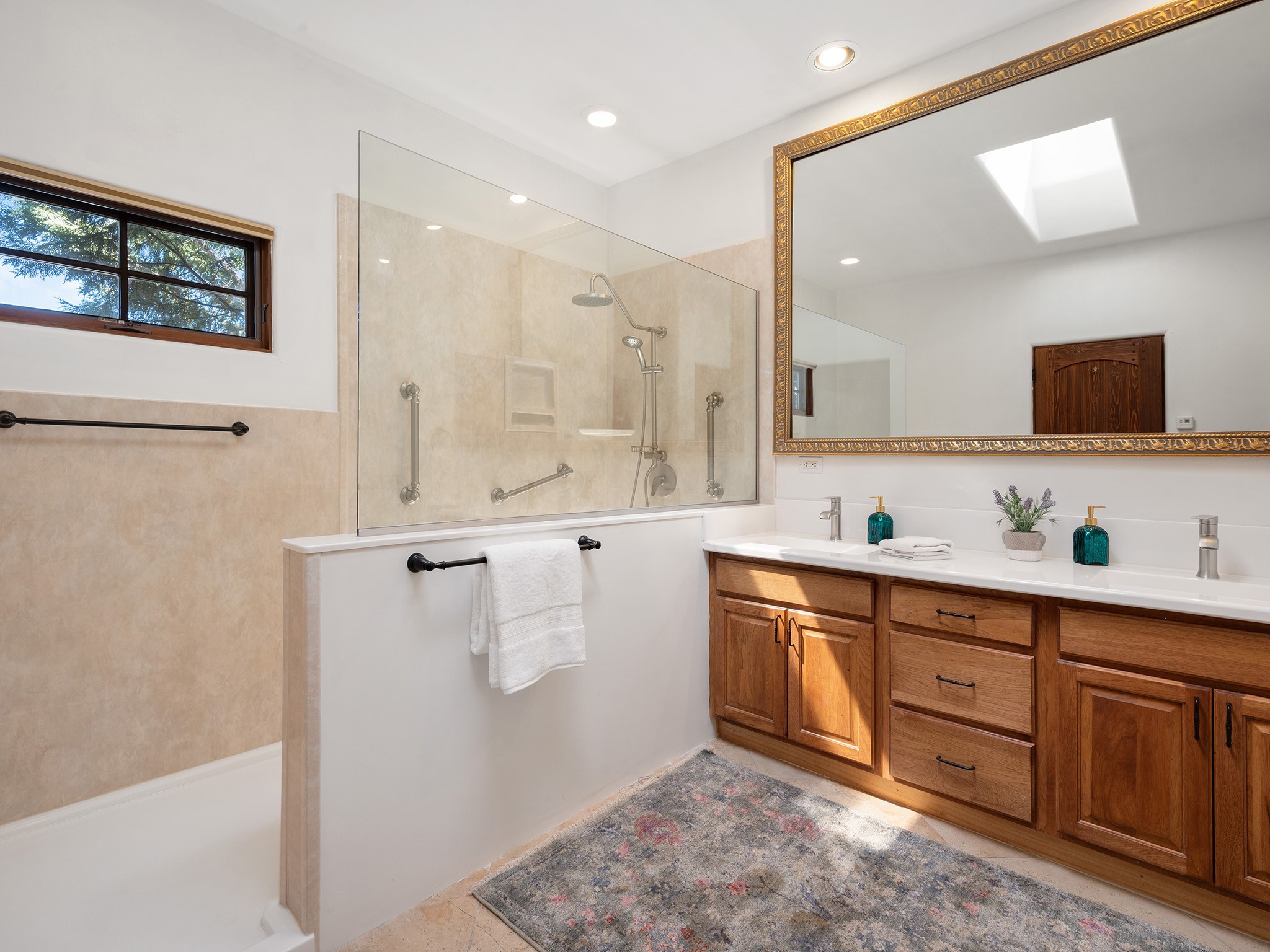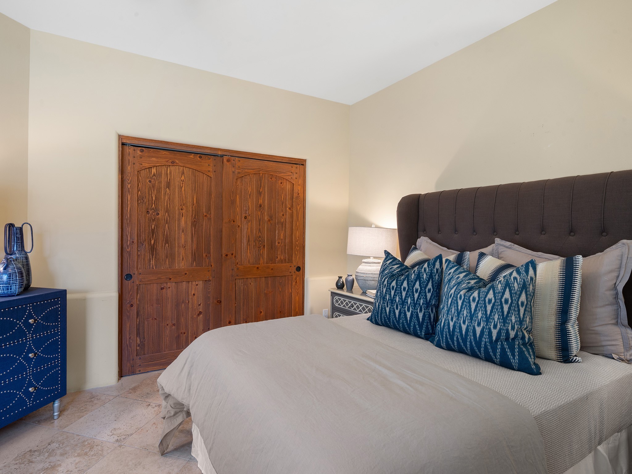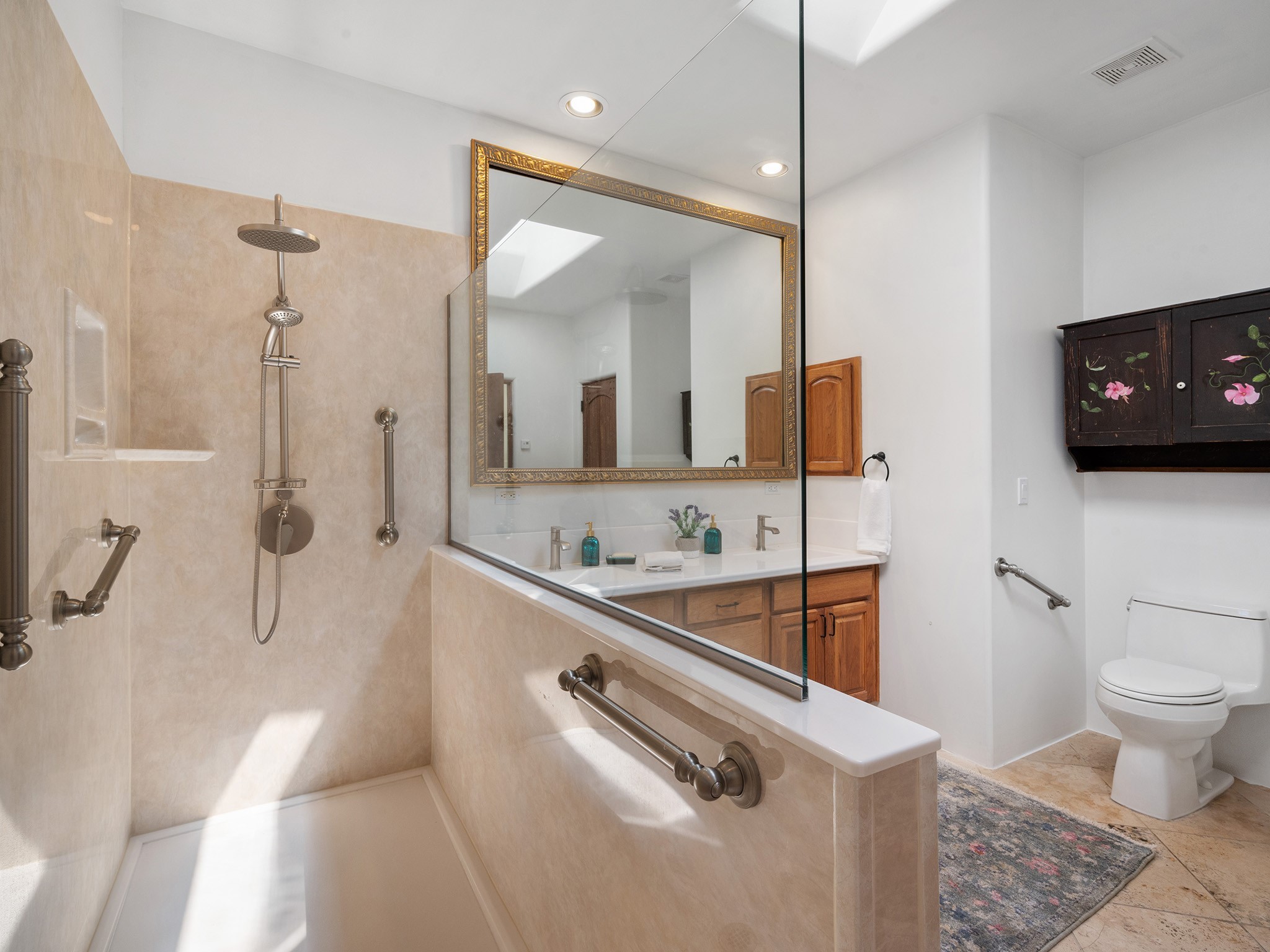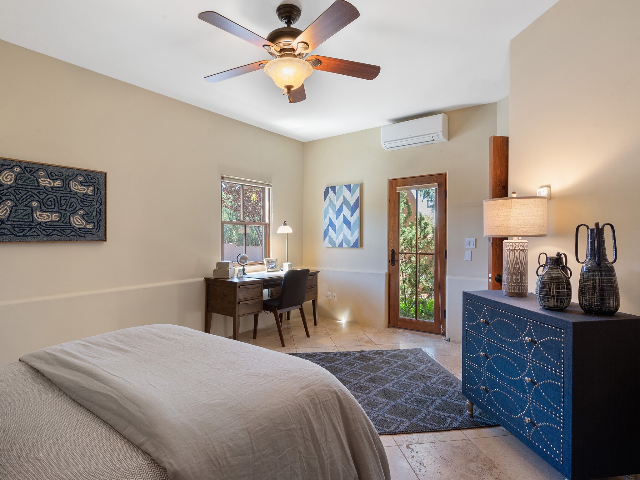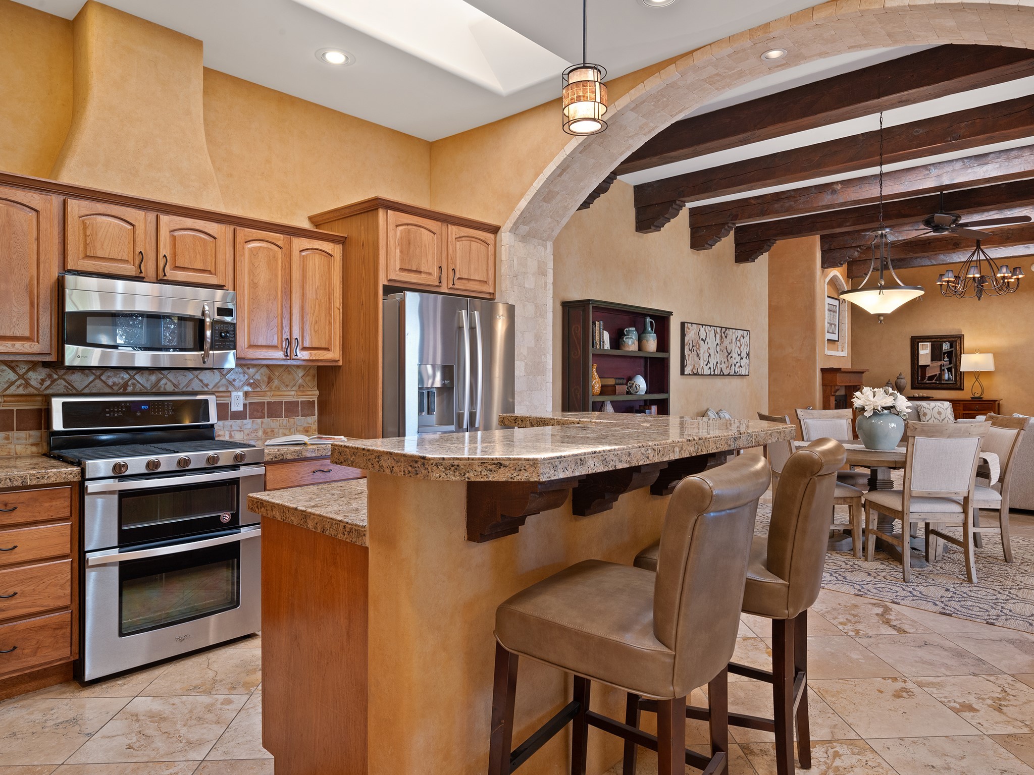 Enter through the front door into this Old Mexico inspired courtyard home. Here you will find 2371 sf, 3 bedroom and 3/1/2 Baths. This romantic home features and open floor plan with 12 foot beamed ceilings, travertine floors a gas fireplace in the living room,lovely golden plaster walls and cantera stone accents found in the corbels and on the fireplace hearth. Off of the dining room there are french doors that lead to a lovely courtyard that lives like a outdoor living room where you can relax and entertain under the covered portal. You will also enjoy the calming sound of the bubbling fountain from stone forest. The kitchen has granite tile counters a gas range and tile backsplash. There are plenty of warm honey color cabinets and a bar that looks out into the courtyard. This is a great area to do work at home and take advantage of the high speed internet Aldea offers. There are two bedroom at the front of the house are spacious. One leads to the courtyard and the other has a separate entrance so you can use it as an office. The Primary bedroom is in the opposite side of the house and also has french doors that also lead to the courtyard. The primary bathroom has been upgraded with a walk in shower and a solid surface countertop. The laundry room is also conveniently located and includes cabinets, shelving and a nice sized sink.The 2 car garage is located off of the ally way with direct entry into the house. The house was stuccoed by Tesuque Stucco in April of 2014 and has some time left on the 10 year warranty. Here there is also another courtyard where you can view the sunset over the mountains. This gorgeous home finishes add to the ambiance of a special place set apart.