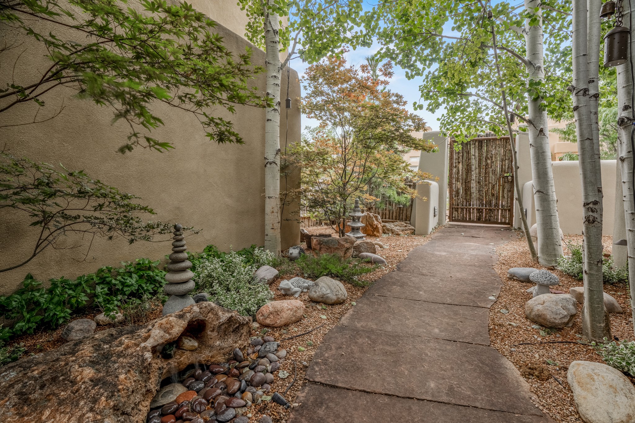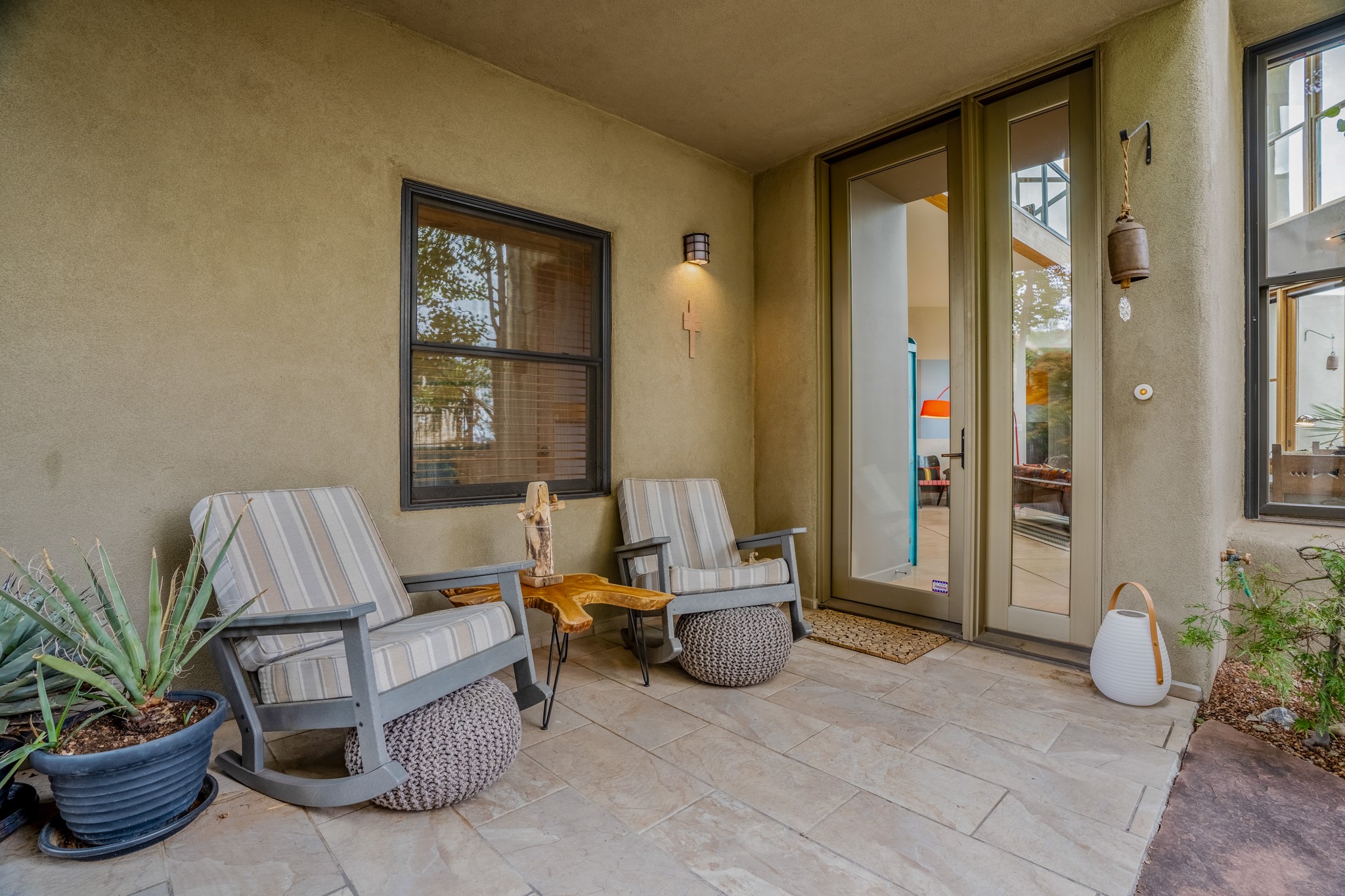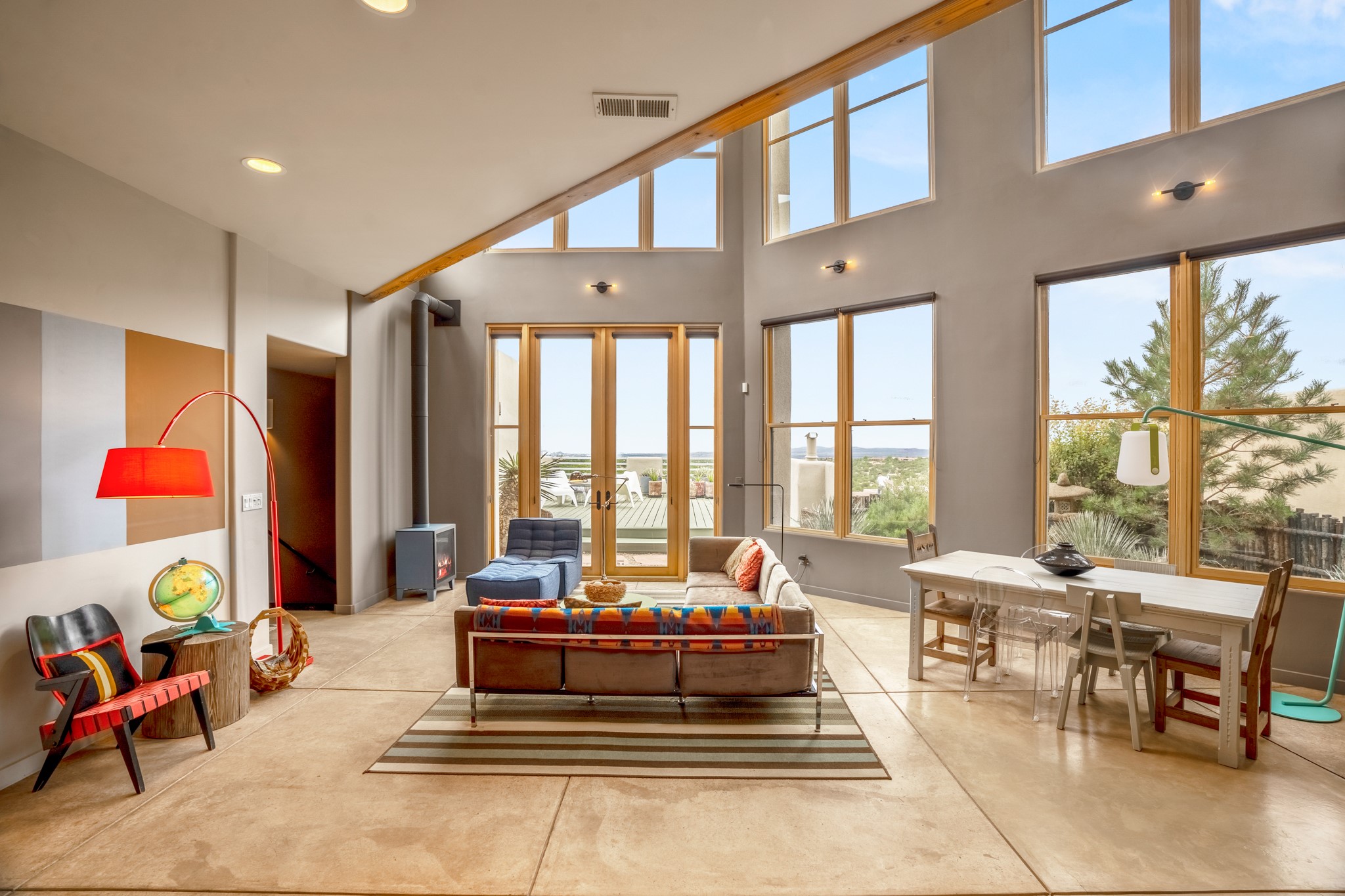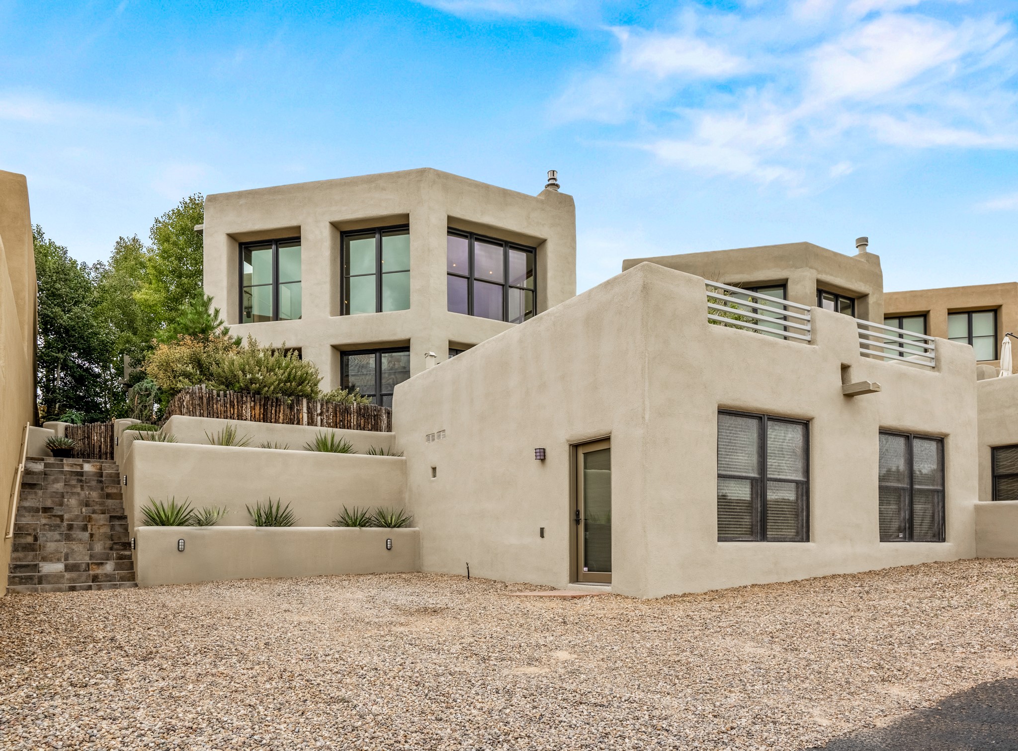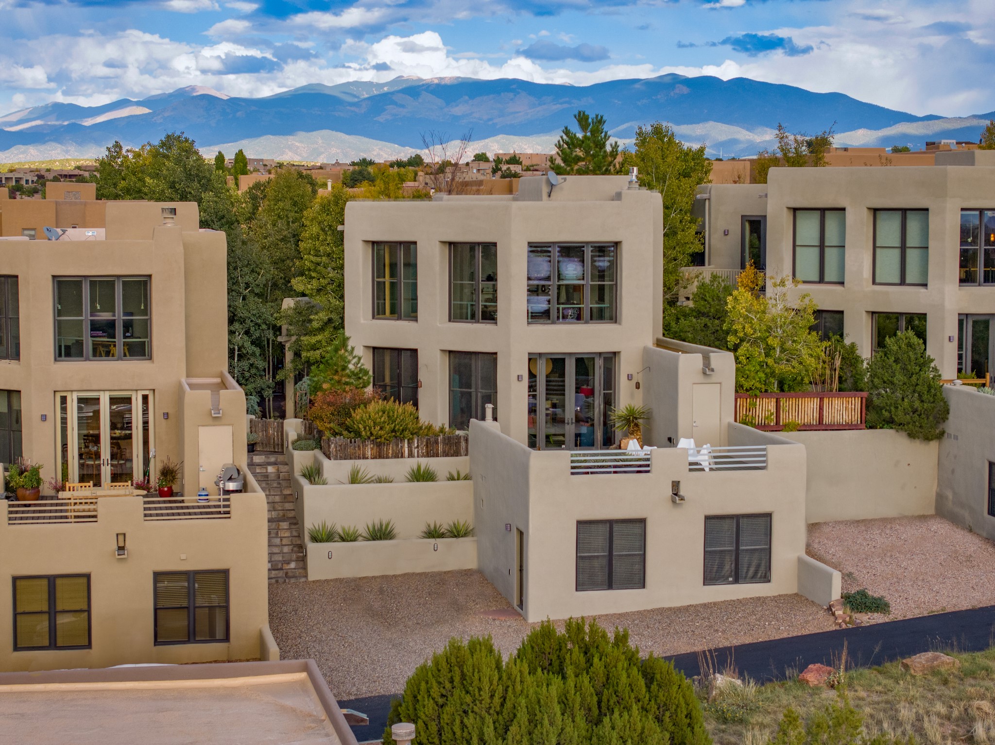 Looking for a earthy yet contemporary home? This is it. 2772 square foot home in Aldea has 3 bedrooms, 3.5 baths and a large deck with expansive and unobstructed desert and mountain views. It features radiant heat, forced air heat, and air conditioning. Navion on-demand water heater - installed in 2022. Domestic water pipes were replaced with top of the line WIRSBO piping. There is a rubber membrane over a torch down roof with a maintenance agreement currently in place.Enter the front gate into an enchanting Zen garden courtyard shaded by a dozen 20-foot-tall aspen trees. All on a drip irrigation system with strategically placed state-of-the-art landscape lighting.The great room has a soaring 20-foot ceiling and wall of windows facing over the desert landscape, a contemporary Scandinavian gas stove, and automated solar blinds.Watch spectacular sunsets from the 500-square-foot deck with a 180-degree view of the Jemez in the distance.The modern open-style kitchen has a large island, limestone countertops, and stainless appliances including a Wolf range.Two high-ceilinged primary suites have stone-tiled bathrooms with soaking tubs, double sinks with German designed fixtures, and walk-in closets. The primary bedroom suite is on the main floor for easy access to the common living areas. The upstairs guest suite features a balcony and den with spectacular views of the desert and mountains.A large room on the lower level has a full ensuite bath and its own entrance and can be used as an office, studio, or a third bedroom. The door from this room leads to 2 private parking spaces. This is a super cool property with industrial-chic concrete, eco-friendly bamboo, and stone tile flooring.The bathroom finishes are high-end contemporary cabinets with tile surrounds up to the ceilings.Aldea is a friendly New Urbanist community with 13 miles of walking trails, a community center, a coffee shop, on-site HOA Management, tennis, basketball, and Bocce Ball courts and nice parks scattered throughout the community.
