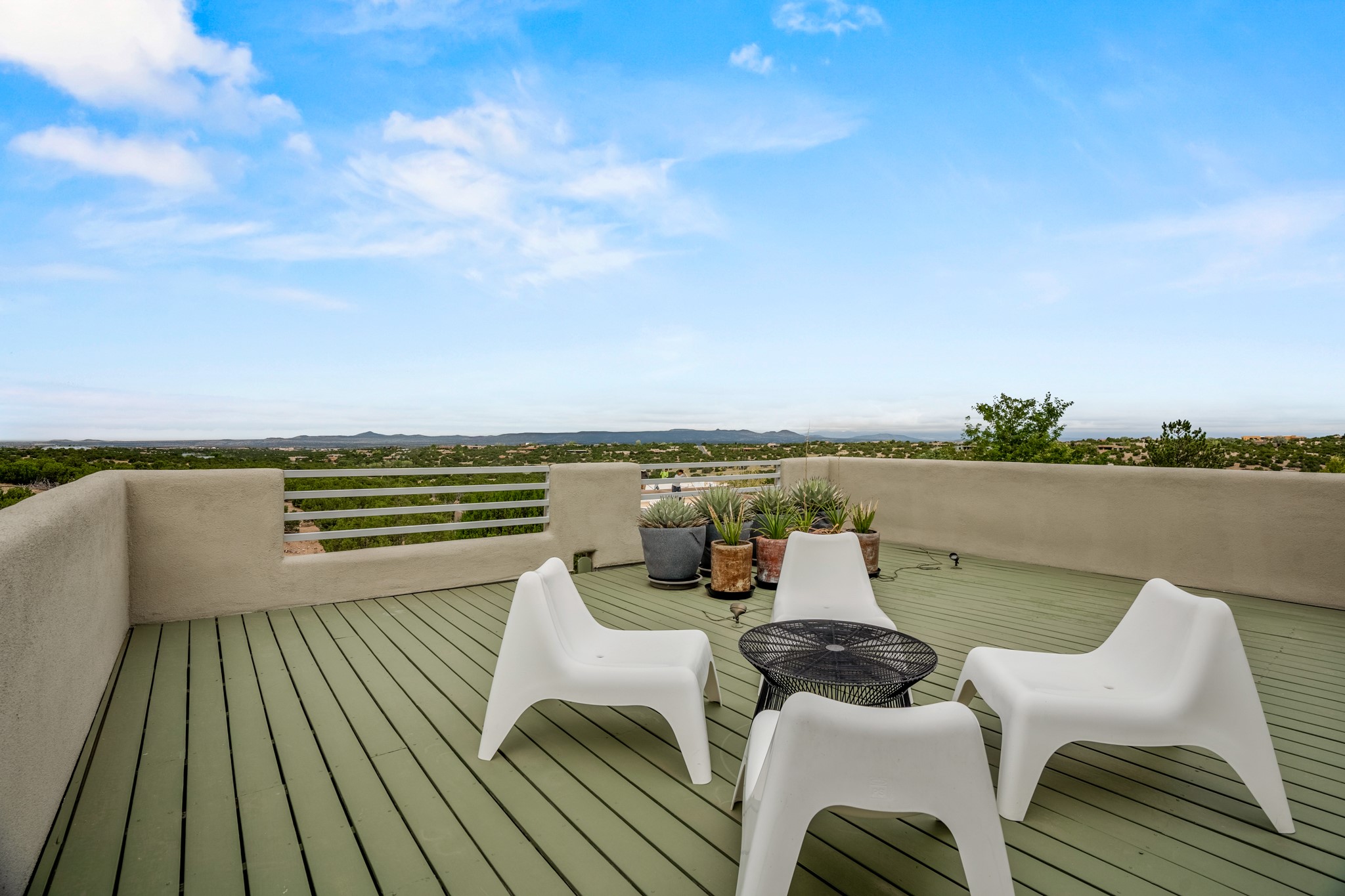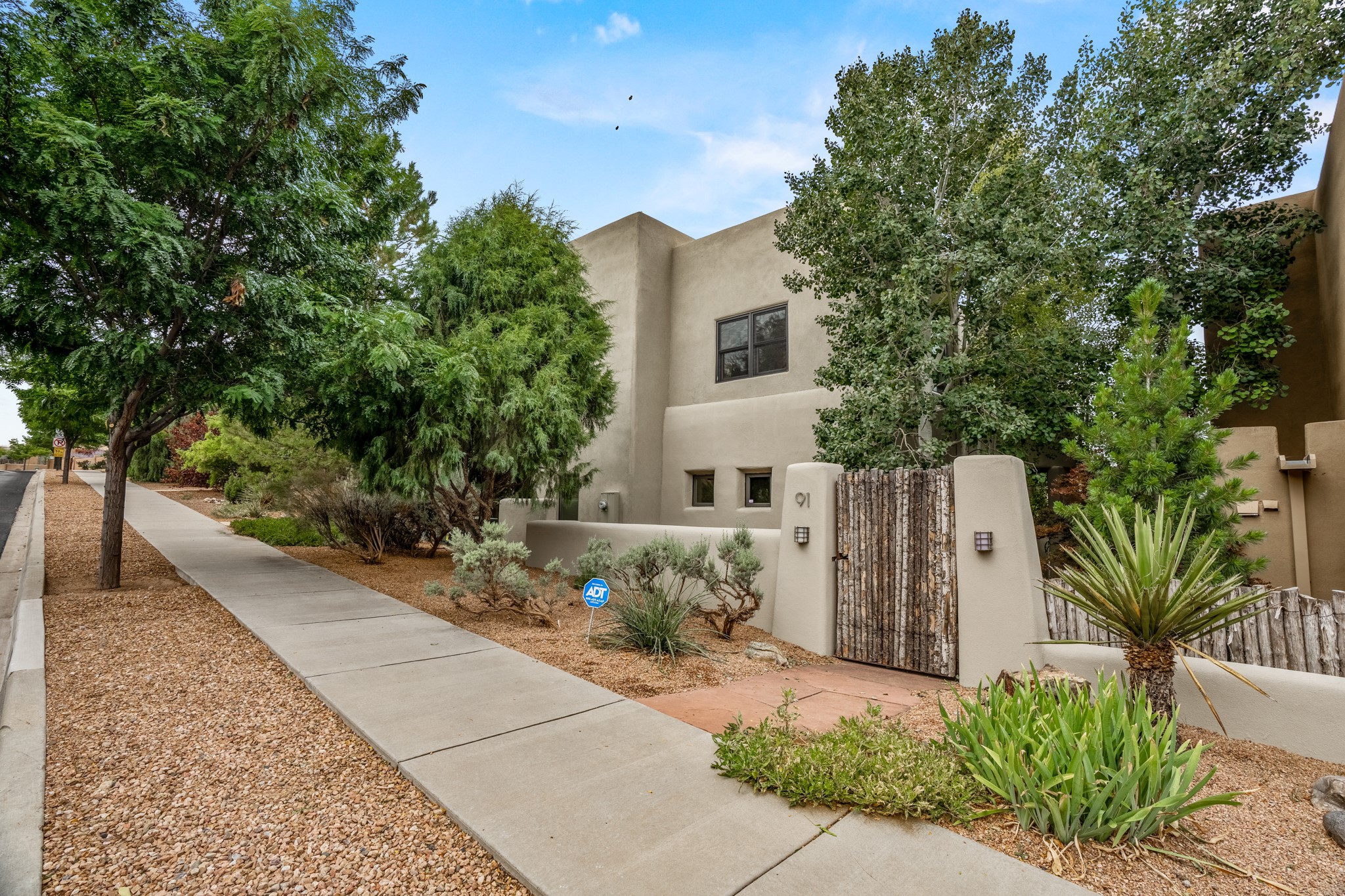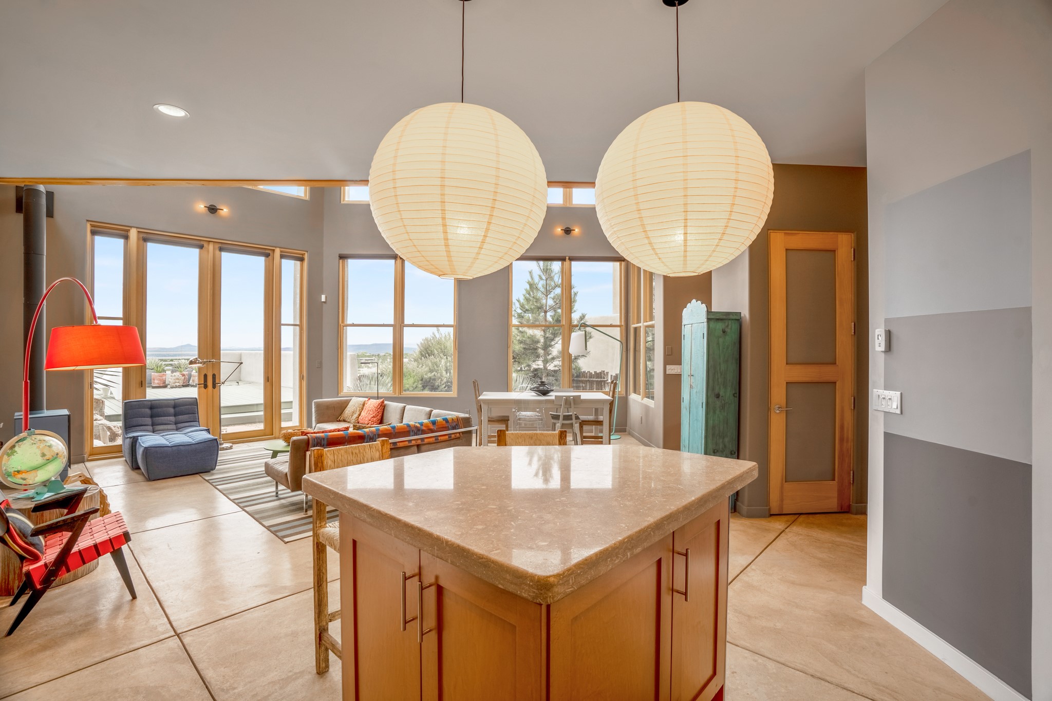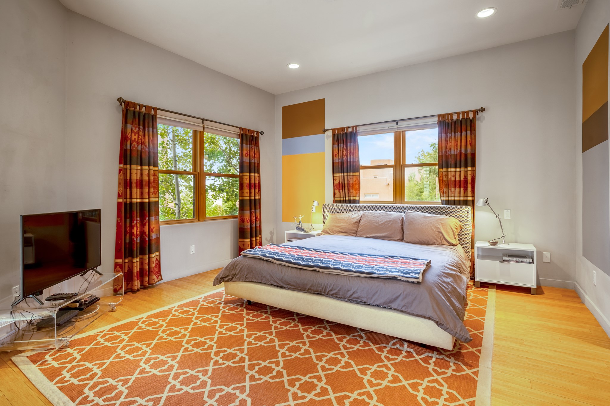 Looking for a earthy yet contemporary home? This is it. 2772 square foot home in Aldea has 3 bedrooms, 3.5 baths and a large deck with expansive and unobstructed desert and mountain views. It features radiant heat, forced air heat, and air conditioning. Navion on-demand water heater - installed in 2022. Domestic water pipes were replaced with top of the line WIRSBO piping. There is a rubber membrane over a torch down roof with a maintenance agreement currently in place.Enter the front gate into an enchanting Zen garden courtyard shaded by a dozen 20-foot-tall aspen trees. All on a drip irrigation system with strategically placed state-of-the-art landscape lighting.The great room has a soaring 20-foot ceiling and wall of windows facing over the desert landscape, a contemporary Scandinavian gas stove, and automated solar blinds.Watch spectacular sunsets from the 500-square-foot deck with a 180-degree view of the Jemez in the distance.The modern open-style kitchen has a large island, limestone countertops, and stainless appliances including a Wolf range.Two high-ceilinged primary suites have stone-tiled bathrooms with soaking tubs, double sinks with German designed fixtures, and walk-in closets. The primary bedroom suite is on the main floor for easy access to the common living areas. The upstairs guest suite features a balcony and den with spectacular views of the desert and mountains.A large room on the lower level has a full ensuite bath and its own entrance and can be used as an office, studio, or a third bedroom. The door from this room leads to 2 private parking spaces. This is a super cool property with industrial-chic concrete, eco-friendly bamboo, and stone tile flooring.The bathroom finishes are high-end contemporary cabinets with tile surrounds up to the ceilings.Aldea is a friendly New Urbanist community with 13 miles of walking trails, a community center, a coffee shop, on-site HOA Management, tennis, basketball, and Bocce Ball courts and nice parks scattered throughout the community.