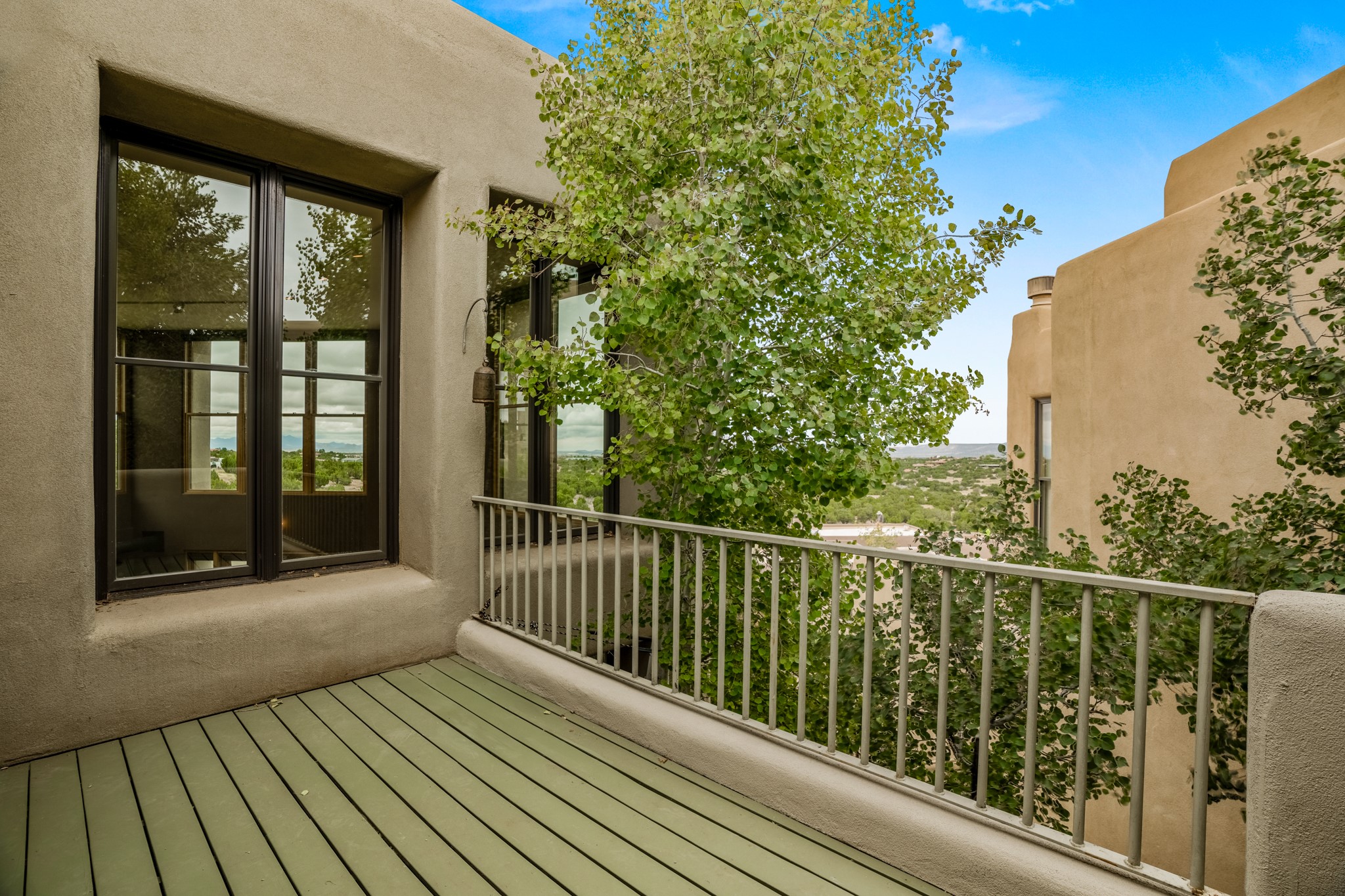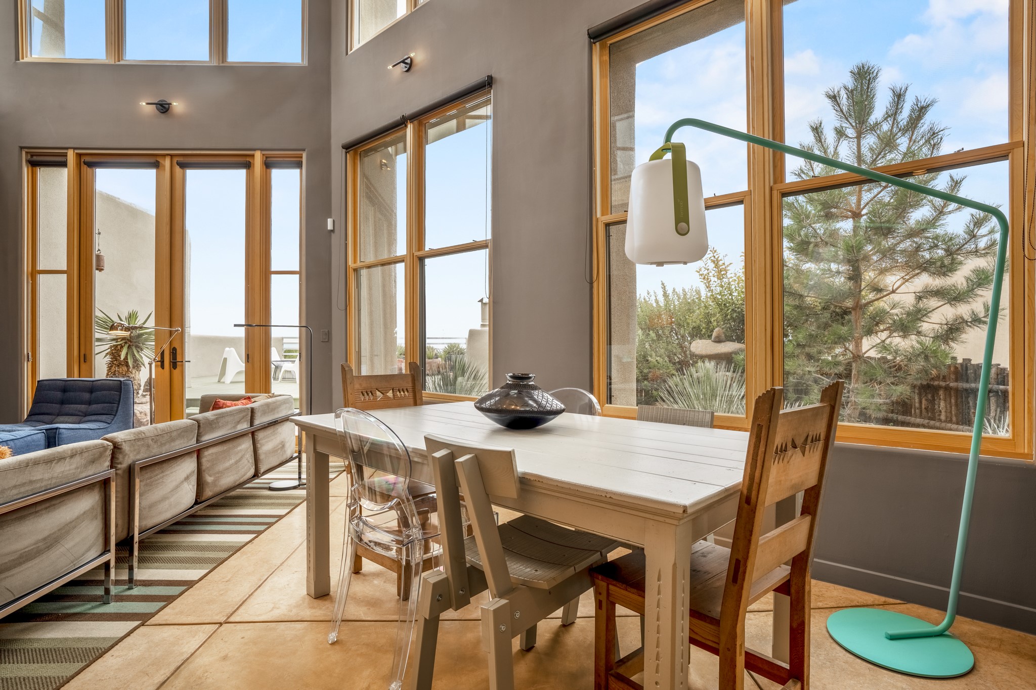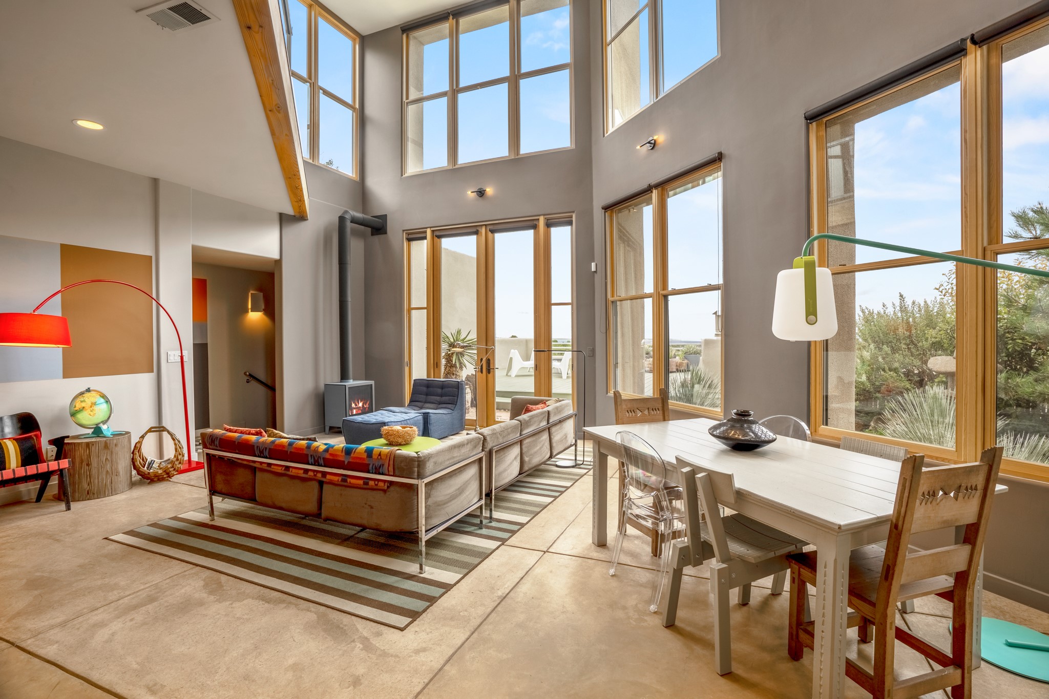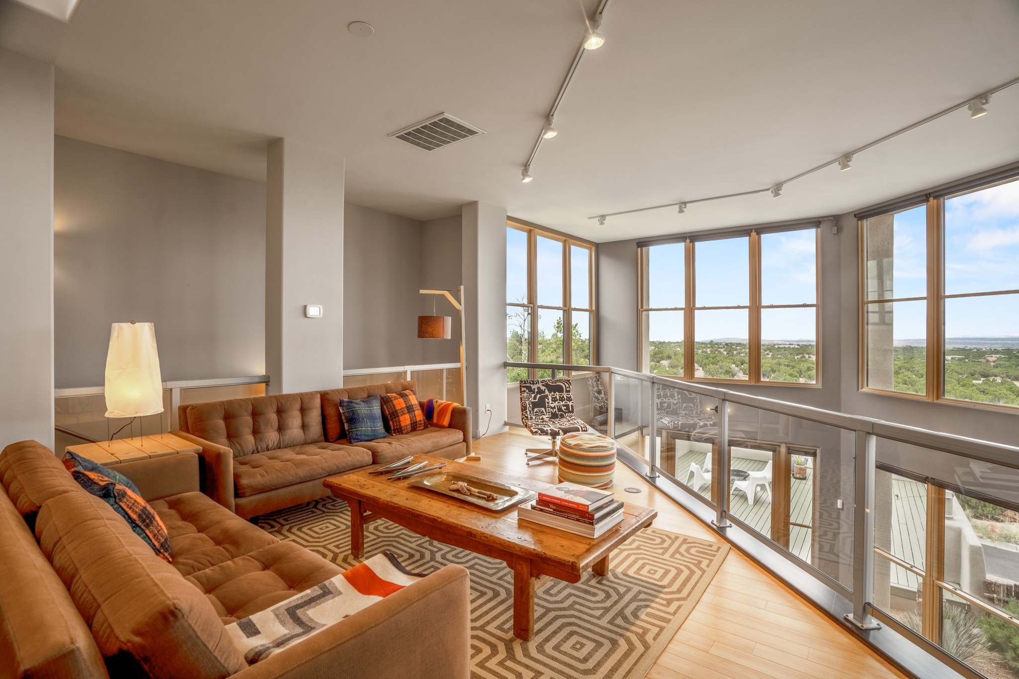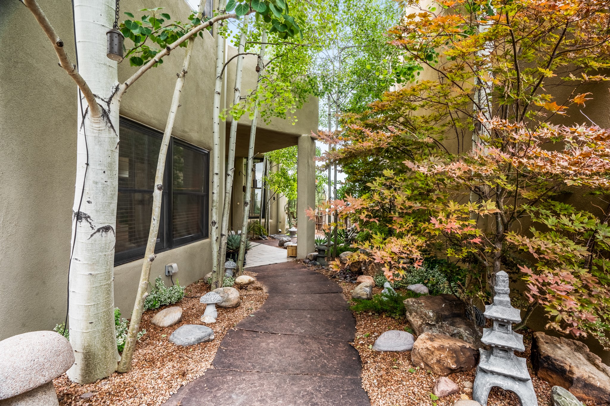 Looking for a earthy yet contemporary home? This is it. 2772 square foot home in Aldea has 3 bedrooms, 3.5 baths and a large deck with expansive and unobstructed desert and mountain views. It features radiant heat, forced air heat, and air conditioning. Navion on-demand water heater - installed in 2022. Domestic water pipes were replaced with top of the line WIRSBO piping. There is a rubber membrane over a torch down roof with a maintenance agreement currently in place.Enter the front gate into an enchanting Zen garden courtyard shaded by a dozen 20-foot-tall aspen trees. All on a drip irrigation system with strategically placed state-of-the-art landscape lighting.The great room has a soaring 20-foot ceiling and wall of windows facing over the desert landscape, a contemporary Scandinavian gas stove, and automated solar blinds.Watch spectacular sunsets from the 500-square-foot deck with a 180-degree view of the Jemez in the distance.The modern open-style kitchen has a large island, limestone countertops, and stainless appliances including a Wolf range.Two high-ceilinged primary suites have stone-tiled bathrooms with soaking tubs, double sinks with German designed fixtures, and walk-in closets. The primary bedroom suite is on the main floor for easy access to the common living areas. The upstairs guest suite features a balcony and den with spectacular views of the desert and mountains.A large room on the lower level has a full ensuite bath and its own entrance and can be used as an office, studio, or a third bedroom. The door from this room leads to 2 private parking spaces. This is a super cool property with industrial-chic concrete, eco-friendly bamboo, and stone tile flooring.The bathroom finishes are high-end contemporary cabinets with tile surrounds up to the ceilings.Aldea is a friendly New Urbanist community with 13 miles of walking trails, a community center, a coffee shop, on-site HOA Management, tennis, basketball, and Bocce Ball courts and nice parks scattered throughout the community.