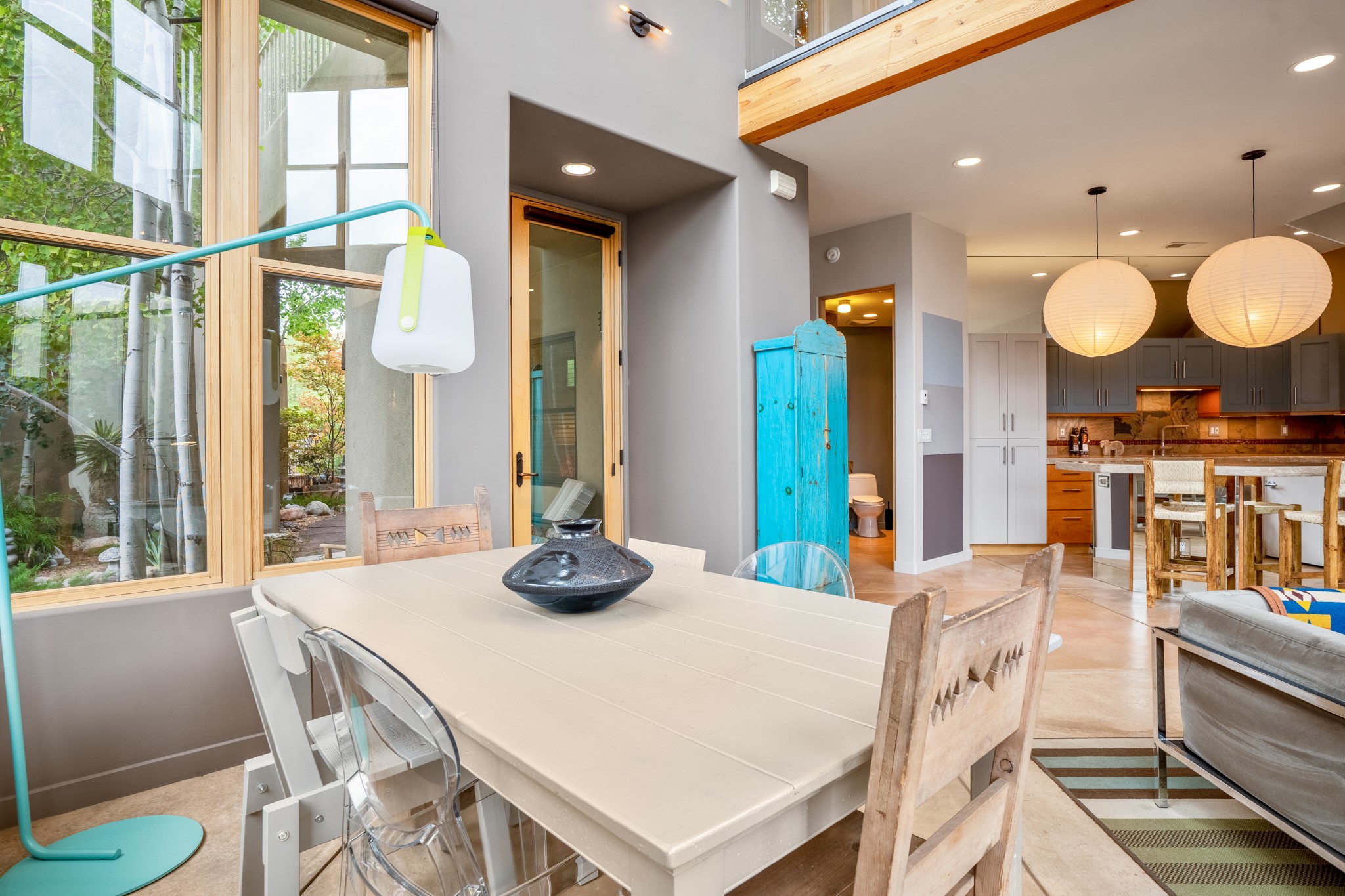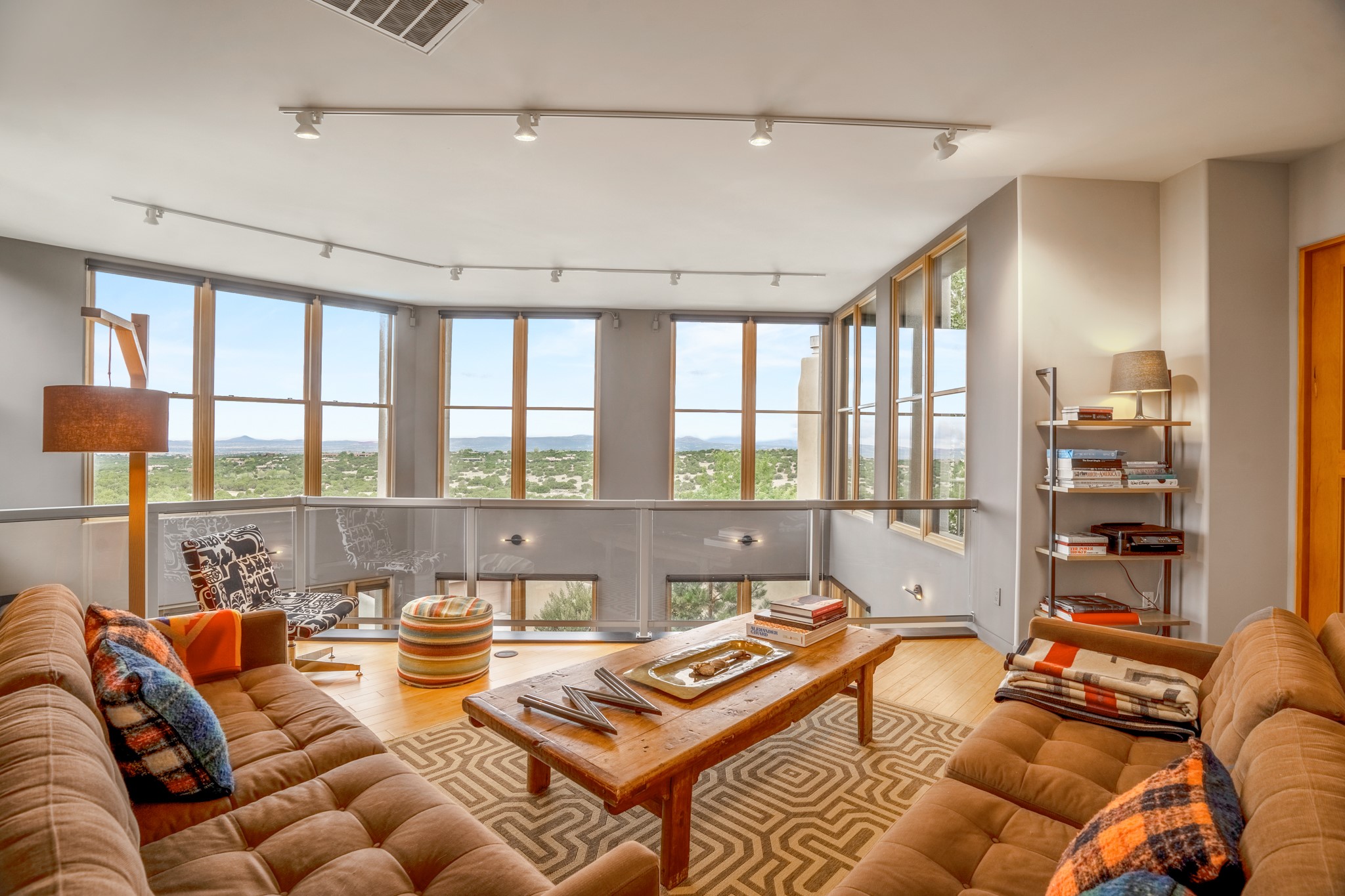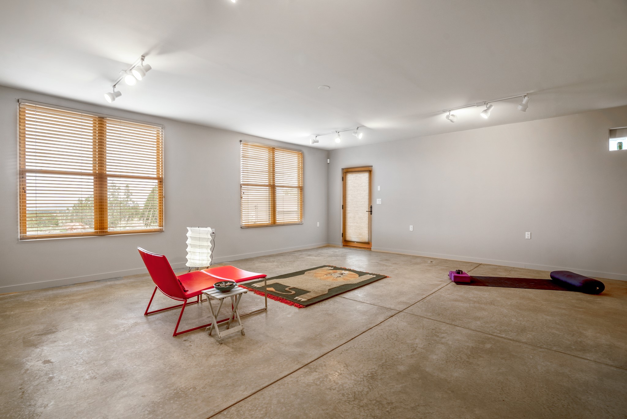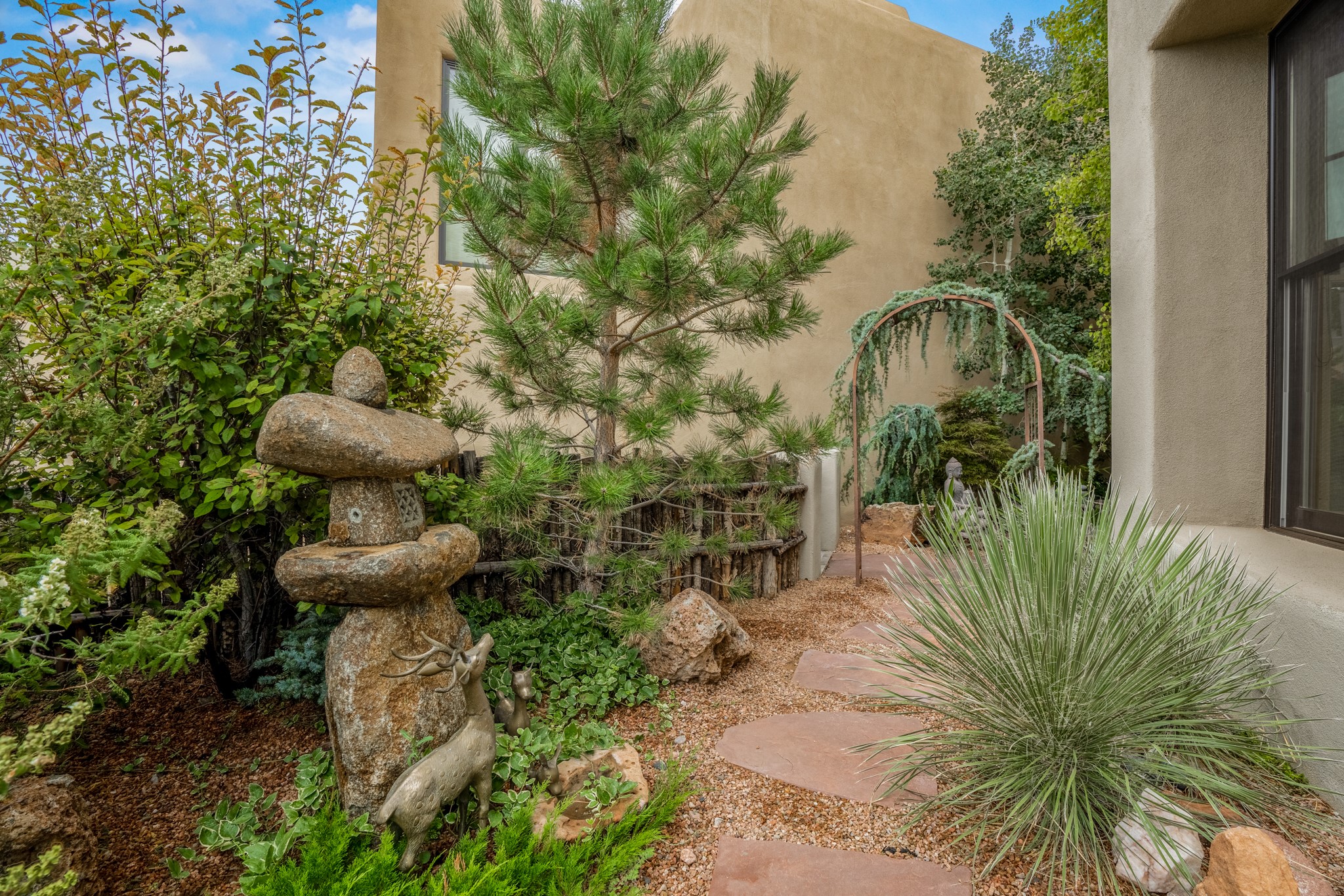 Looking for a earthy yet contemporary home? This is it. 2772 square foot home in Aldea has 3 bedrooms, 3.5 baths and a large deck with expansive and unobstructed desert and mountain views. It features radiant heat, forced air heat, and air conditioning. Navion on-demand water heater - installed in 2022. Domestic water pipes were replaced with top of the line WIRSBO piping. There is a rubber membrane over a torch down roof with a maintenance agreement currently in place.Enter the front gate into an enchanting Zen garden courtyard shaded by a dozen 20-foot-tall aspen trees. All on a drip irrigation system with strategically placed state-of-the-art landscape lighting.The great room has a soaring 20-foot ceiling and wall of windows facing over the desert landscape, a contemporary Scandinavian gas stove, and automated solar blinds.Watch spectacular sunsets from the 500-square-foot deck with a 180-degree view of the Jemez in the distance.The modern open-style kitchen has a large island, limestone countertops, and stainless appliances including a Wolf range.Two high-ceilinged primary suites have stone-tiled bathrooms with soaking tubs, double sinks with German designed fixtures, and walk-in closets. The primary bedroom suite is on the main floor for easy access to the common living areas. The upstairs guest suite features a balcony and den with spectacular views of the desert and mountains.A large room on the lower level has a full ensuite bath and its own entrance and can be used as an office, studio, or a third bedroom. The door from this room leads to 2 private parking spaces. This is a super cool property with industrial-chic concrete, eco-friendly bamboo, and stone tile flooring.The bathroom finishes are high-end contemporary cabinets with tile surrounds up to the ceilings.Aldea is a friendly New Urbanist community with 13 miles of walking trails, a community center, a coffee shop, on-site HOA Management, tennis, basketball, and Bocce Ball courts and nice parks scattered throughout the community.