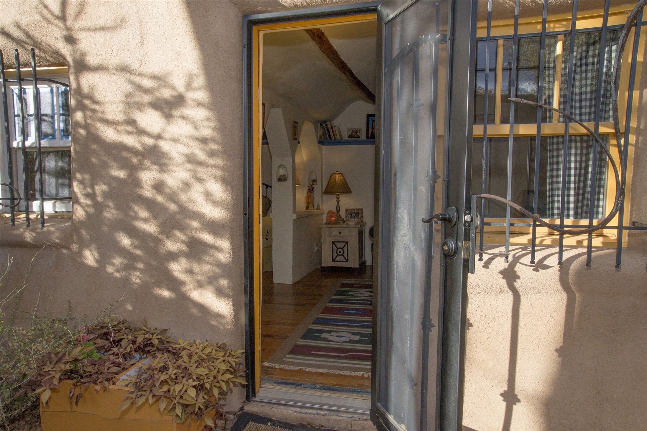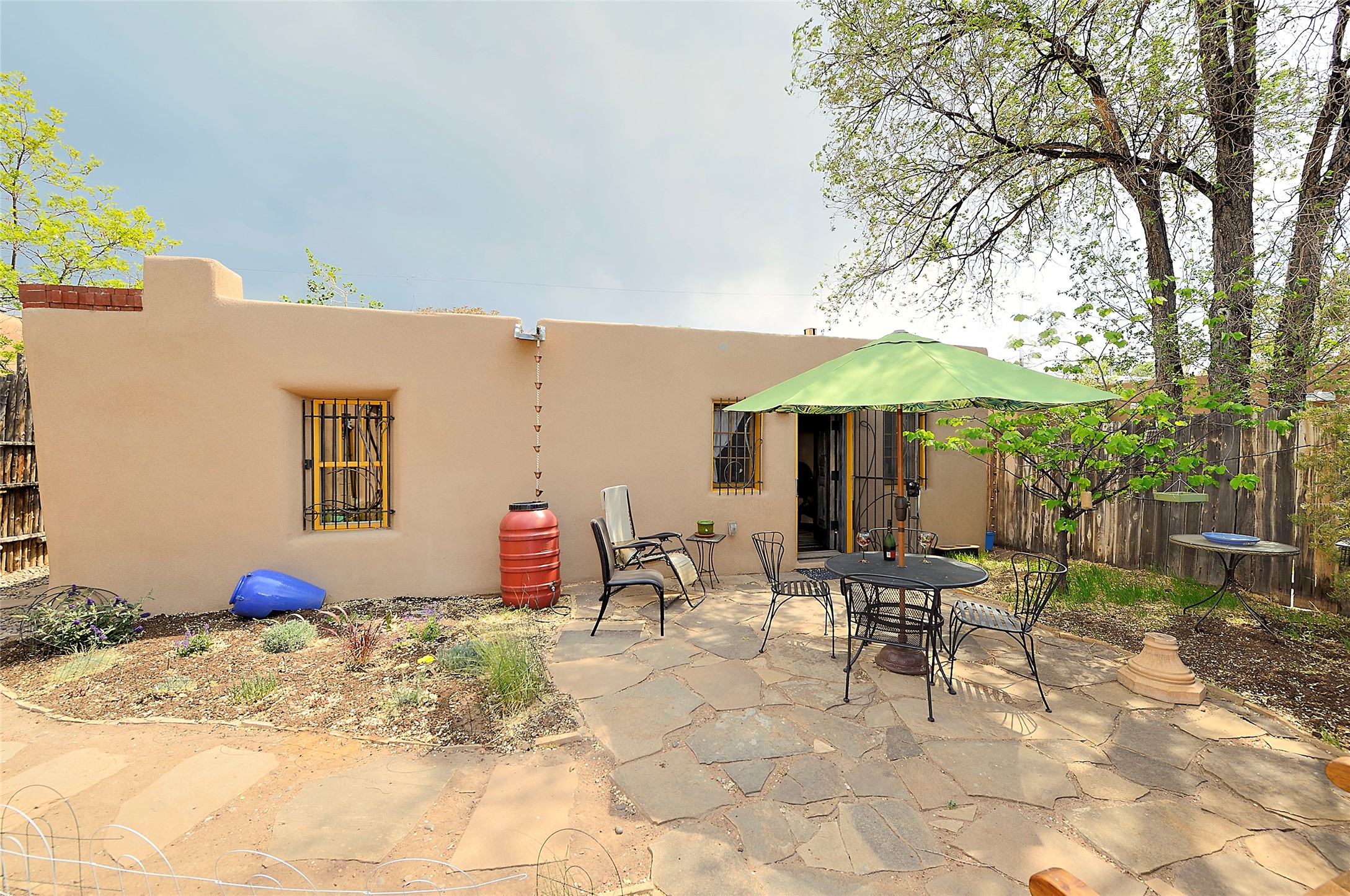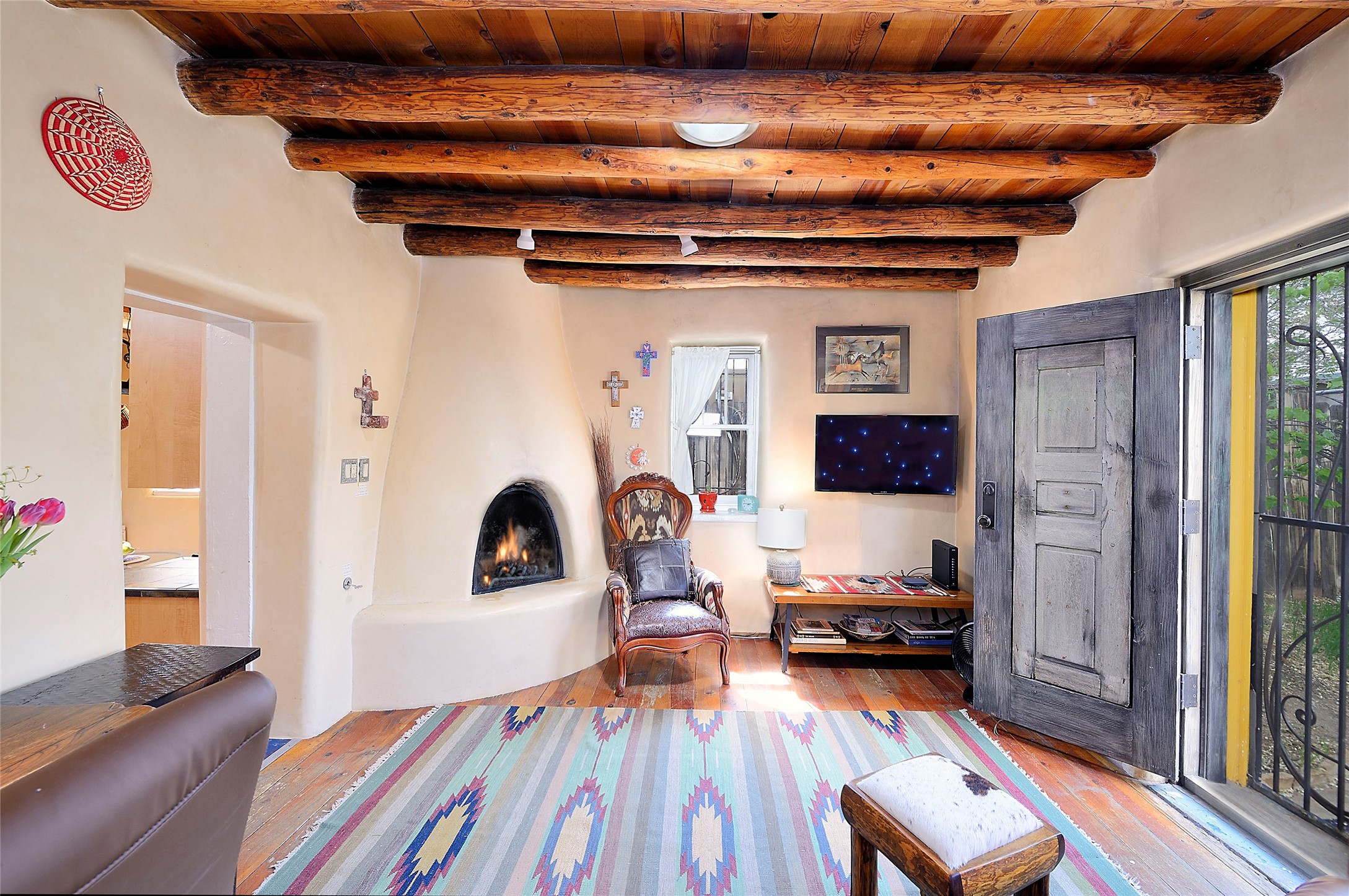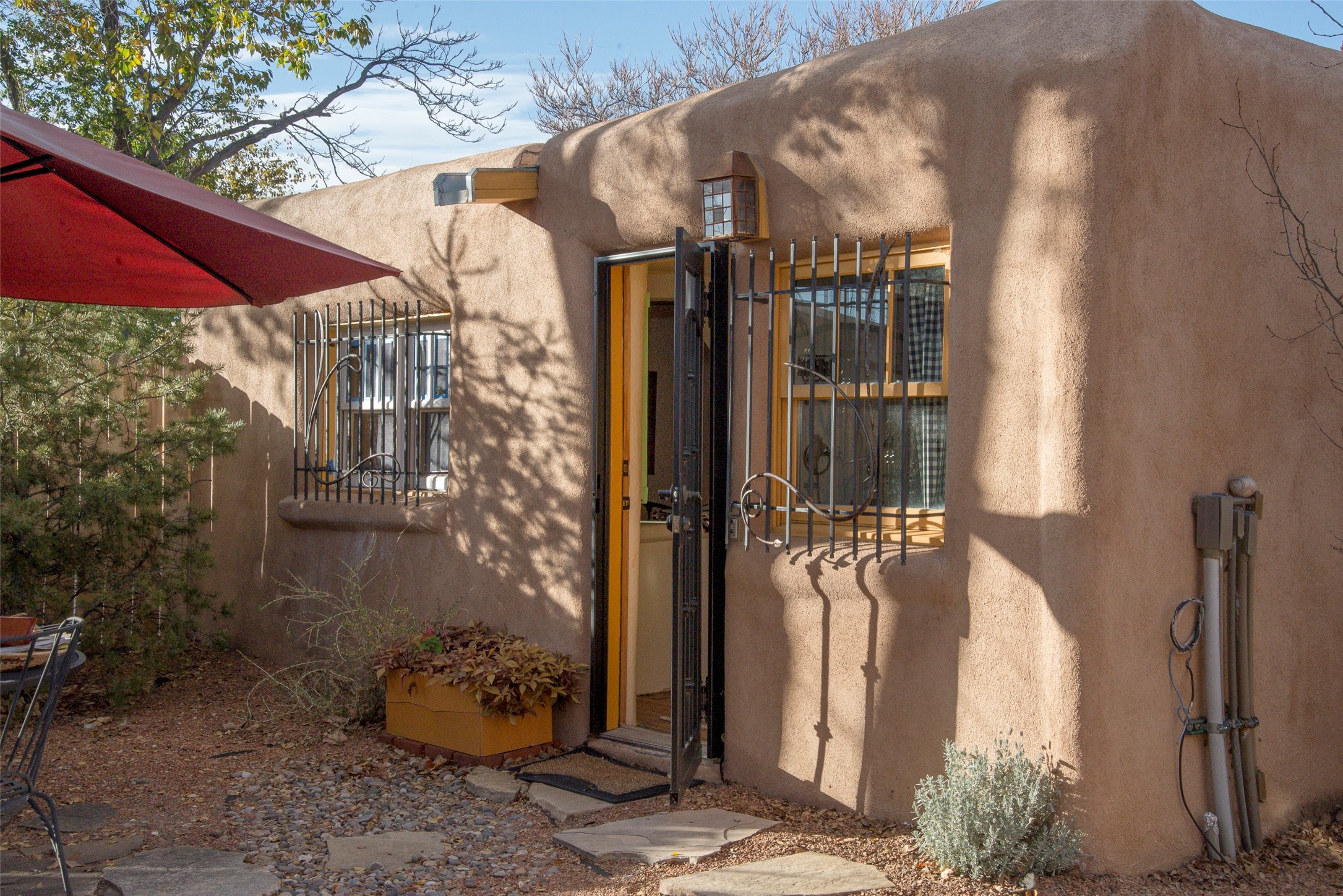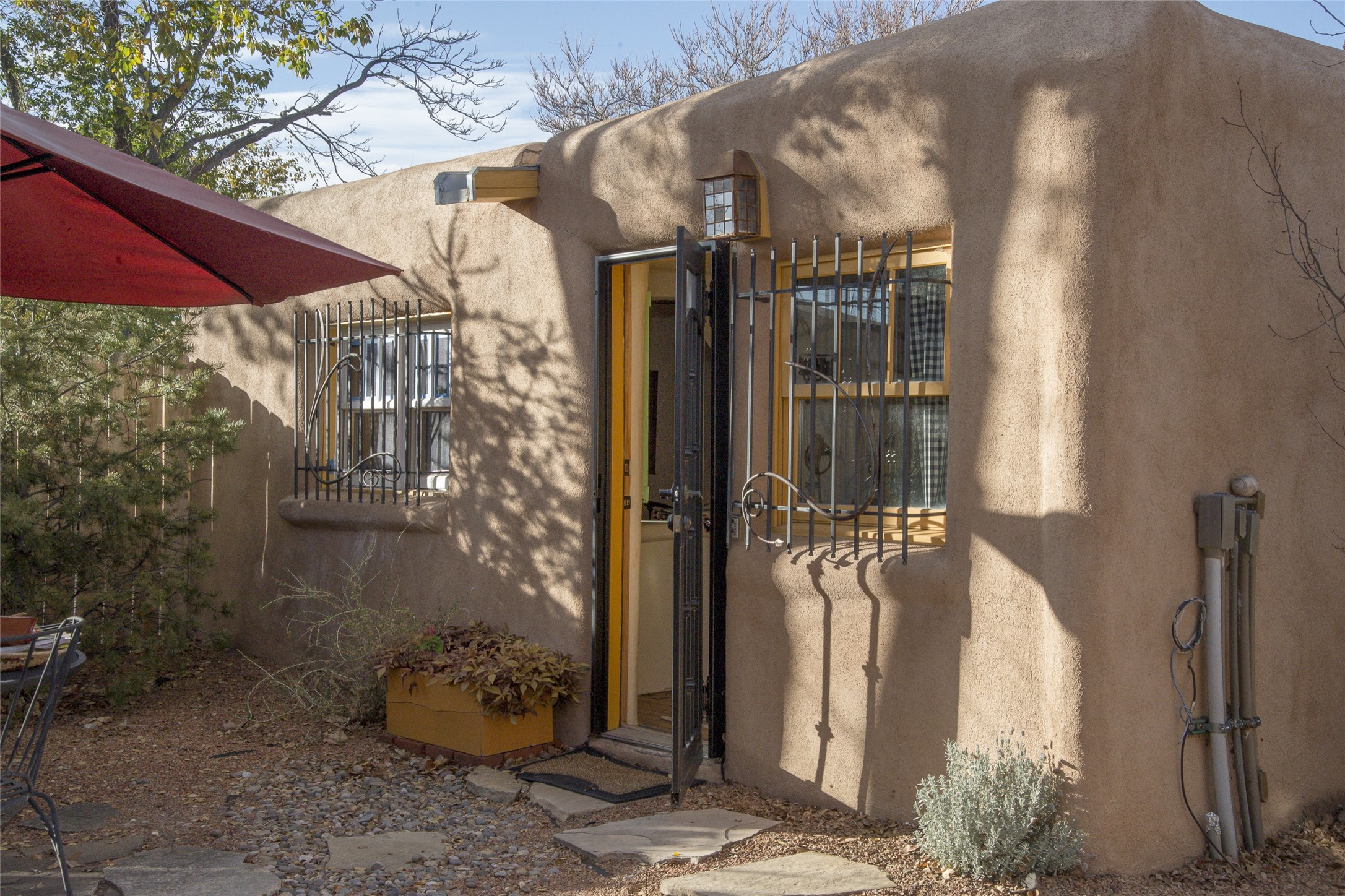 Experience the quintessential Santa Fe Style in this charming adobe home as you enter through a gated courtyard. Inside, the living room enchants with wood floors, a traditional kiva fireplace, and classic vigas. A generous bedroom continues the warmth with wood floors and vigas, paired with stylish nichos throughout the home. The bathroom is a bright oasis featuring tile flooring, a skylight, and a spacious walk-in shower. The large eat-in kitchen boasts saltillo tile, newer appliances, including a 6-burner professional series gas range, expansive cabinets, a large farmhouse sink, all under a viga-clad ceiling. Out back, find tranquility in the private courtyard where you'll be greeted by a cozy flagstone patio with mature trees. Additionally, the property boasts a charming studio/office, complete with wood floors and coved ceiling with vigas; and finally two storage sheds! Located less than a mile from the plaza, this home is the epitome of Santa Fe charm and convenience!