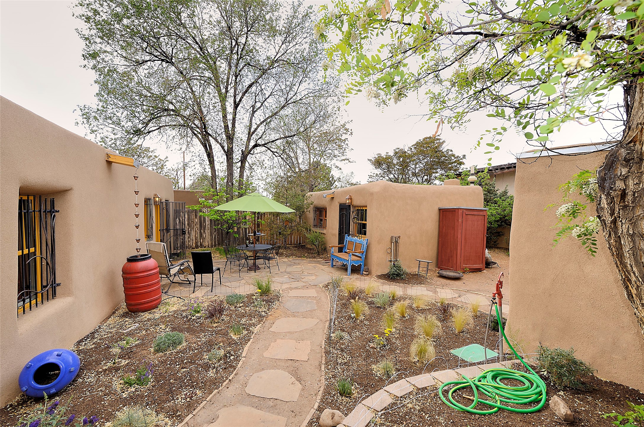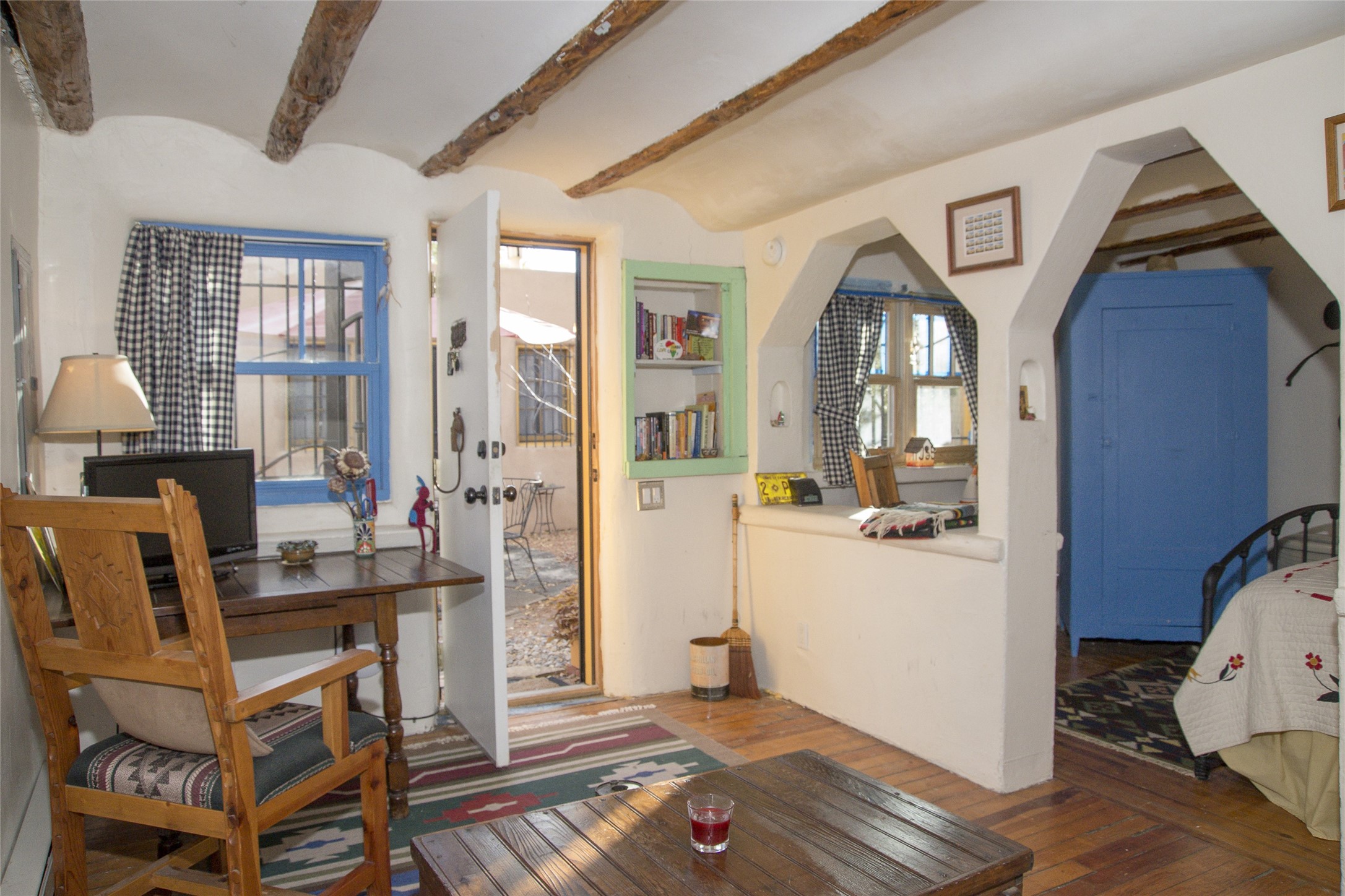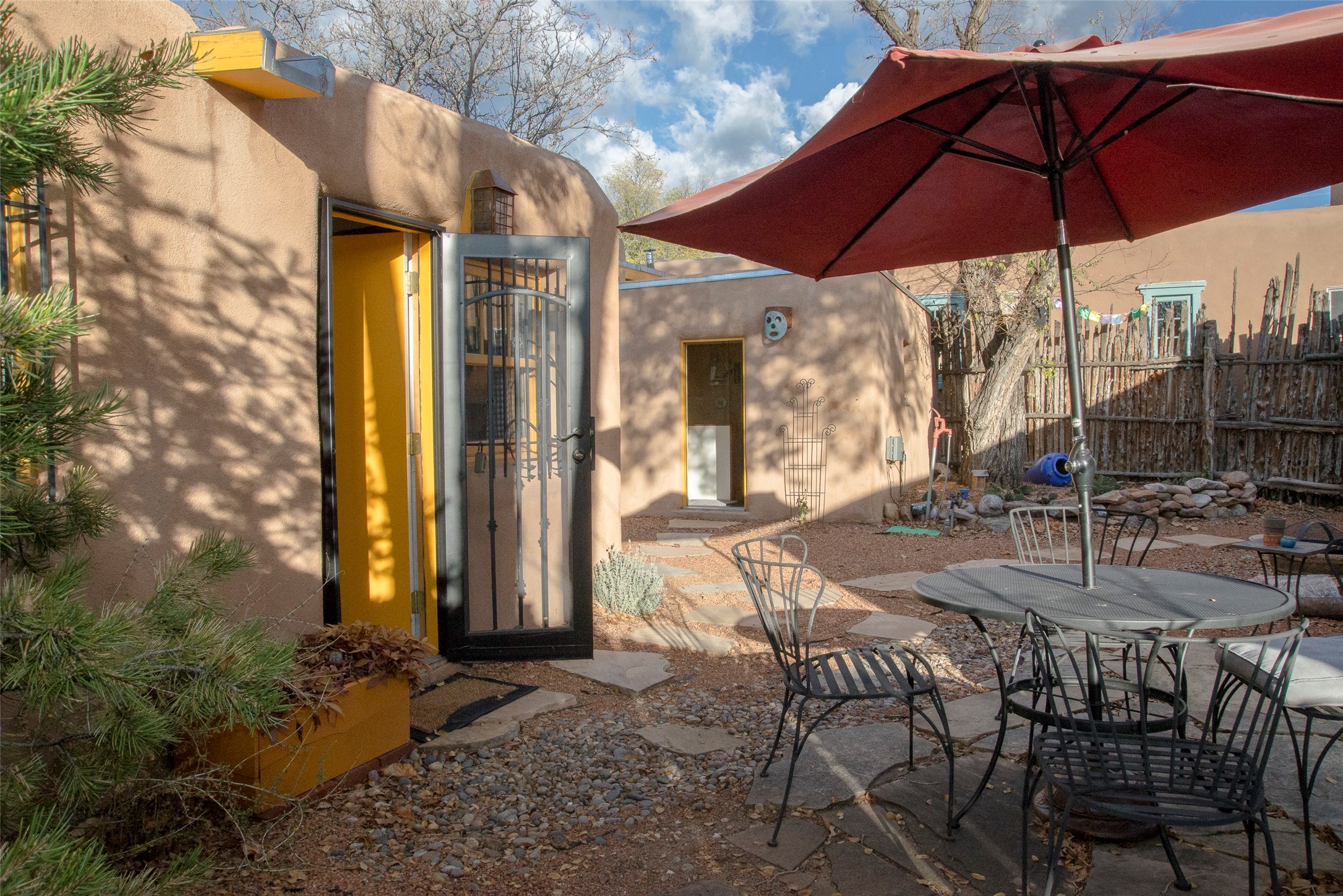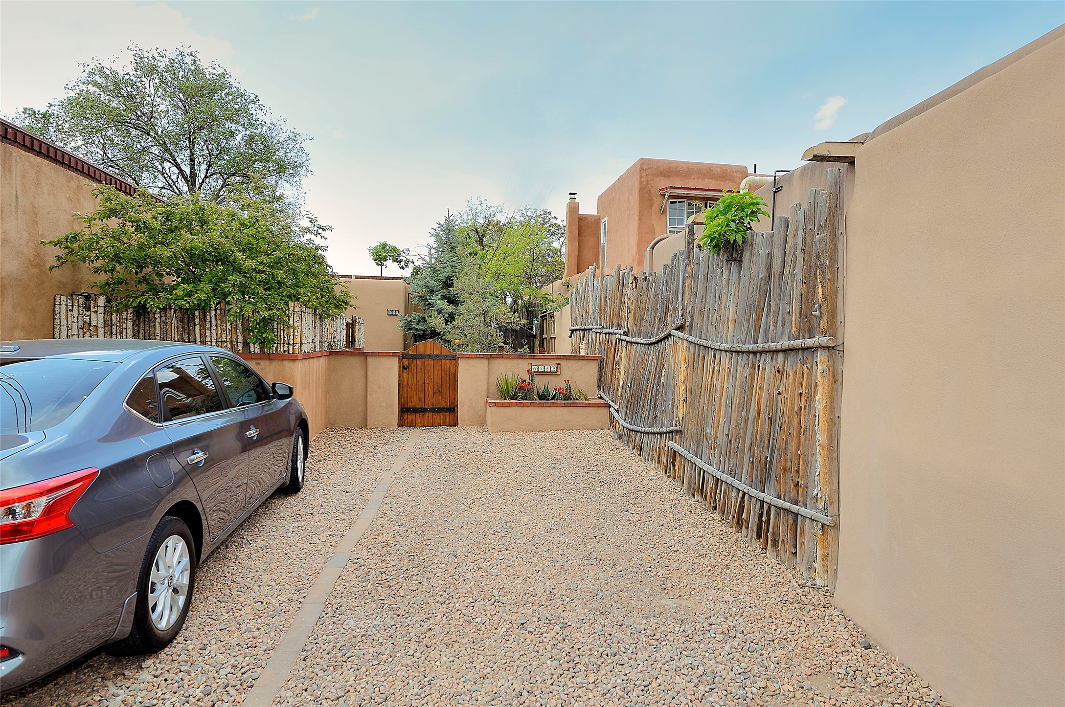 Experience the quintessential Santa Fe Style in this charming adobe home as you enter through a gated courtyard. Inside, the living room enchants with wood floors, a traditional kiva fireplace, and classic vigas. A generous bedroom continues the warmth with wood floors and vigas, paired with stylish nichos throughout the home. The bathroom is a bright oasis featuring tile flooring, a skylight, and a spacious walk-in shower. The large eat-in kitchen boasts saltillo tile, newer appliances, including a 6-burner professional series gas range, expansive cabinets, a large farmhouse sink, all under a viga-clad ceiling. Out back, find tranquility in the private courtyard where you'll be greeted by a cozy flagstone patio with mature trees. Additionally, the property boasts a charming studio/office, complete with wood floors and coved ceiling with vigas; and finally two storage sheds! Located less than a mile from the plaza, this home is the epitome of Santa Fe charm and convenience!