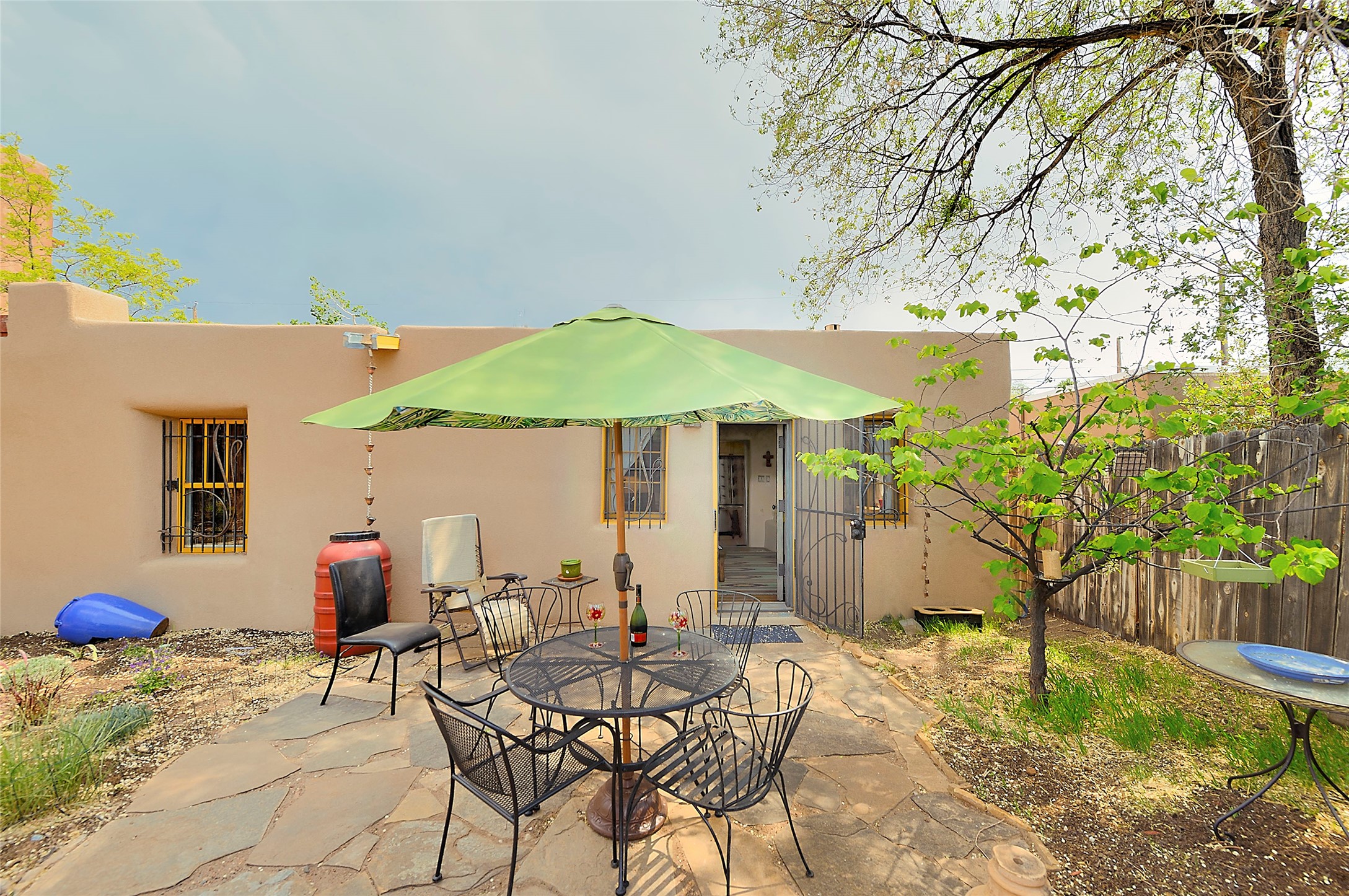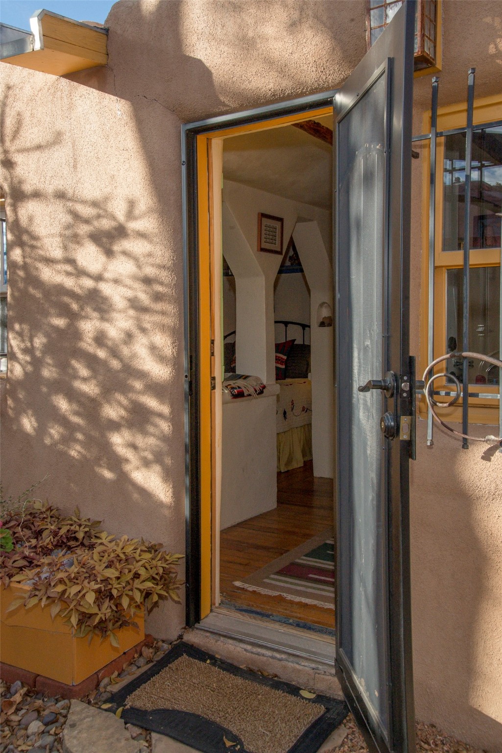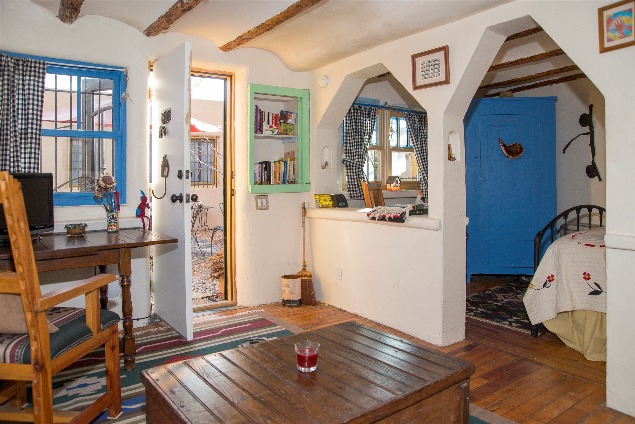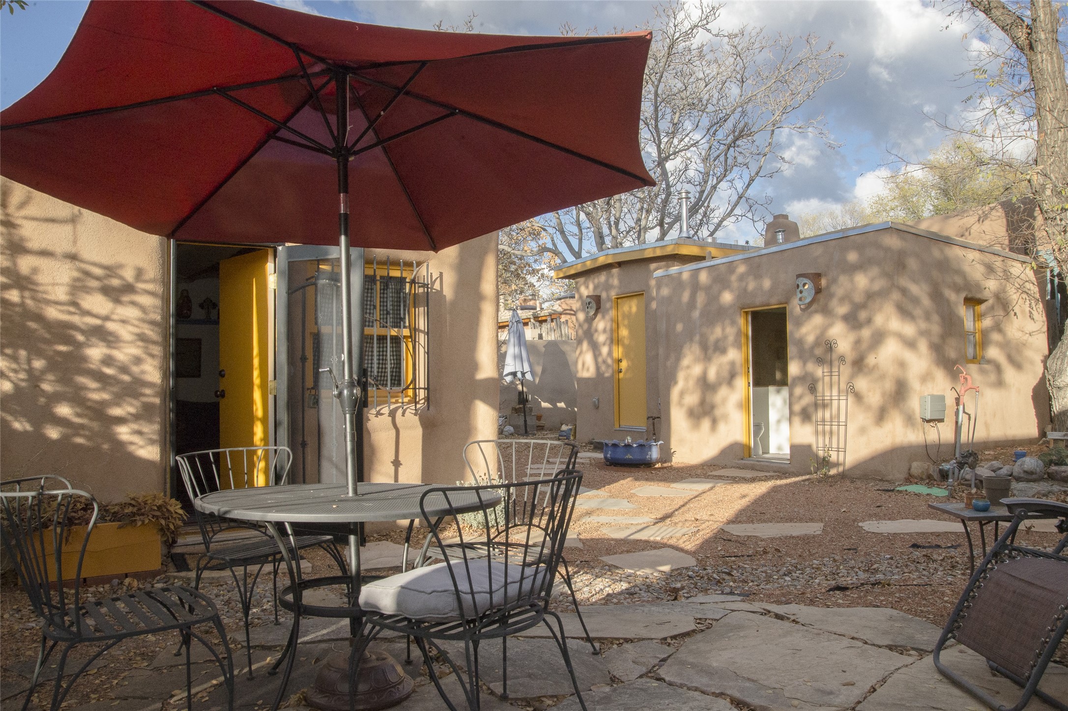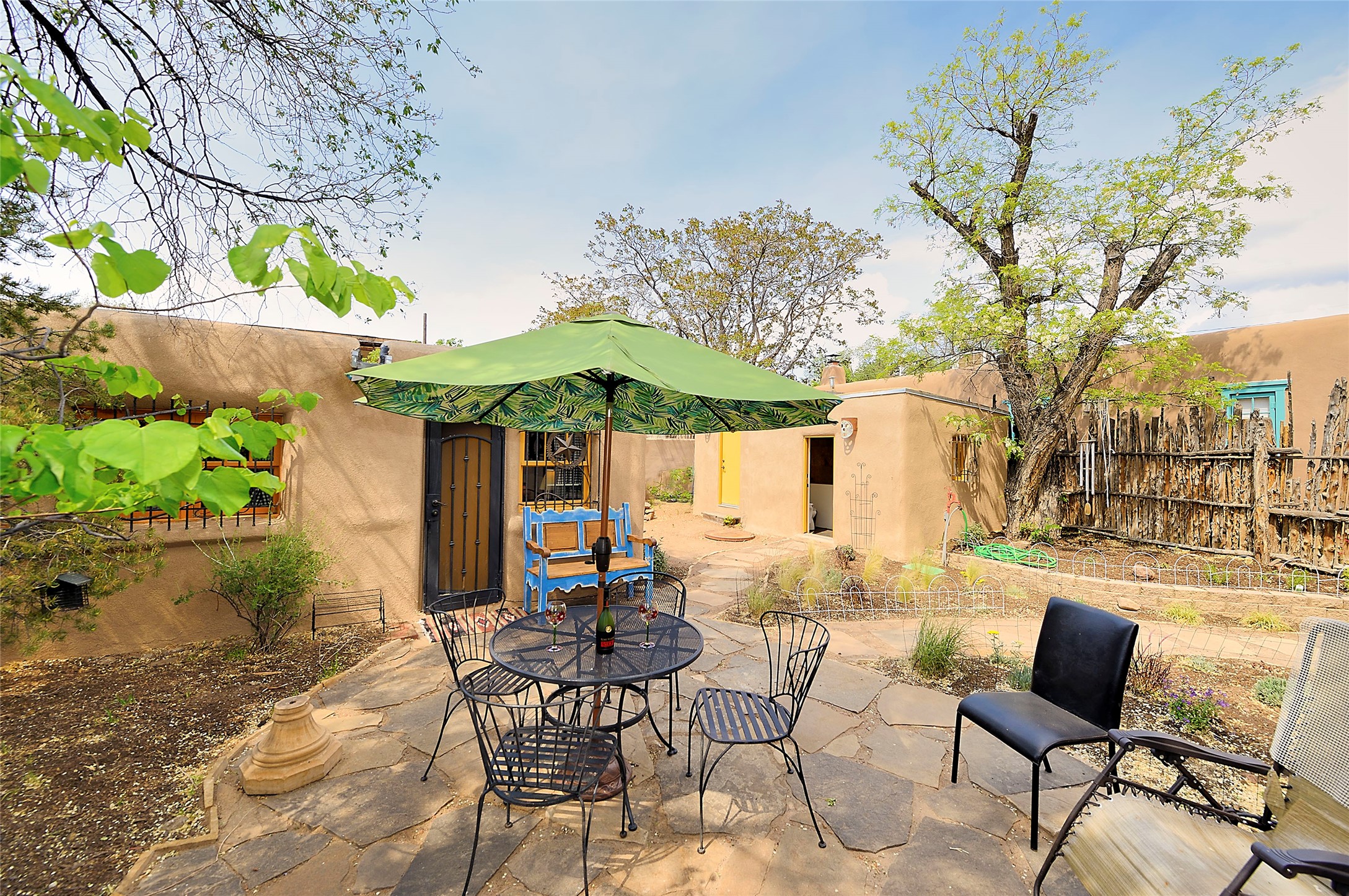 Experience the quintessential Santa Fe Style in this charming adobe home as you enter through a gated courtyard. Inside, the living room enchants with wood floors, a traditional kiva fireplace, and classic vigas. A generous bedroom continues the warmth with wood floors and vigas, paired with stylish nichos throughout the home. The bathroom is a bright oasis featuring tile flooring, a skylight, and a spacious walk-in shower. The large eat-in kitchen boasts saltillo tile, newer appliances, including a 6-burner professional series gas range, expansive cabinets, a large farmhouse sink, all under a viga-clad ceiling. Out back, find tranquility in the private courtyard where you'll be greeted by a cozy flagstone patio with mature trees. Additionally, the property boasts a charming studio/office, complete with wood floors and coved ceiling with vigas; and finally two storage sheds! Located less than a mile from the plaza, this home is the epitome of Santa Fe charm and convenience!