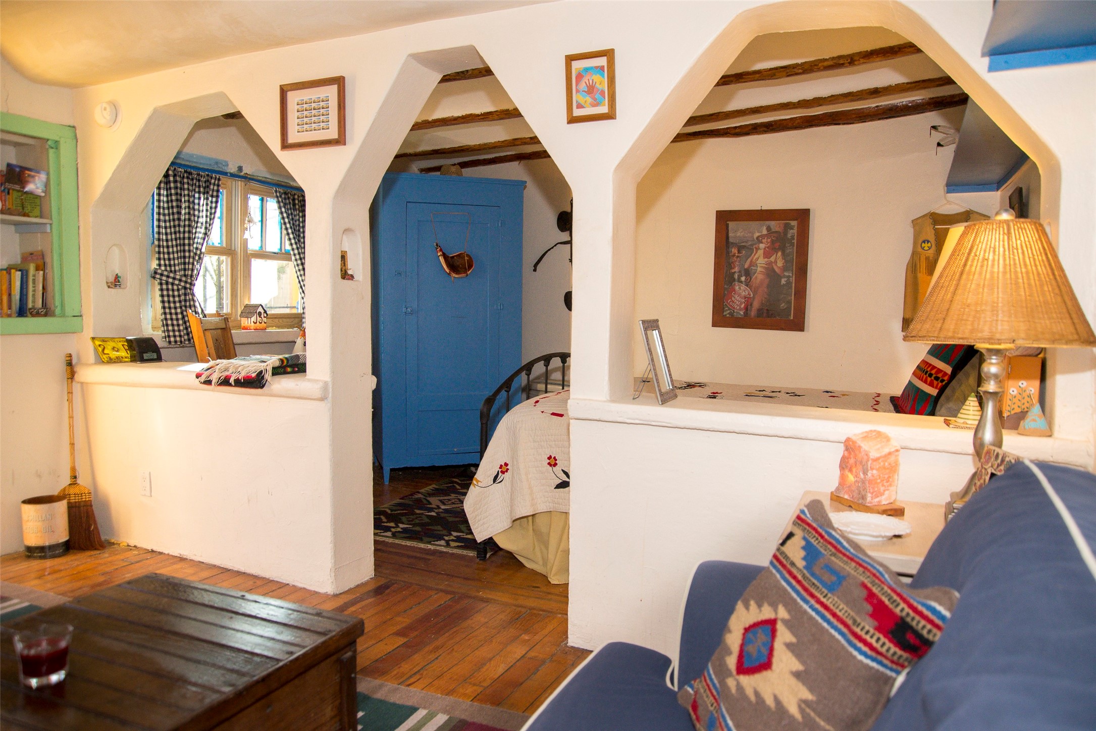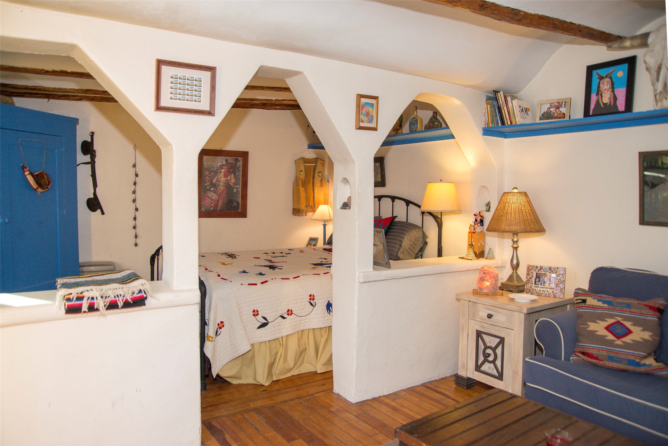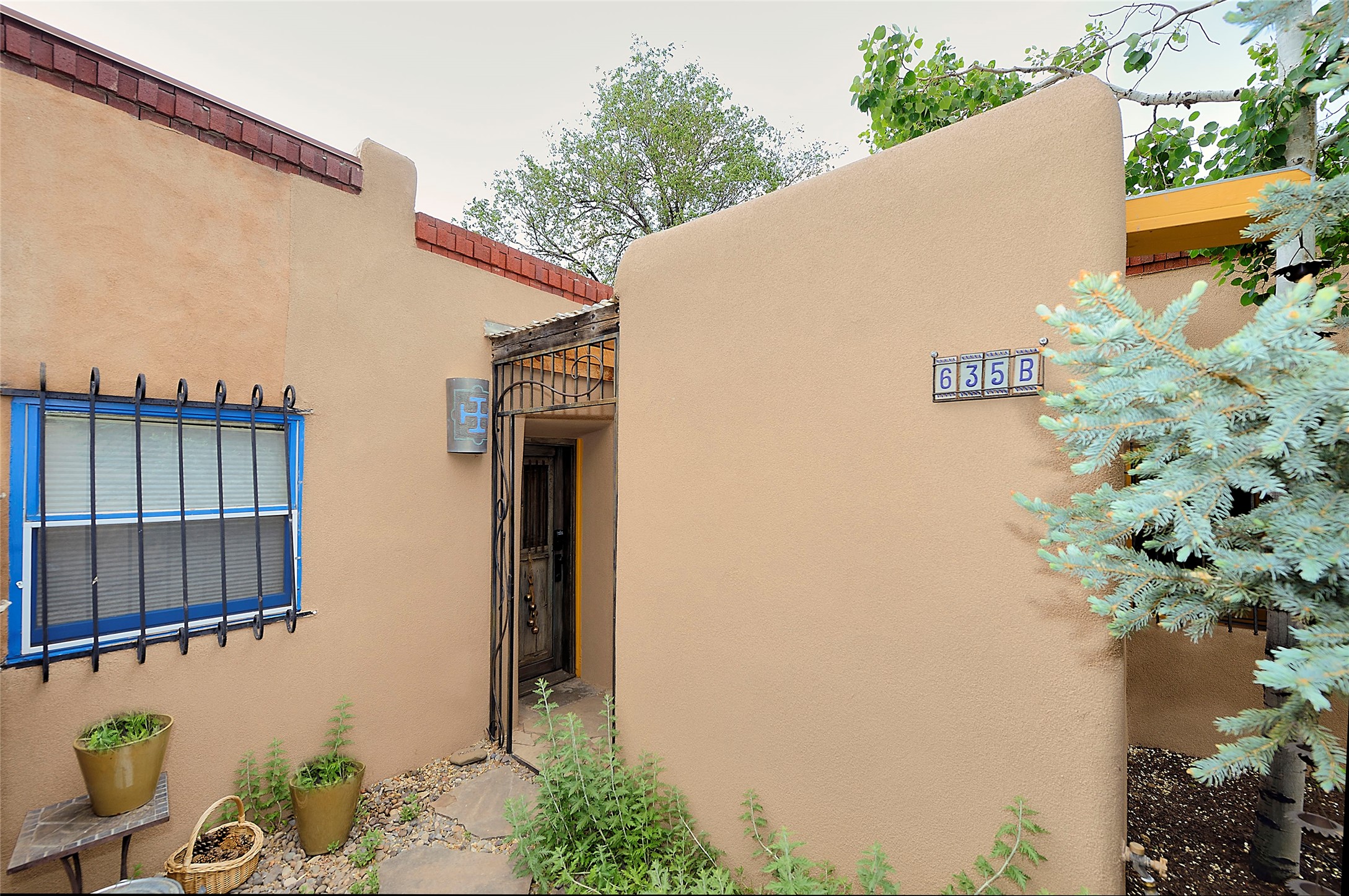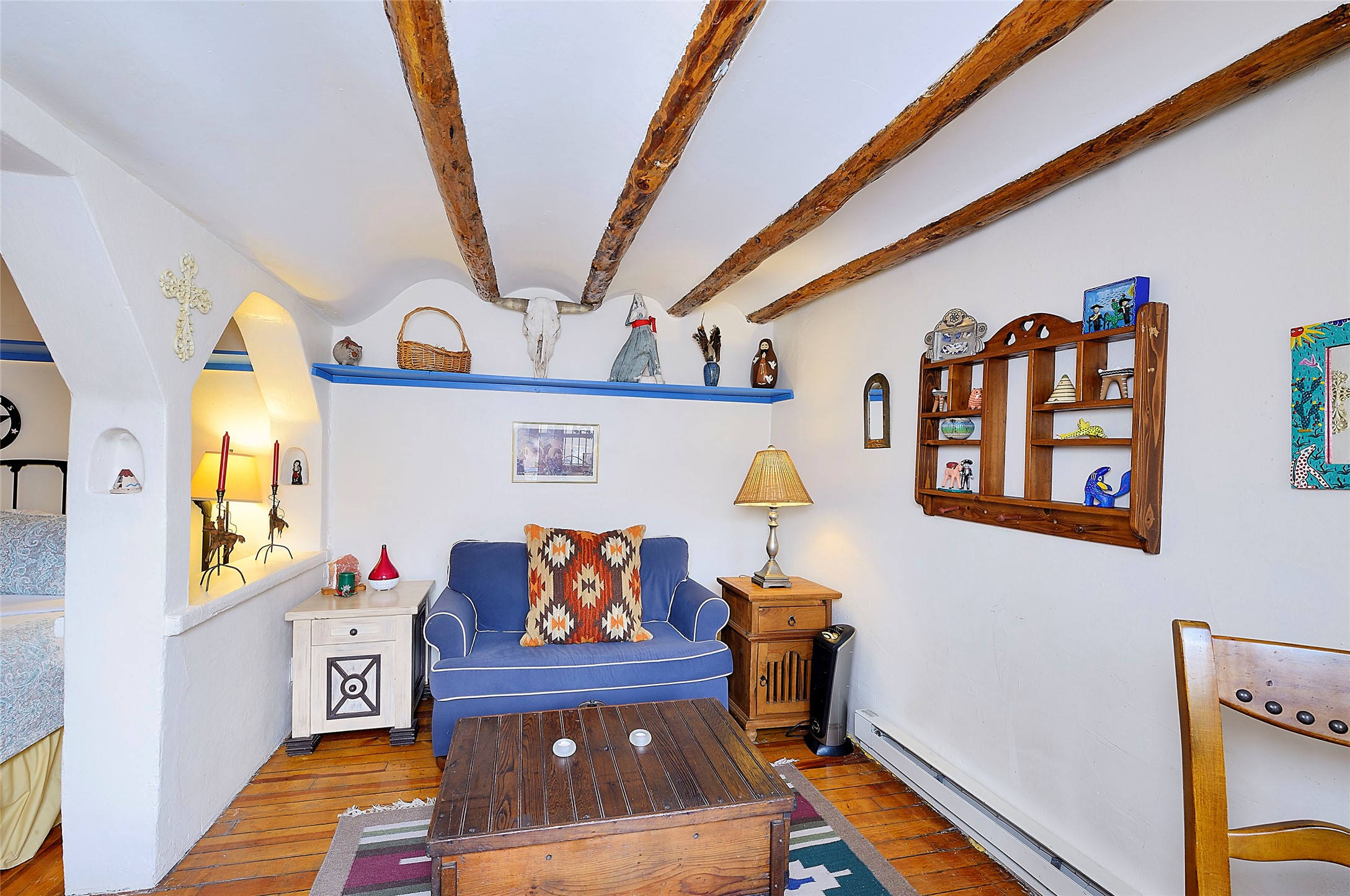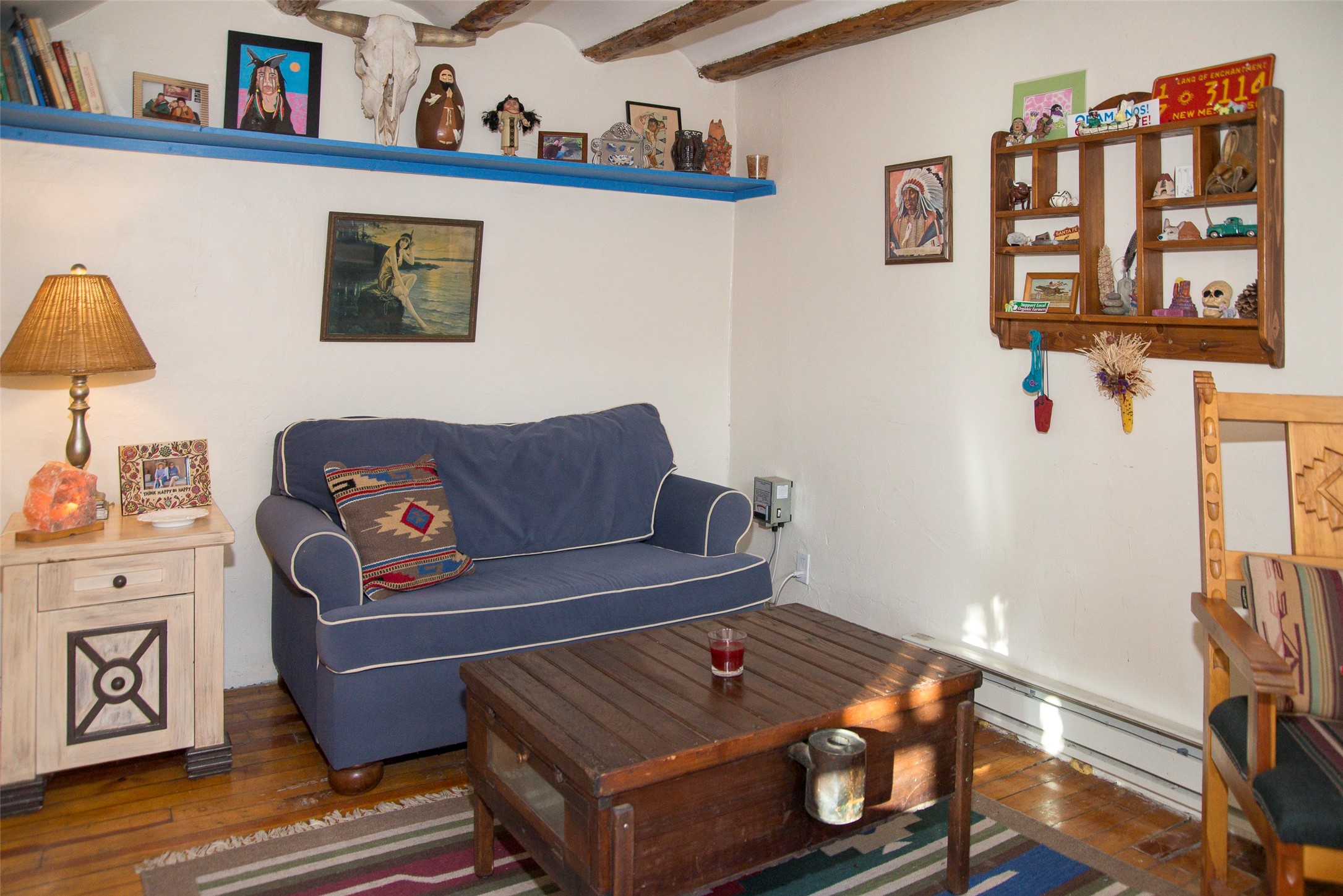 Experience the quintessential Santa Fe Style in this charming adobe home as you enter through a gated courtyard. Inside, the living room enchants with wood floors, a traditional kiva fireplace, and classic vigas. A generous bedroom continues the warmth with wood floors and vigas, paired with stylish nichos throughout the home. The bathroom is a bright oasis featuring tile flooring, a skylight, and a spacious walk-in shower. The large eat-in kitchen boasts saltillo tile, newer appliances, including a 6-burner professional series gas range, expansive cabinets, a large farmhouse sink, all under a viga-clad ceiling. Out back, find tranquility in the private courtyard where you'll be greeted by a cozy flagstone patio with mature trees. Additionally, the property boasts a charming studio/office, complete with wood floors and coved ceiling with vigas; and finally two storage sheds! Located less than a mile from the plaza, this home is the epitome of Santa Fe charm and convenience!