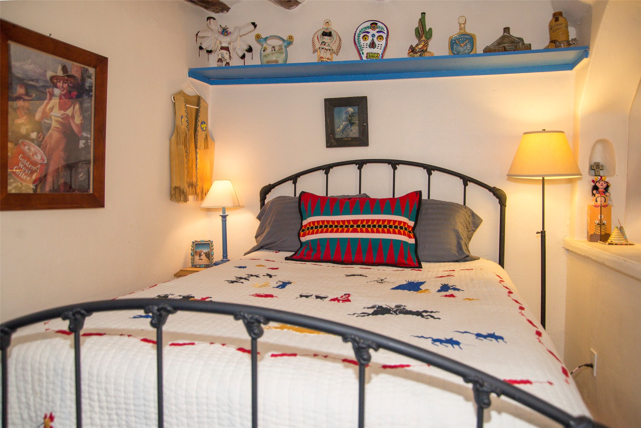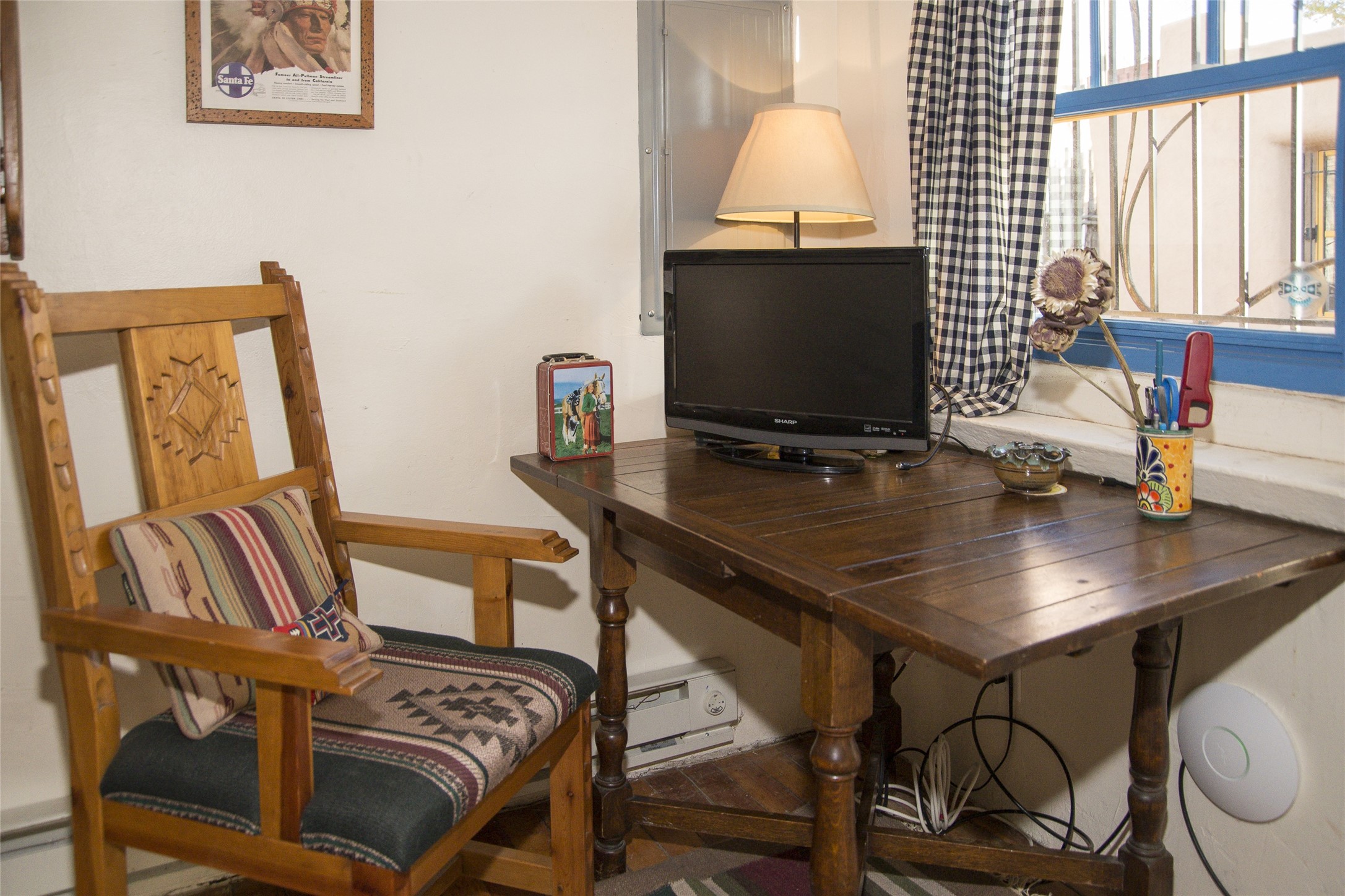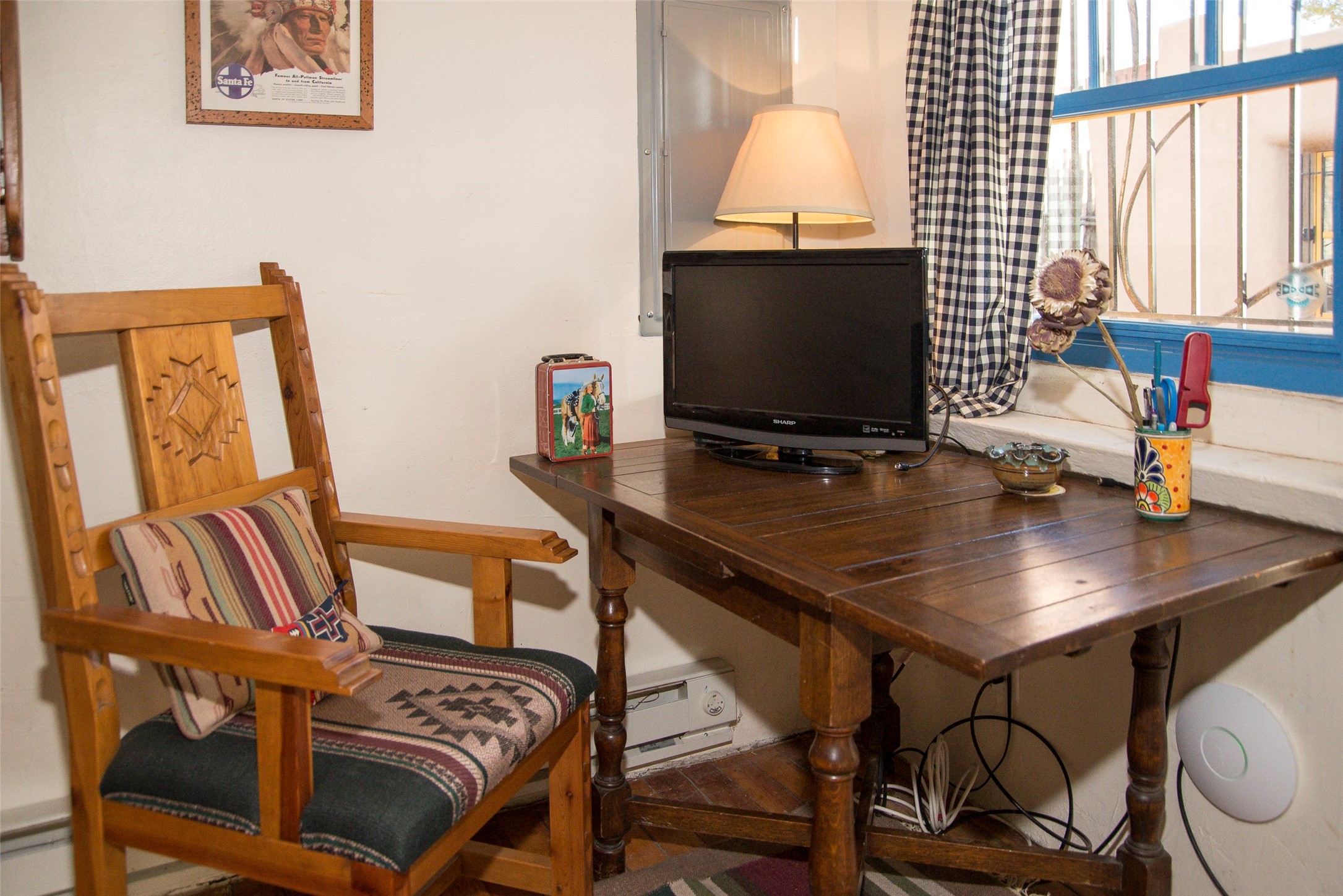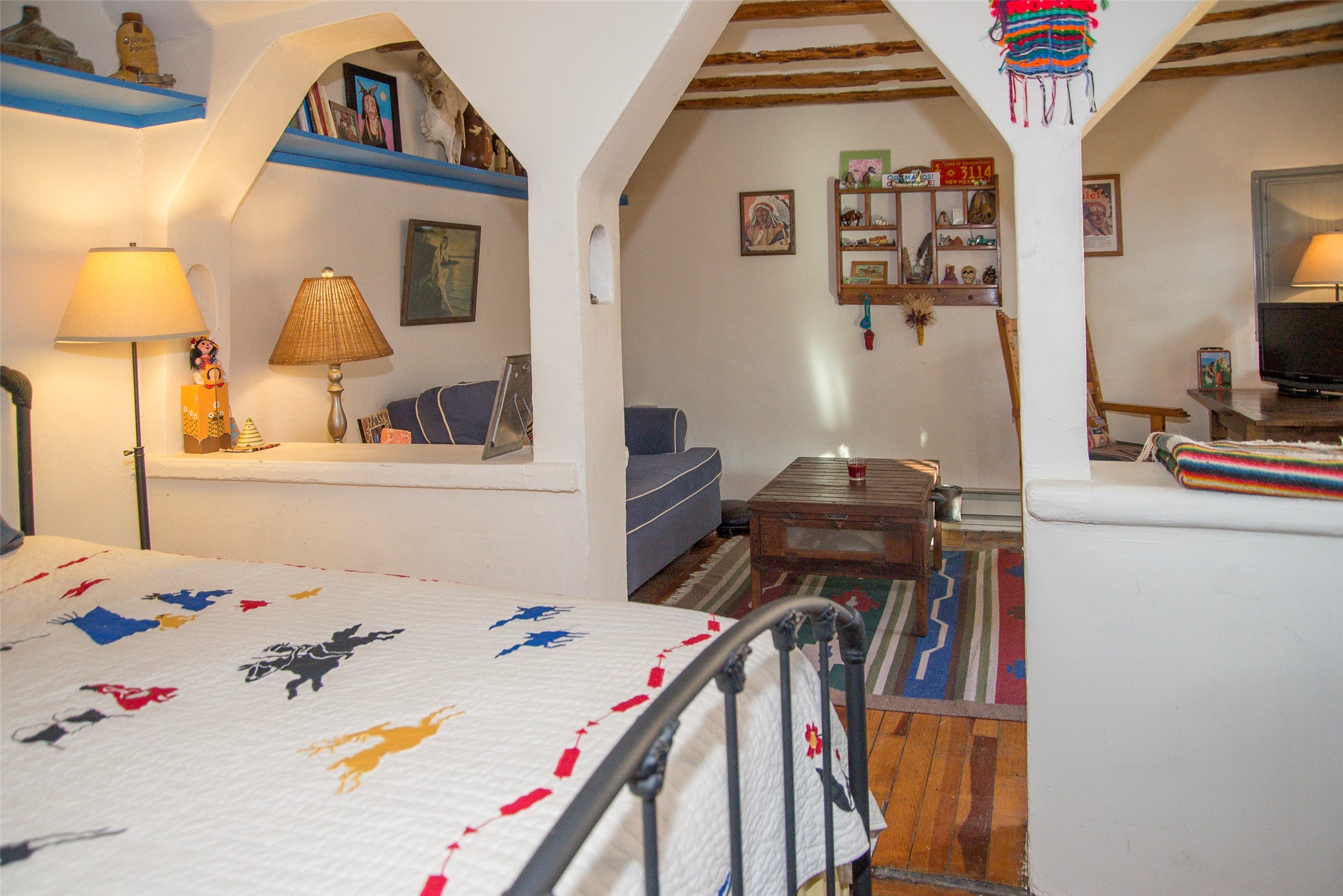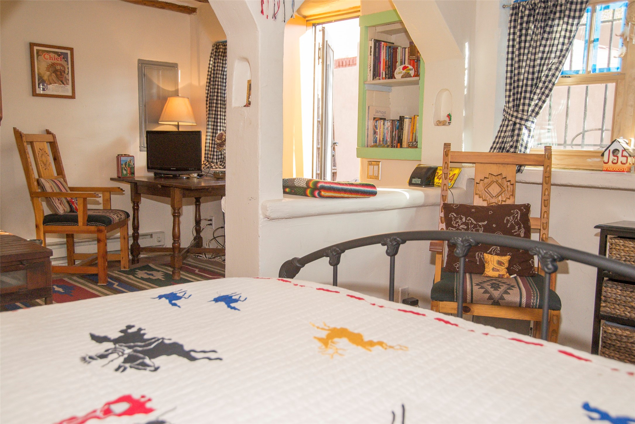 Experience the quintessential Santa Fe Style in this charming adobe home as you enter through a gated courtyard. Inside, the living room enchants with wood floors, a traditional kiva fireplace, and classic vigas. A generous bedroom continues the warmth with wood floors and vigas, paired with stylish nichos throughout the home. The bathroom is a bright oasis featuring tile flooring, a skylight, and a spacious walk-in shower. The large eat-in kitchen boasts saltillo tile, newer appliances, including a 6-burner professional series gas range, expansive cabinets, a large farmhouse sink, all under a viga-clad ceiling. Out back, find tranquility in the private courtyard where you'll be greeted by a cozy flagstone patio with mature trees. Additionally, the property boasts a charming studio/office, complete with wood floors and coved ceiling with vigas; and finally two storage sheds! Located less than a mile from the plaza, this home is the epitome of Santa Fe charm and convenience!
