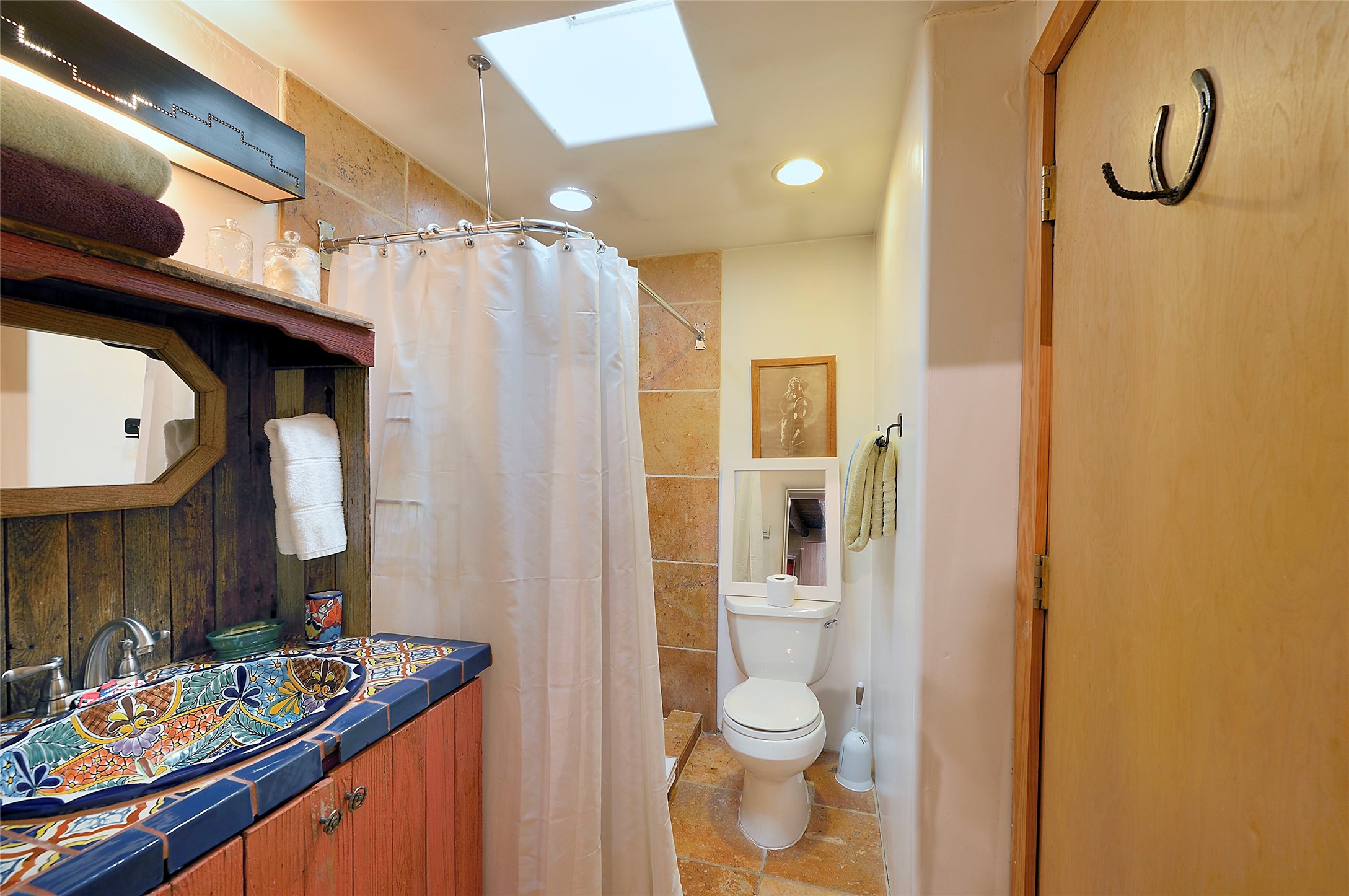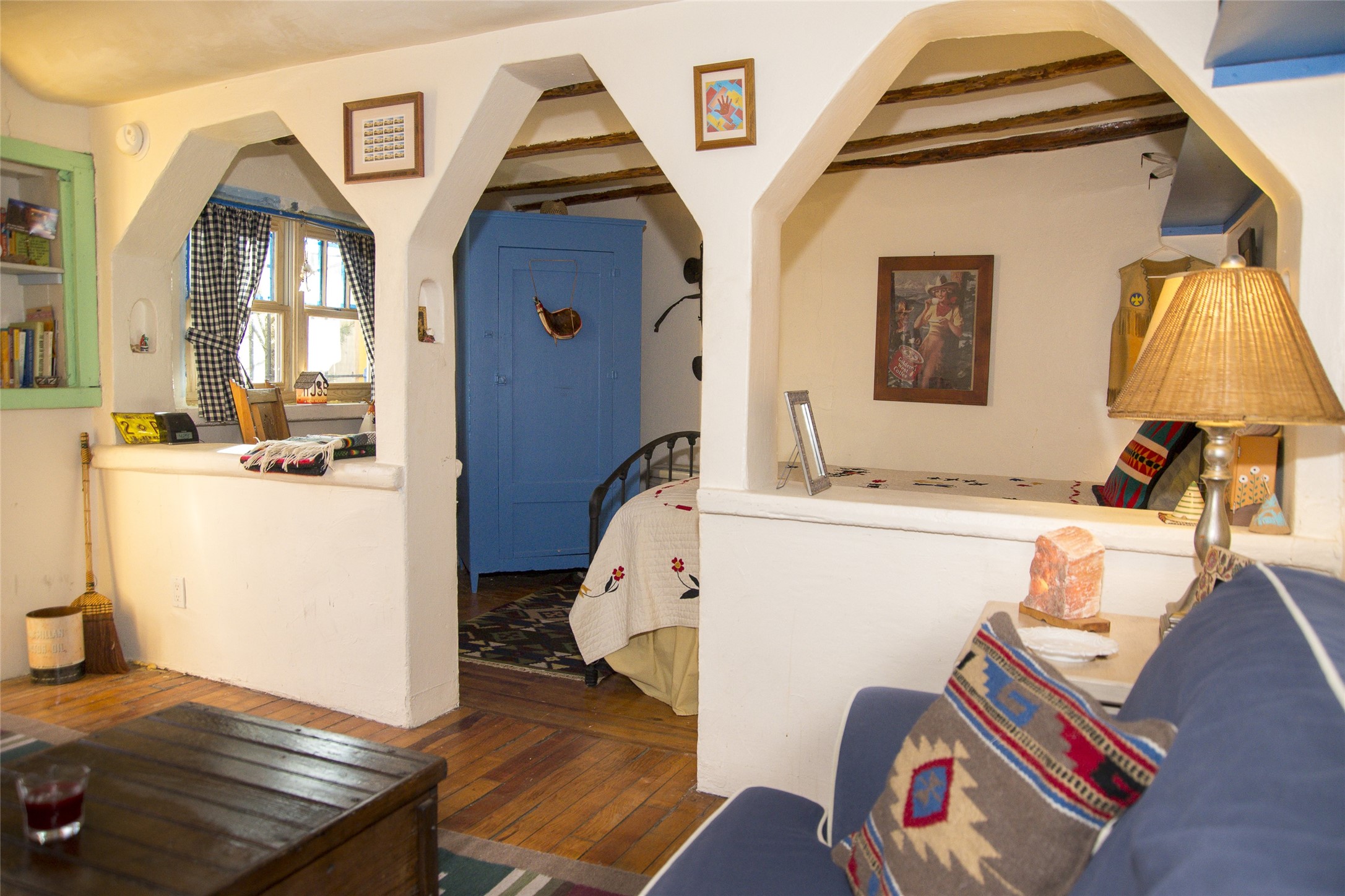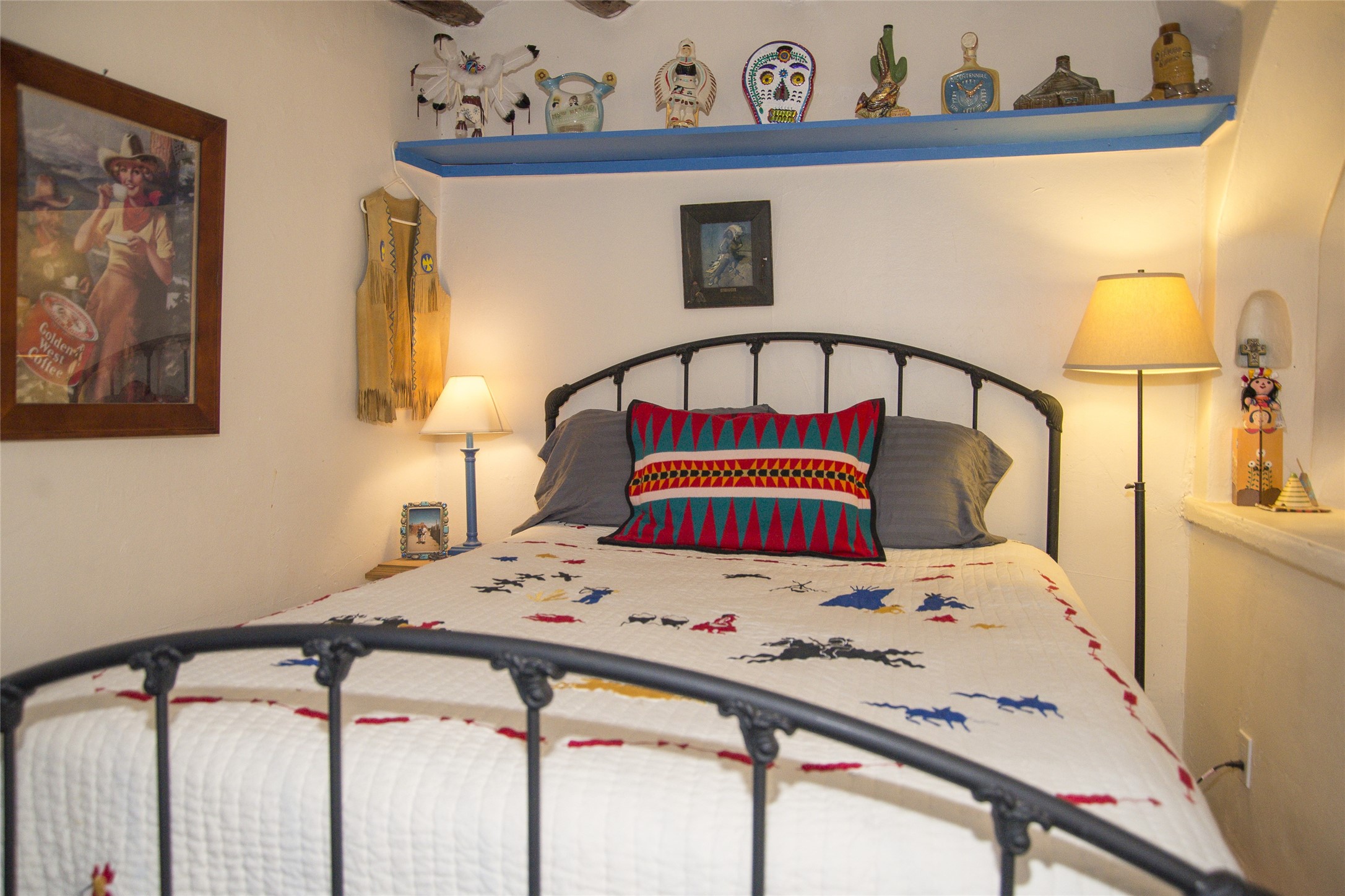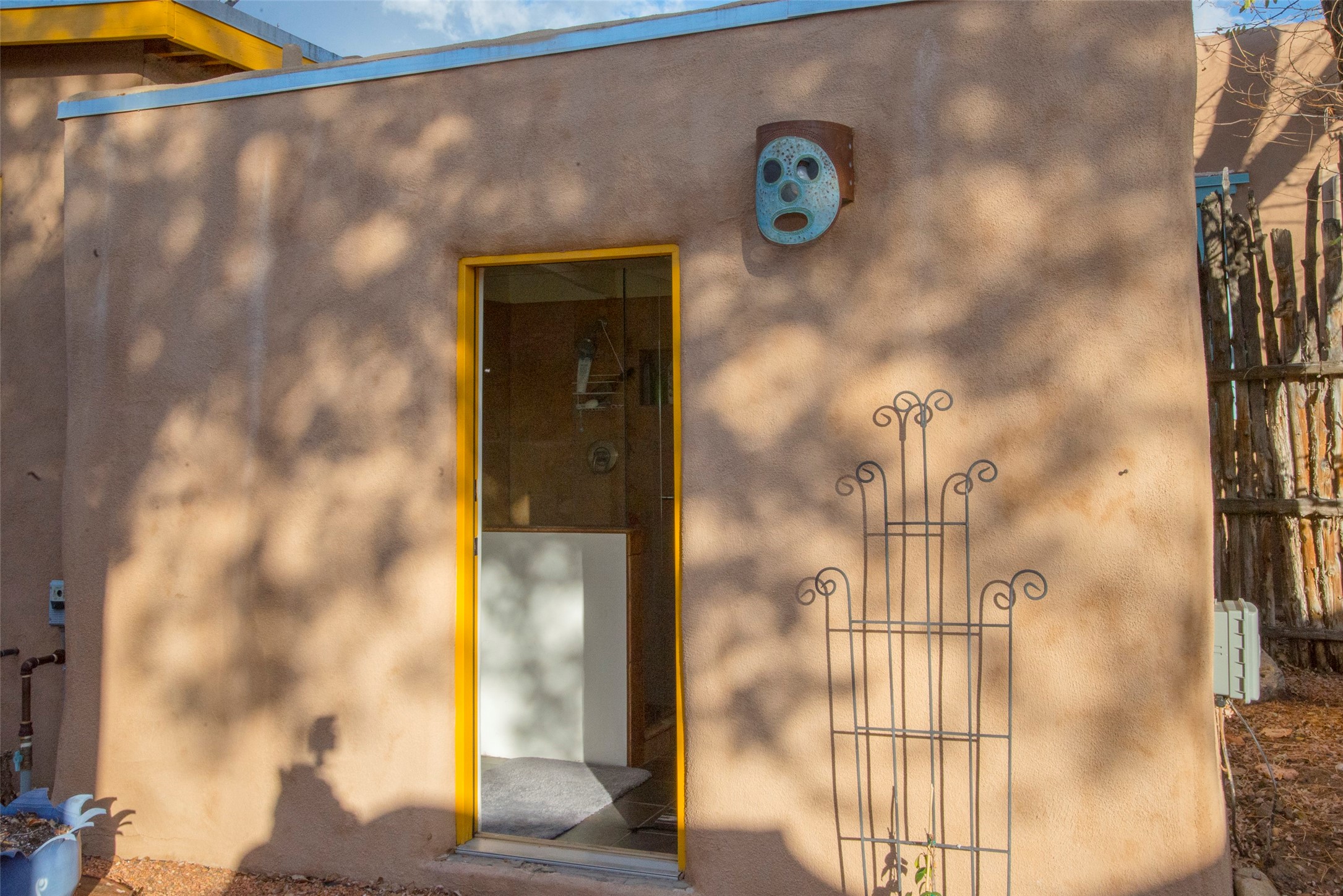 Experience the quintessential Santa Fe Style in this charming adobe home as you enter through a gated courtyard. Inside, the living room enchants with wood floors, a traditional kiva fireplace, and classic vigas. A generous bedroom continues the warmth with wood floors and vigas, paired with stylish nichos throughout the home. The bathroom is a bright oasis featuring tile flooring, a skylight, and a spacious walk-in shower. The large eat-in kitchen boasts saltillo tile, newer appliances, including a 6-burner professional series gas range, expansive cabinets, a large farmhouse sink, all under a viga-clad ceiling. Out back, find tranquility in the private courtyard where you'll be greeted by a cozy flagstone patio with mature trees. Additionally, the property boasts a charming studio/office, complete with wood floors and coved ceiling with vigas; and finally two storage sheds! Located less than a mile from the plaza, this home is the epitome of Santa Fe charm and convenience!