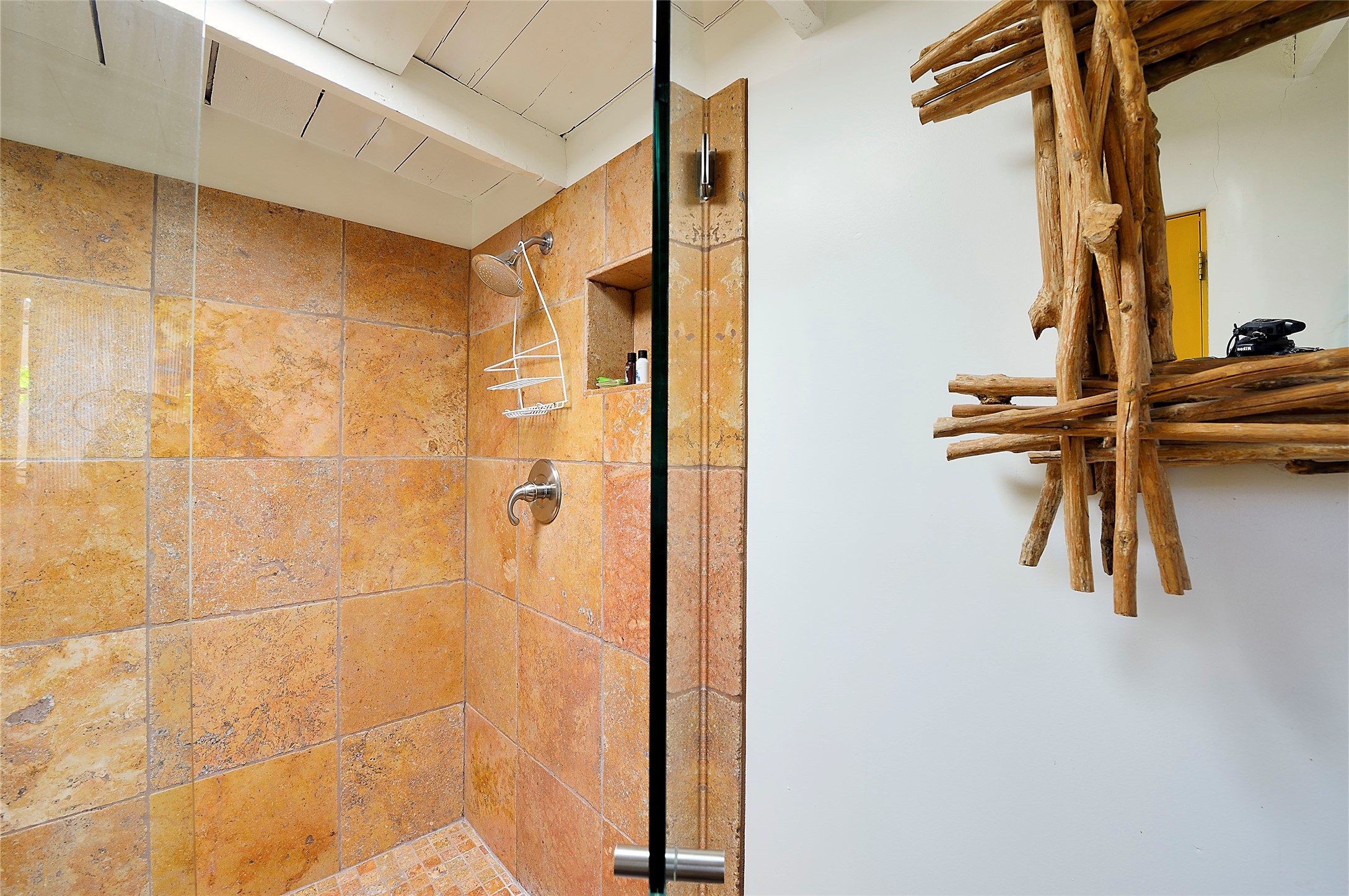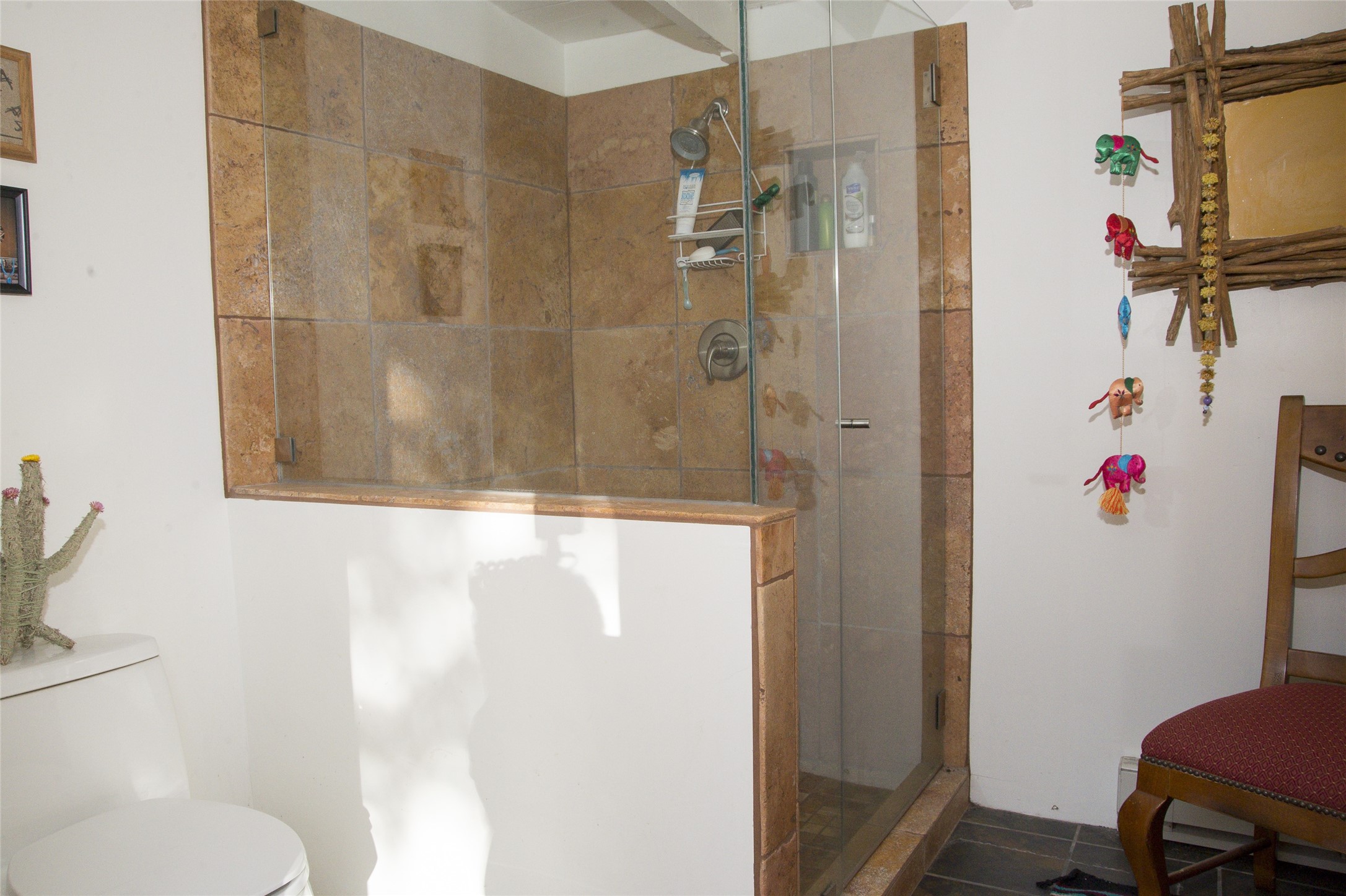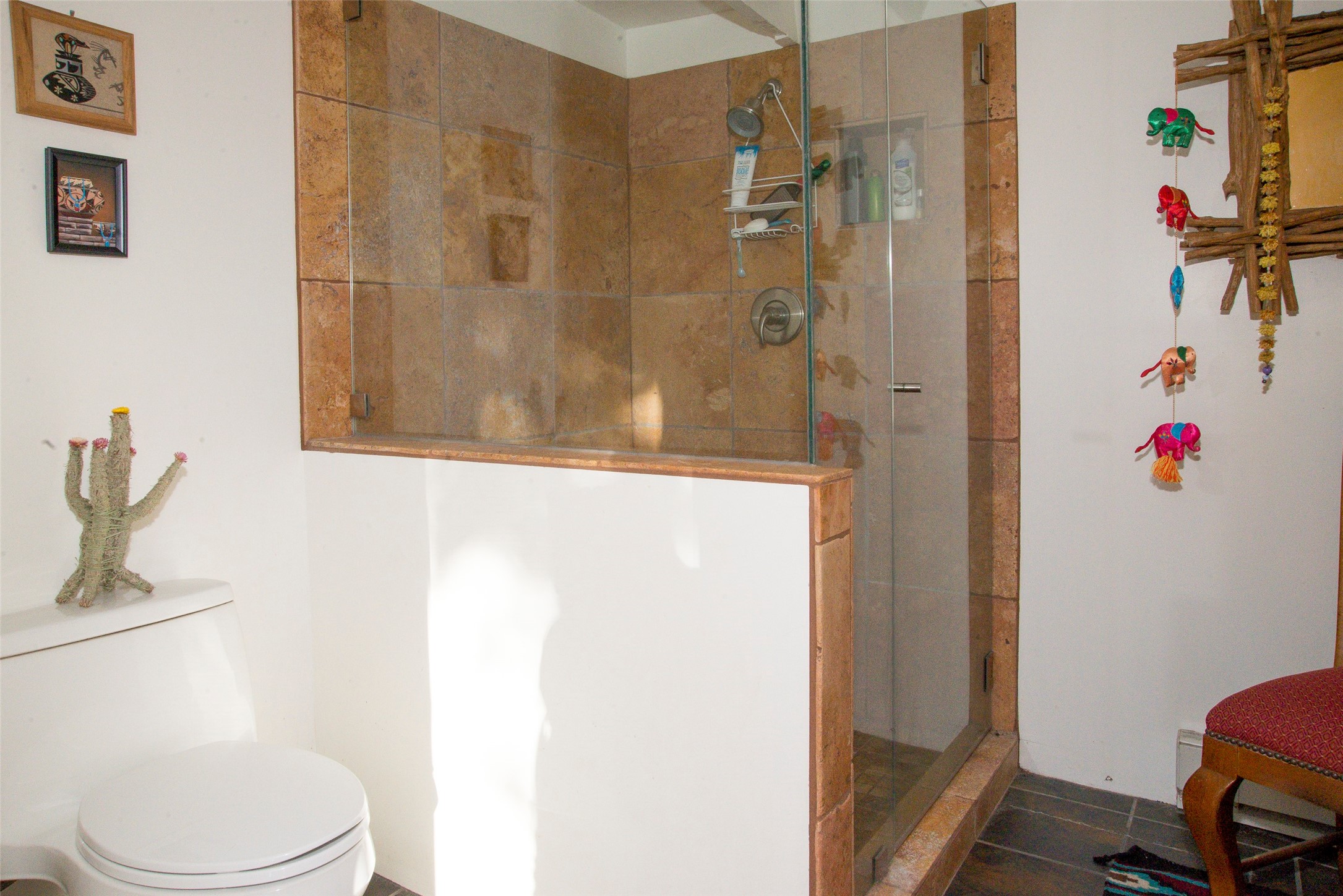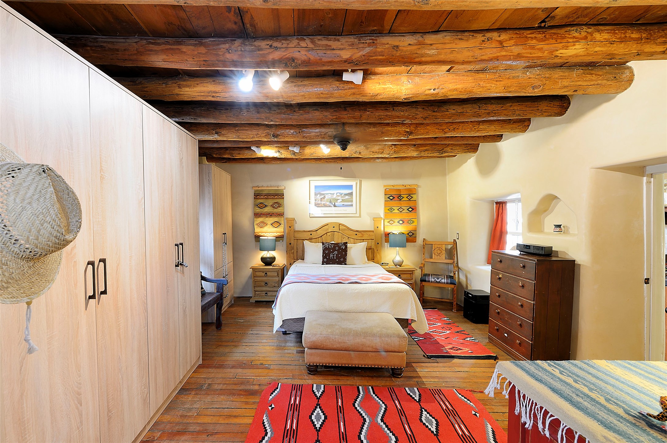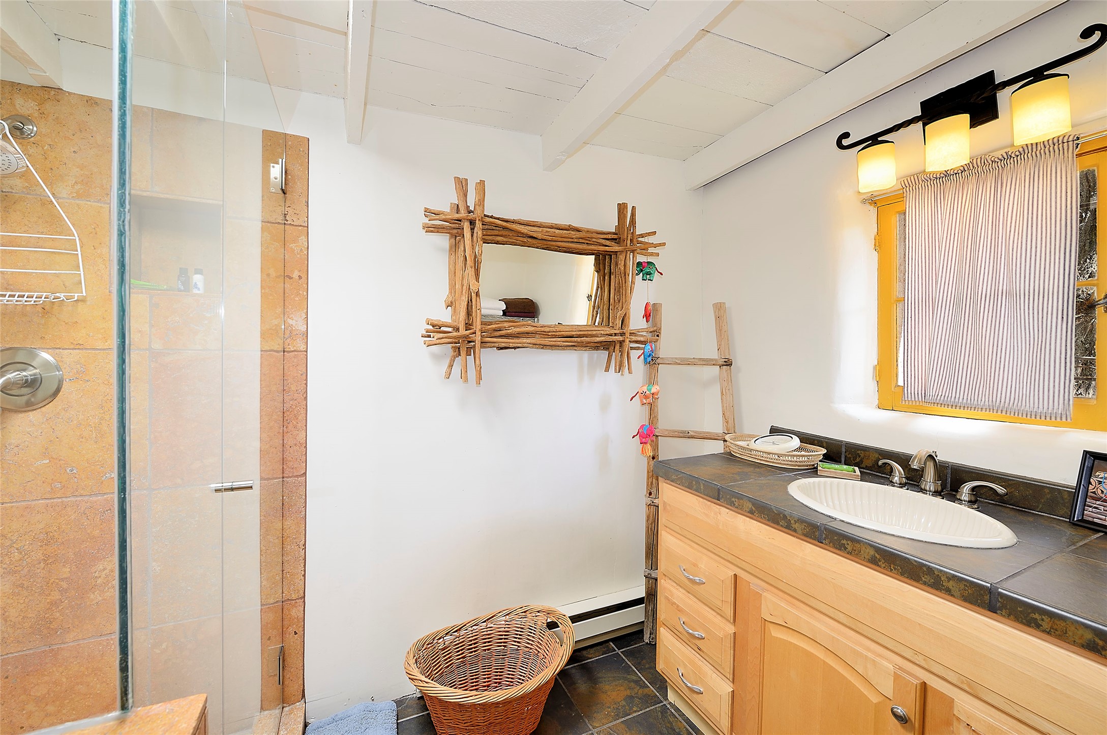 Experience the quintessential Santa Fe Style in this charming adobe home as you enter through a gated courtyard. Inside, the living room enchants with wood floors, a traditional kiva fireplace, and classic vigas. A generous bedroom continues the warmth with wood floors and vigas, paired with stylish nichos throughout the home. The bathroom is a bright oasis featuring tile flooring, a skylight, and a spacious walk-in shower. The large eat-in kitchen boasts saltillo tile, newer appliances, including a 6-burner professional series gas range, expansive cabinets, a large farmhouse sink, all under a viga-clad ceiling. Out back, find tranquility in the private courtyard where you'll be greeted by a cozy flagstone patio with mature trees. Additionally, the property boasts a charming studio/office, complete with wood floors and coved ceiling with vigas; and finally two storage sheds! Located less than a mile from the plaza, this home is the epitome of Santa Fe charm and convenience!