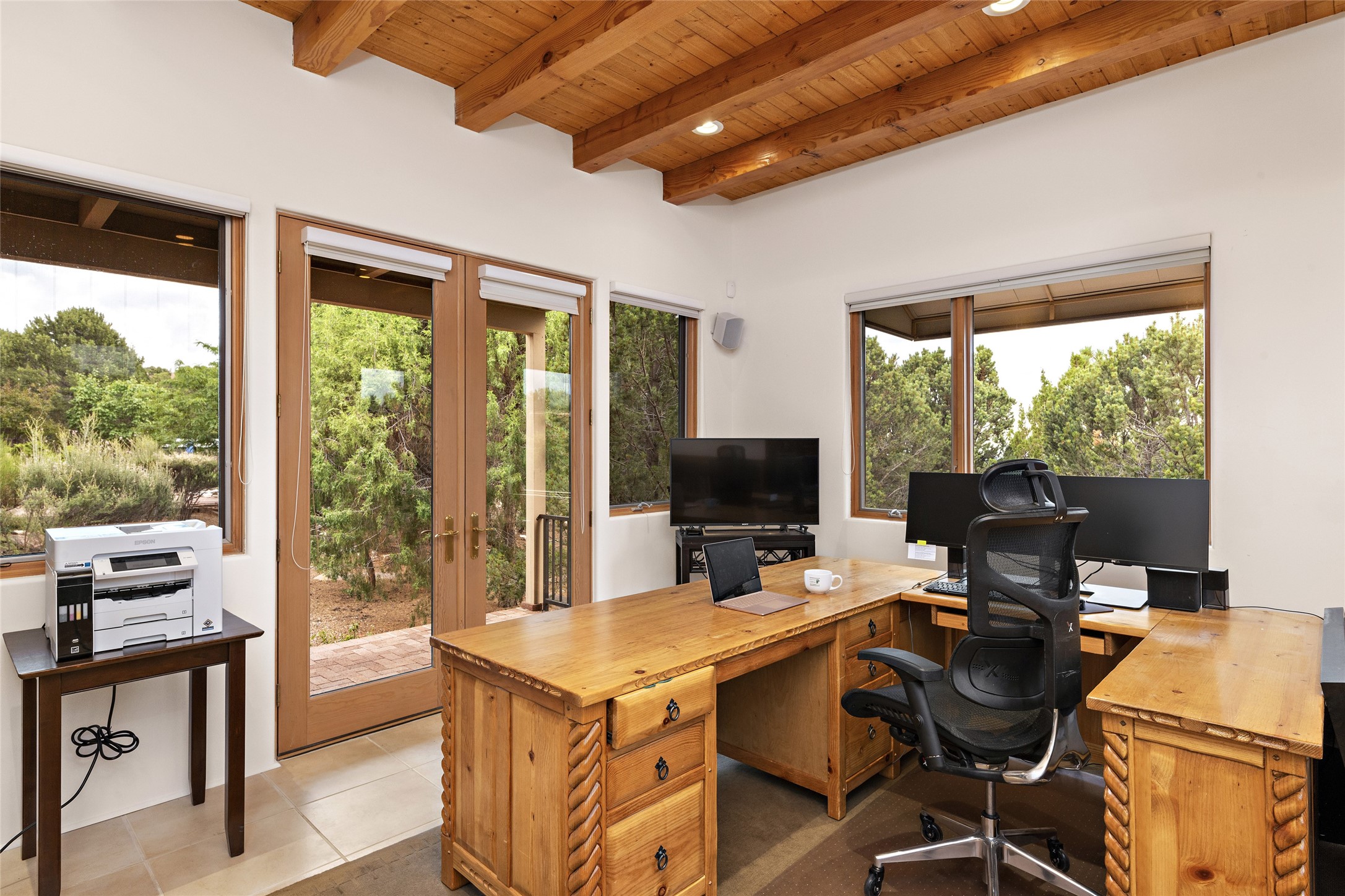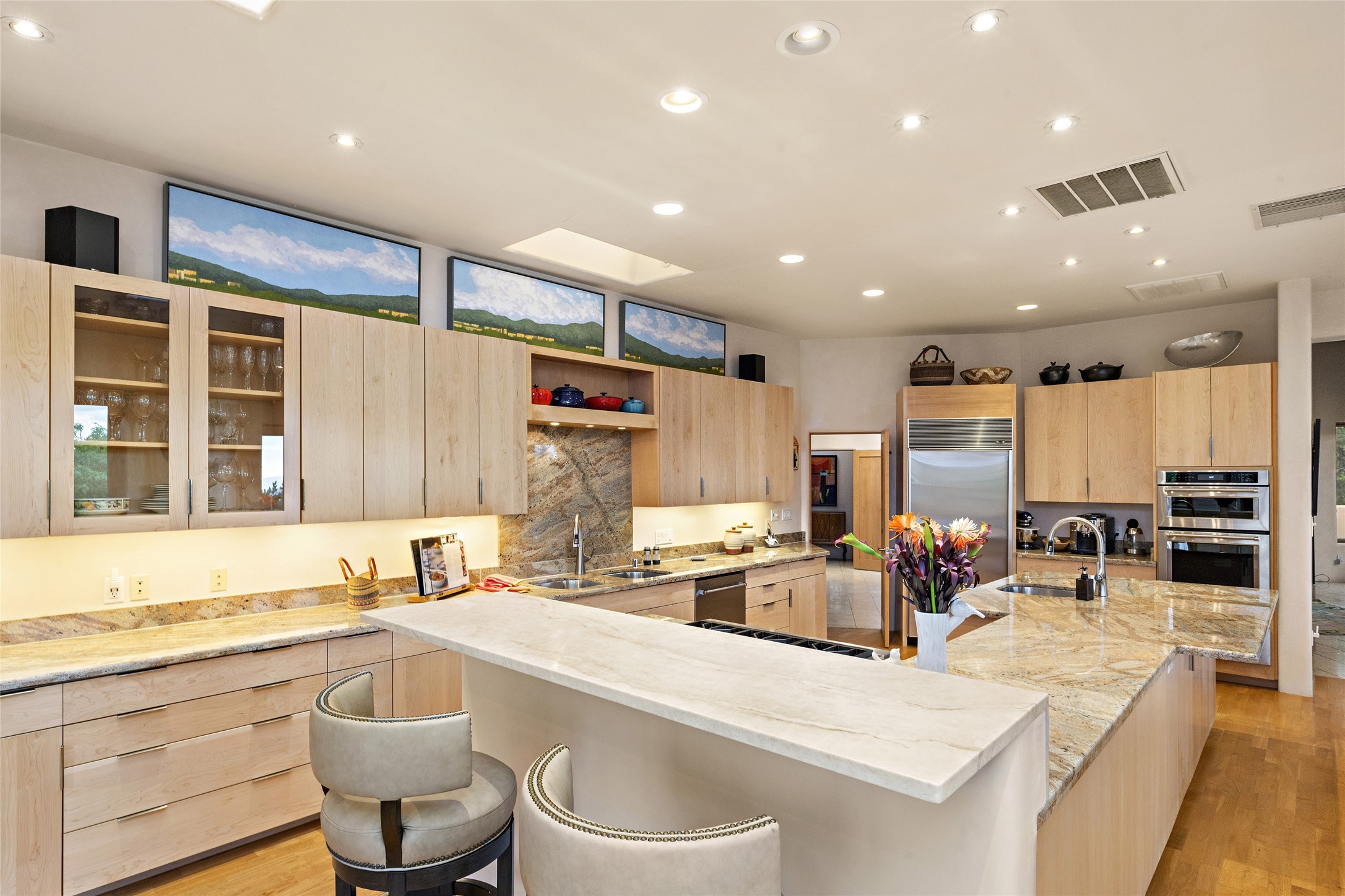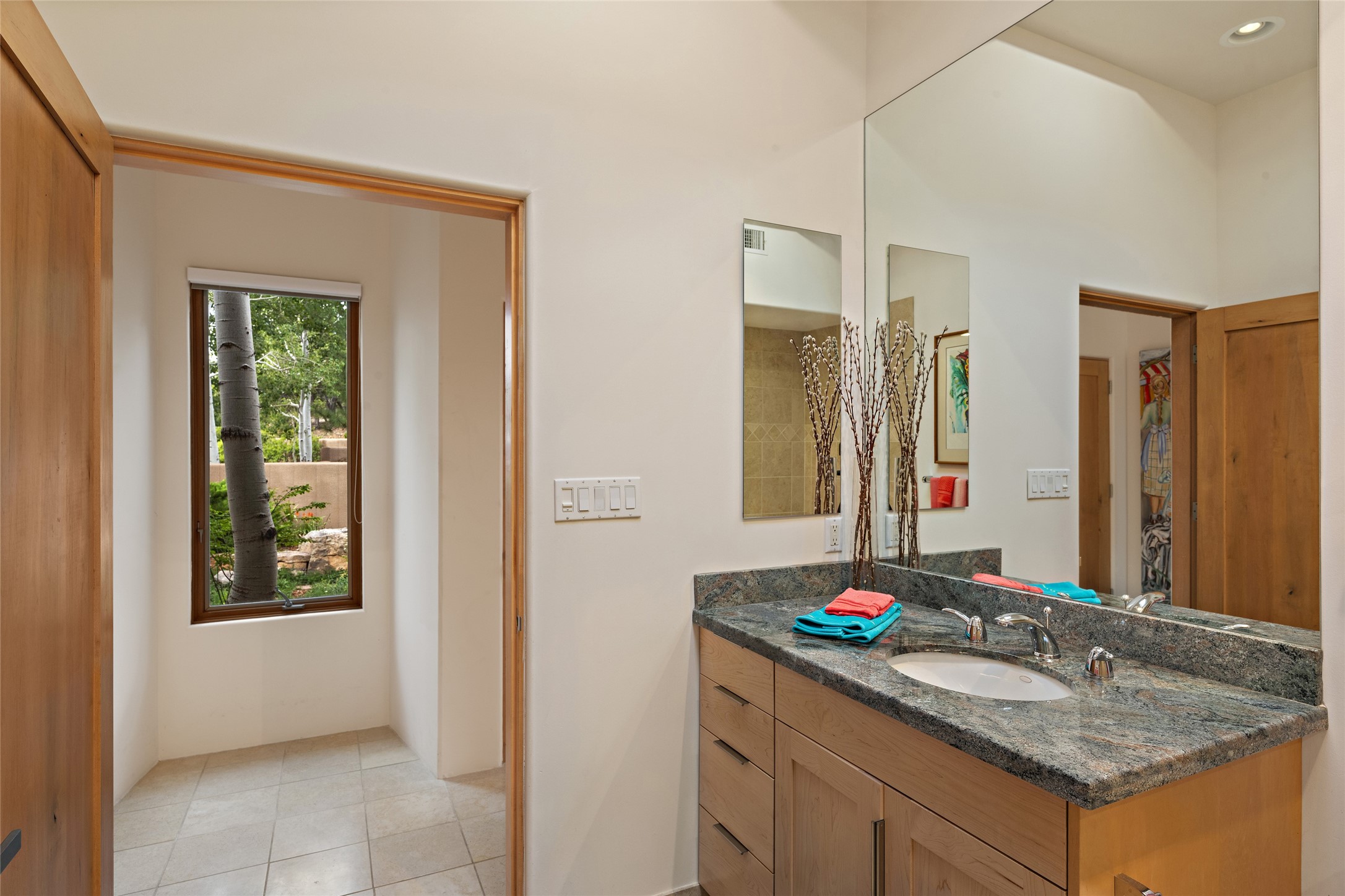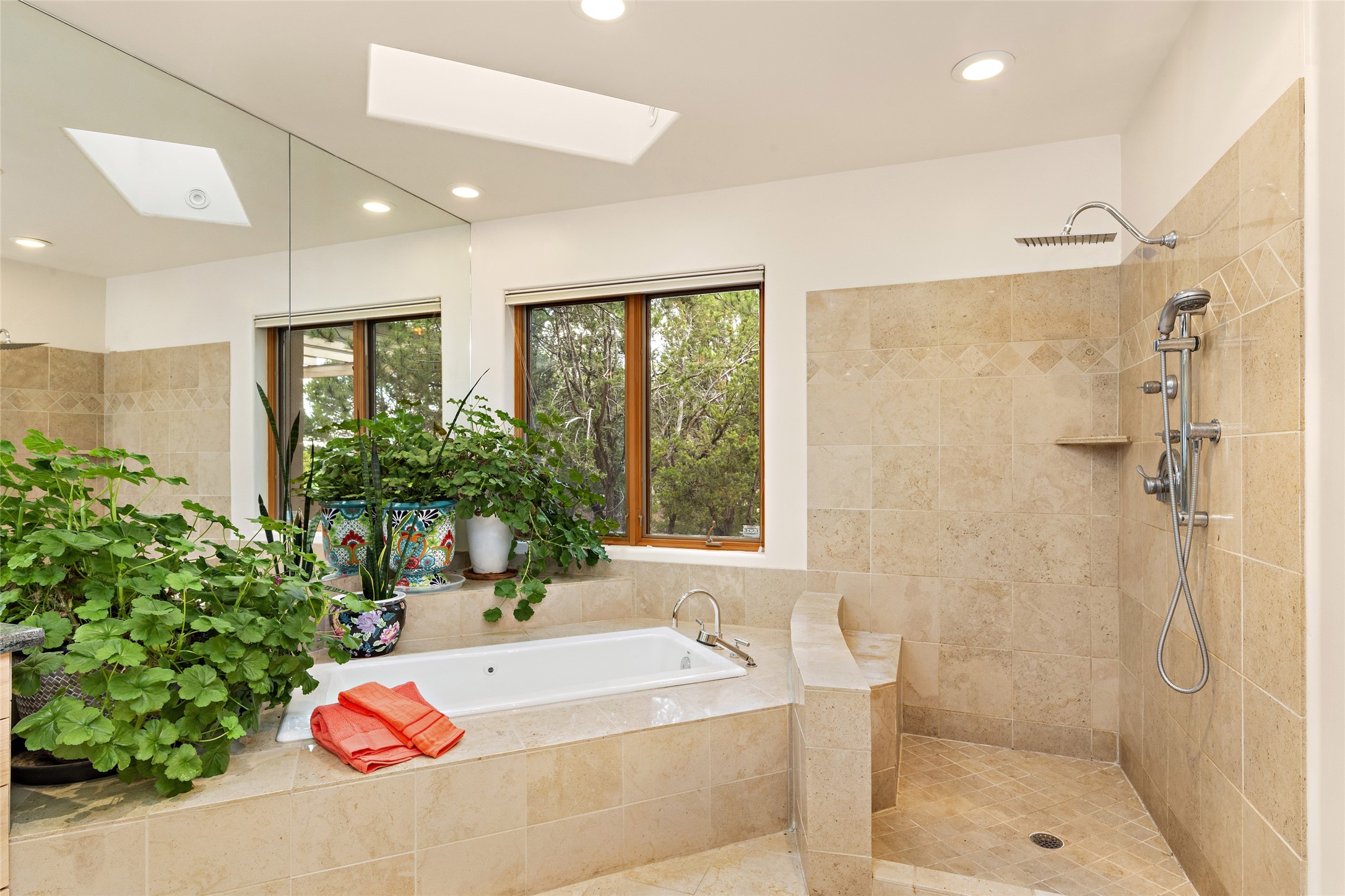 Views, Privacy & Elegance await you at this Single-Level Soft Contemporary home, with 5 Bedrooms, 4 Baths plus a spacious Guest House which has 2 of the Bedrooms & 1 Bath on 2-plus acres in a private, gated community in Sierra del Norte. The Living Room includes a wood-burning fireplace, tall ceilings and flows into the spacious Dining area with room for eight. The Gourmet Kitchen includes Wolf, SubZero & KitchenAid stainless appliances plus an abundance of counter space for meal preparation as well as dining & socializing with friends & family. The Master Bedroom Suite includes a wood-burning fireplace, enormous walk-in closet, access to a private outdoor area plus an equally spacious Bath with double sinks, oversized shower, jetted tub & compartmented water closet. Bedroom Two, adjacent to the Master, can be a Den, Office, TV or Work-Out Room. Bedroom Three has an en-suite bath. The Guest House has a Bed & Bath plus an Office area pre-plumbed for a Kitchenette. The Guest House also has a huge Basement for a wine cave, work-out area or overflow storage. The Back Portal, accessed from the Living, Dining & Kitchen areas, includes a wood-burning fireplace and transitions easily to the landscaped back yard area with a 3-season Greenhouse. This home is in a private, gated community in the foothills that offers sunset and night light views, easy walking access to the Dale Ball Trail System as well as in-town convenience without the noise & traffic.