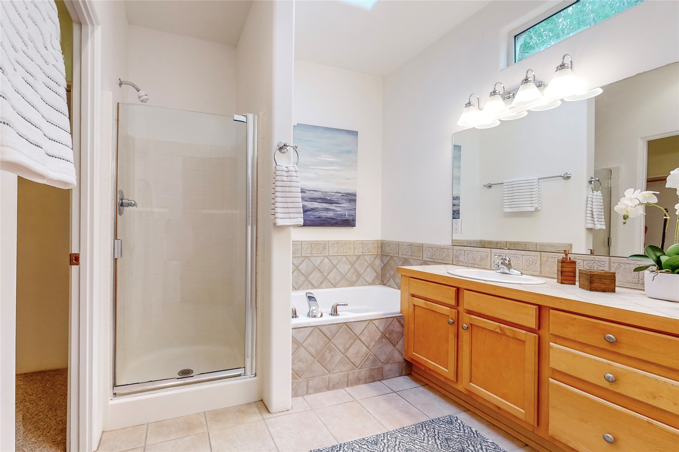 This was the model home for the subdivision when built with a number of upgrades. A vaulted ceiling covers the open living, dining, and kitchen area. Off the living area on one side is a main bedroom with jetted tub and separate shower. Off the other side of the living area are two bedrooms, a guest bathroom, and a laundry room. There is a small garden area with a tree. Just been stuccoed and the roof maintained.