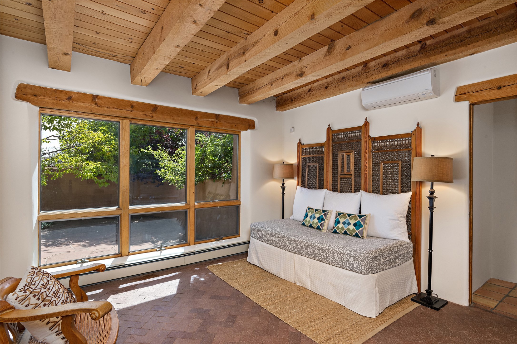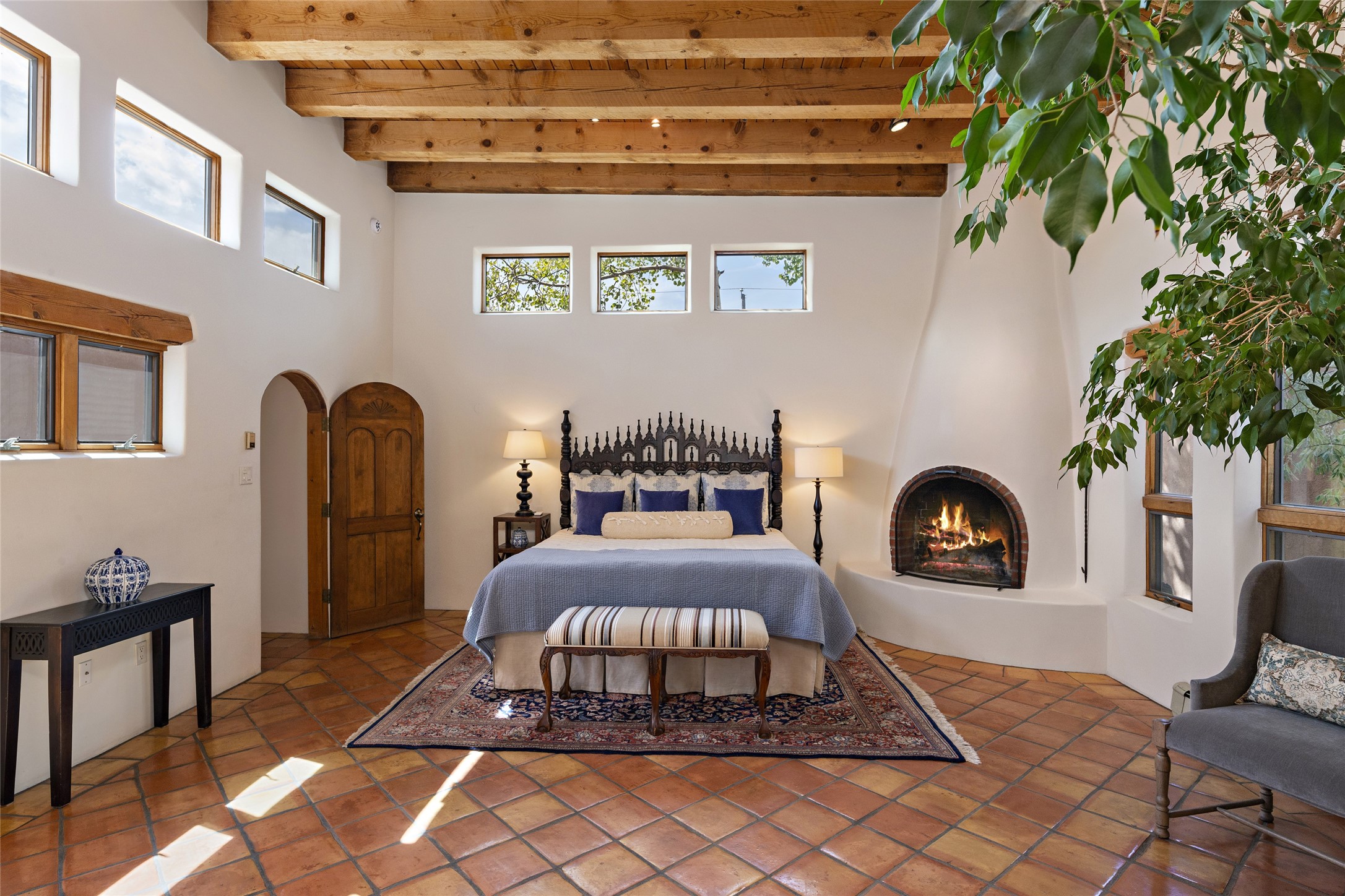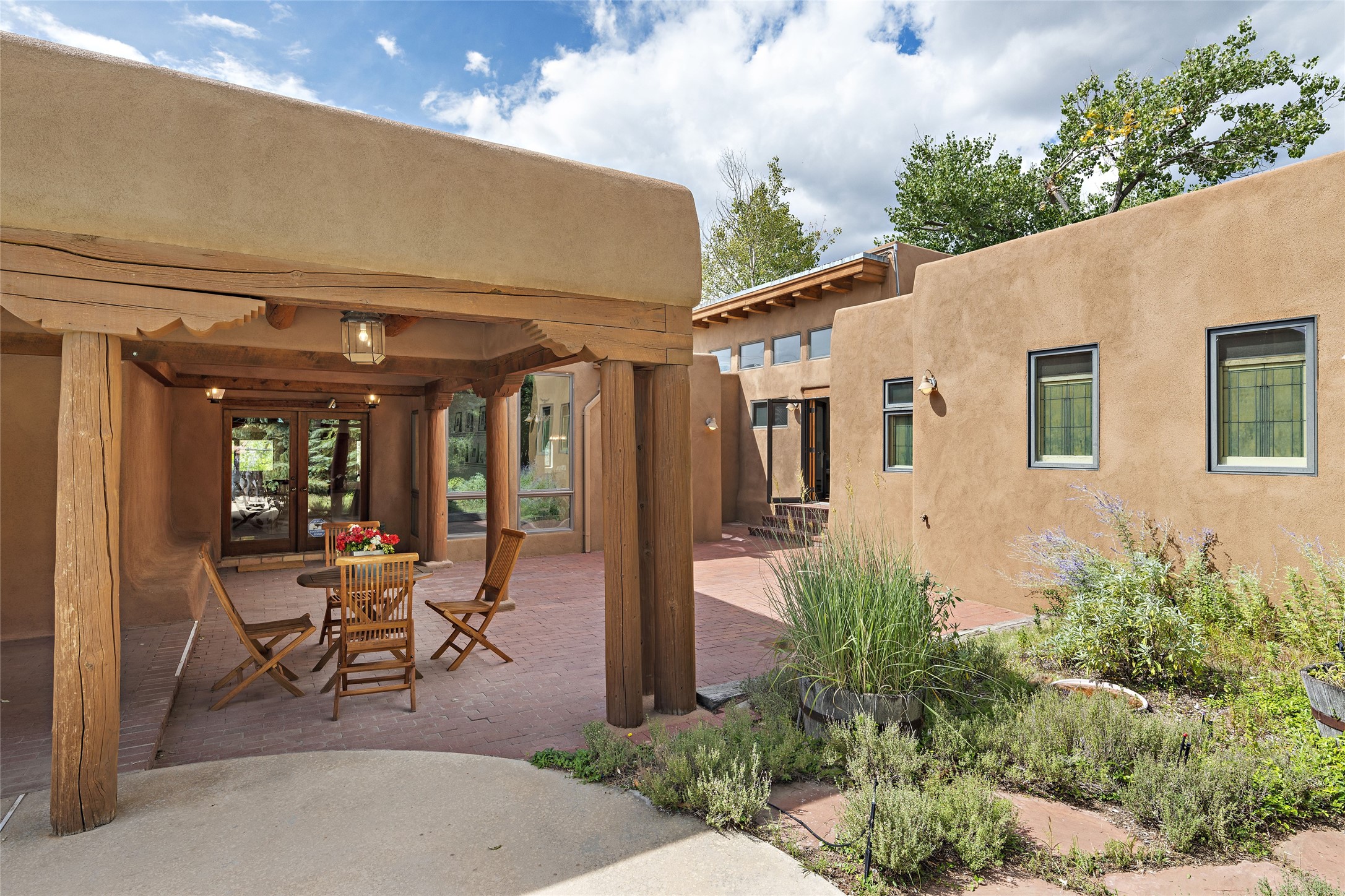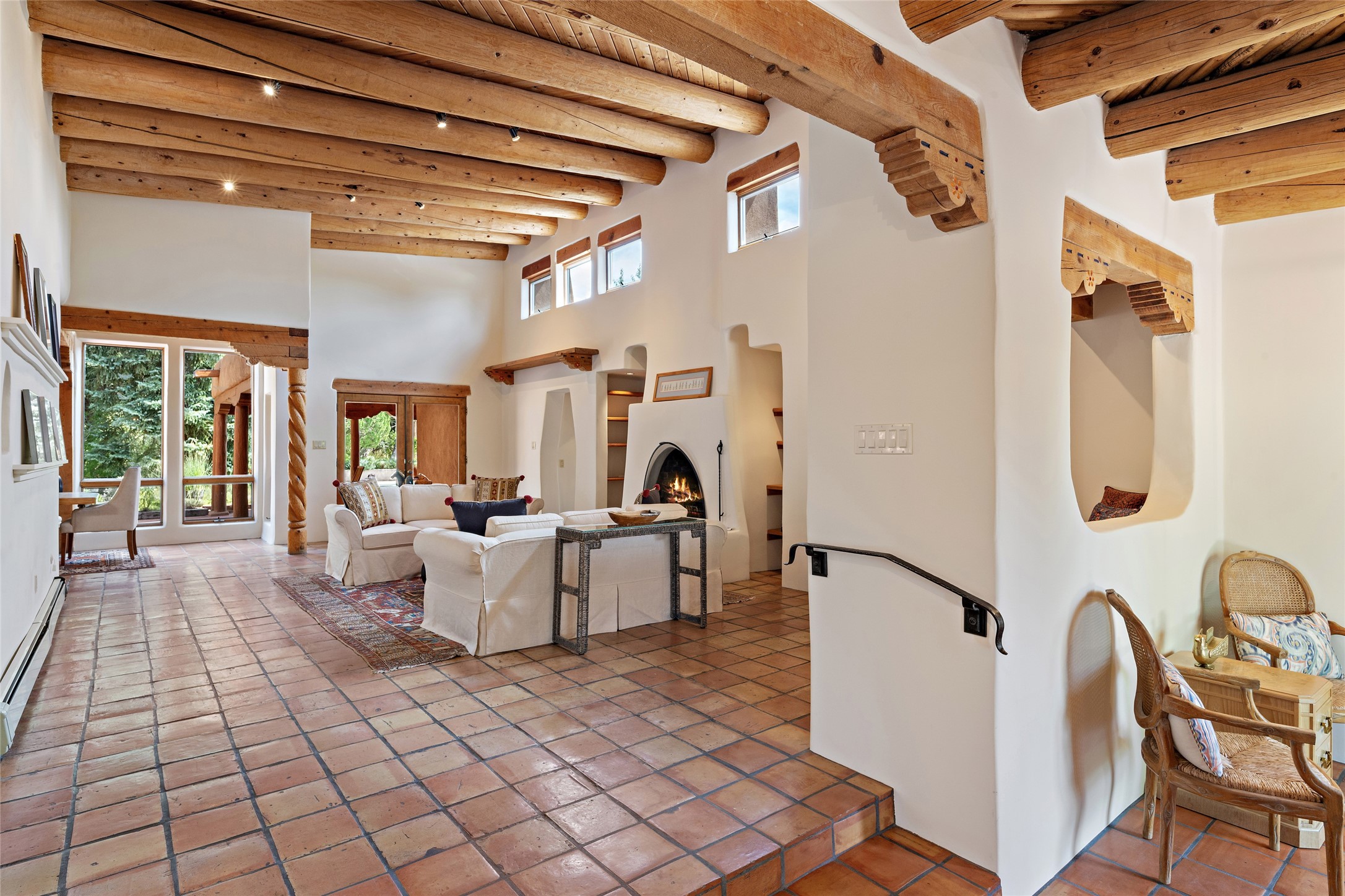 Embraced by lush, coyote-fenced grounds, this exquisite classic pueblo residence with casita and FOUR-CAR garaging, is an exceptional sanctuary. Abundant architectural details include vigas, beams, lintels and corbels with bullet carving & hand-painted accents, and rows of clerestory windows. The superb open concept design features a dramatic living room with soaring ceiling, track lighting, a fireplace flanked by deep, lighted alcoves with shelving, and French doors to the fabulous entertaining portal, pool area and mature trees & plantings. A generous dining area accesses the custom-designed chef's kitchen with breakfast & sitting/TV areas. An impressive private owner's suite bedroom boasts a high beamed ceiling, track lighting and kiva fireplace. The beautifully redesigned owner's bath and a private study have diamond plaster and in-floor radiant heat. A separate two-bedroom guest wing features a spacious high-walled courtyard with a gate to the pool & rear grounds. The delightful guest casita includes a high-ceilinged living room with fireplace, dining/office area, a bedroom and full bath. The 5 Daikon ductless mini-splits and a mini-split in the casita ensure year-round comfort. Situated just up the street from the storied Sol y Sombra estate, (owned by Georgia O'Keeffe; more recently by the late Paul Allen, co-founder of Microsoft), and within the Wood Gormley school district.