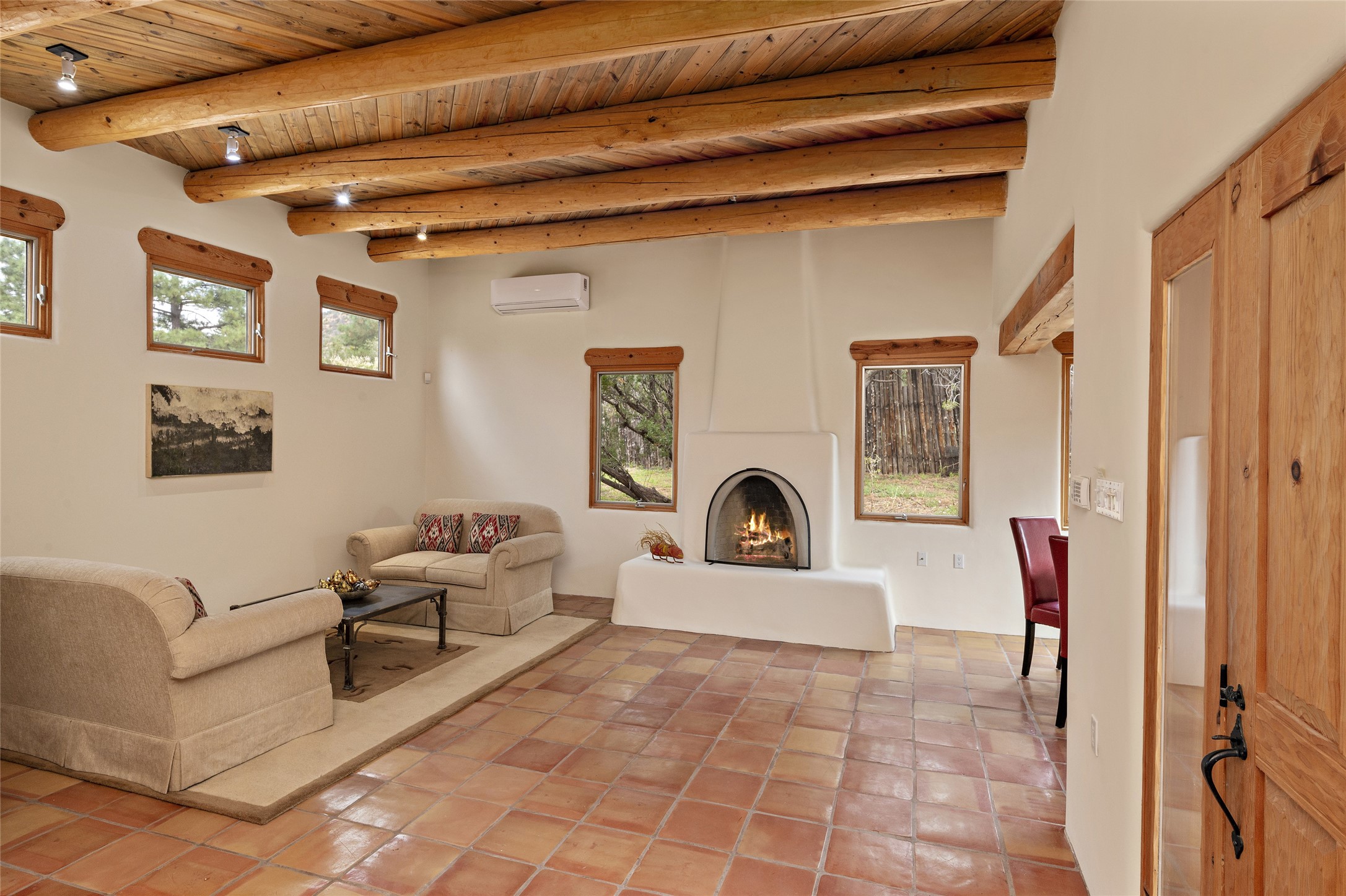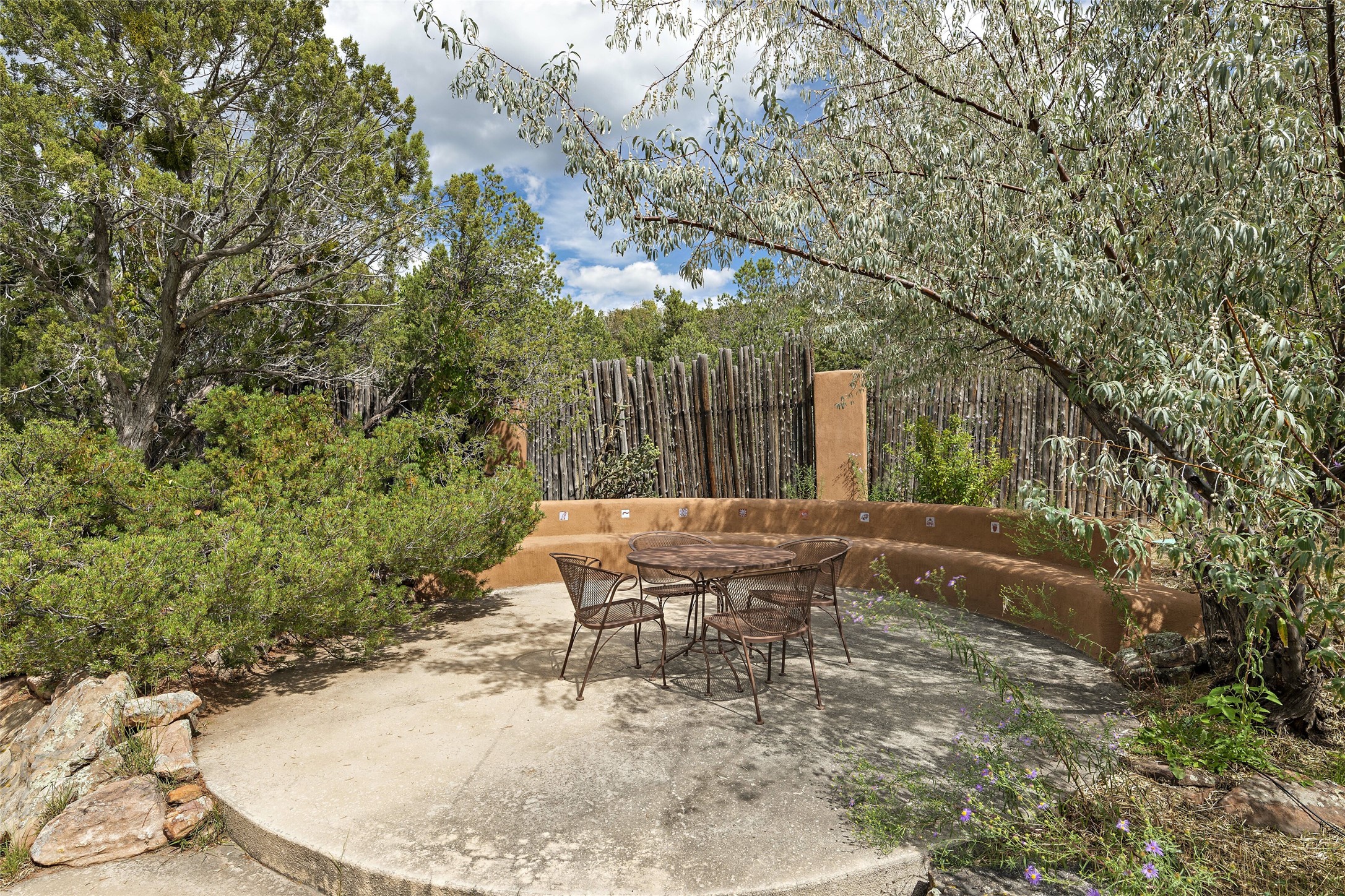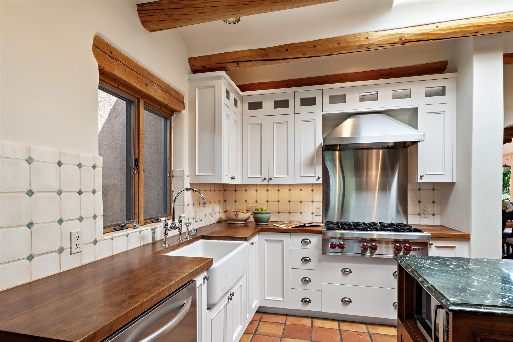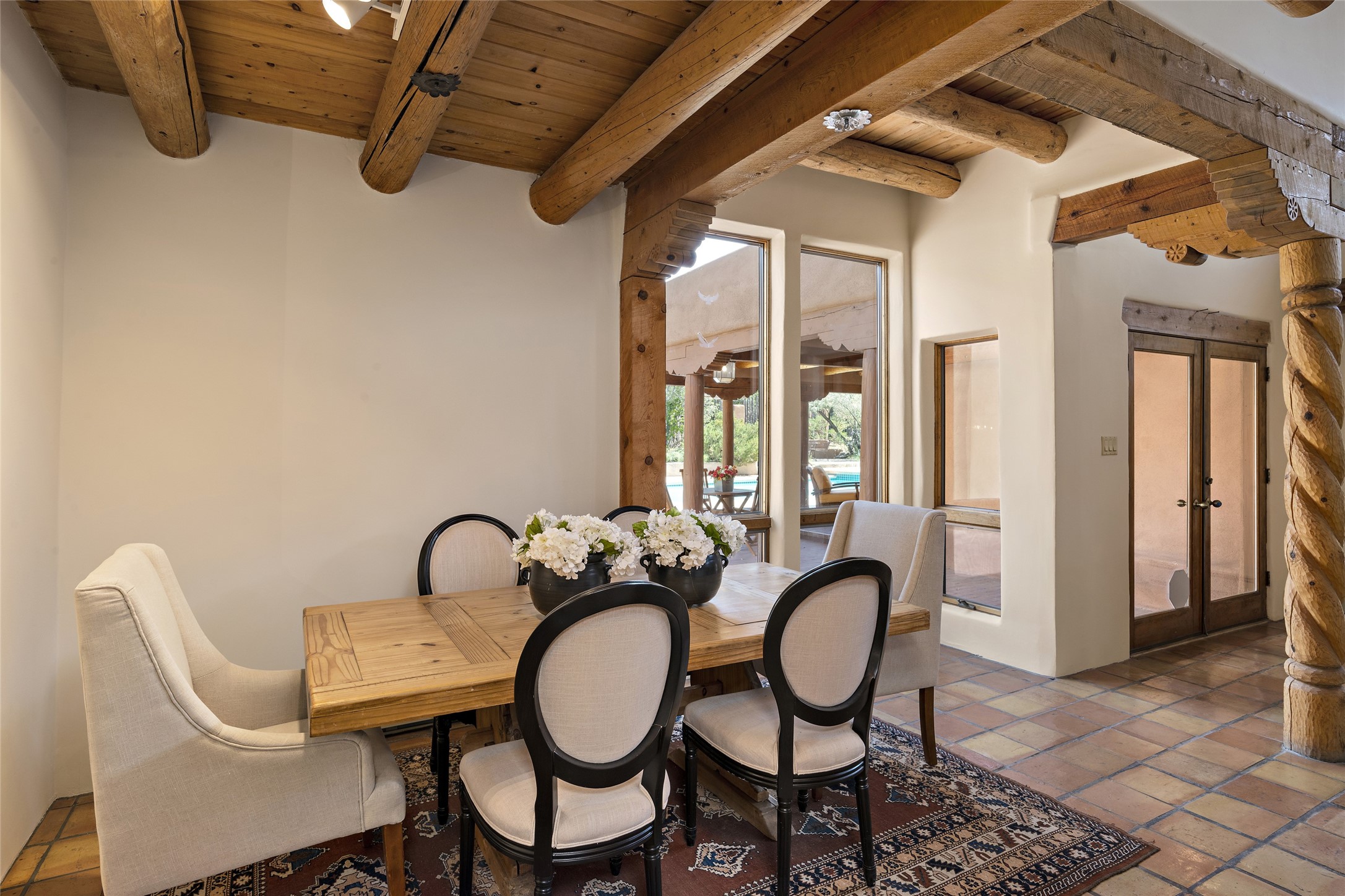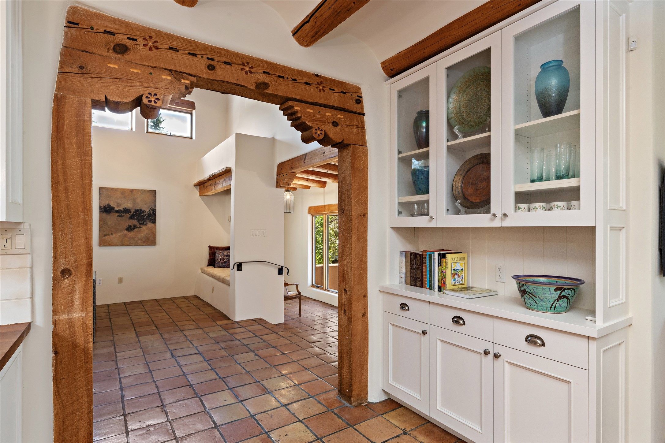 Embraced by lush, coyote-fenced grounds, this exquisite classic pueblo residence with casita and FOUR-CAR garaging, is an exceptional sanctuary. Abundant architectural details include vigas, beams, lintels and corbels with bullet carving & hand-painted accents, and rows of clerestory windows. The superb open concept design features a dramatic living room with soaring ceiling, track lighting, a fireplace flanked by deep, lighted alcoves with shelving, and French doors to the fabulous entertaining portal, pool area and mature trees & plantings. A generous dining area accesses the custom-designed chef's kitchen with breakfast & sitting/TV areas. An impressive private owner's suite bedroom boasts a high beamed ceiling, track lighting and kiva fireplace. The beautifully redesigned owner's bath and a private study have diamond plaster and in-floor radiant heat. A separate two-bedroom guest wing features a spacious high-walled courtyard with a gate to the pool & rear grounds. The delightful guest casita includes a high-ceilinged living room with fireplace, dining/office area, a bedroom and full bath. The 5 Daikon ductless mini-splits and a mini-split in the casita ensure year-round comfort. Situated just up the street from the storied Sol y Sombra estate, (owned by Georgia O'Keeffe; more recently by the late Paul Allen, co-founder of Microsoft), and within the Wood Gormley school district.
