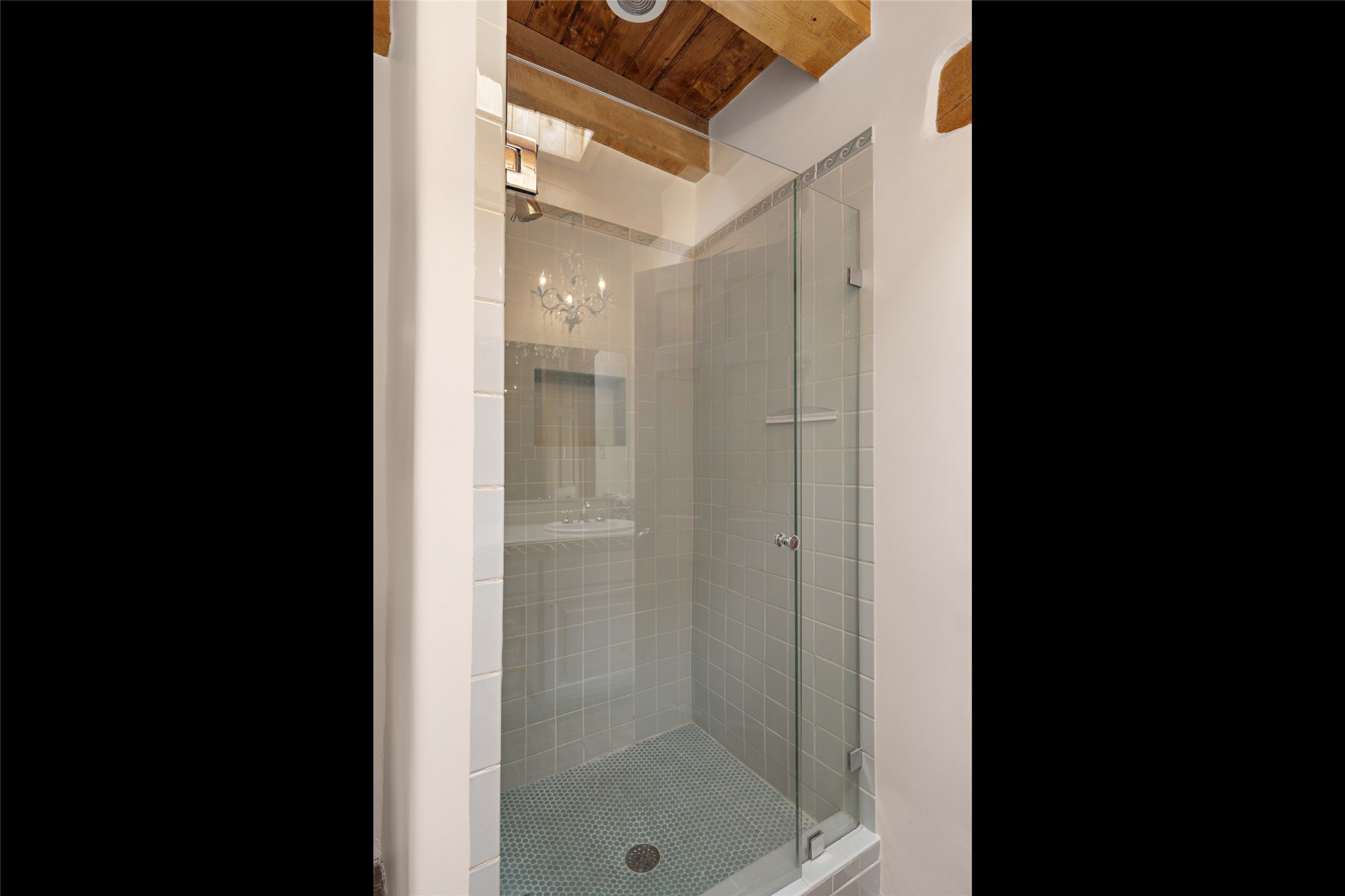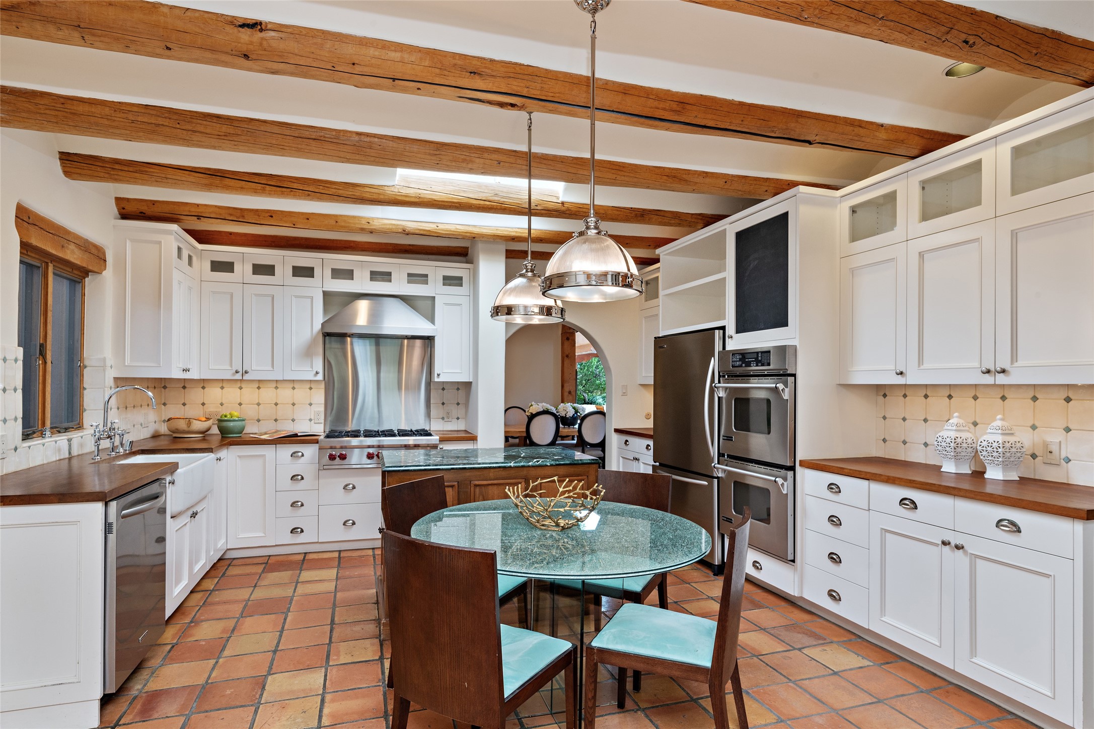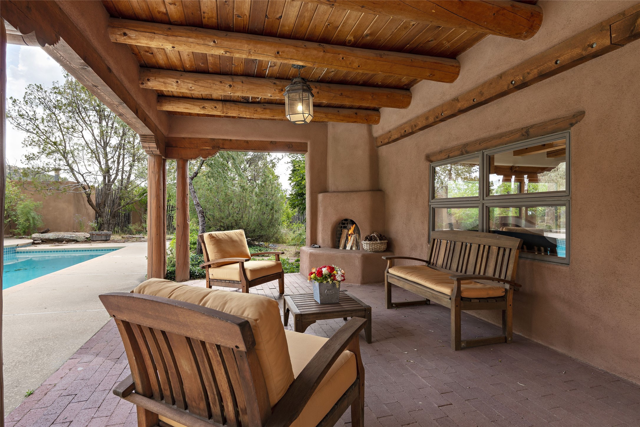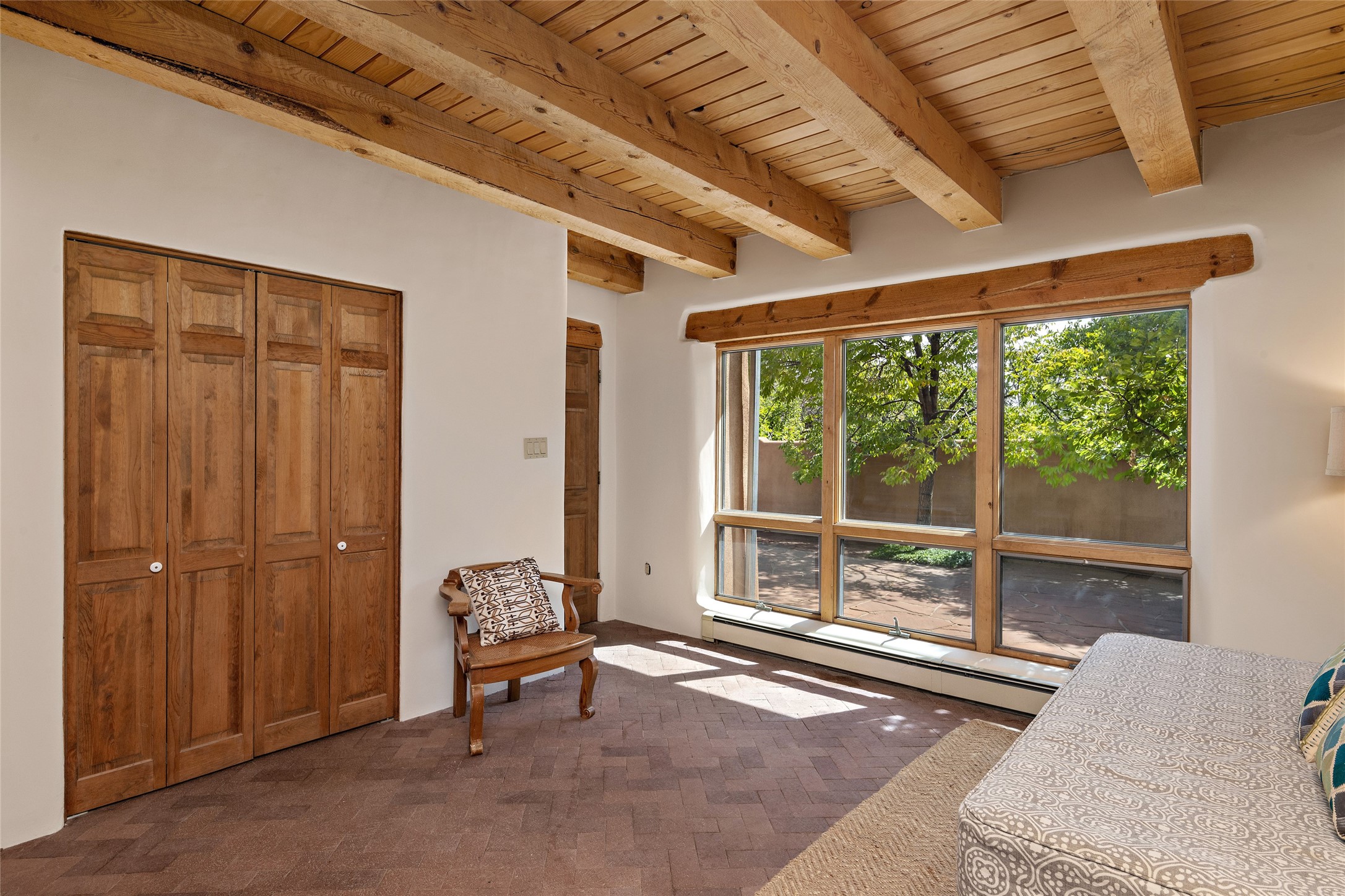 Embraced by lush, coyote-fenced grounds, this exquisite classic pueblo residence with casita and FOUR-CAR garaging, is an exceptional sanctuary. Abundant architectural details include vigas, beams, lintels and corbels with bullet carving & hand-painted accents, and rows of clerestory windows. The superb open concept design features a dramatic living room with soaring ceiling, track lighting, a fireplace flanked by deep, lighted alcoves with shelving, and French doors to the fabulous entertaining portal, pool area and mature trees & plantings. A generous dining area accesses the custom-designed chef's kitchen with breakfast & sitting/TV areas. An impressive private owner's suite bedroom boasts a high beamed ceiling, track lighting and kiva fireplace. The beautifully redesigned owner's bath and a private study have diamond plaster and in-floor radiant heat. A separate two-bedroom guest wing features a spacious high-walled courtyard with a gate to the pool & rear grounds. The delightful guest casita includes a high-ceilinged living room with fireplace, dining/office area, a bedroom and full bath. The 5 Daikon ductless mini-splits and a mini-split in the casita ensure year-round comfort. Situated just up the street from the storied Sol y Sombra estate, (owned by Georgia O'Keeffe; more recently by the late Paul Allen, co-founder of Microsoft), and within the Wood Gormley school district.