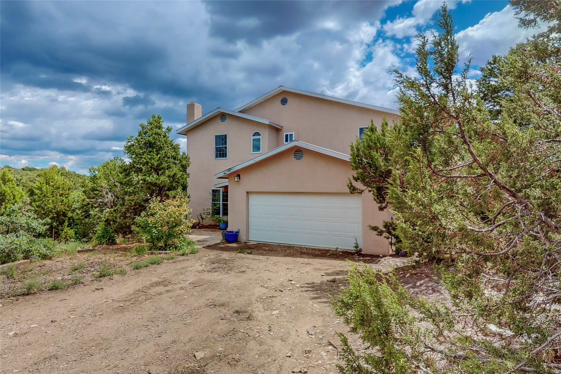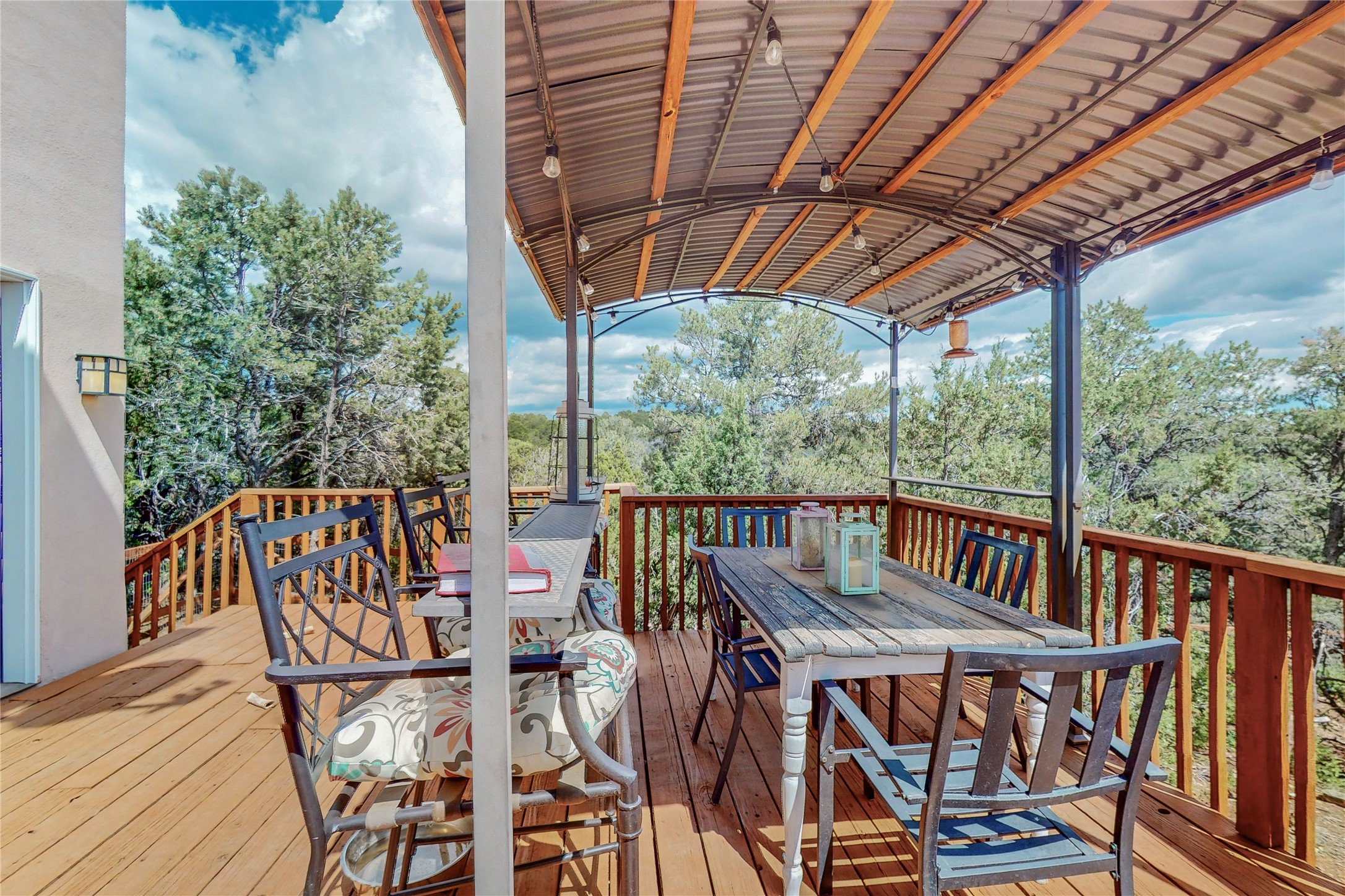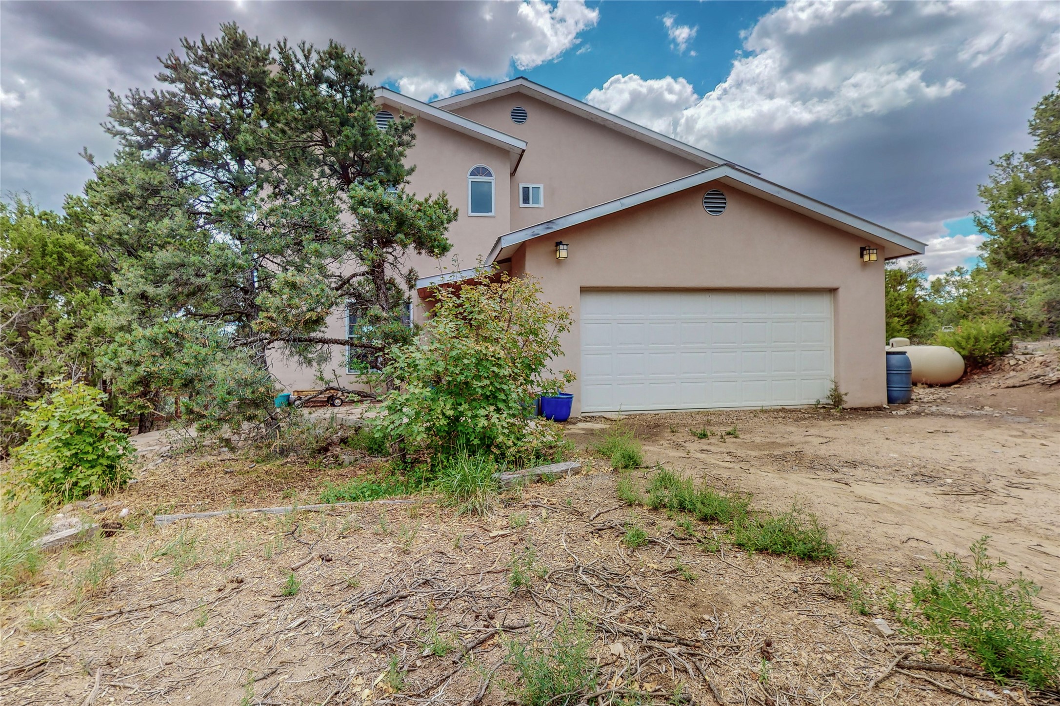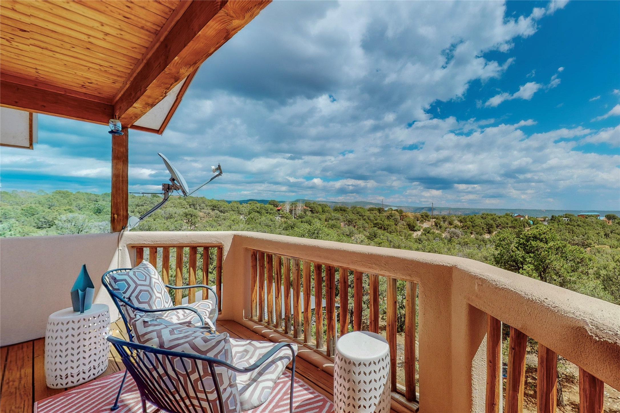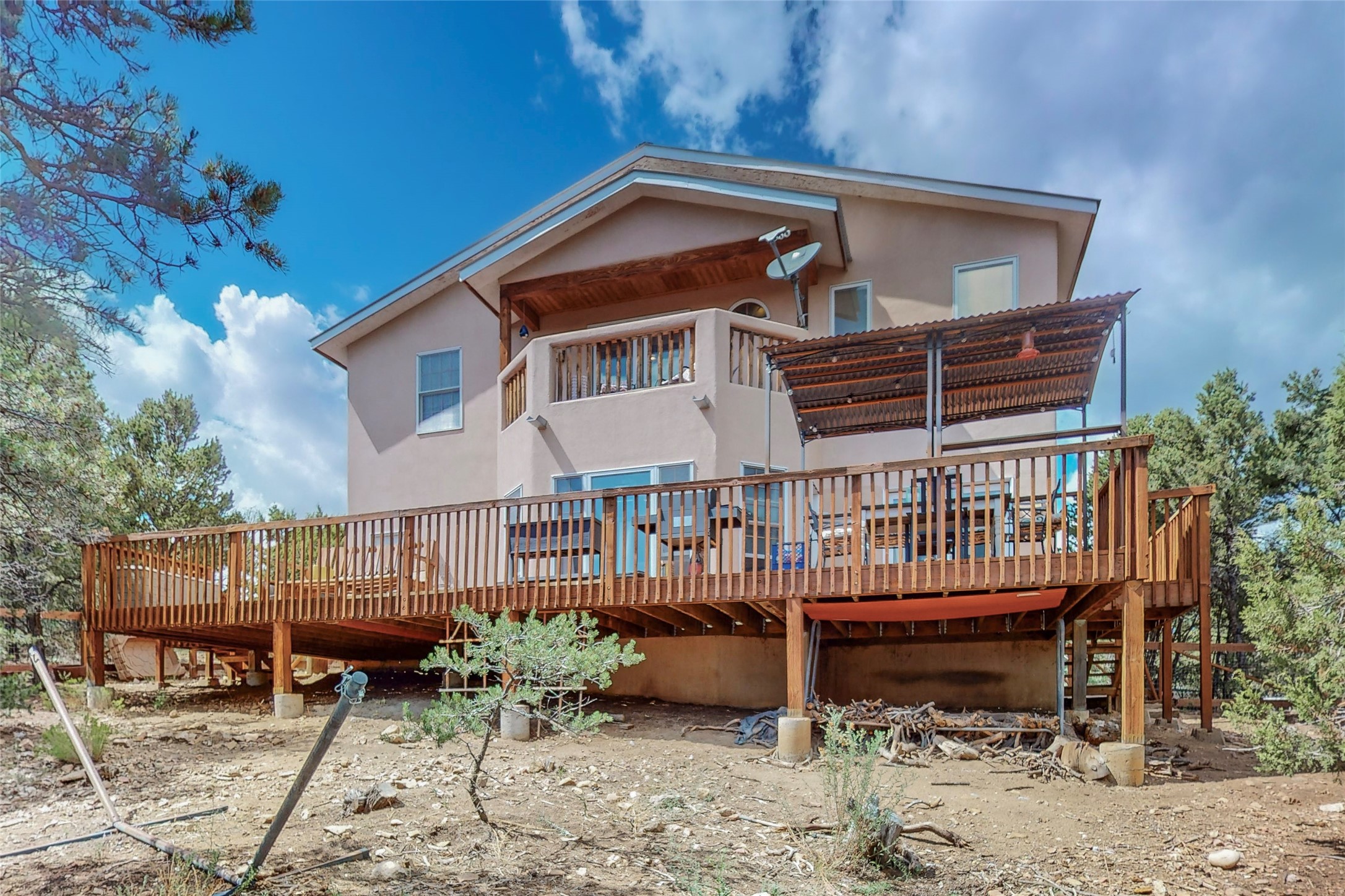One owner home offered for sale. Located on 5 wooded acres 88 Apache Ridge is sited back from the main access road and has much to offer Buyers. The 2 story house contains 3 bedrooms, 2 full and bath, oversize direct entry garage and a bonus room. The lower level has open concept living/dining room leading to a cooks kitchen. The bath and bonus room which has 2 entries - one to the backyard and one to the garage would be great as either a studio or workshop. The upper level is reached from a wooden stairway to a loft area with oak flooring, shelves for a library, and French doors leaking to a viewing deck. The owners suite has a kiva fireplace, separate shower, jetted tub and walk-in closet. 2 additional bedrooms and a full bath complete this floor. The property includes a private well, expansive rear deck, designated garden space, and storage shed. Additional features include vigas and beams, cove ceiling inliving room, pitched Fabral metal roof, cedar lined closets, refrigerated air conditioning new (spring 2023), Navien heating system, and 2nd kiva fireplace in the living room. Owner's on Apache Ridge pay $200 per year for road maintenance. For folks seeking a beautiful home 20 minutes from Santa Fe 88 Apache Ridge could be the place for you.