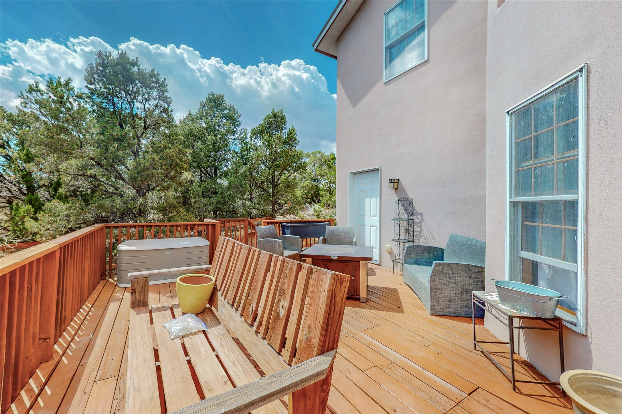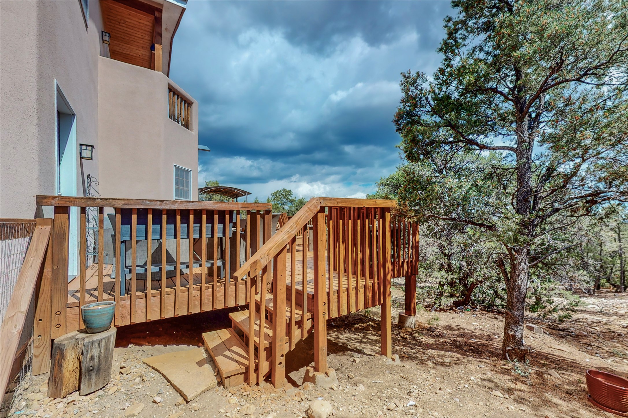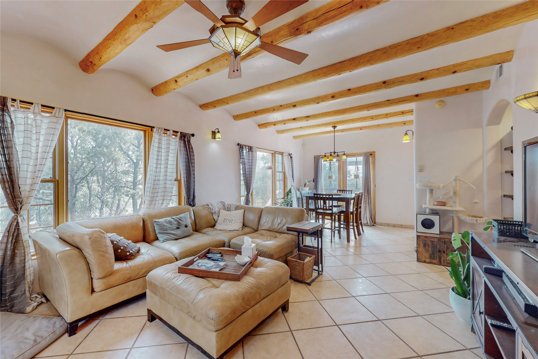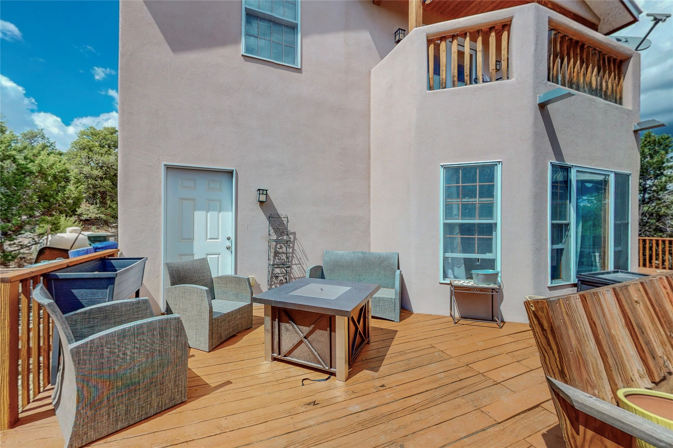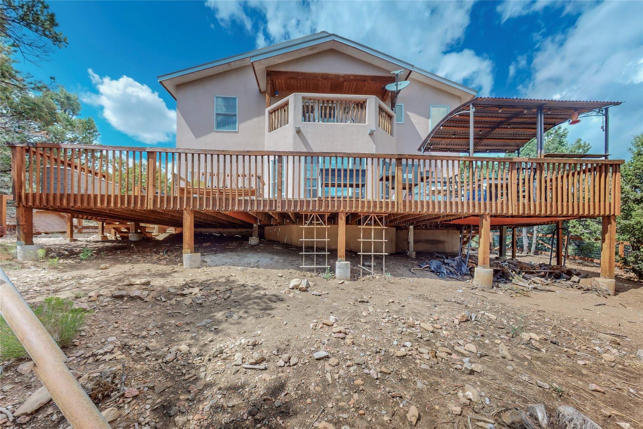 One owner home offered for sale. Located on 5 wooded acres 88 Apache Ridge is sited back from the main access road and has much to offer Buyers. The 2 story house contains 3 bedrooms, 2 full and bath, oversize direct entry garage and a bonus room. The lower level has open concept living/dining room leading to a cooks kitchen. The bath and bonus room which has 2 entries - one to the backyard and one to the garage would be great as either a studio or workshop. The upper level is reached from a wooden stairway to a loft area with oak flooring, shelves for a library, and French doors leaking to a viewing deck. The owners suite has a kiva fireplace, separate shower, jetted tub and walk-in closet. 2 additional bedrooms and a full bath complete this floor. The property includes a private well, expansive rear deck, designated garden space, and storage shed. Additional features include vigas and beams, cove ceiling inliving room, pitched Fabral metal roof, cedar lined closets, refrigerated air conditioning new (spring 2023), Navien heating system, and 2nd kiva fireplace in the living room. Owner's on Apache Ridge pay $200 per year for road maintenance. For folks seeking a beautiful home 20 minutes from Santa Fe 88 Apache Ridge could be the place for you.