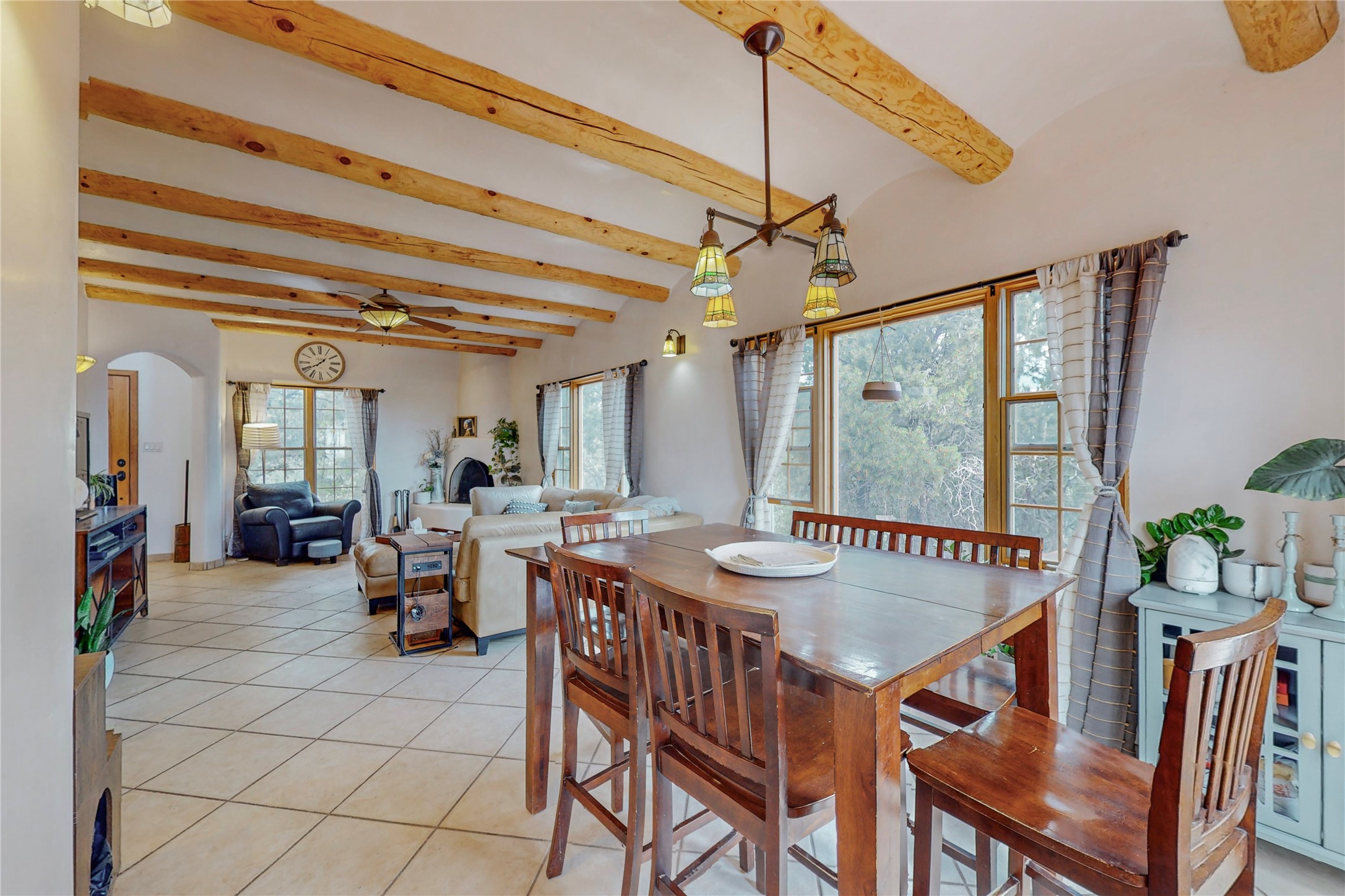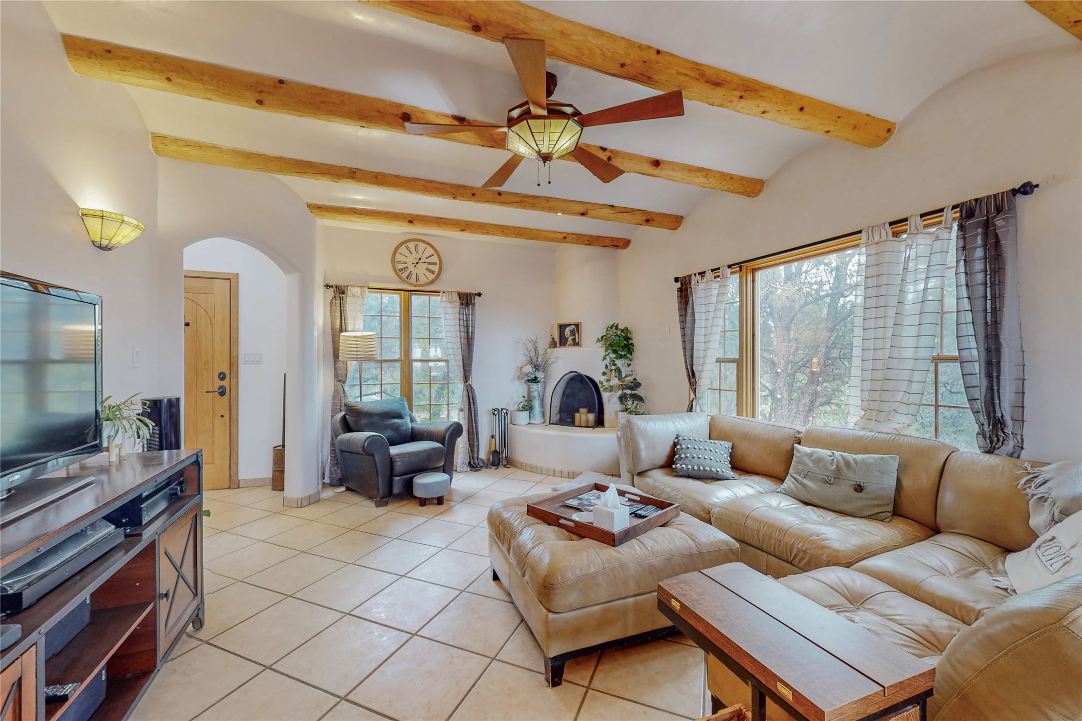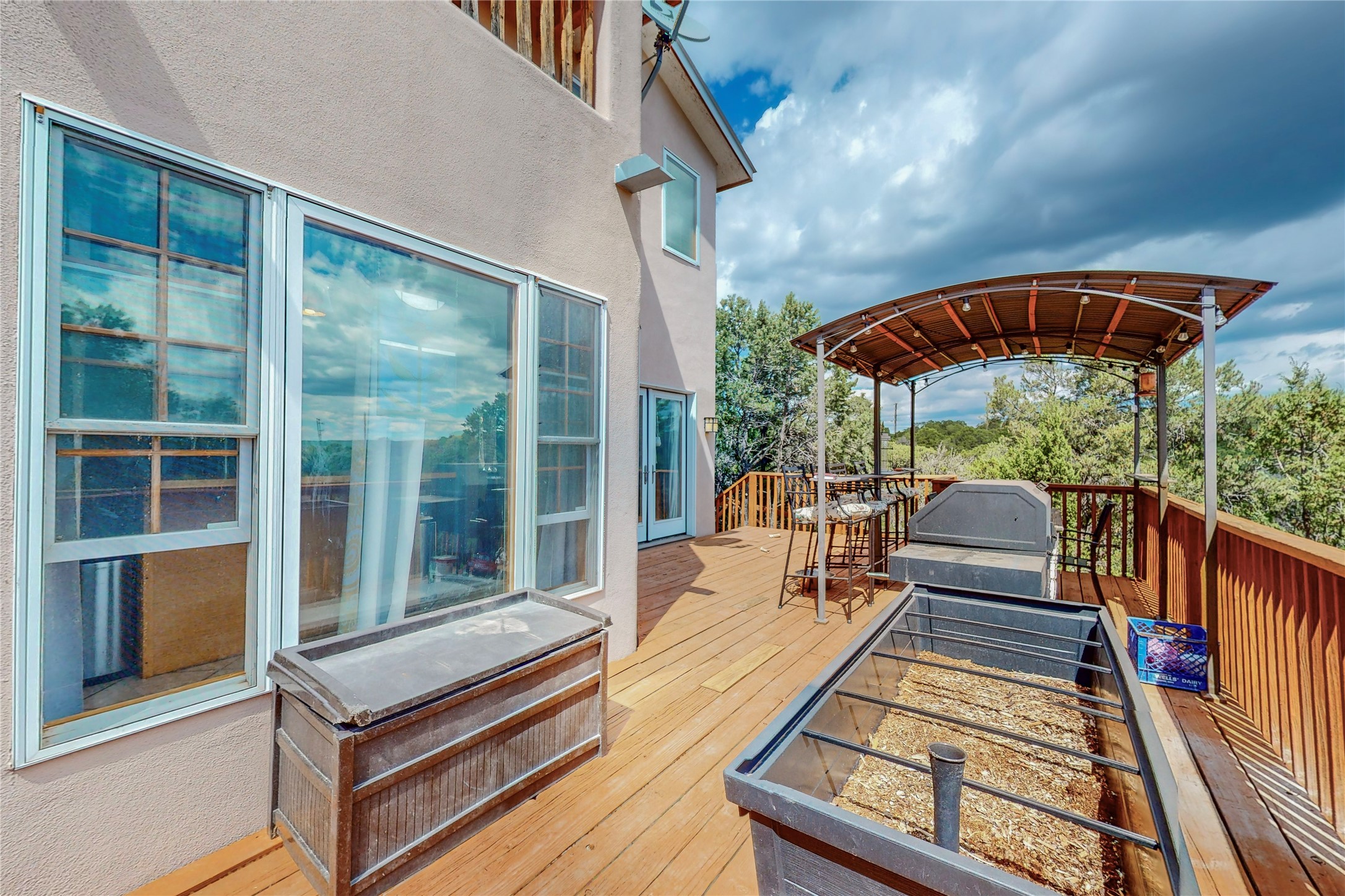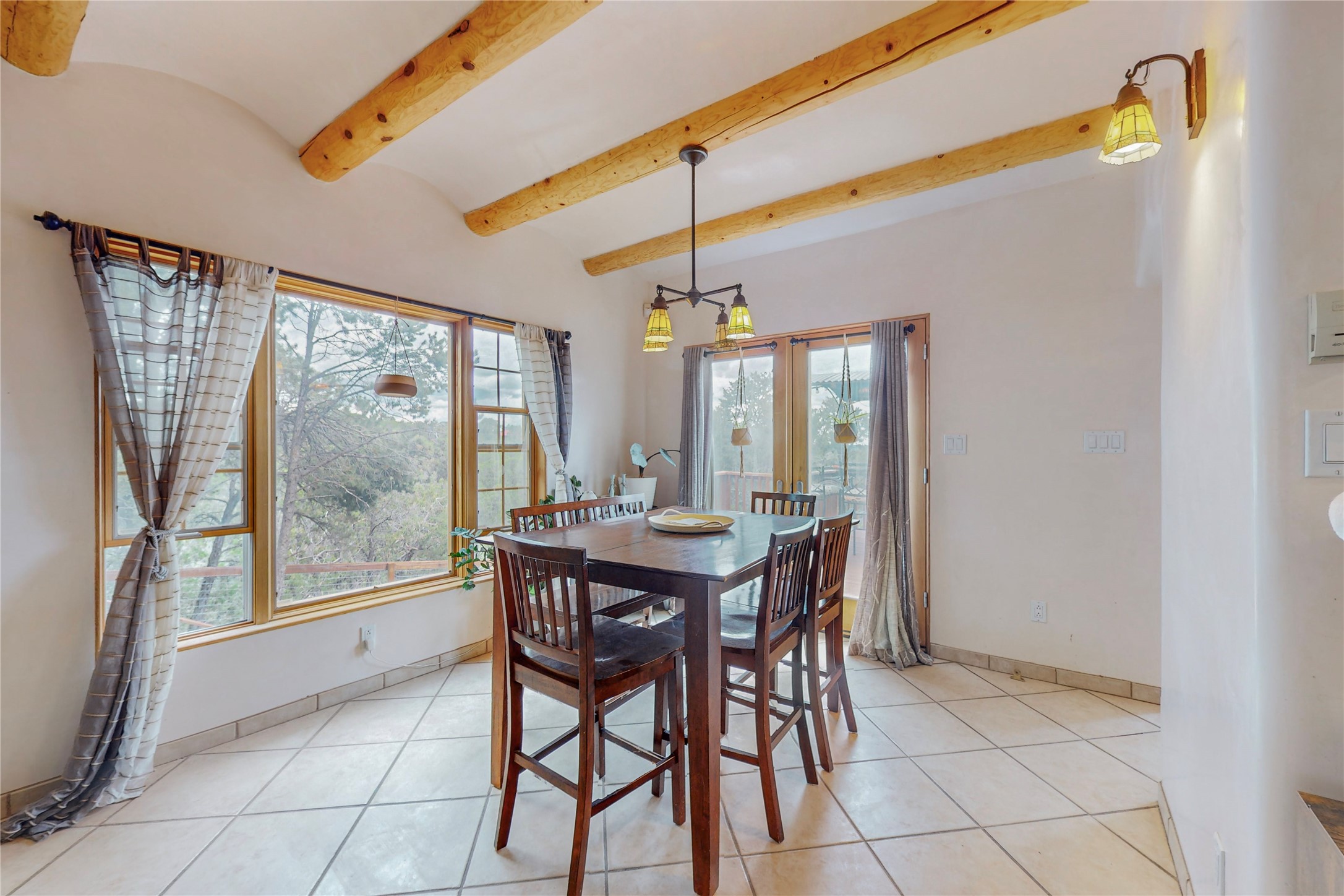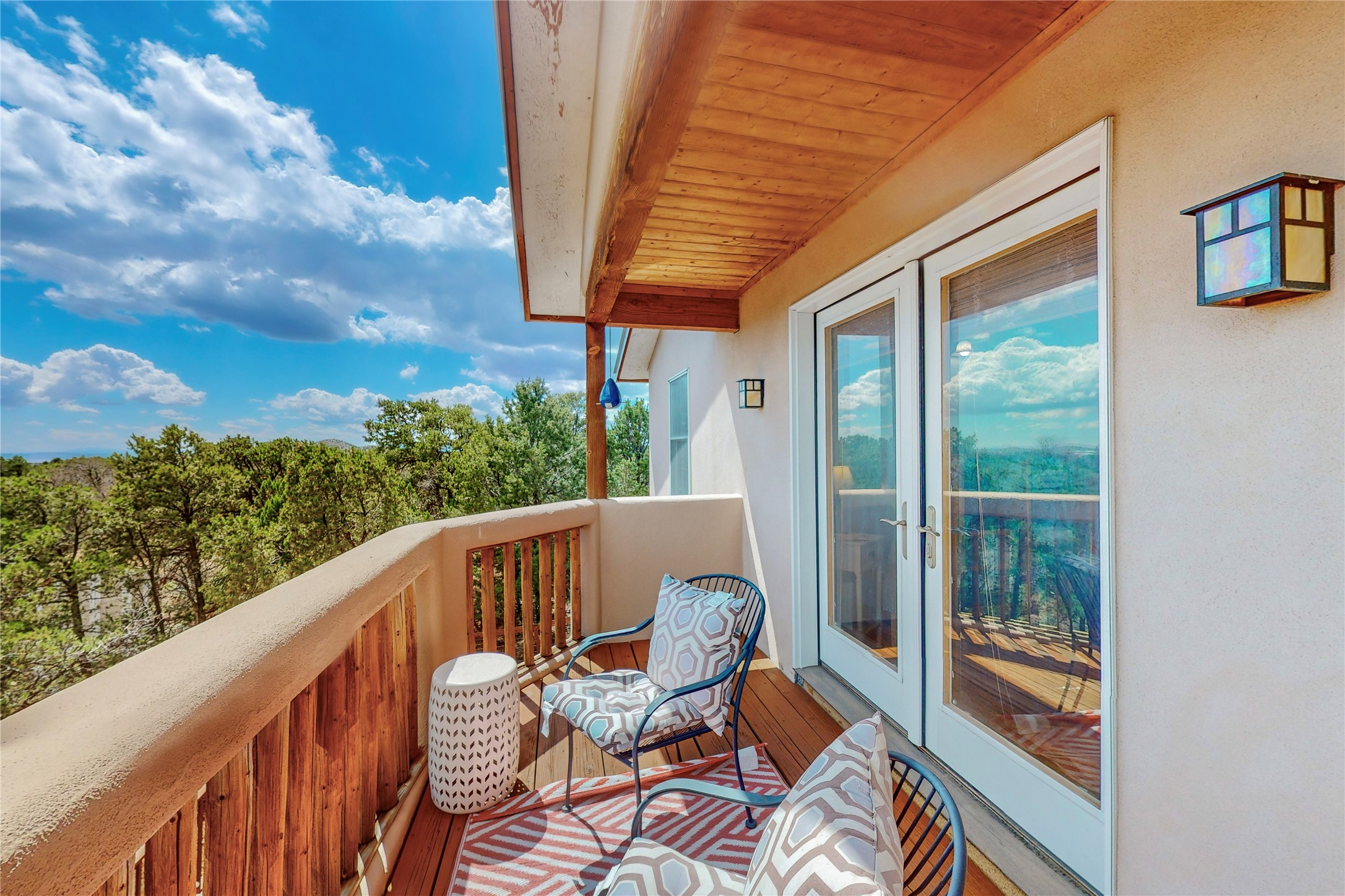 One owner home offered for sale. Located on 5 wooded acres 88 Apache Ridge is sited back from the main access road and has much to offer Buyers. The 2 story house contains 3 bedrooms, 2 full and bath, oversize direct entry garage and a bonus room. The lower level has open concept living/dining room leading to a cooks kitchen. The bath and bonus room which has 2 entries - one to the backyard and one to the garage would be great as either a studio or workshop. The upper level is reached from a wooden stairway to a loft area with oak flooring, shelves for a library, and French doors leaking to a viewing deck. The owners suite has a kiva fireplace, separate shower, jetted tub and walk-in closet. 2 additional bedrooms and a full bath complete this floor. The property includes a private well, expansive rear deck, designated garden space, and storage shed. Additional features include vigas and beams, cove ceiling inliving room, pitched Fabral metal roof, cedar lined closets, refrigerated air conditioning new (spring 2023), Navien heating system, and 2nd kiva fireplace in the living room. Owner's on Apache Ridge pay $200 per year for road maintenance. For folks seeking a beautiful home 20 minutes from Santa Fe 88 Apache Ridge could be the place for you.