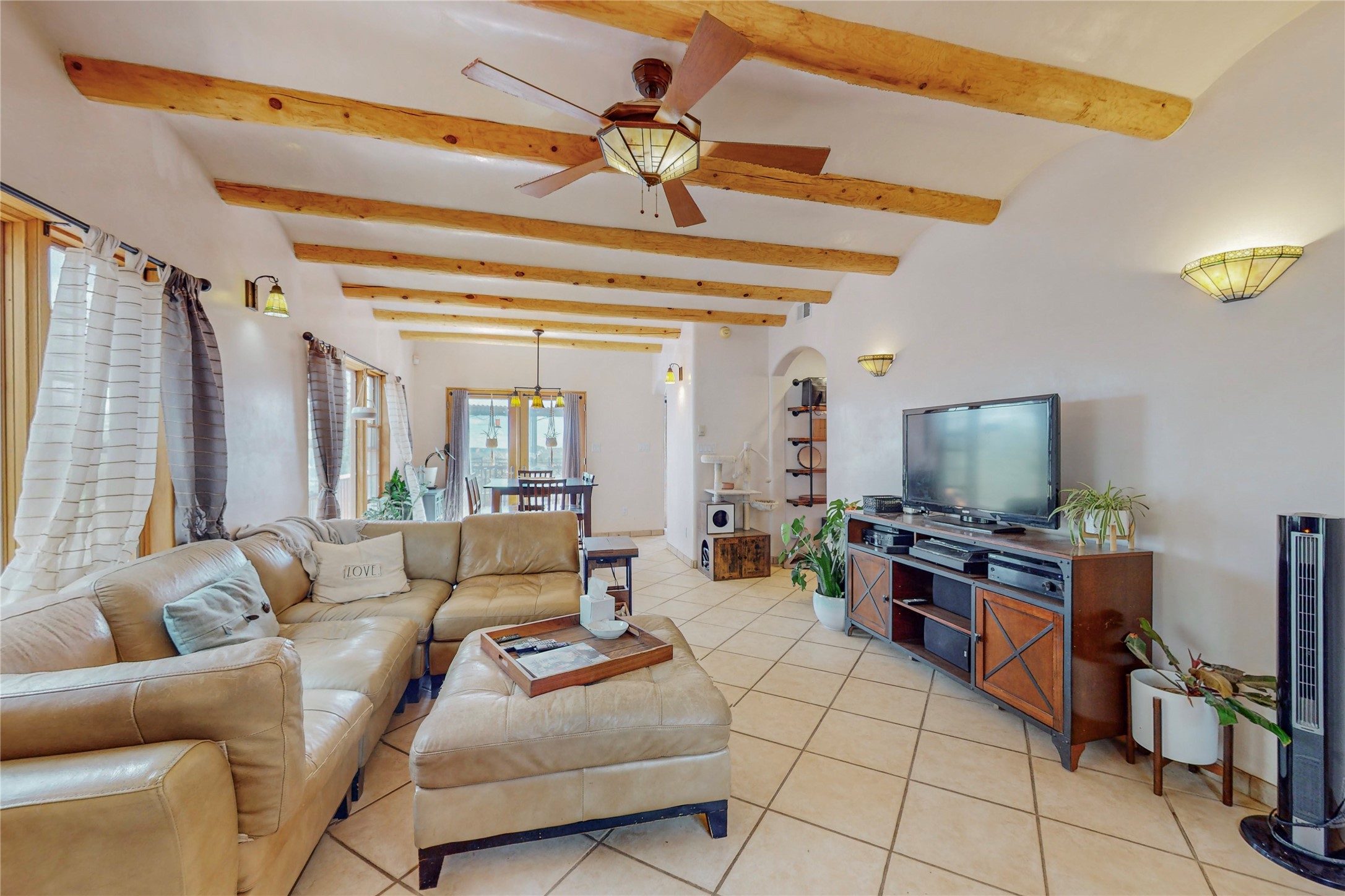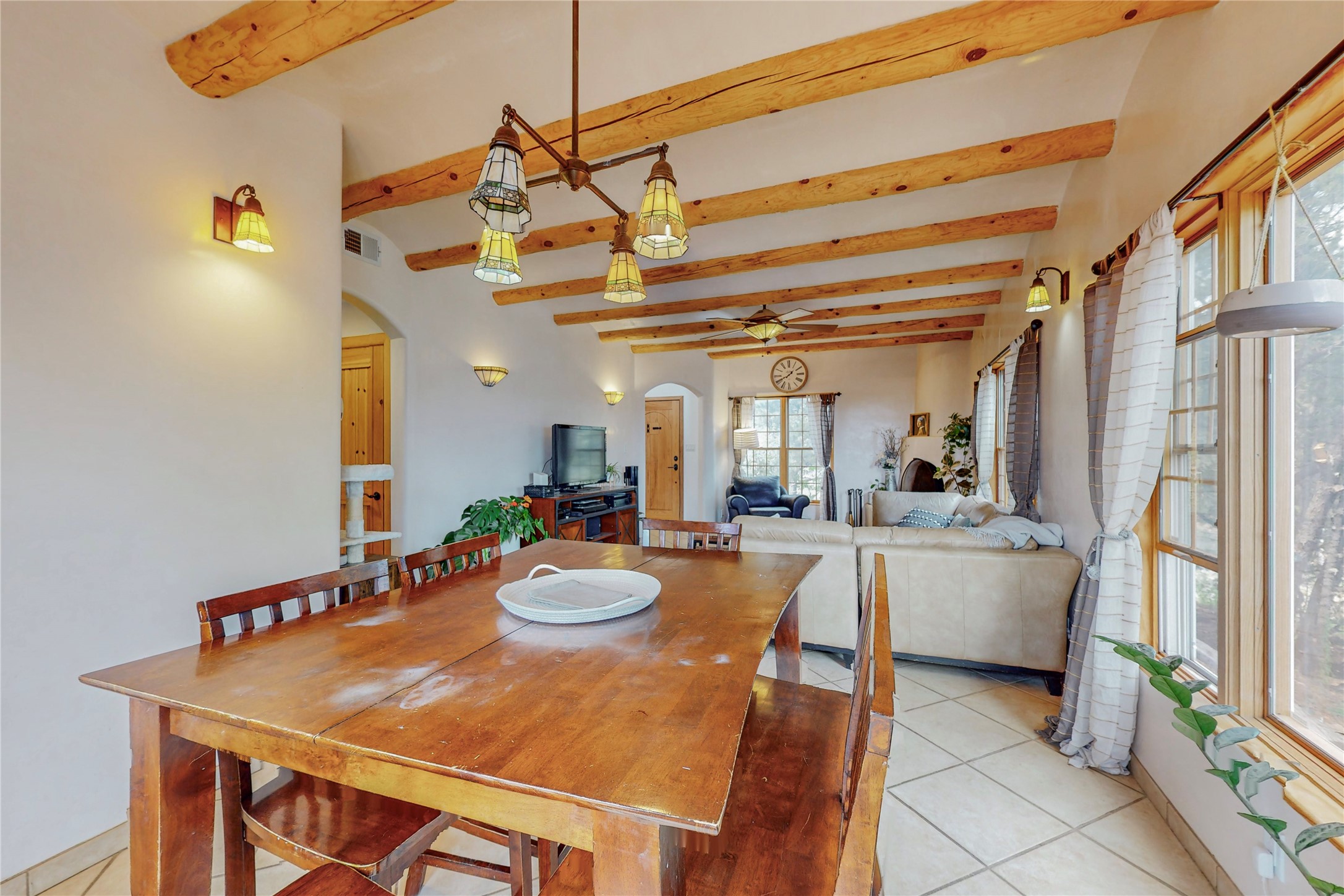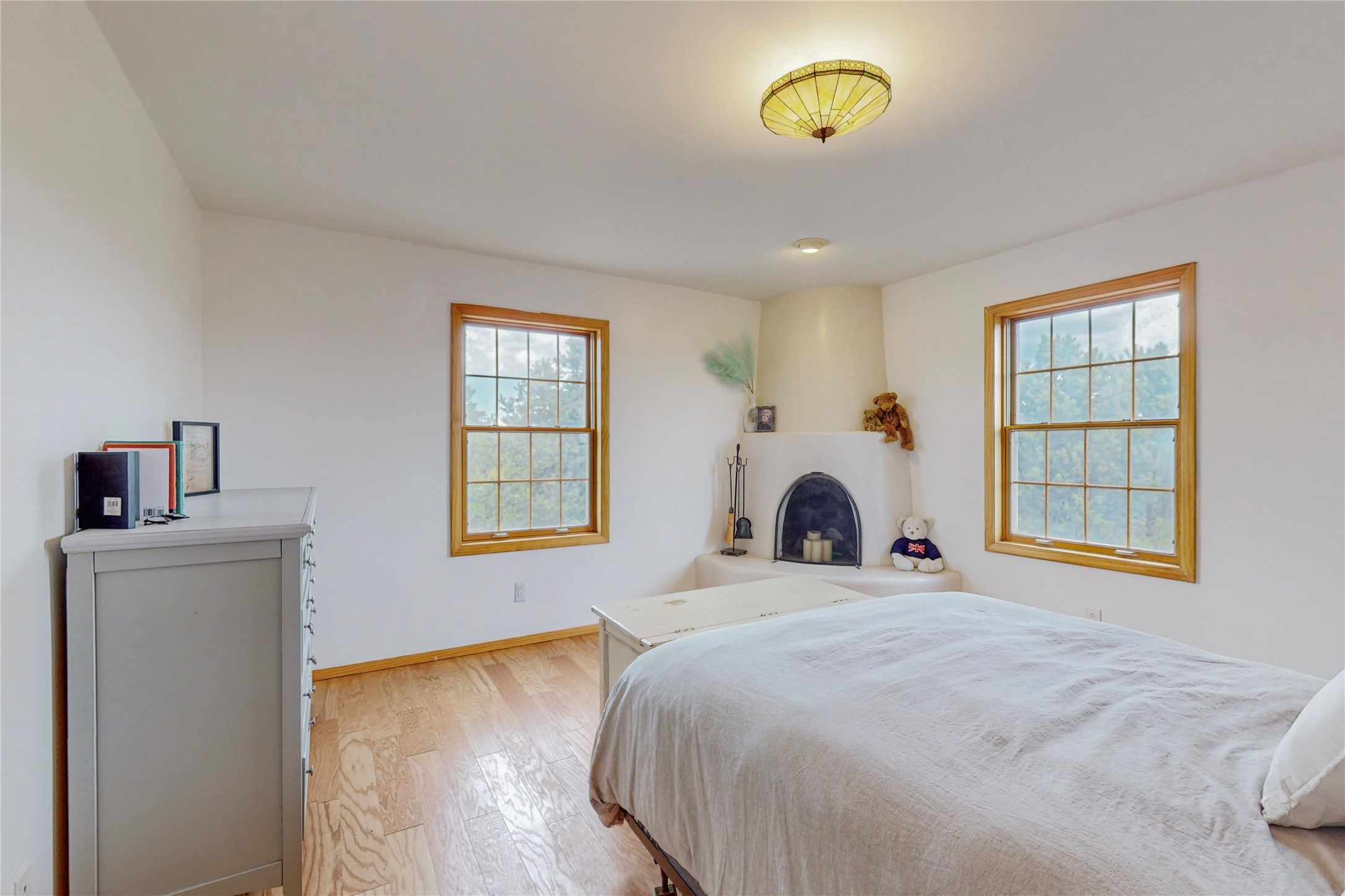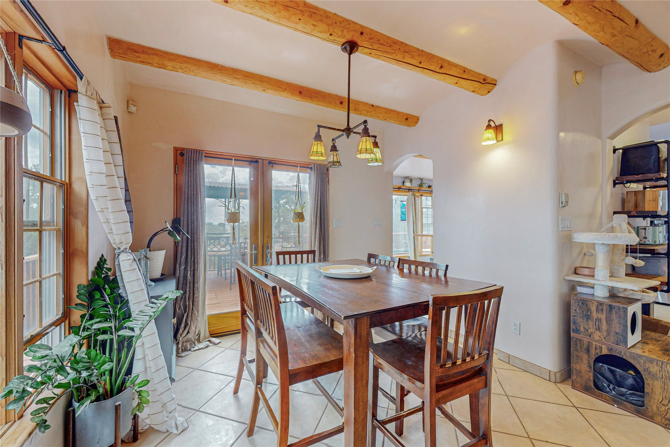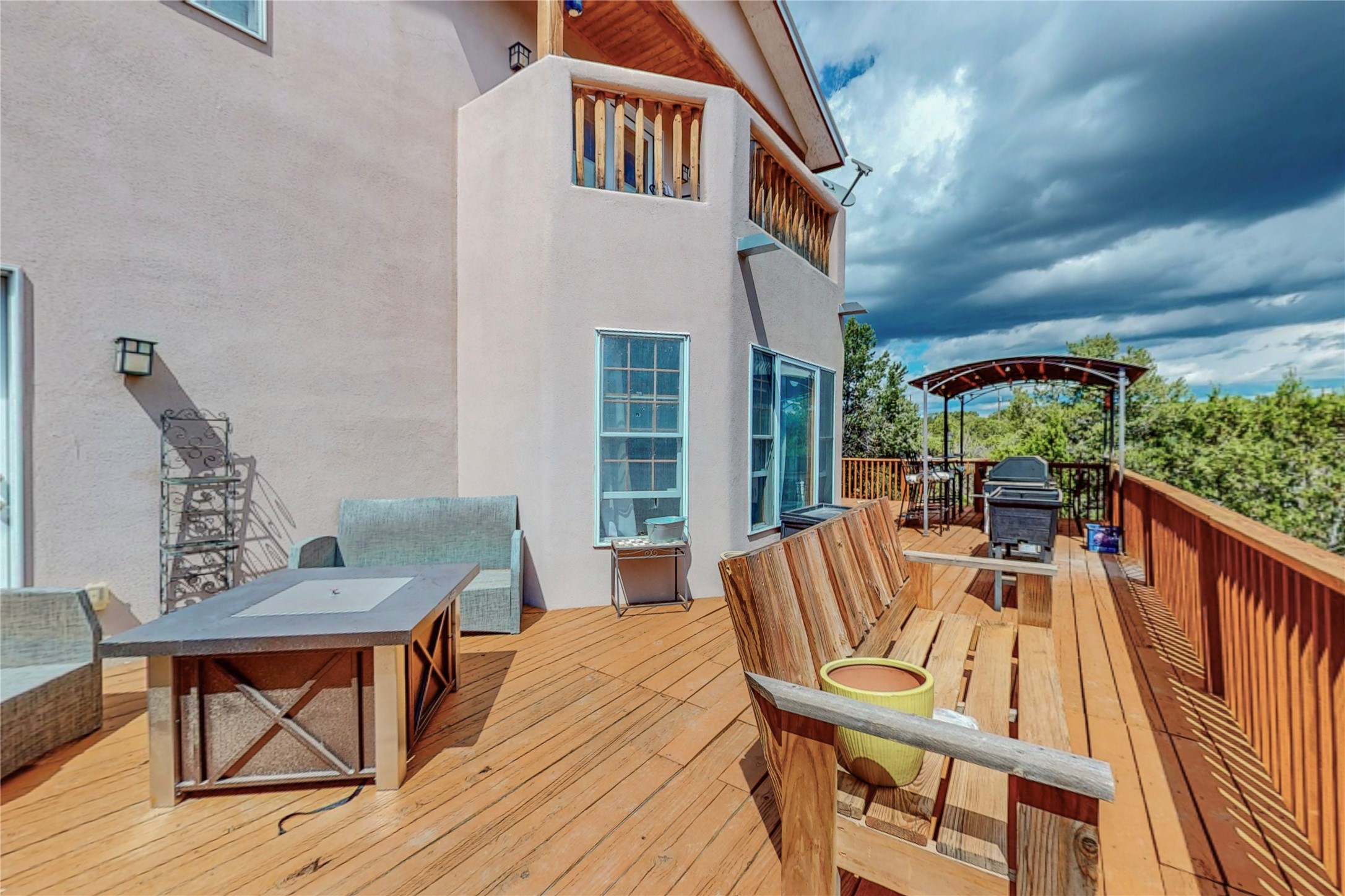 One owner home offered for sale. Located on 5 wooded acres 88 Apache Ridge is sited back from the main access road and has much to offer Buyers. The 2 story house contains 3 bedrooms, 2 full and bath, oversize direct entry garage and a bonus room. The lower level has open concept living/dining room leading to a cooks kitchen. The bath and bonus room which has 2 entries - one to the backyard and one to the garage would be great as either a studio or workshop. The upper level is reached from a wooden stairway to a loft area with oak flooring, shelves for a library, and French doors leaking to a viewing deck. The owners suite has a kiva fireplace, separate shower, jetted tub and walk-in closet. 2 additional bedrooms and a full bath complete this floor. The property includes a private well, expansive rear deck, designated garden space, and storage shed. Additional features include vigas and beams, cove ceiling inliving room, pitched Fabral metal roof, cedar lined closets, refrigerated air conditioning new (spring 2023), Navien heating system, and 2nd kiva fireplace in the living room. Owner's on Apache Ridge pay $200 per year for road maintenance. For folks seeking a beautiful home 20 minutes from Santa Fe 88 Apache Ridge could be the place for you.