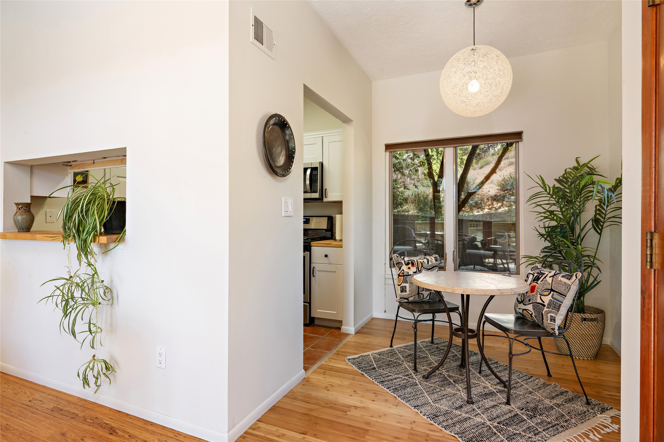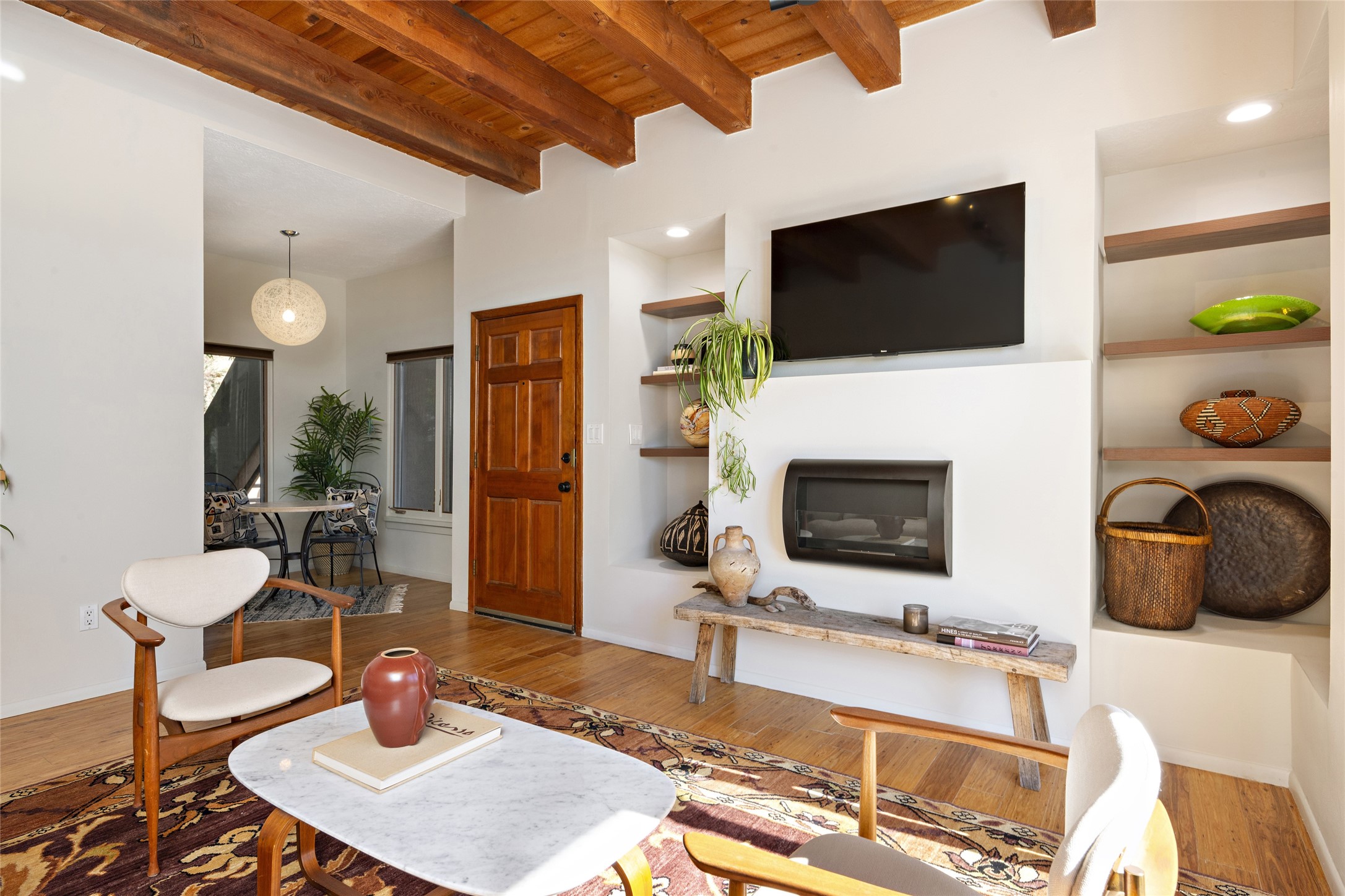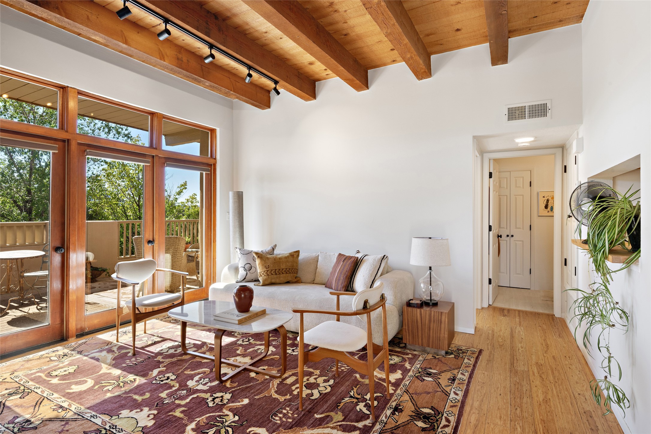 What is not to like about this crisp, compact, newly refurbished condominium in a superb location just minutes from the heart of Santa Fe? At the end unit of the Vieto del Norte complex, the sweet home enjoys the advantage of no neighbors on the north side; hence, more windows for better light and extra views. A bright interior flows seamlessly into the large balcony off both the living room and bedroom, nearly doubling the enjoyable space for entertaining and peaceful relaxation. Wood floors, plank and square cut beam ceilings, and wood frame glass paned doors offer a handsome counterpoint to the lighter touch given to the rest of the dcor. The kitchen and dining spaces are cozy yet fully functional with renovated shelves and countertops as well as new appliances. The bathroom has been completely renovated and the space maximized by installing a large reach-in closet. A stacked washer/dryer lives in the kitchen pantry/storage closet and a downstairs garage provides room for one vehicle and additional storage. A perfect home for quick and easy access to all of Santa Fe's special summer fairs and festivals and an equally easy spot to languish in after long winter days spent at the ski basin. Whether looking for an easy seasonal foothold in Santa Fe, a profitable rental property, or a charming carefree home in a prime part of Santa Fe, this special unit should not be missed.