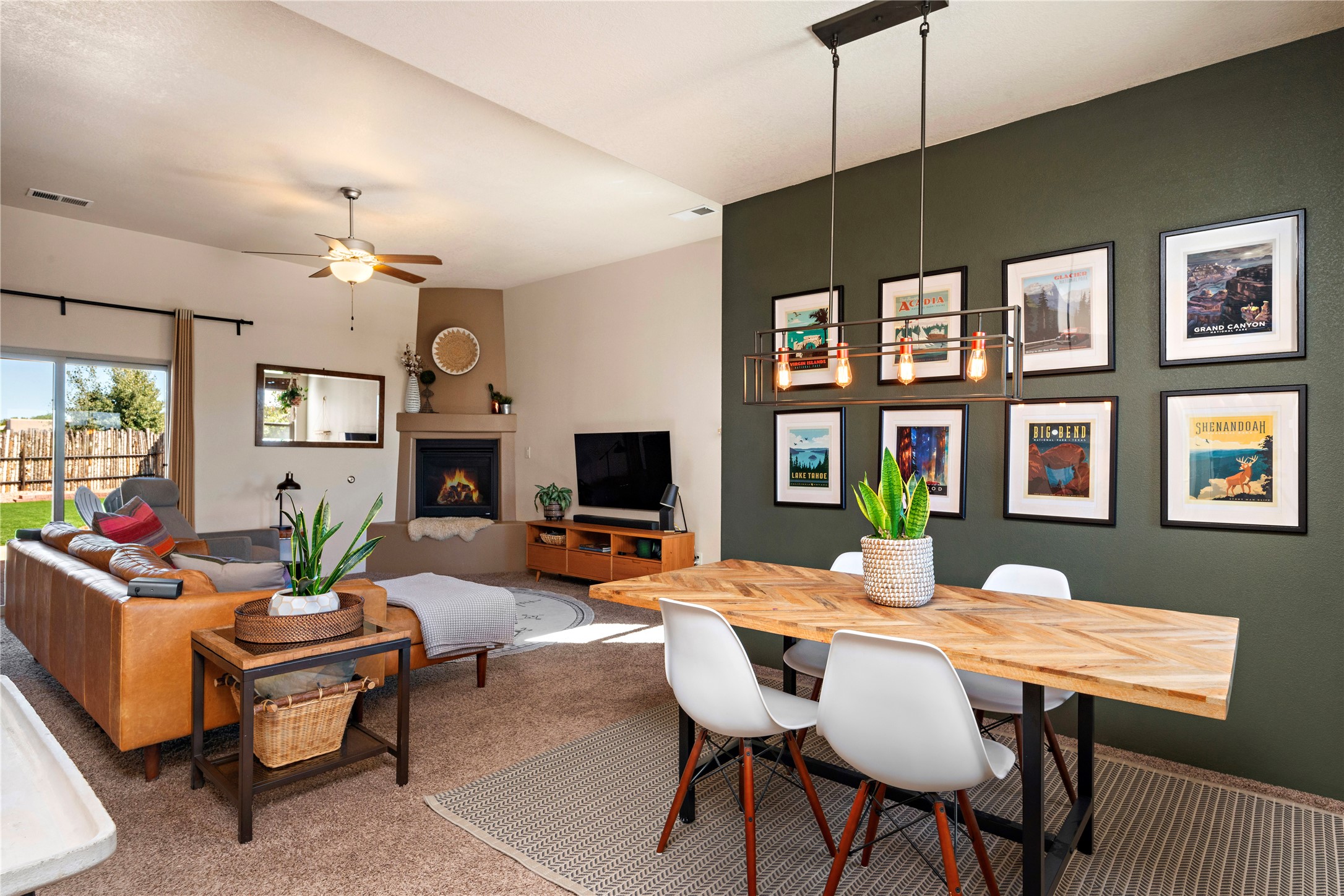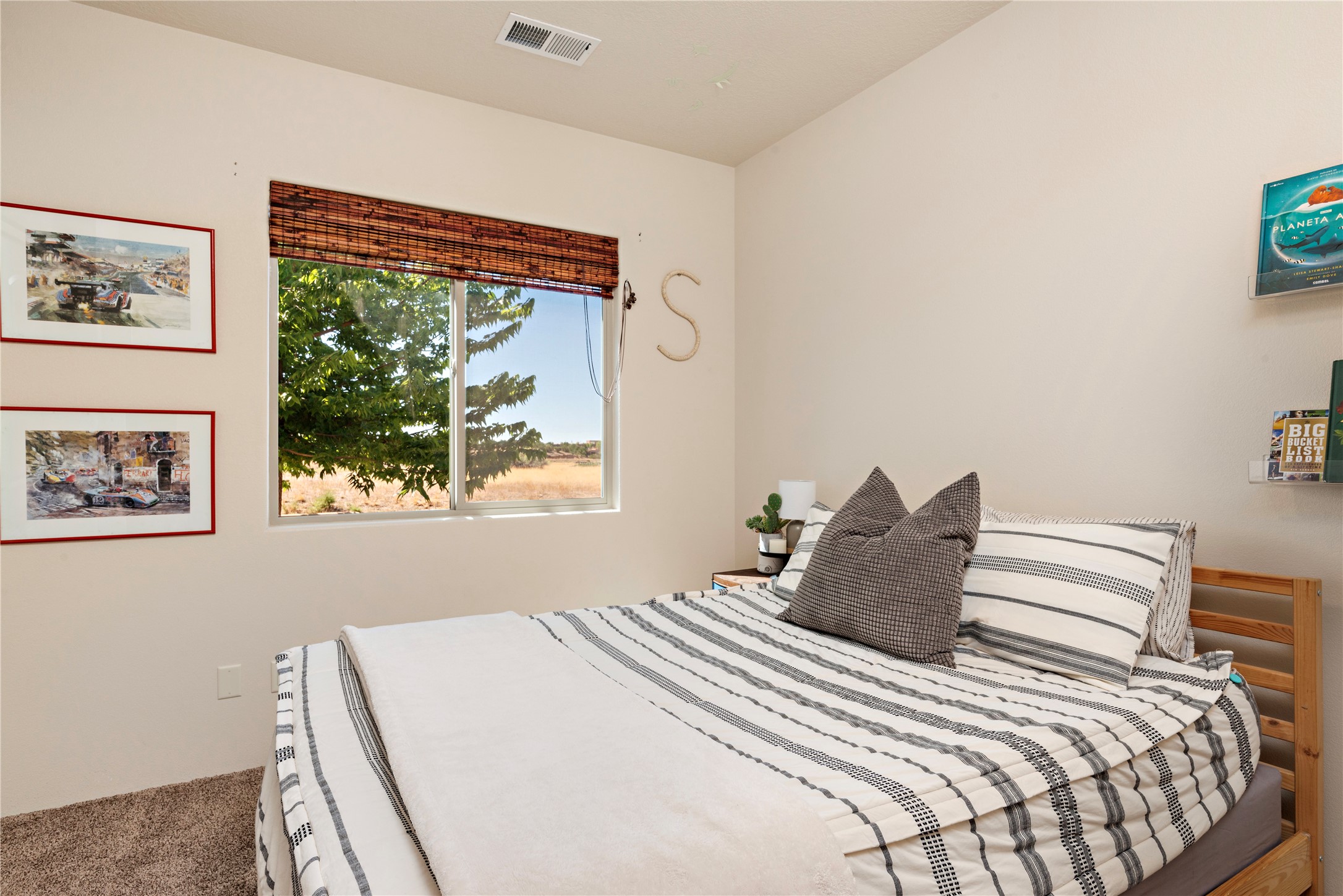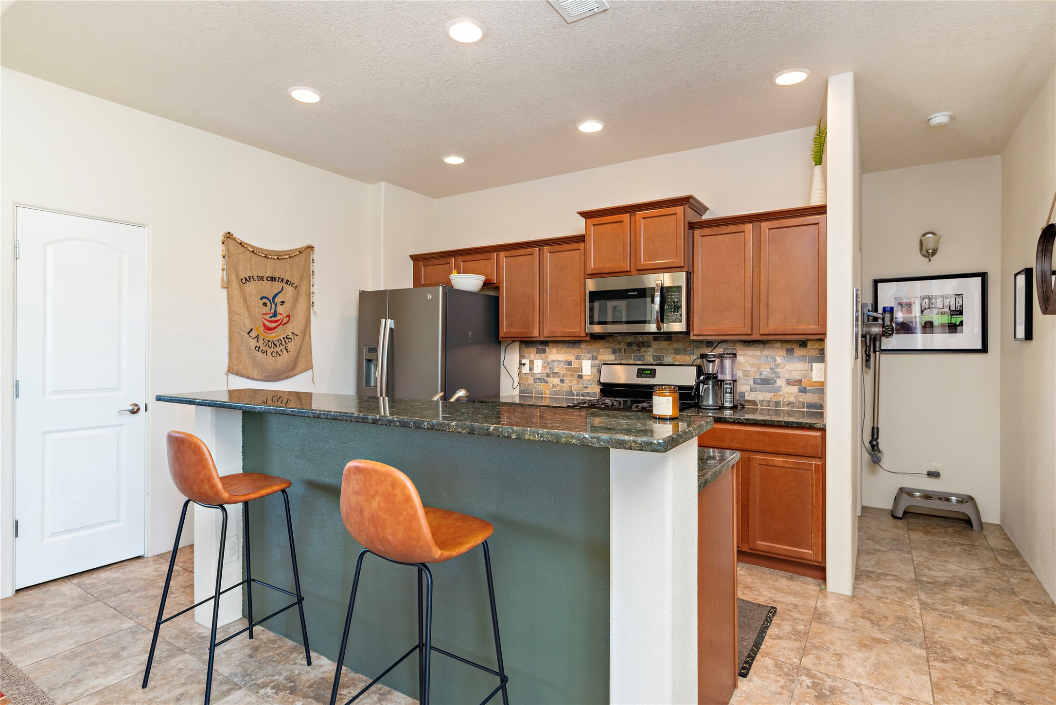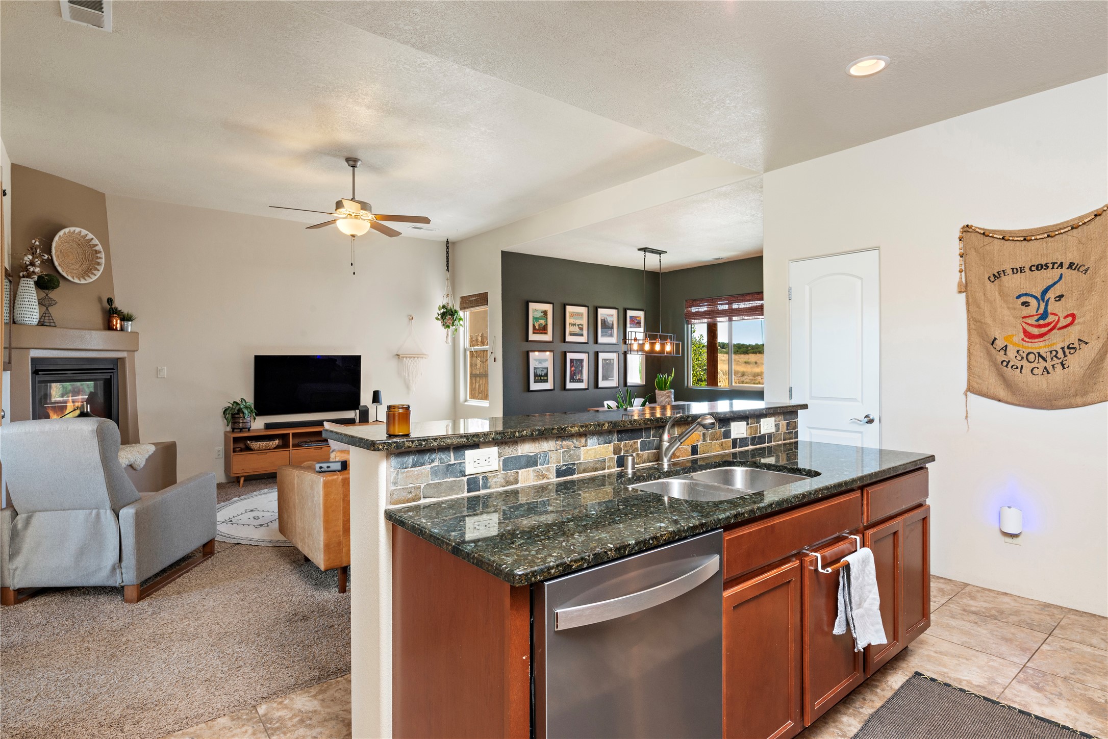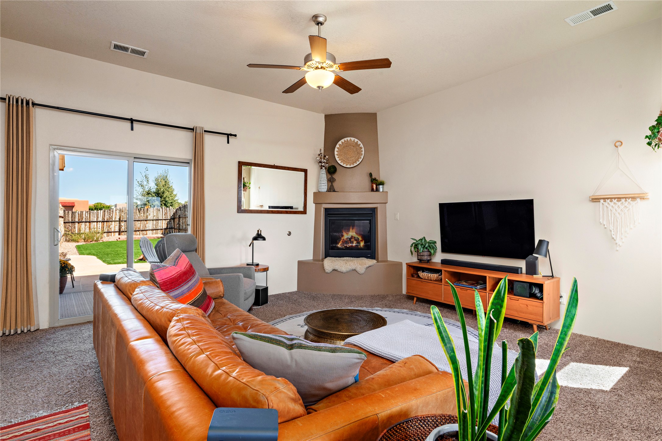 This wonderful 3 bedroom, 2 bath home in Oshara Village was built in 2018. Open living and dining area, with a lovely kitchen with granite countertops and stainless steel appliances. The master bedroom is nicely separated from the other two bedrooms. Two full bathrooms with tile and granite countertops. The backyard has a flagstone patio with portal, landscaped yard with turf, and latilla fencing creating a private space to relax and unwind in. Alley entrance leads to two car attached garage. Located centrally in Santa Fe, close to shopping, restaurants, schools, including the Santa Fe Community College, and the Genoveva Chavez Center. Make this your place to call home in Santa Fe!
