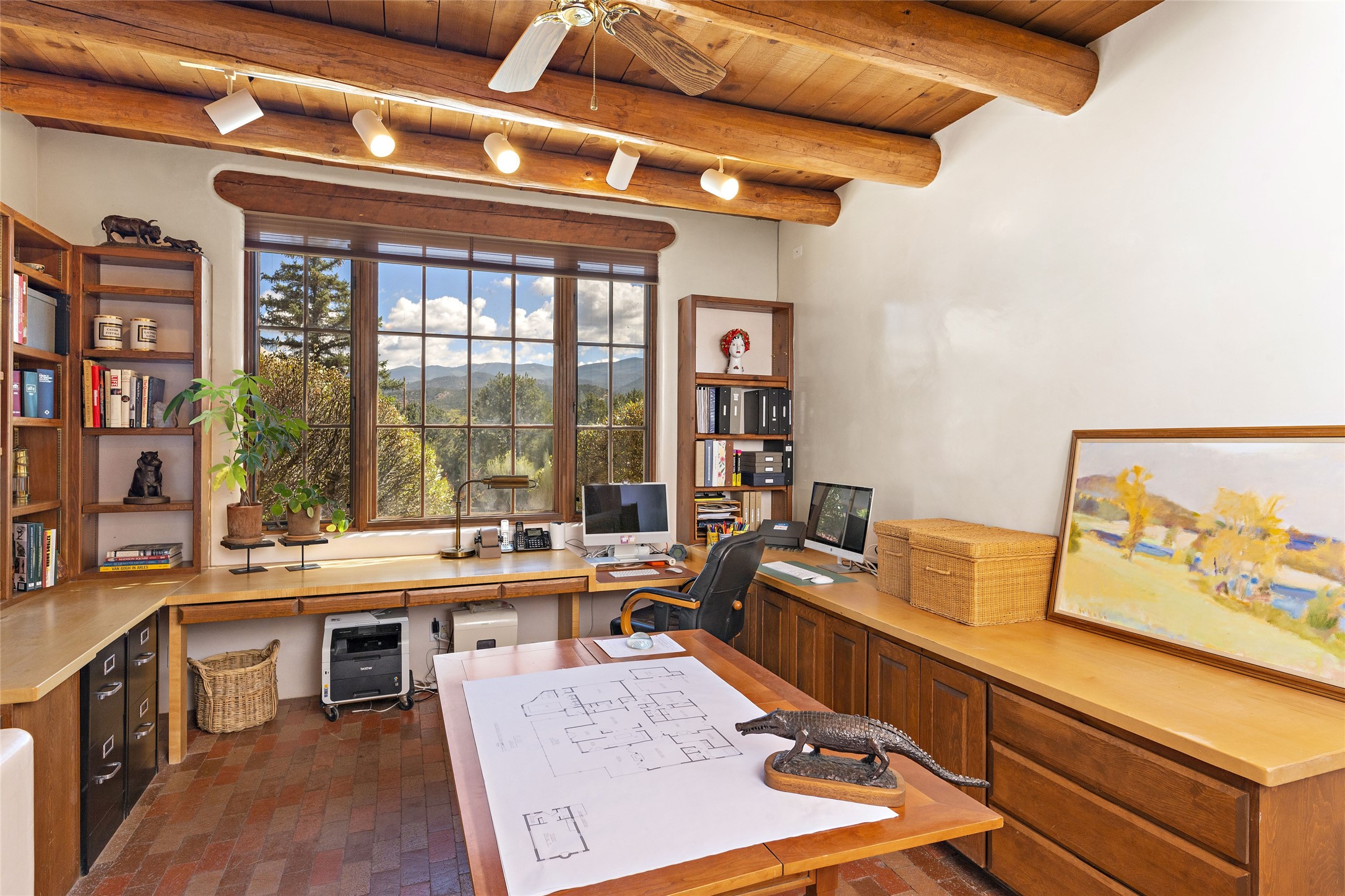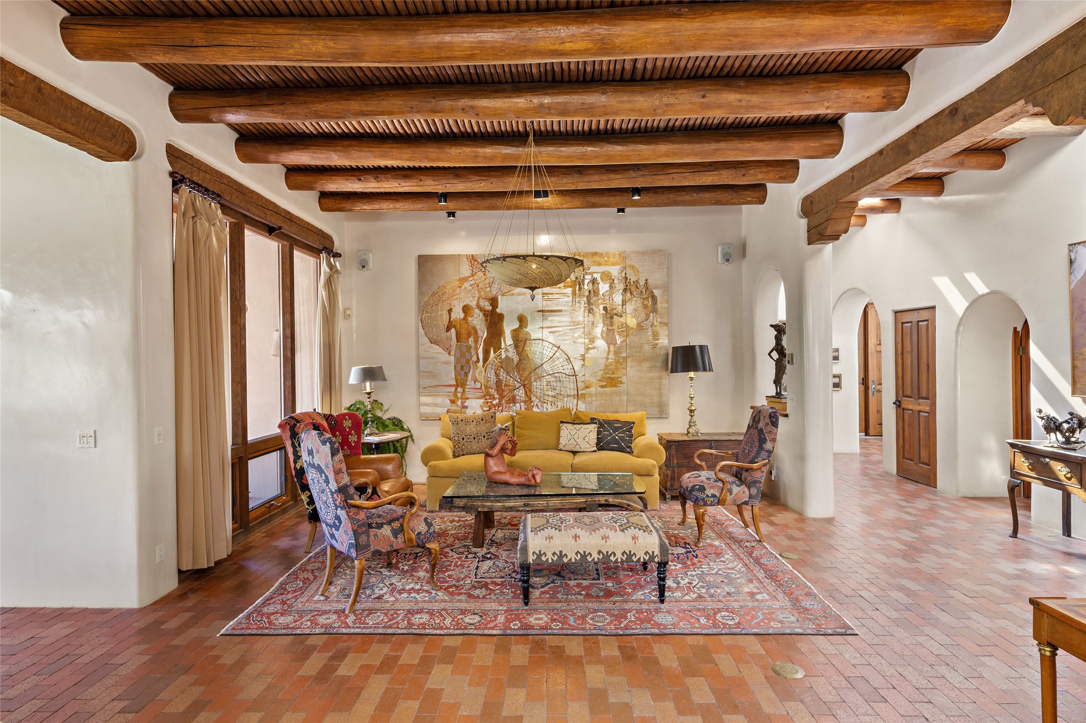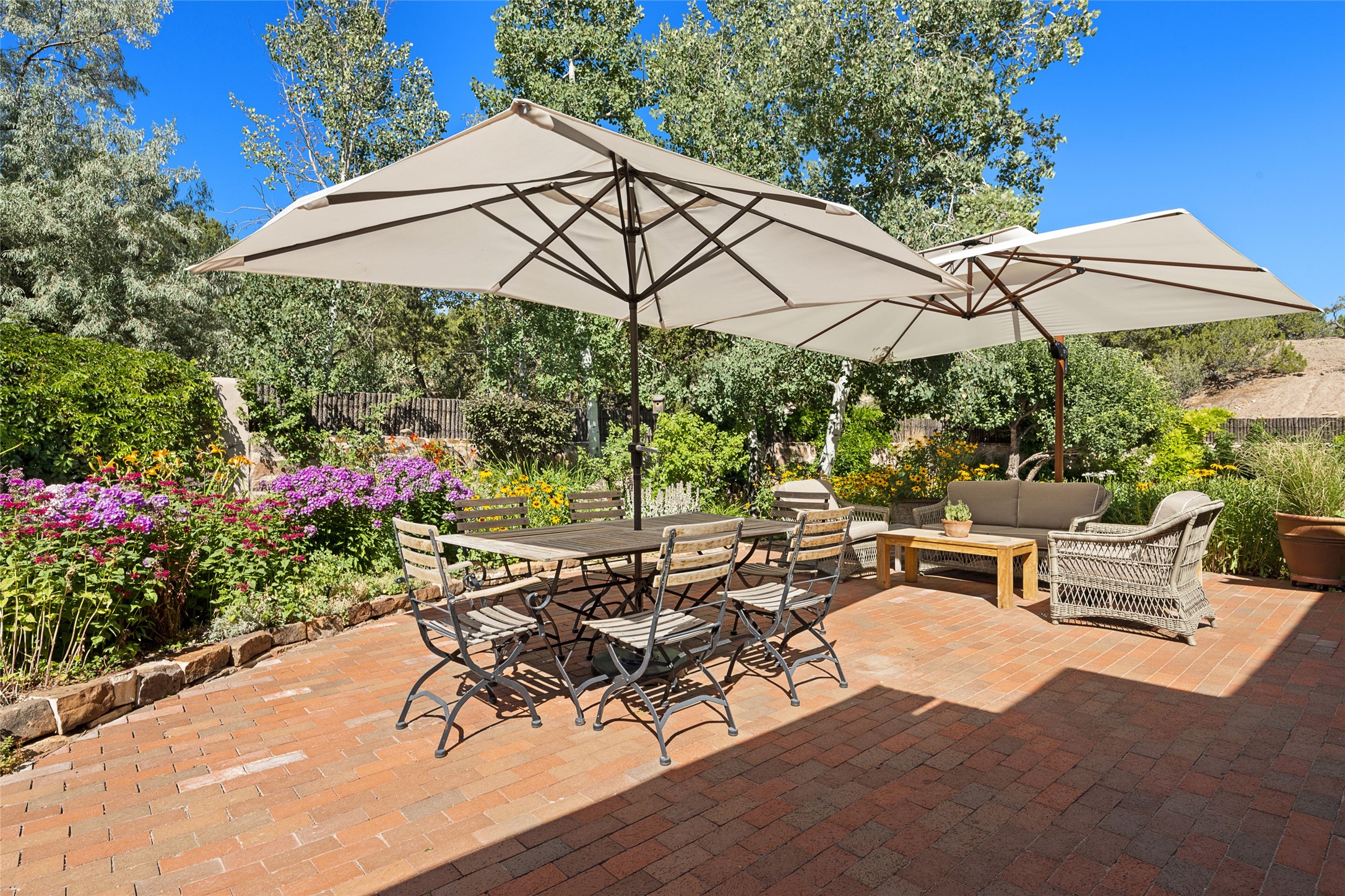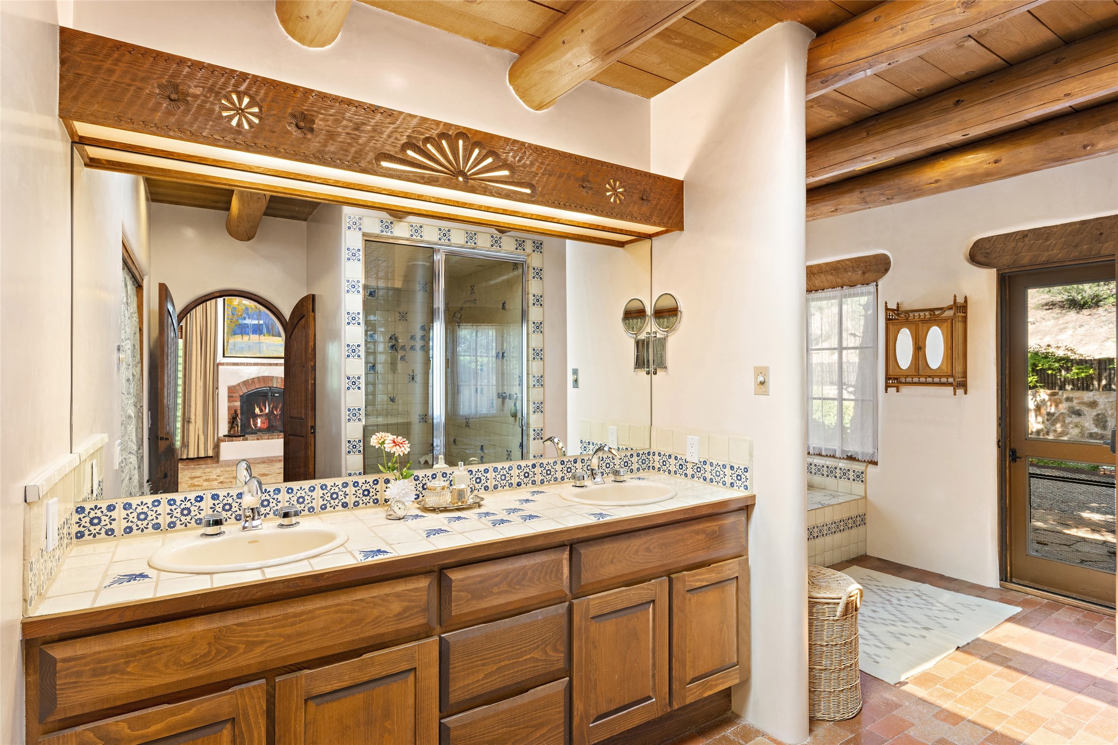 This beautiful 3 acre compound, set back off Bishops Lodge Rd, with views of the Sangre de Cristos features a 3 bedroom, 2.5 bathroom main house, a detached casita and a studio. Gorgeous gardens and gracious portals allow for multiple outdoor living areas. Privacy and serenity, just 3 miles from the plaza, this home is an entertainers dream.