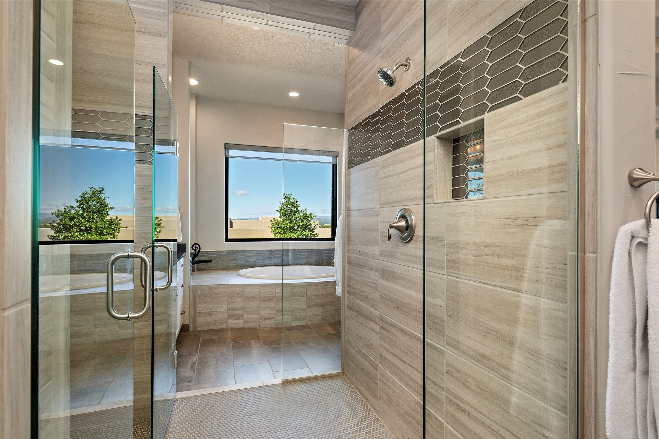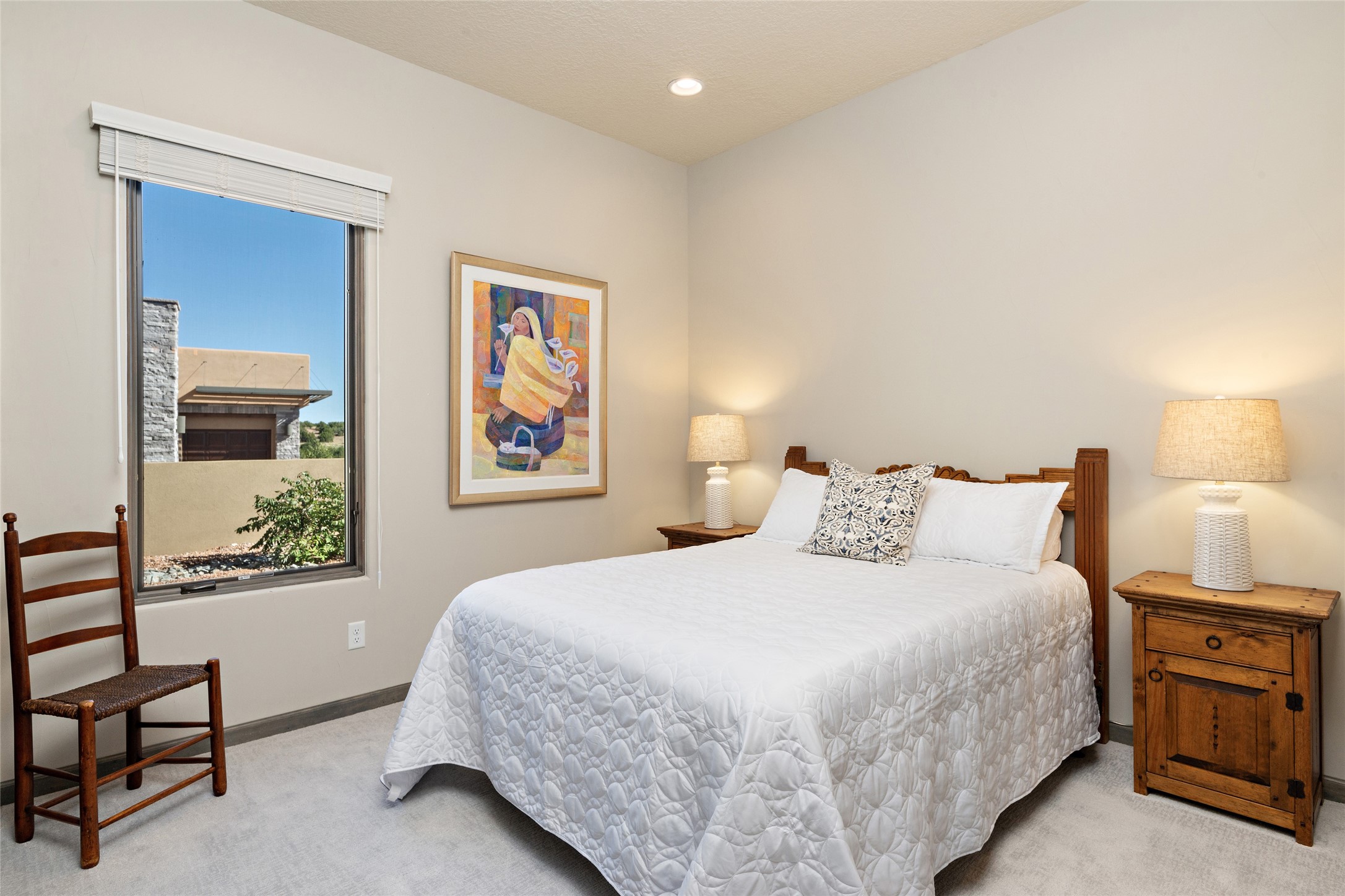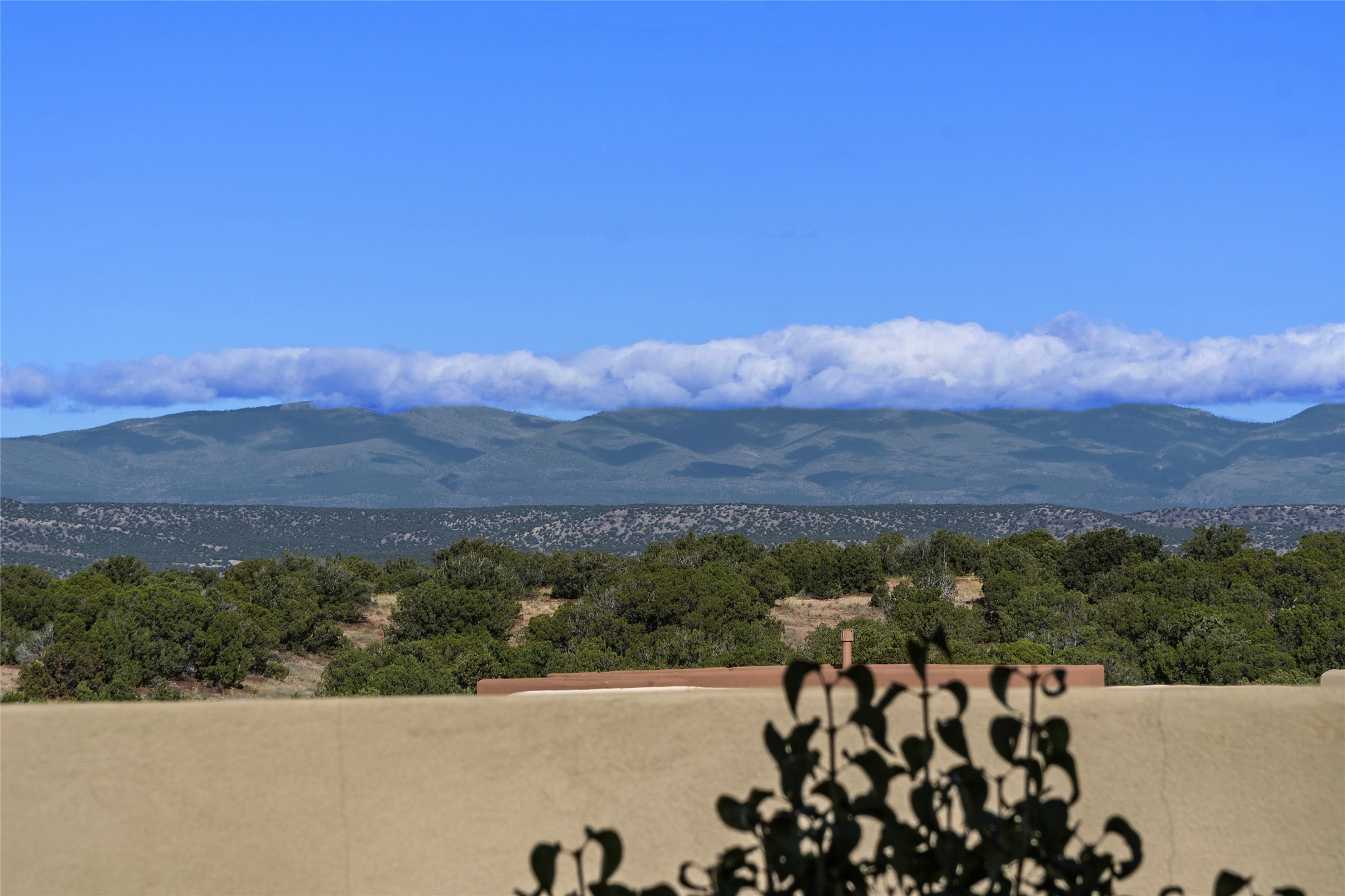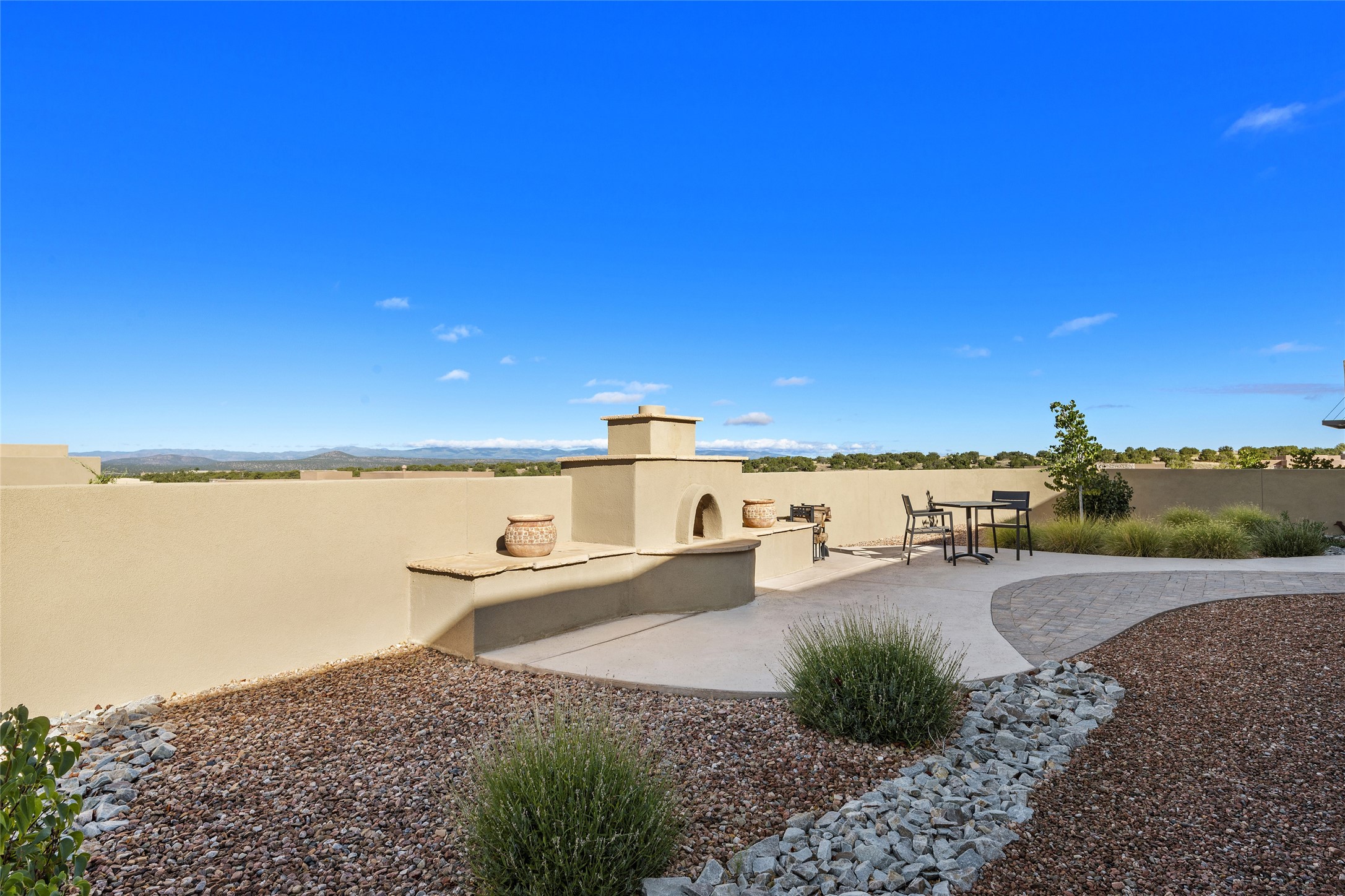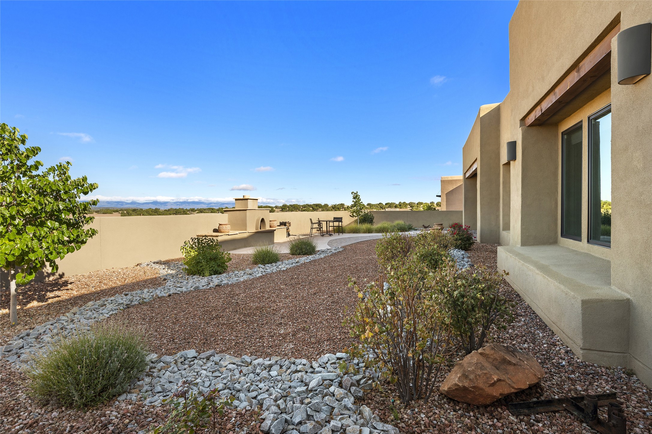 Built in 2019 in the Las Terrazas enclave, the home is a Courtside contemporary plan and has stunning views of the Jemez Mountains. This beautifully maintained 3529 sq. ft. residence offers an open floor plan ideal for entertaining with light-filled living, dining and kitchen areas; wet bar; office/media room; three bedrooms each ensuite and 3-car garage. Retracting sliding glass doors frame the mountain view and connect the living and dining areas to a generous portal for enjoying the amazing Santa Fe sunsets, a walled-in patio and Kiva fireplace. A spacious Chef's kitchen is anchored by a large center island with caf seating and a Butler's Pantry. Appliances include a KitchenAid package with gas cooktop and two gas ovens, two dishwashers and wine cooler. The luxurious Owner's Suite features a coffered ceiling, retreat area, a spa-like bath area and large closets. Seller's upgrades include ceiling beams; crown molding; quartz counter tops; pre-wiring for surround sound; hardwood, tile and carpet floors; a Smarthome System; 220-volt 50-amp circuit in the third garage and a Home Team Pest Control Injection System. The home is fully landscaped with drip irrigation and has been Certified Silver in the Build Green New Mexico Program. Memberships to the Club at Las Campanas are optional and can be purchased upon approval. The Club at Las Campanas offers two Signature Jack Nicklaus Golf Courses, Hacienda Clubhouse, Spa & Fitness Center, indoor and outdoor pools, pickleball, tennis, Log Cabin dining and a world-class Equestrian Center. 18 Minutes to the Historical Plaza and Santa Fe Airport, this property is priced well and will be move-in ready in early October.