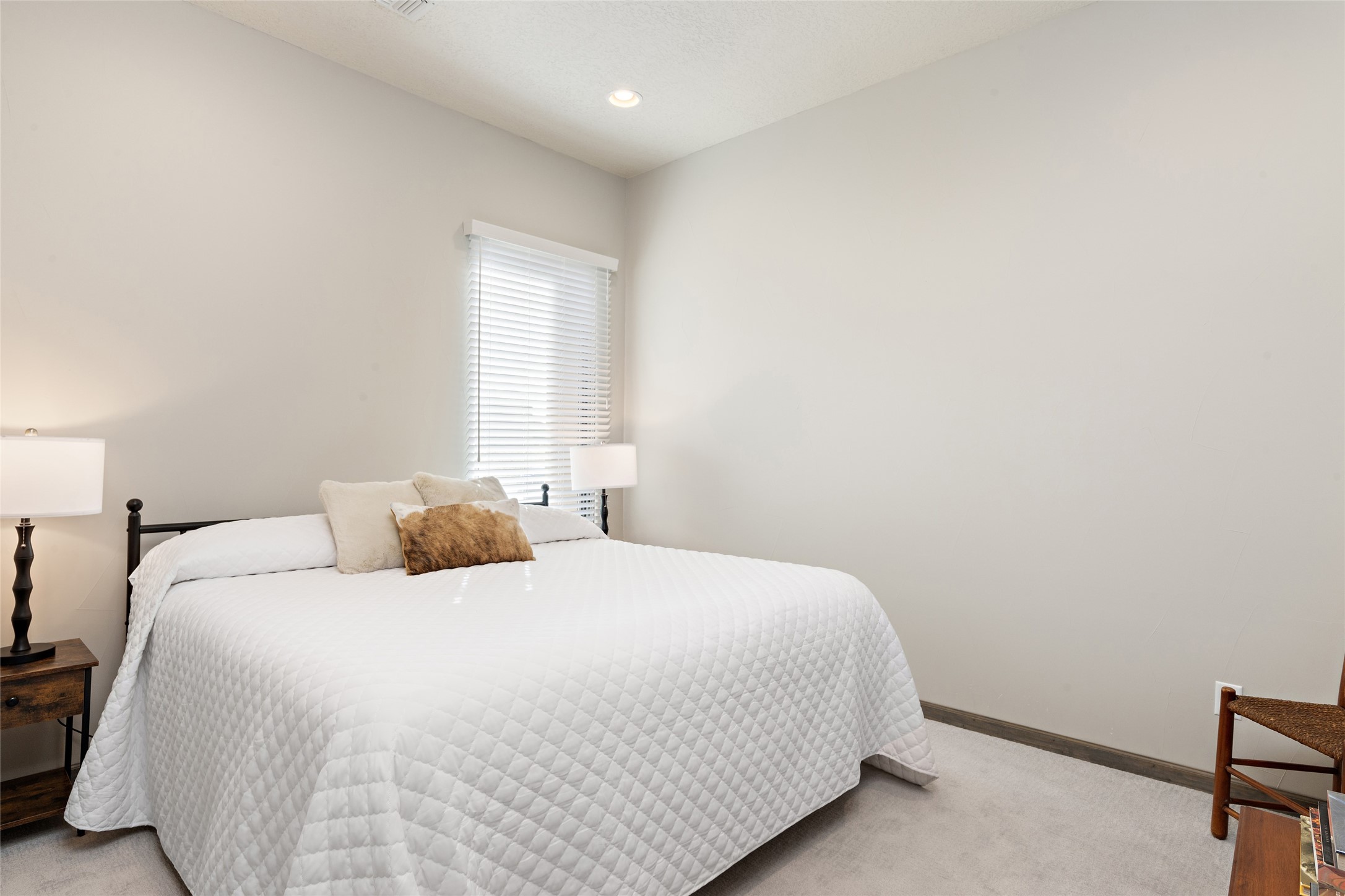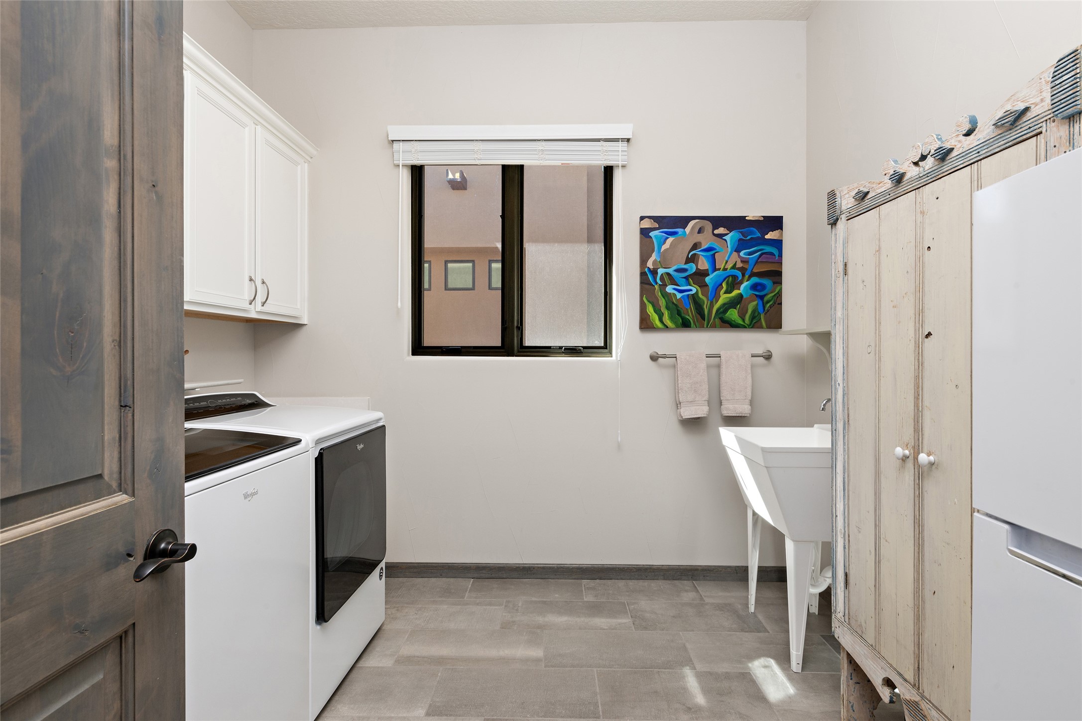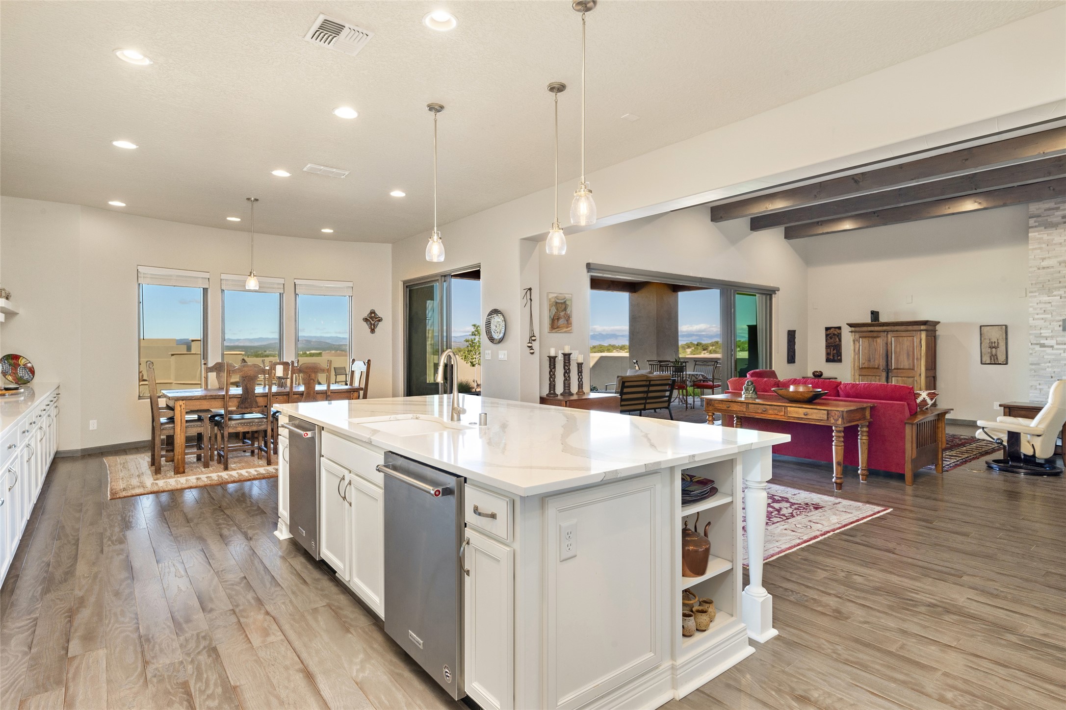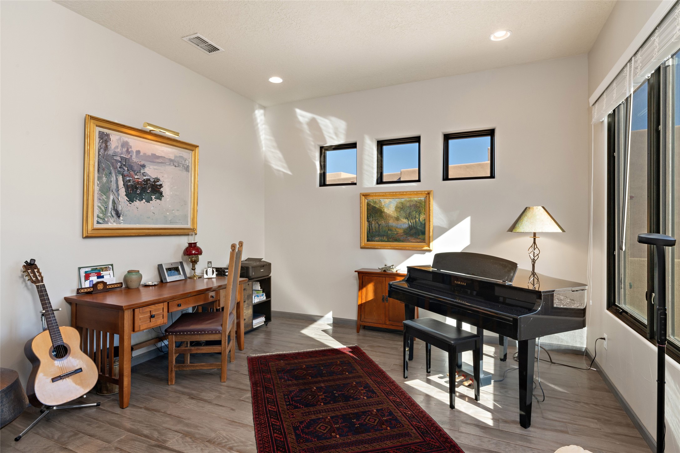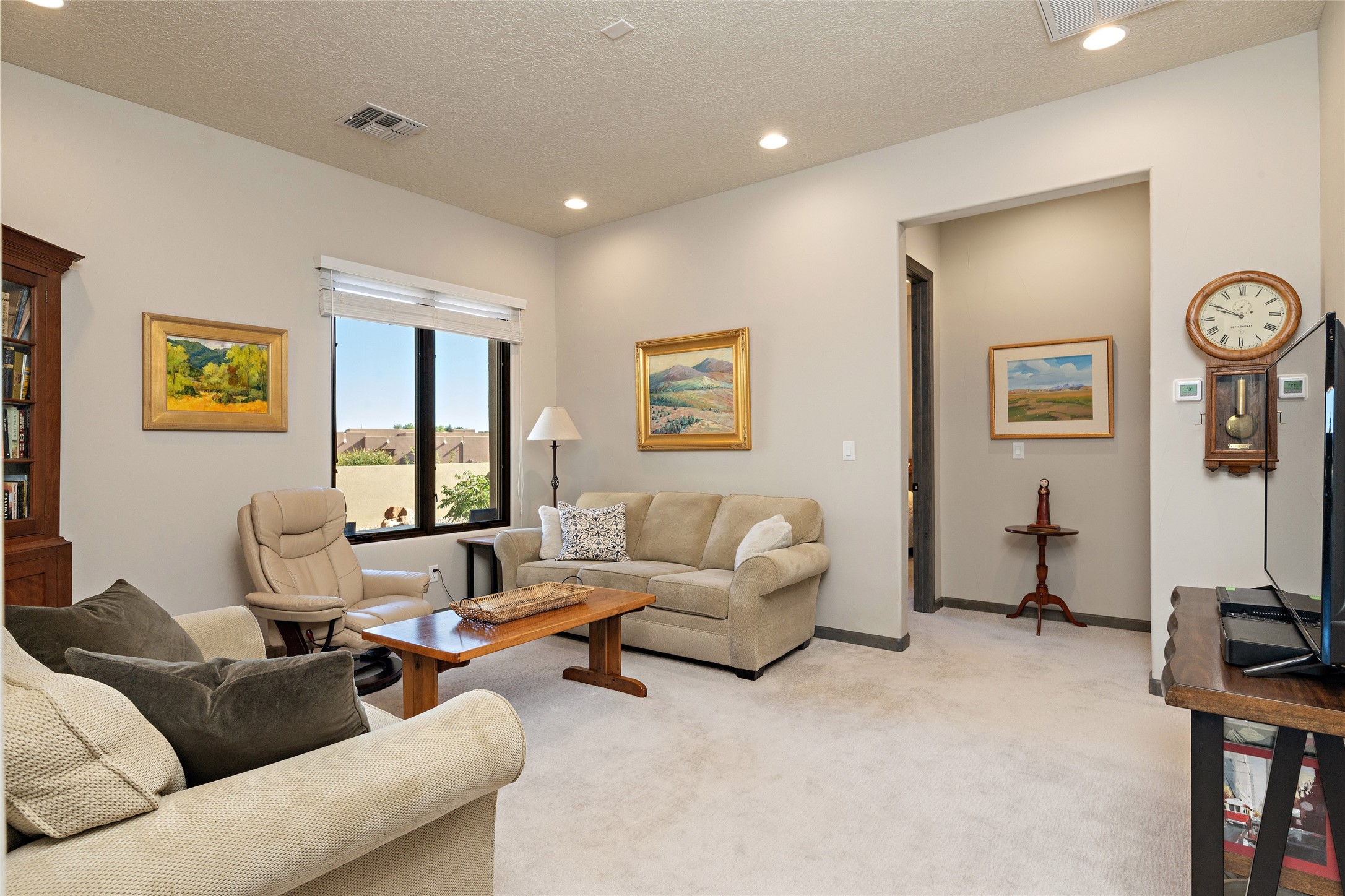 Built in 2019 in the Las Terrazas enclave, the home is a Courtside contemporary plan and has stunning views of the Jemez Mountains. This beautifully maintained 3529 sq. ft. residence offers an open floor plan ideal for entertaining with light-filled living, dining and kitchen areas; wet bar; office/media room; three bedrooms each ensuite and 3-car garage. Retracting sliding glass doors frame the mountain view and connect the living and dining areas to a generous portal for enjoying the amazing Santa Fe sunsets, a walled-in patio and Kiva fireplace. A spacious Chef's kitchen is anchored by a large center island with caf seating and a Butler's Pantry. Appliances include a KitchenAid package with gas cooktop and two gas ovens, two dishwashers and wine cooler. The luxurious Owner's Suite features a coffered ceiling, retreat area, a spa-like bath area and large closets. Seller's upgrades include ceiling beams; crown molding; quartz counter tops; pre-wiring for surround sound; hardwood, tile and carpet floors; a Smarthome System; 220-volt 50-amp circuit in the third garage and a Home Team Pest Control Injection System. The home is fully landscaped with drip irrigation and has been Certified Silver in the Build Green New Mexico Program. Memberships to the Club at Las Campanas are optional and can be purchased upon approval. The Club at Las Campanas offers two Signature Jack Nicklaus Golf Courses, Hacienda Clubhouse, Spa & Fitness Center, indoor and outdoor pools, pickleball, tennis, Log Cabin dining and a world-class Equestrian Center. 18 Minutes to the Historical Plaza and Santa Fe Airport, this property is priced well and will be move-in ready in early October.