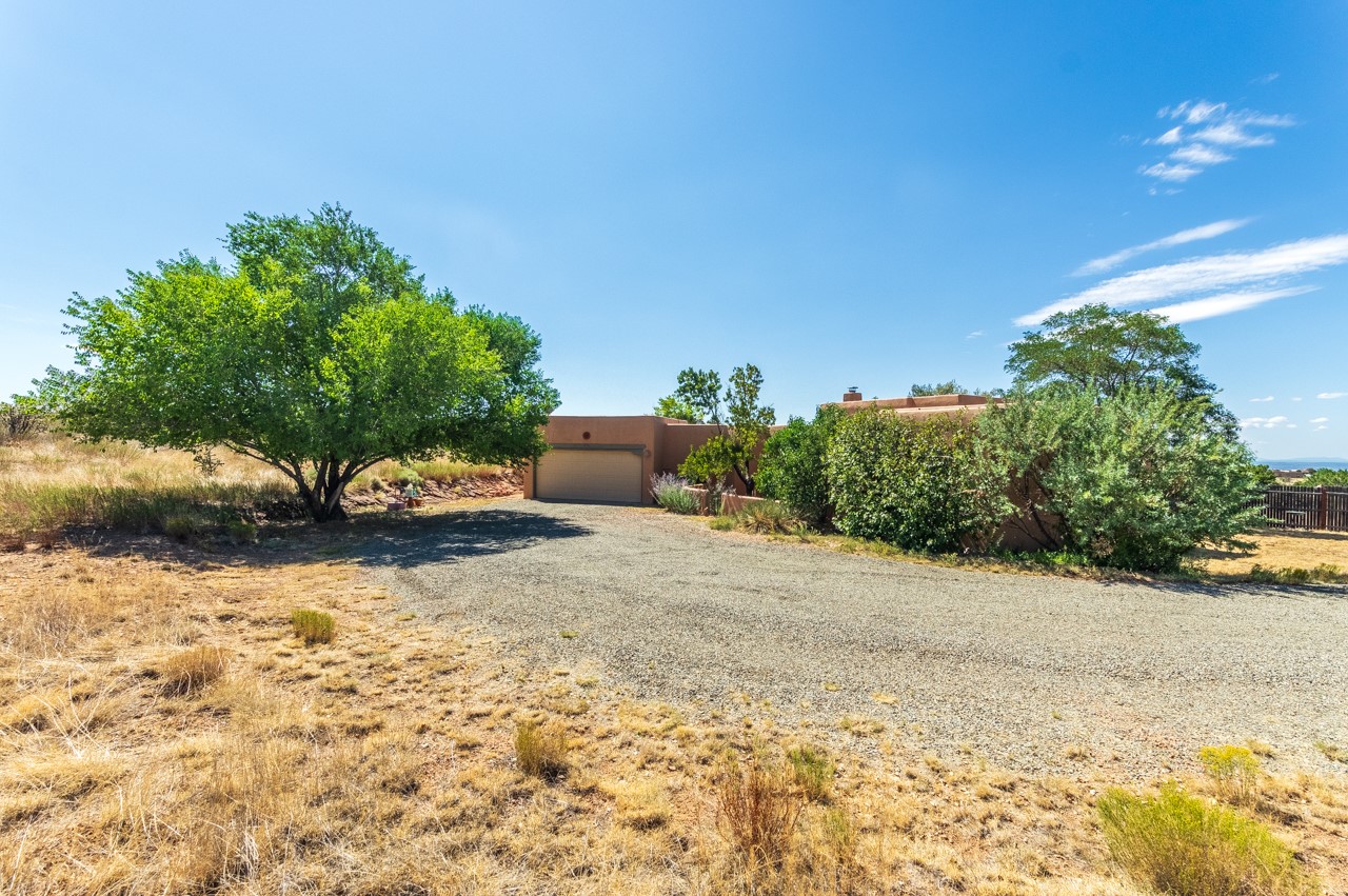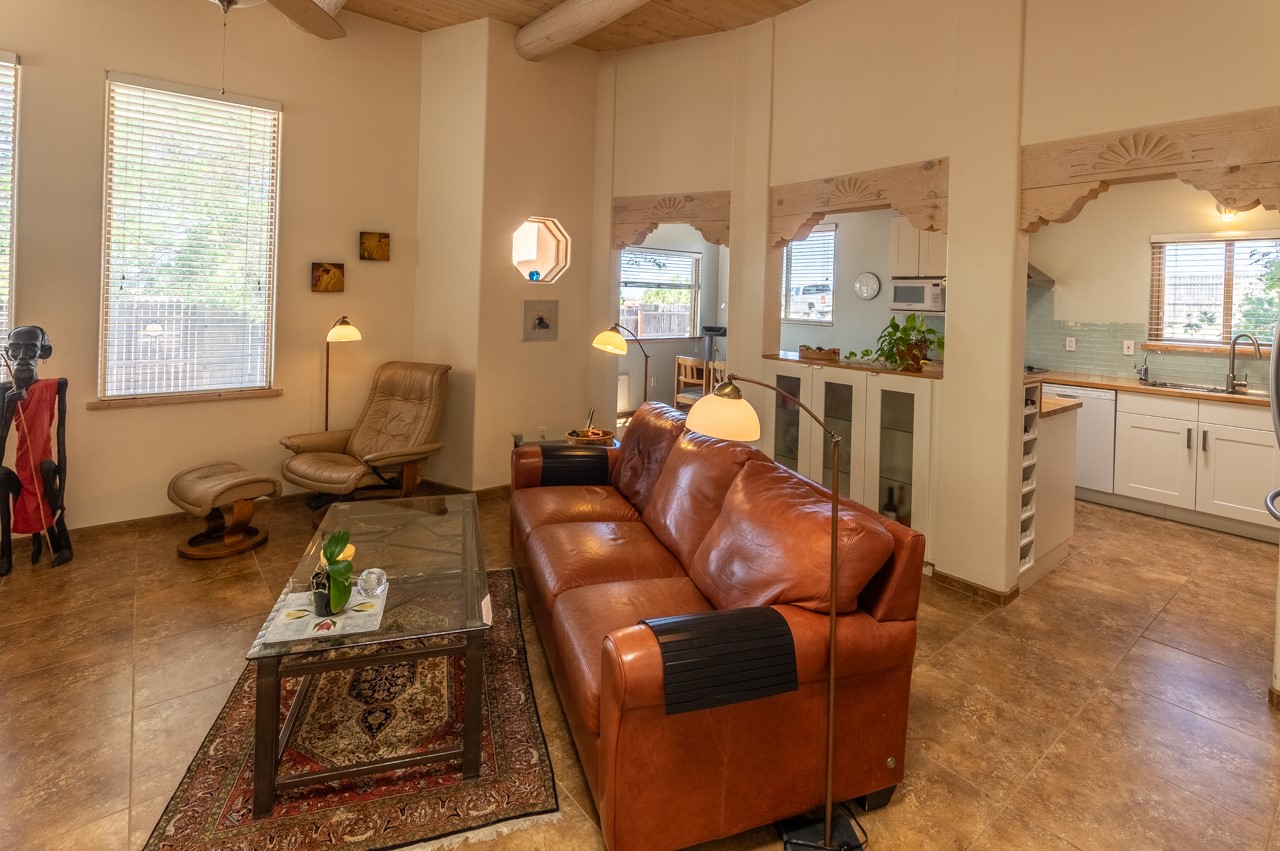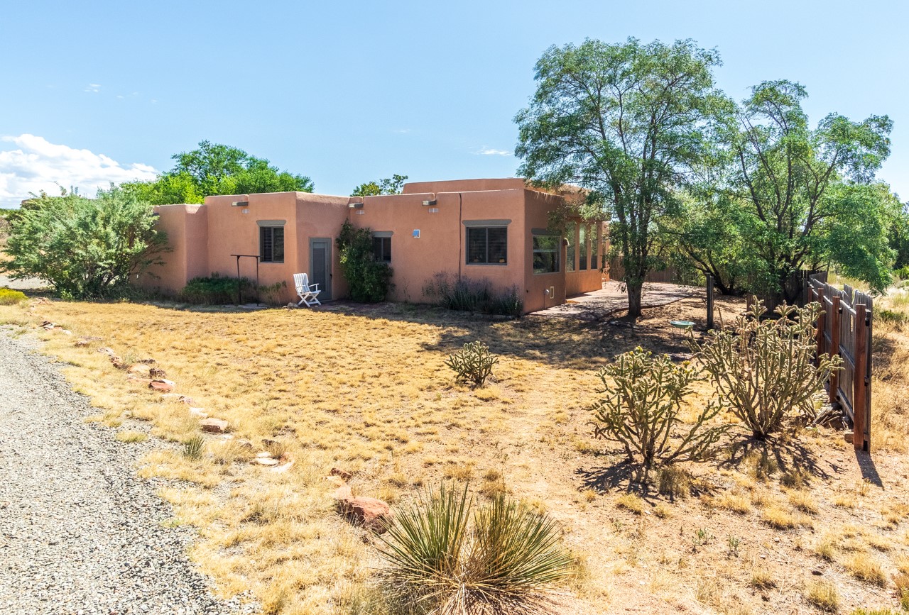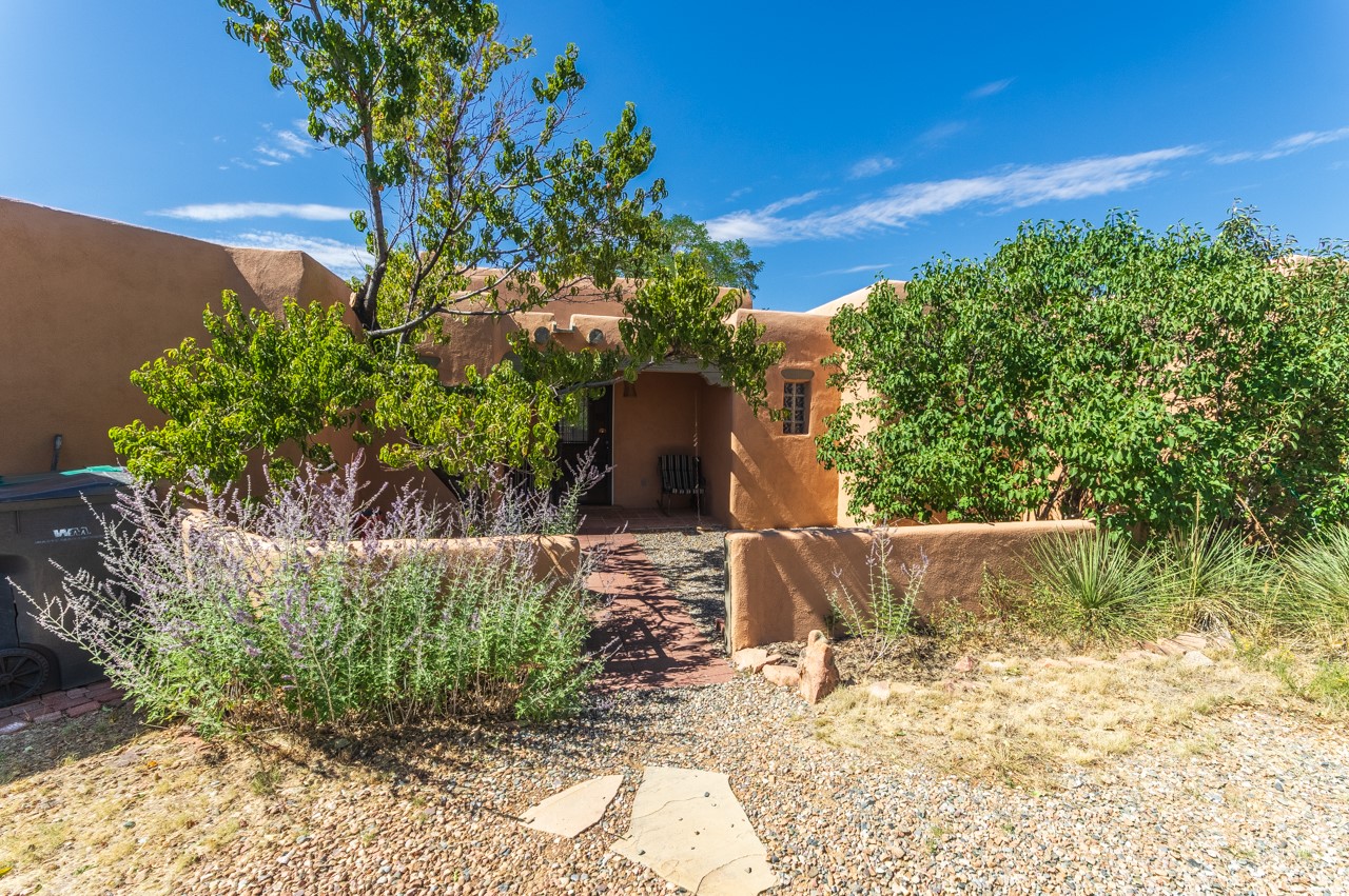 Charming home move-in ready. Light and bright with a high ceiling in the main living room, kiva fireplace, and open to the kitchen. The kitchen is very inviting along with the eat-in dining space. The primary bedroom is oversized with a beautifully remodeled bath area and door to the backyard. The second bedroom is nicely sized and also has a door to the back and is set up currently as an office and exercise area. The third bedroom is cozy for guests and the hall bath has also been beautifully remodeled. The hall to the two-car garage has a stacked washer and dryer. The oversized garage has a workbench and closet containing the heating and hot water heater. The backyard facing the sunset is partially fenced for privacy and could be totally enclosed for pets.