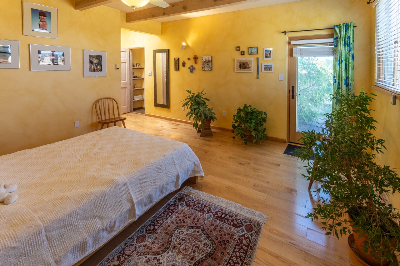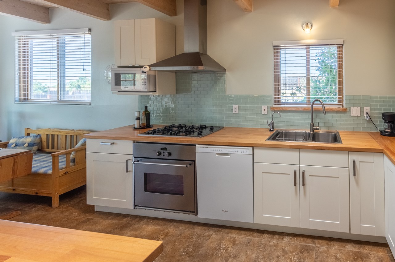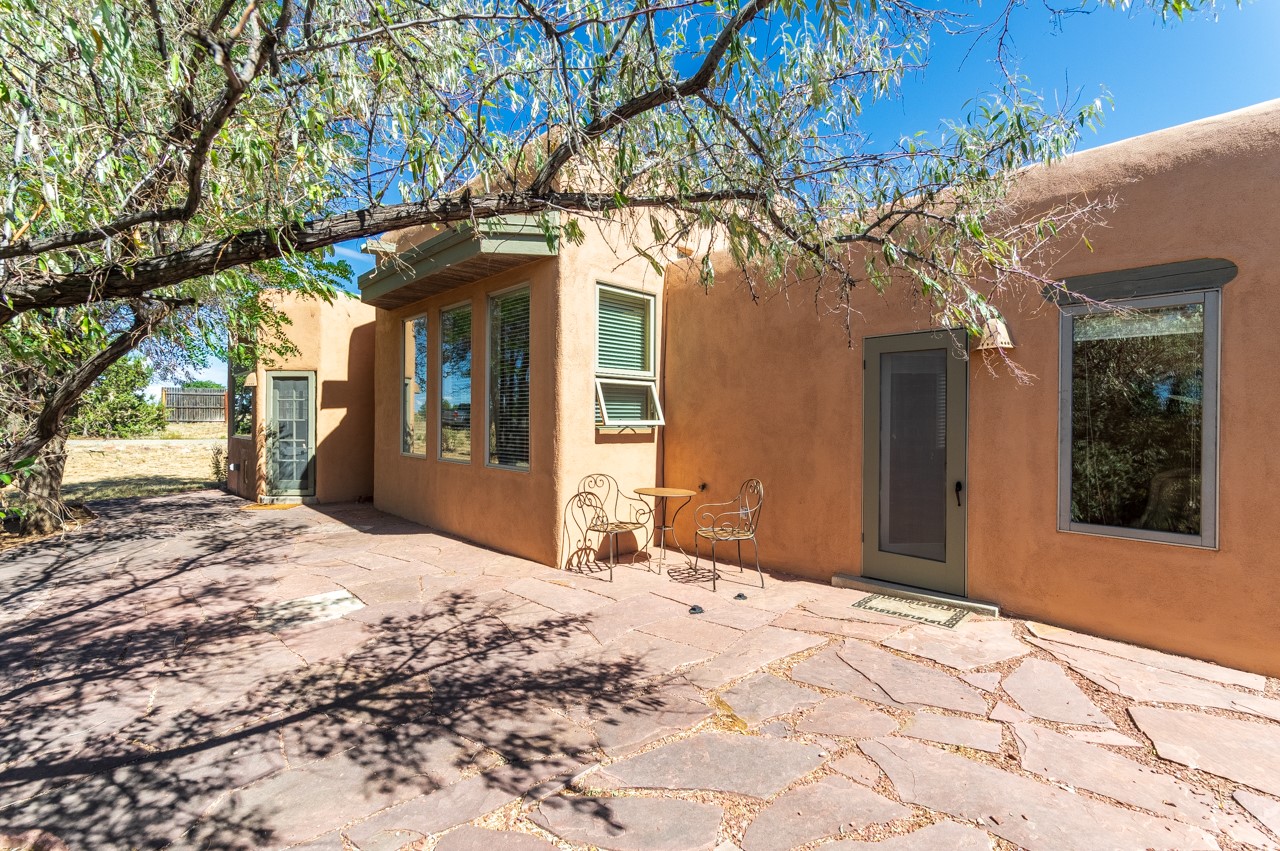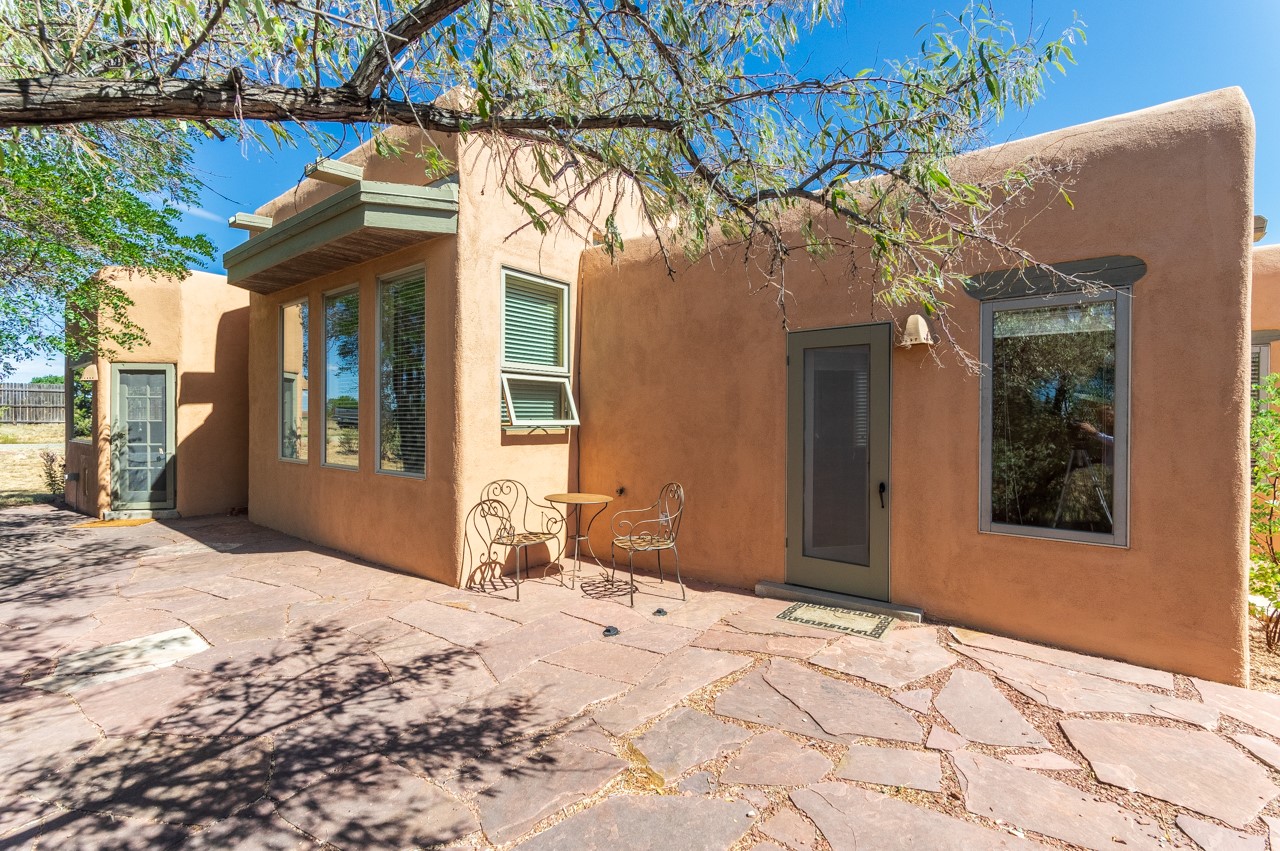 Charming home move-in ready. Light and bright with a high ceiling in the main living room, kiva fireplace, and open to the kitchen. The kitchen is very inviting along with the eat-in dining space. The primary bedroom is oversized with a beautifully remodeled bath area and door to the backyard. The second bedroom is nicely sized and also has a door to the back and is set up currently as an office and exercise area. The third bedroom is cozy for guests and the hall bath has also been beautifully remodeled. The hall to the two-car garage has a stacked washer and dryer. The oversized garage has a workbench and closet containing the heating and hot water heater. The backyard facing the sunset is partially fenced for privacy and could be totally enclosed for pets.