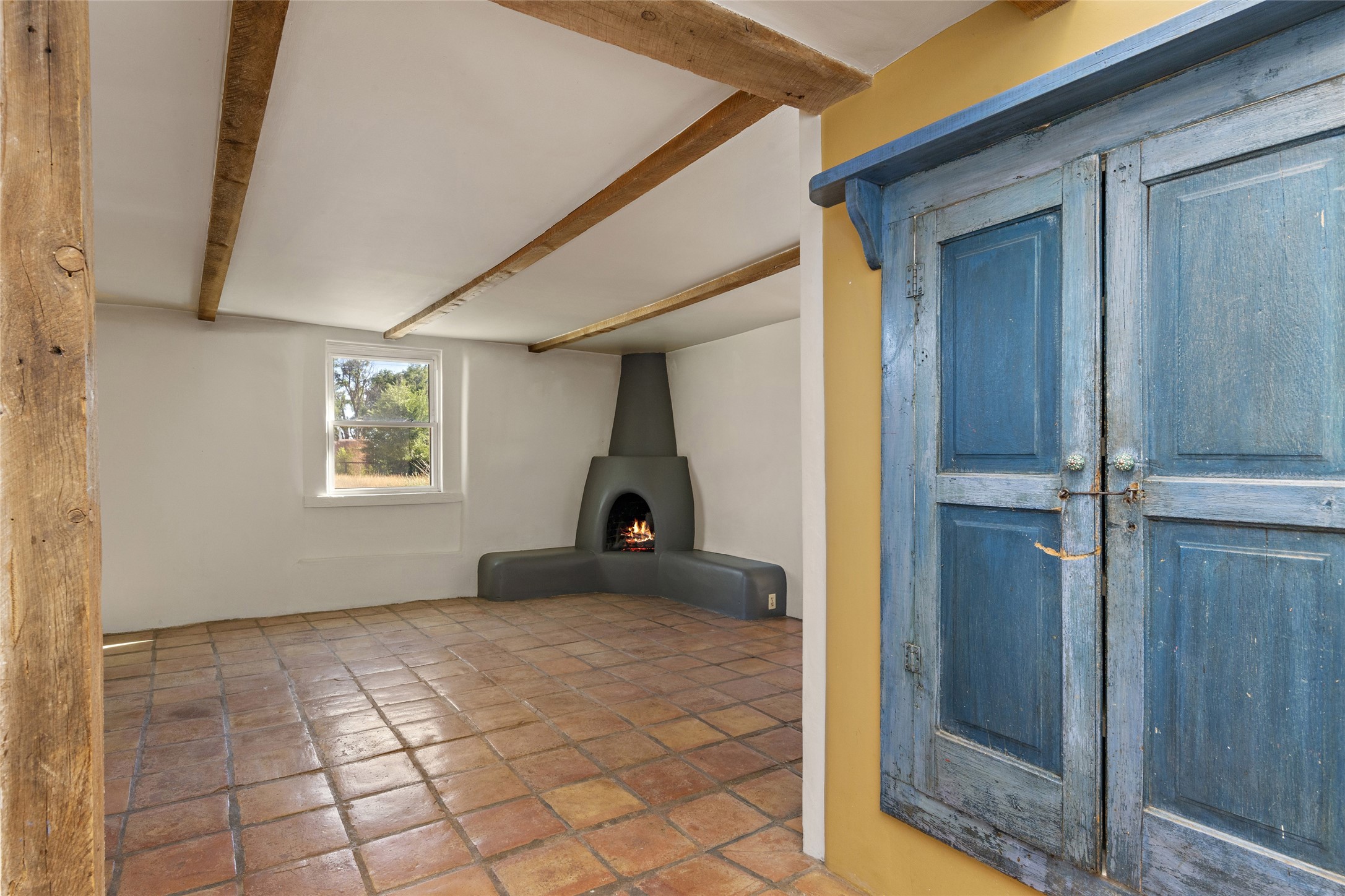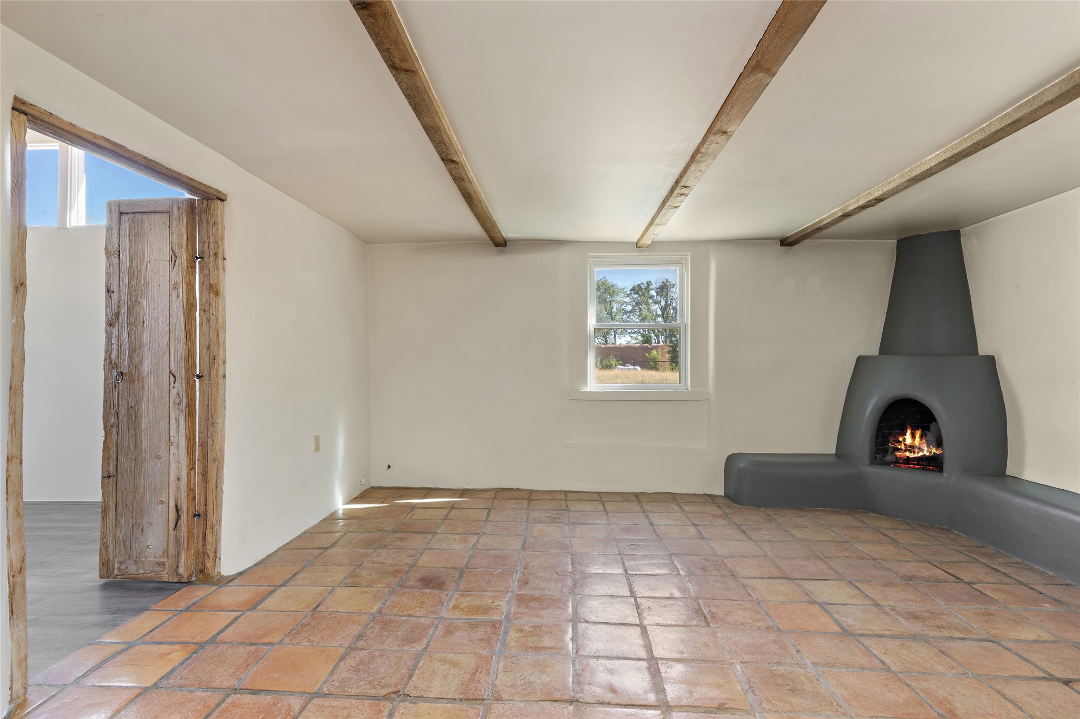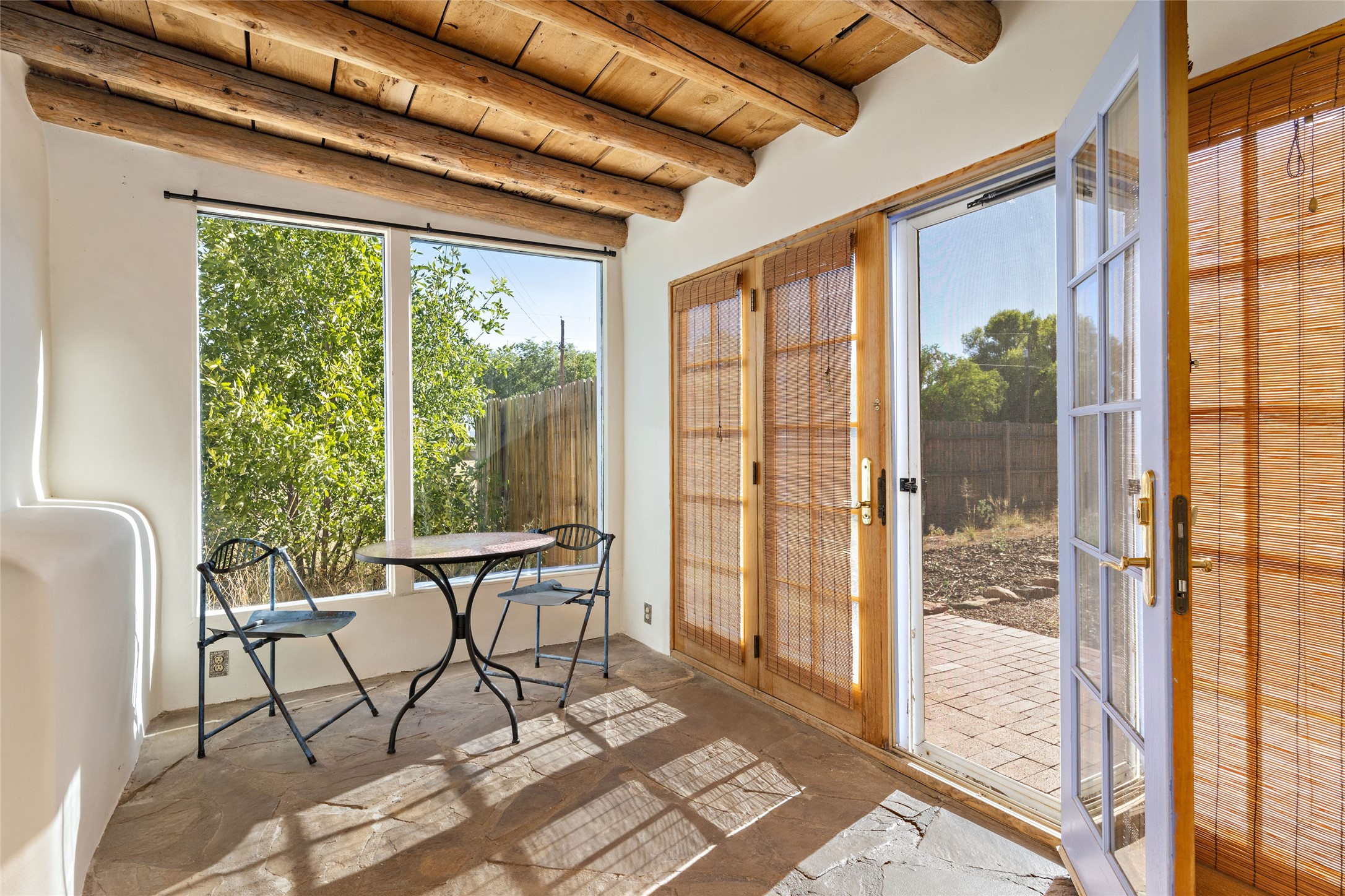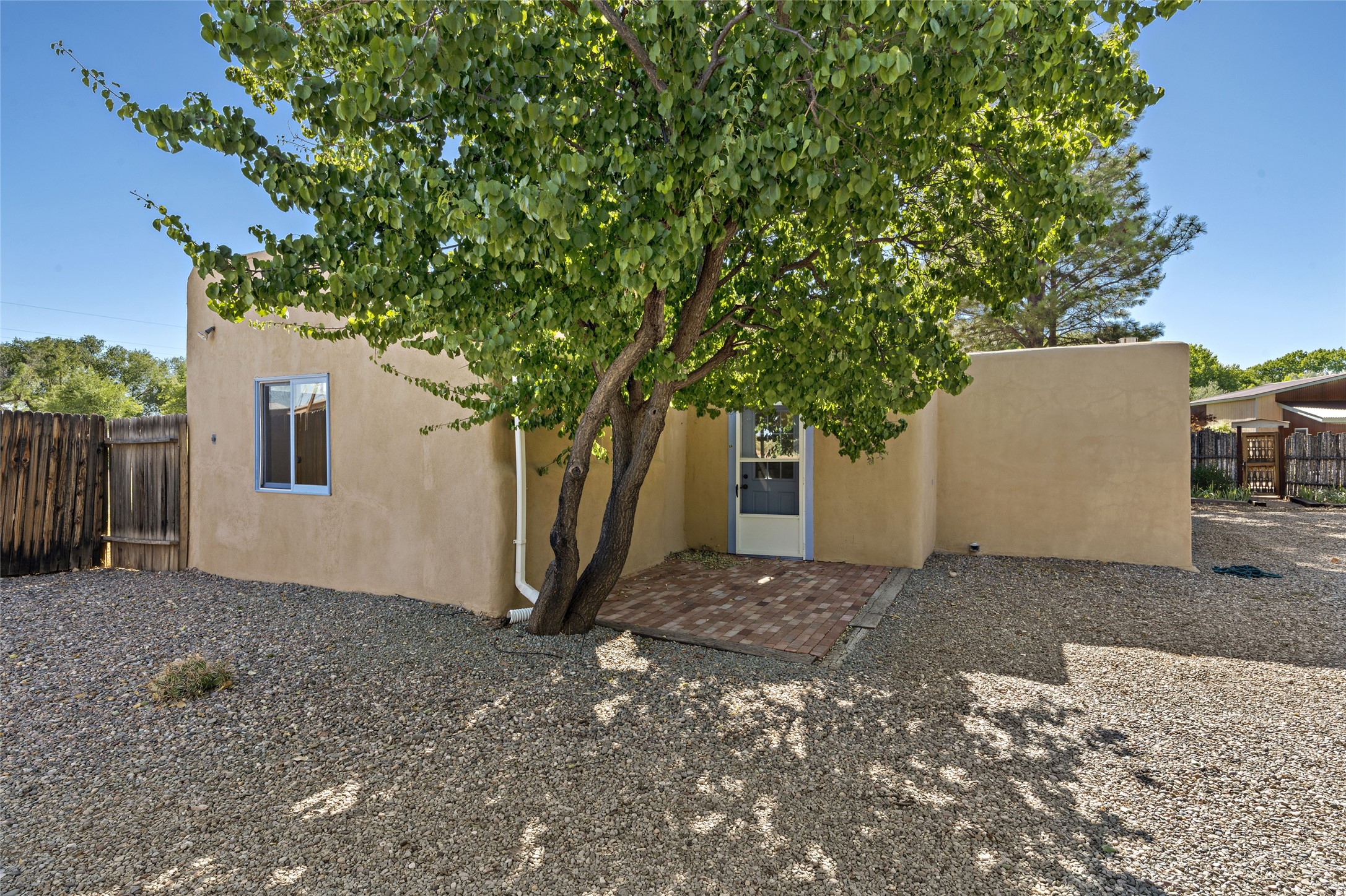 Nestled along the banks of the Galisteo Creek, this sweet original adobe/double adobe home is sited on a picturesque 0.75 +/- acres. There is a large outdoor courtyard with private and captivating views of the gardens, the Galisteo valley and bosque. The functionality of the home lends itself to be 1 to 3 bedroom spaces with plenty of natural light - ideal for artists and studio space. There is a full bathroom and kitchen off the living area. Architectural features include a large wood-burning fireplace, vigas, latillas, antique mesquite doors in the bedroom and kitchen pantry, as well as flagstone, Saltillo tile and wood flooring. A mechanical room doubles as a laundry room with a washer, dryer and utility sink. 5B La Otra Vanda is being offered by the seller for purchase as well.