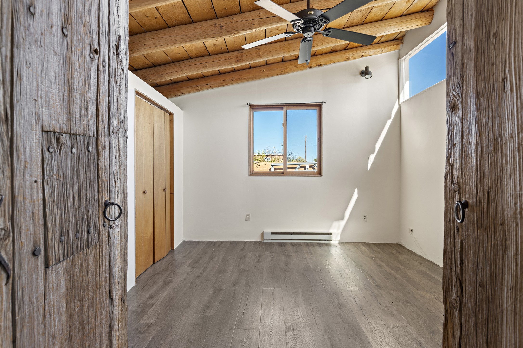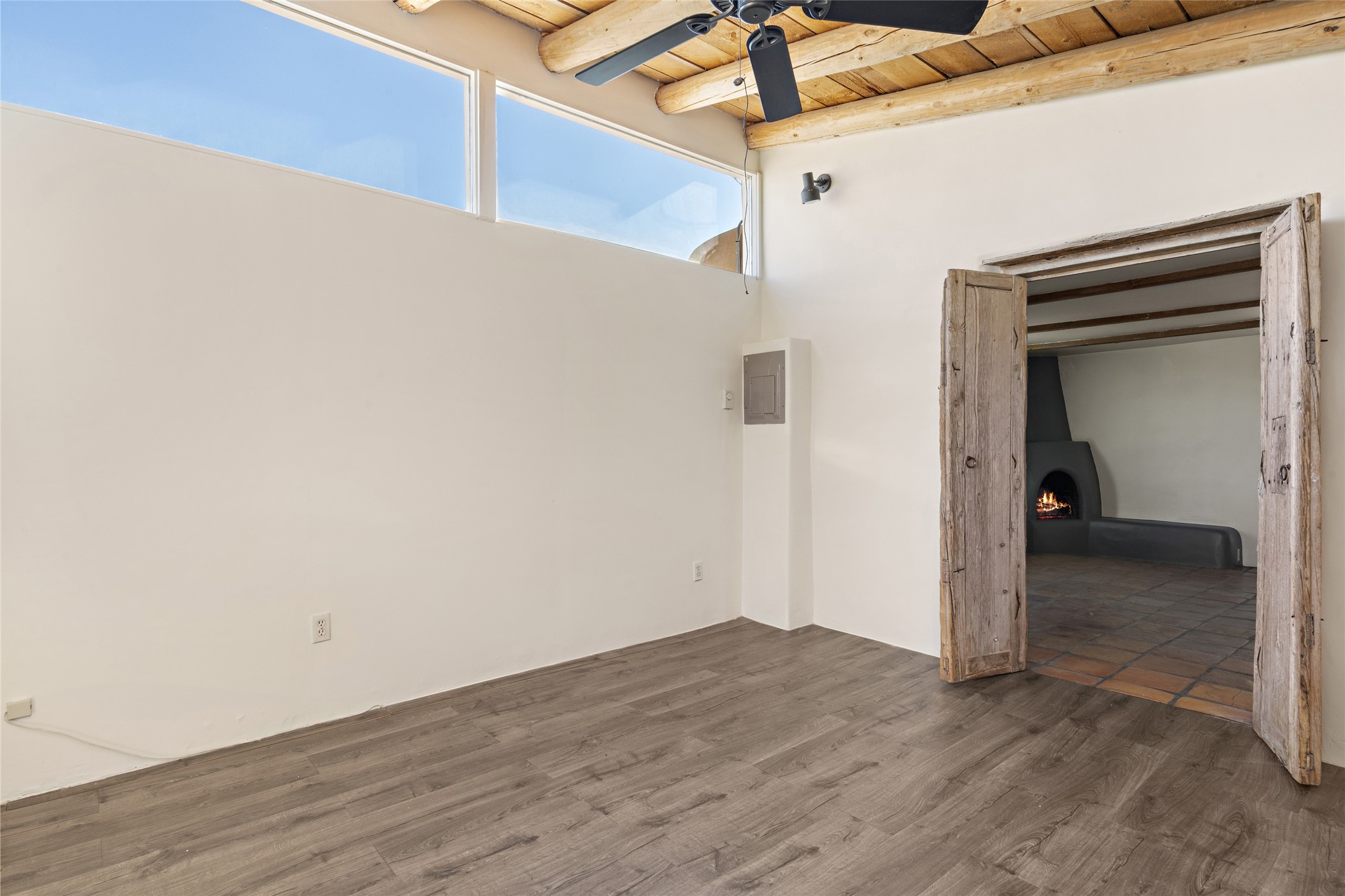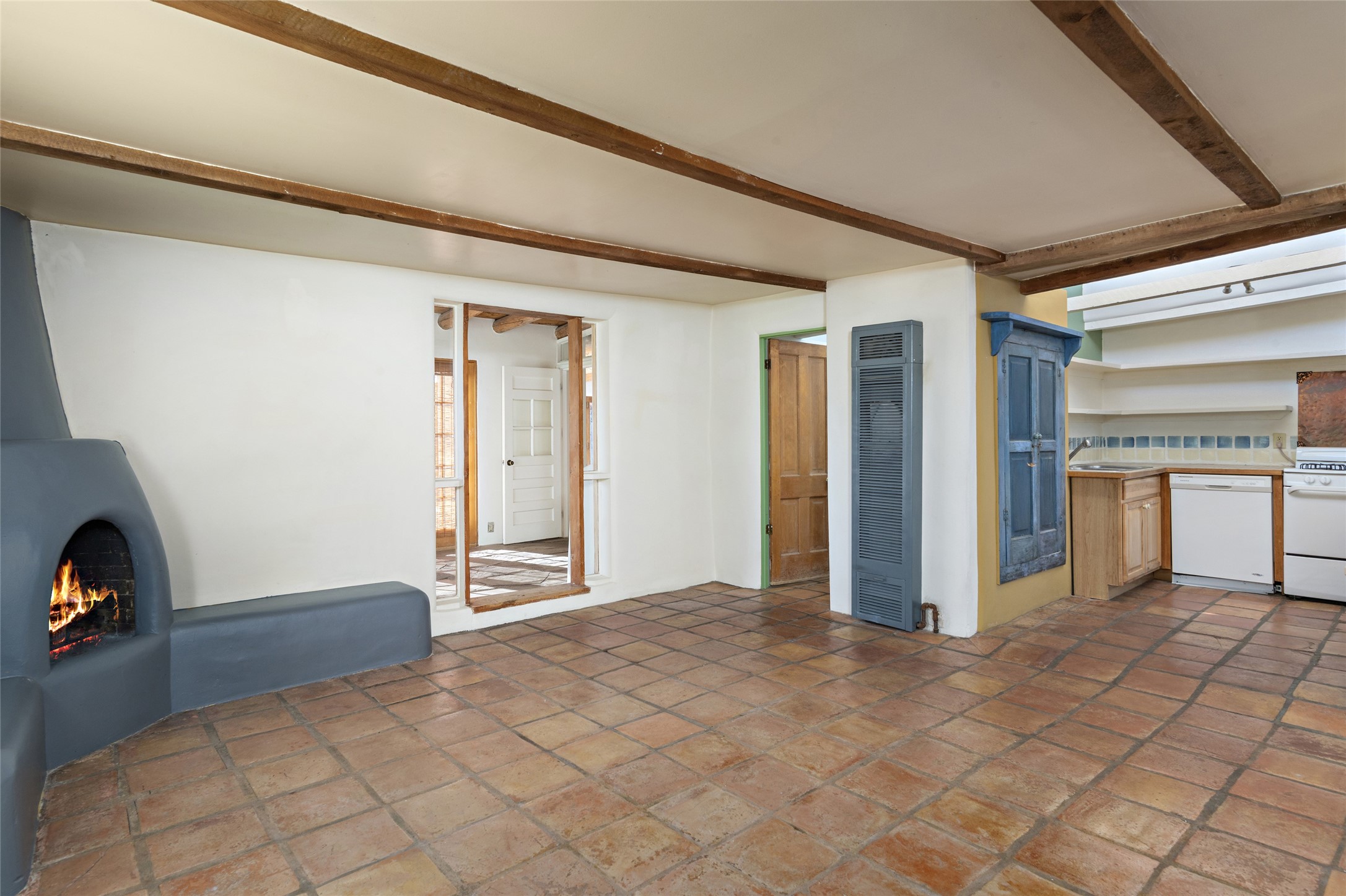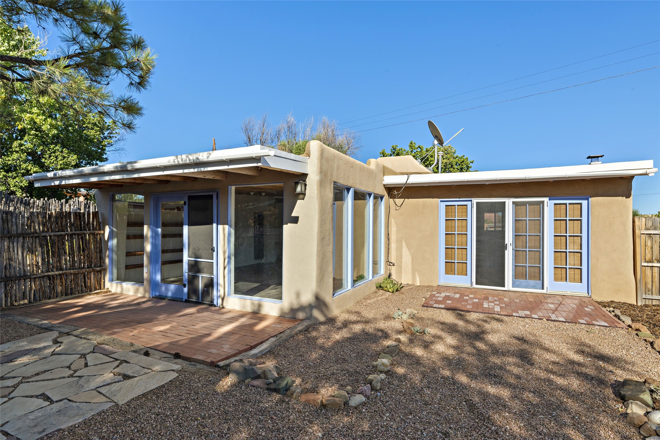 Nestled along the banks of the Galisteo Creek, this sweet original adobe/double adobe home is sited on a picturesque 0.75 +/- acres. There is a large outdoor courtyard with private and captivating views of the gardens, the Galisteo valley and bosque. The functionality of the home lends itself to be 1 to 3 bedroom spaces with plenty of natural light - ideal for artists and studio space. There is a full bathroom and kitchen off the living area. Architectural features include a large wood-burning fireplace, vigas, latillas, antique mesquite doors in the bedroom and kitchen pantry, as well as flagstone, Saltillo tile and wood flooring. A mechanical room doubles as a laundry room with a washer, dryer and utility sink. 5B La Otra Vanda is being offered by the seller for purchase as well.