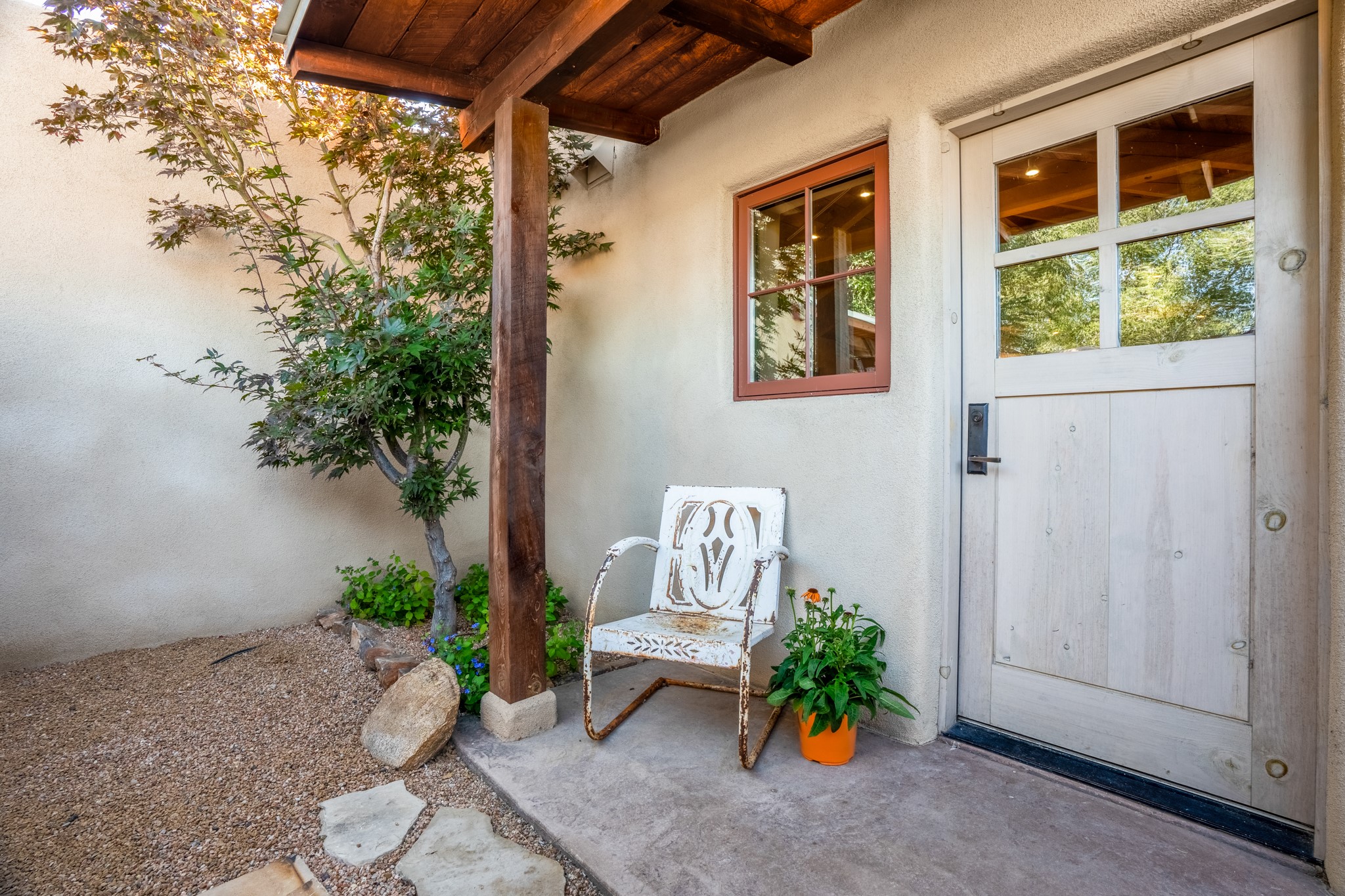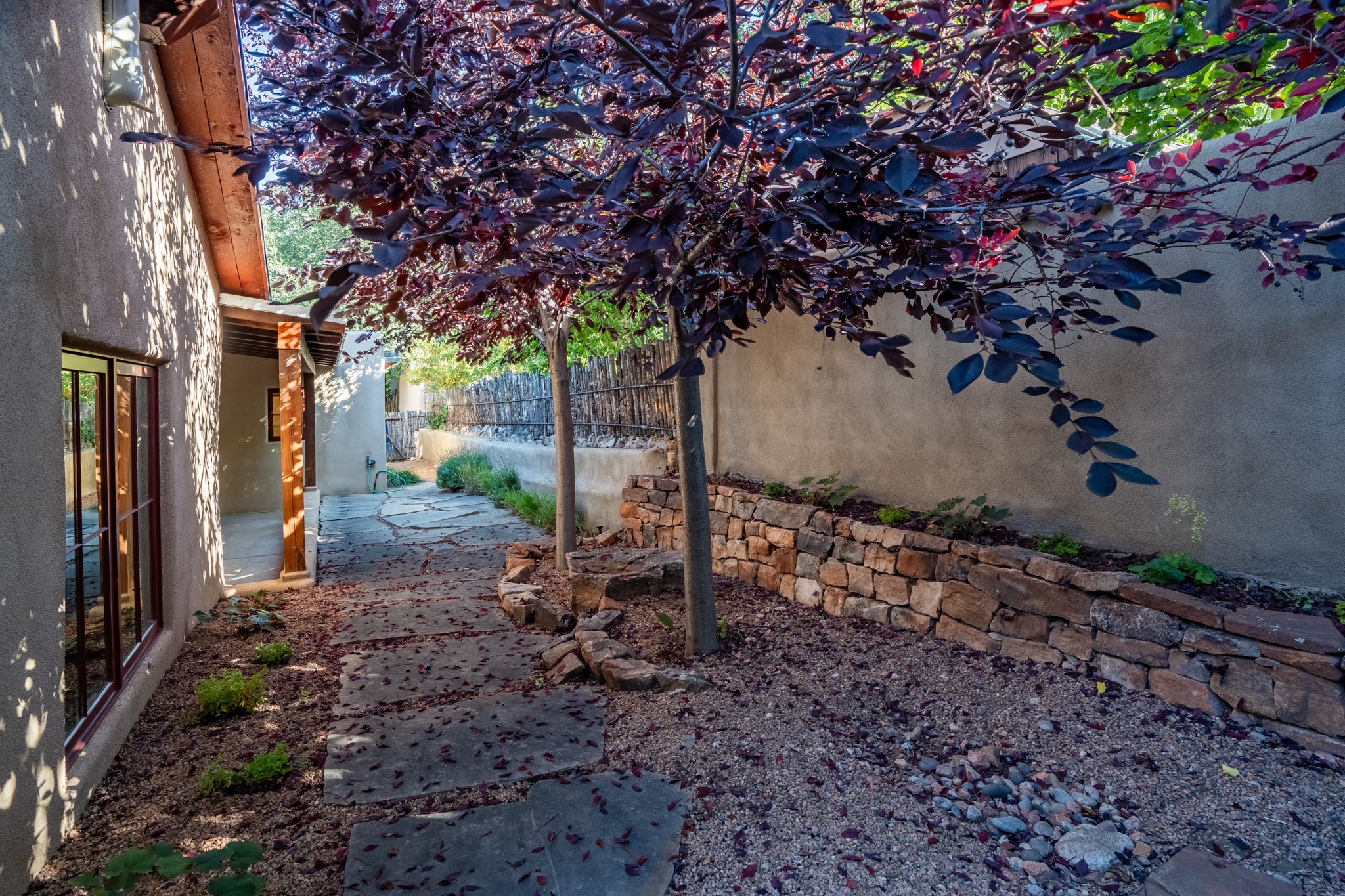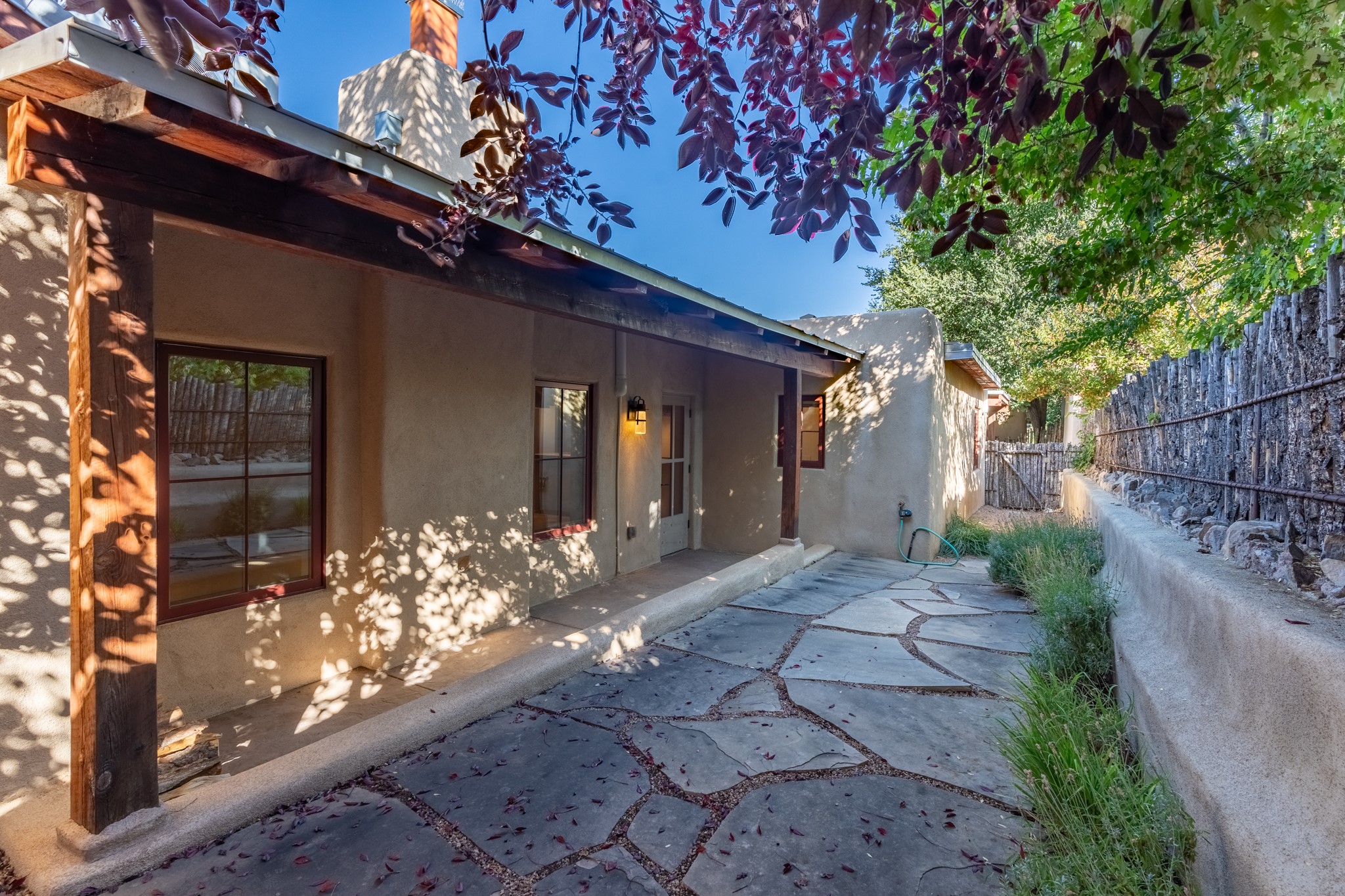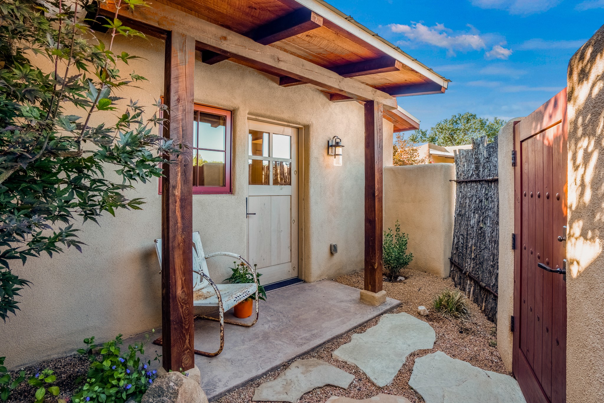 Exuding pride of ownership! Absolutely delightful and pristine 2 bedroom, 2 full bath home with 2 designated parking spaces (1 of which is a carport) single level downtown detached condo on Canyon Rd is minutes to the Santa Fe Plaza, Downtown Subscription, galleries, Patrick Smith Park & fine dining such as Geronimo, The Compound & many others. Charm and warmth abound this Northern New Mexico energy efficient (HERS rating of 53) adobe home built by True North Builders in 2014 with a pitched roof, plaster walls throughout including in the bedrooms and baths. This gem offers an open concept kitchen with granite counters, subway tile backsplash, soft close drawers/cabinets, stainless steel Jenn-air appliances, pantry with built-in shelving, and a breakfast bar. The living room is grand and offers high ceiling with beams and a wood burning fireplace. Both bathrooms are beautifully appointed with high end finishes. Owner's suite has an ensuite bath with double vanities, separate shower and tub and a custom-built walk-in closet. The outdoor spaces offer mature landscaping, drip irrigation, a private front entry walled and gated courtyard in addition to a sweet little yard with a large portal, flagstone patio, walk-way, various sitting areas and gardens. Features and amenities: Concrete floors-2nd bedroom with walk in closet-Ceiling fans-Wood doors-Security system-Radiant in floor heat-Mini splits-Water filtration system at kitchen sink faucet-Hard wired smoke & carbon monoxide detectors-Track lighting-Large laundry room with washer and dryer-Good bedroom separation-Plenty of storage and more. Short term rentals permitted by COA.