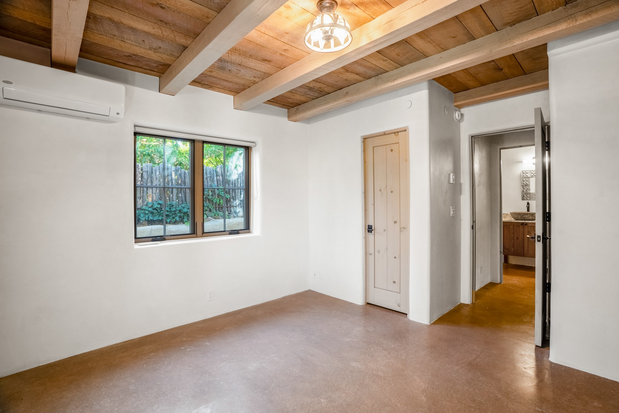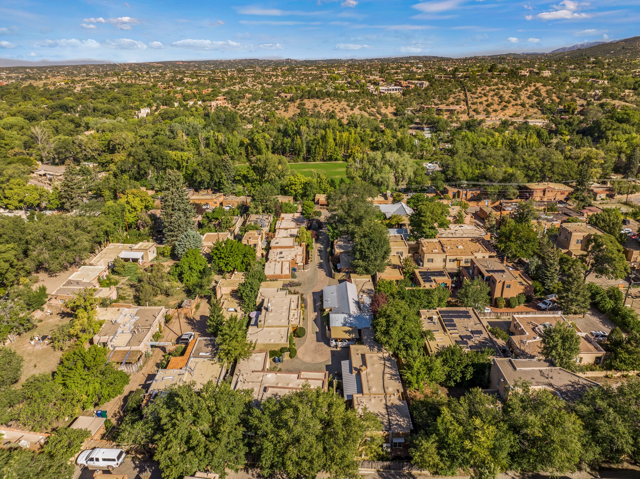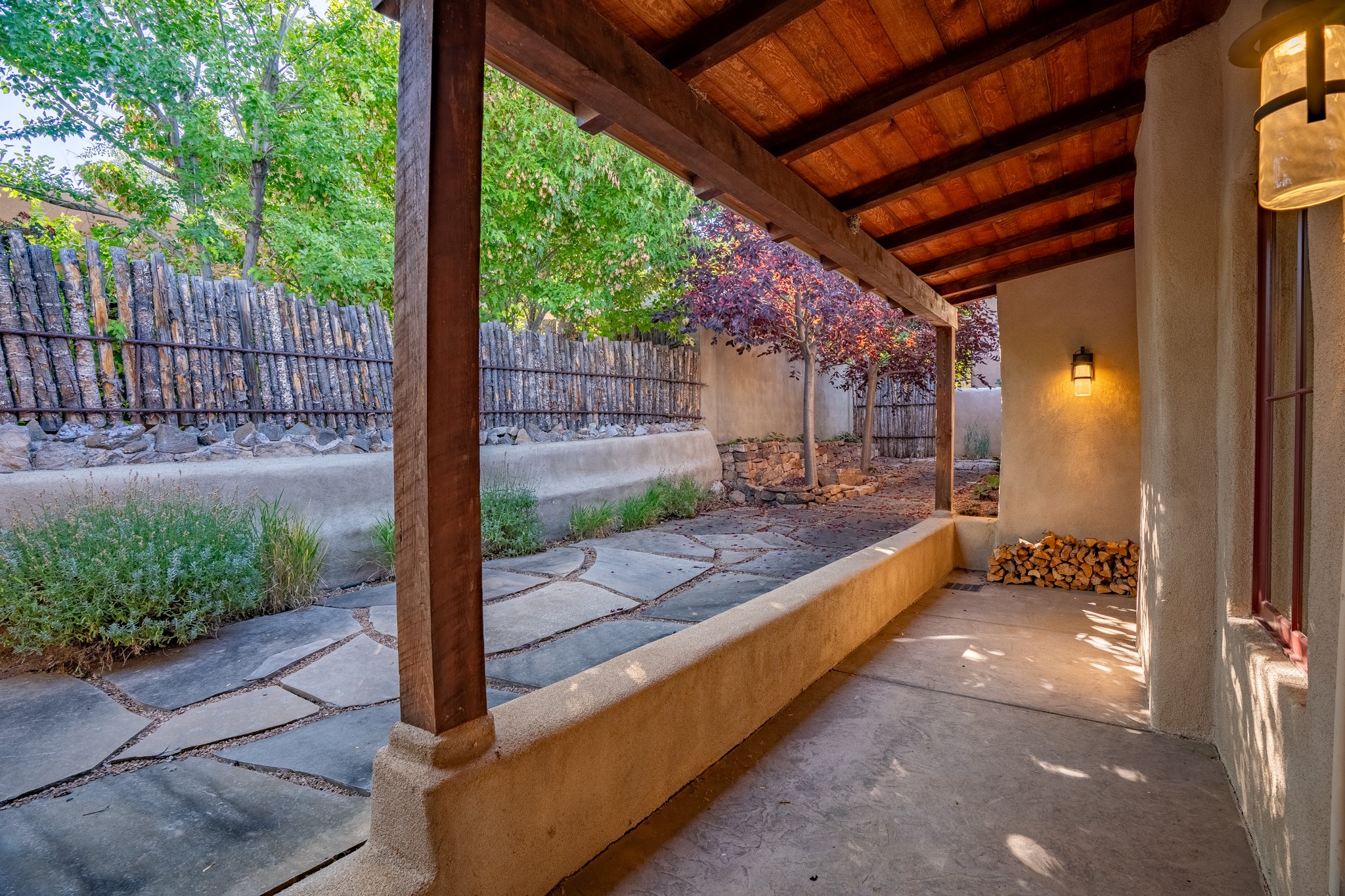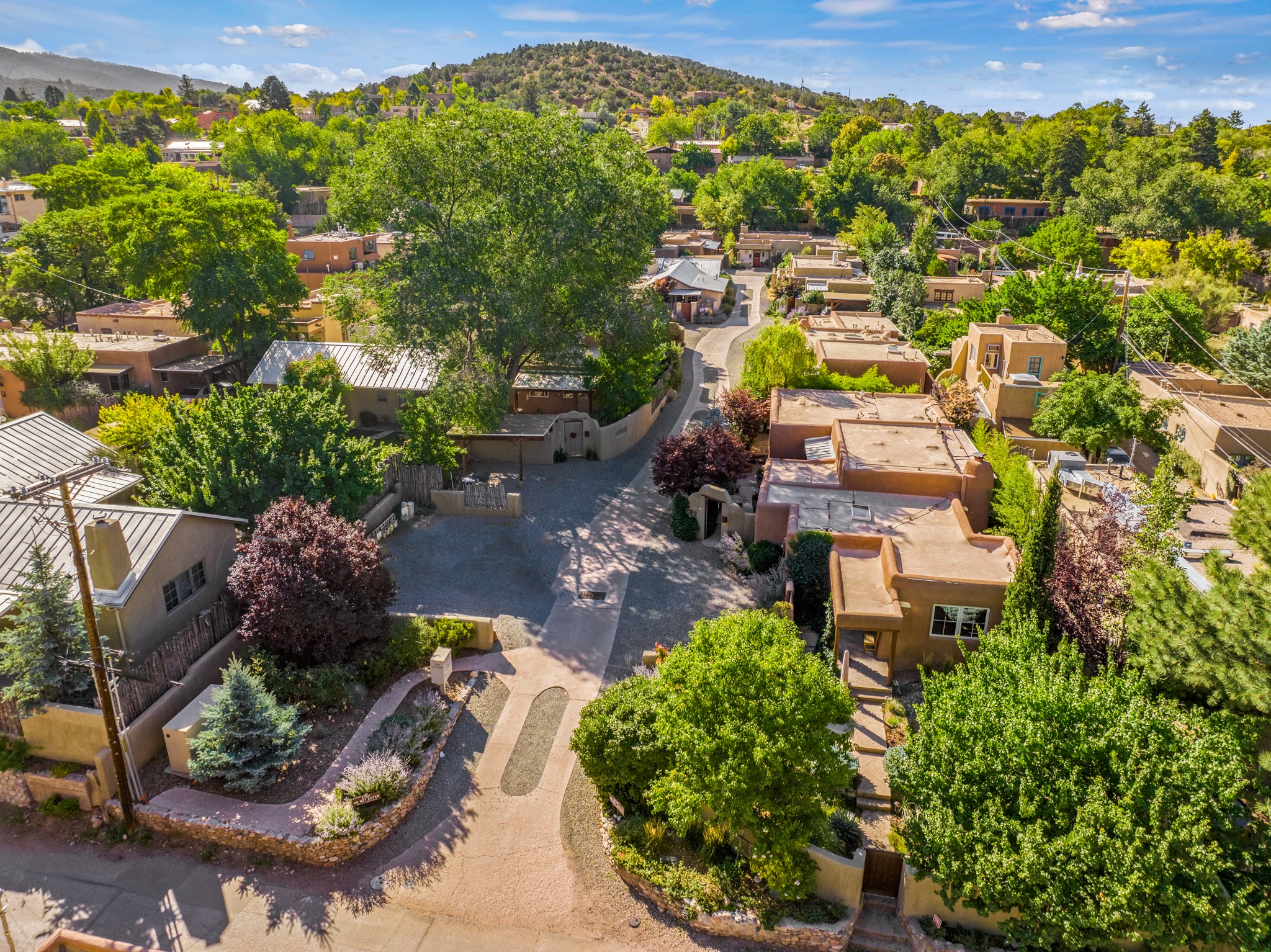 Exuding pride of ownership! Absolutely delightful and pristine 2 bedroom, 2 full bath home with 2 designated parking spaces (1 of which is a carport) single level downtown detached condo on Canyon Rd is minutes to the Santa Fe Plaza, Downtown Subscription, galleries, Patrick Smith Park & fine dining such as Geronimo, The Compound & many others. Charm and warmth abound this Northern New Mexico energy efficient (HERS rating of 53) adobe home built by True North Builders in 2014 with a pitched roof, plaster walls throughout including in the bedrooms and baths. This gem offers an open concept kitchen with granite counters, subway tile backsplash, soft close drawers/cabinets, stainless steel Jenn-air appliances, pantry with built-in shelving, and a breakfast bar. The living room is grand and offers high ceiling with beams and a wood burning fireplace. Both bathrooms are beautifully appointed with high end finishes. Owner's suite has an ensuite bath with double vanities, separate shower and tub and a custom-built walk-in closet. The outdoor spaces offer mature landscaping, drip irrigation, a private front entry walled and gated courtyard in addition to a sweet little yard with a large portal, flagstone patio, walk-way, various sitting areas and gardens. Features and amenities: Concrete floors-2nd bedroom with walk in closet-Ceiling fans-Wood doors-Security system-Radiant in floor heat-Mini splits-Water filtration system at kitchen sink faucet-Hard wired smoke & carbon monoxide detectors-Track lighting-Large laundry room with washer and dryer-Good bedroom separation-Plenty of storage and more. Short term rentals permitted by COA.