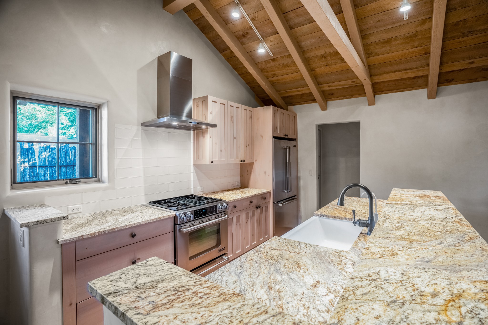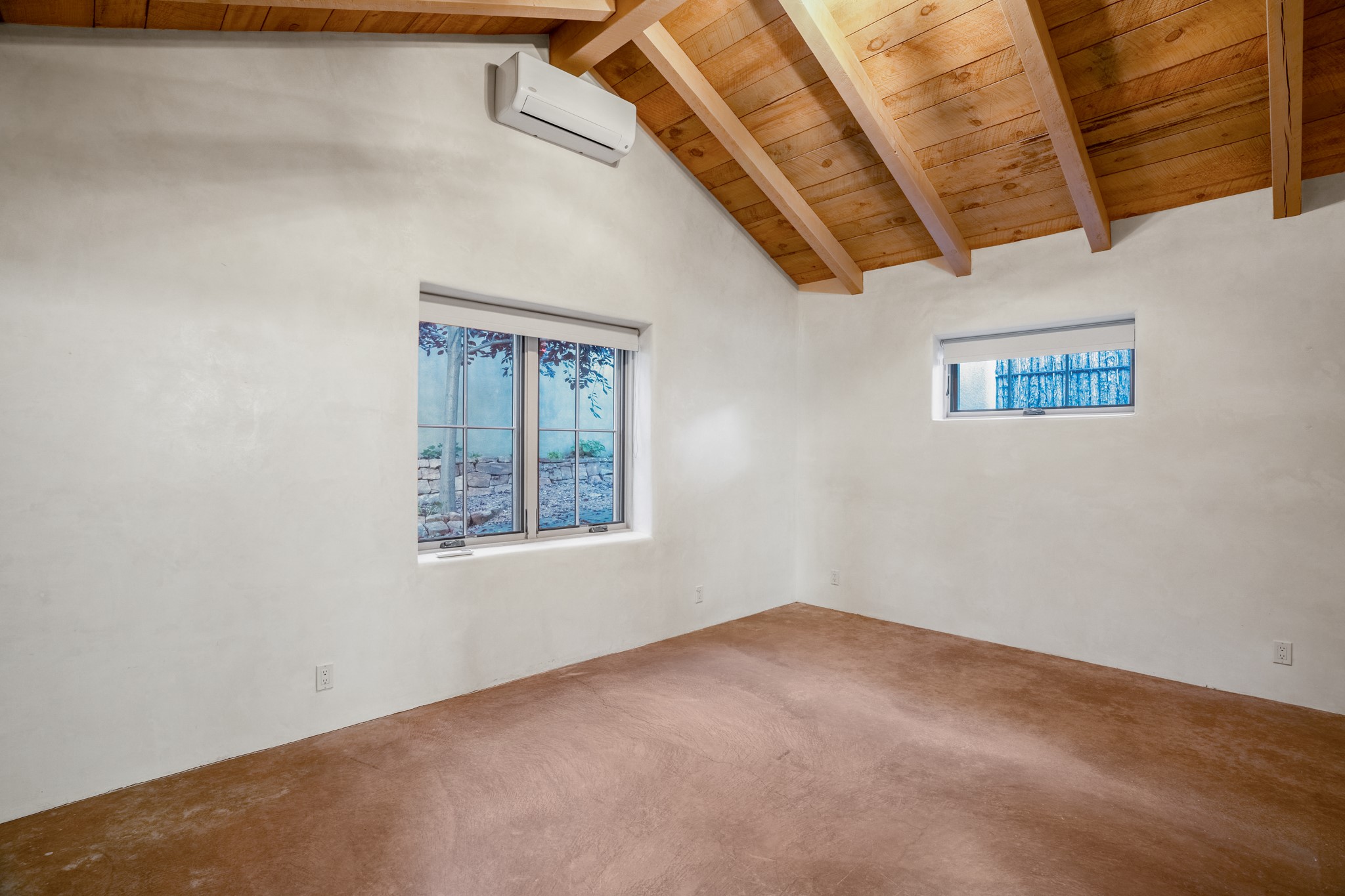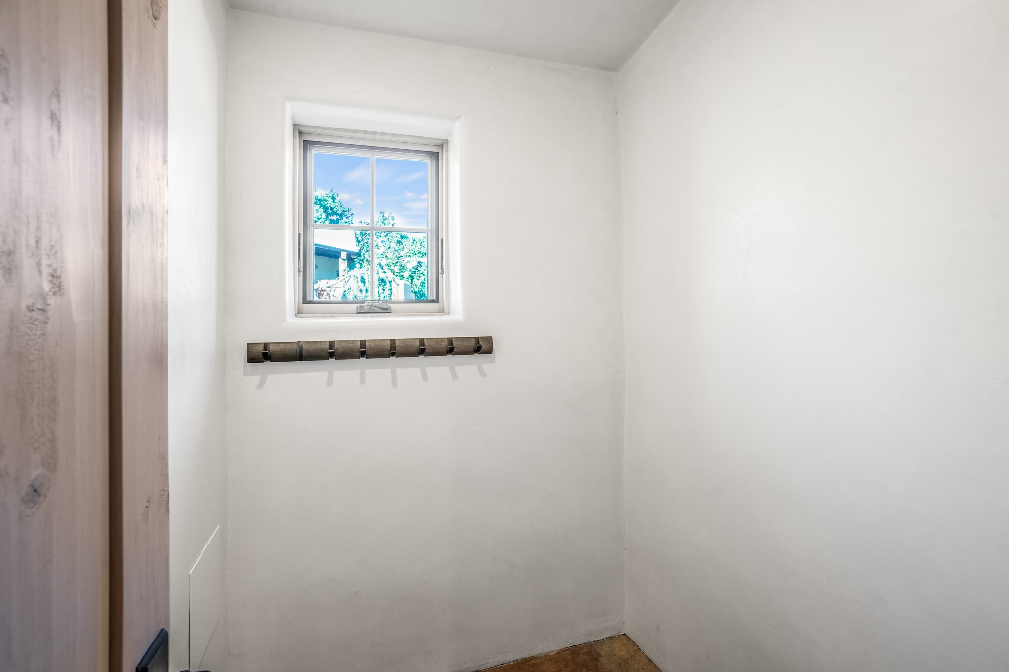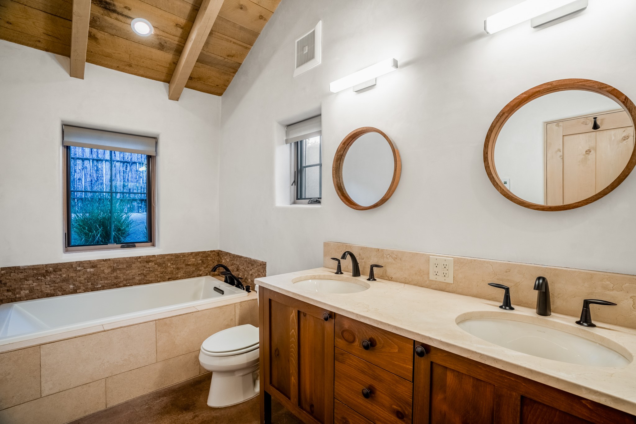 Exuding pride of ownership! Absolutely delightful and pristine 2 bedroom, 2 full bath home with 2 designated parking spaces (1 of which is a carport) single level downtown detached condo on Canyon Rd is minutes to the Santa Fe Plaza, Downtown Subscription, galleries, Patrick Smith Park & fine dining such as Geronimo, The Compound & many others. Charm and warmth abound this Northern New Mexico energy efficient (HERS rating of 53) adobe home built by True North Builders in 2014 with a pitched roof, plaster walls throughout including in the bedrooms and baths. This gem offers an open concept kitchen with granite counters, subway tile backsplash, soft close drawers/cabinets, stainless steel Jenn-air appliances, pantry with built-in shelving, and a breakfast bar. The living room is grand and offers high ceiling with beams and a wood burning fireplace. Both bathrooms are beautifully appointed with high end finishes. Owner's suite has an ensuite bath with double vanities, separate shower and tub and a custom-built walk-in closet. The outdoor spaces offer mature landscaping, drip irrigation, a private front entry walled and gated courtyard in addition to a sweet little yard with a large portal, flagstone patio, walk-way, various sitting areas and gardens. Features and amenities: Concrete floors-2nd bedroom with walk in closet-Ceiling fans-Wood doors-Security system-Radiant in floor heat-Mini splits-Water filtration system at kitchen sink faucet-Hard wired smoke & carbon monoxide detectors-Track lighting-Large laundry room with washer and dryer-Good bedroom separation-Plenty of storage and more. Short term rentals permitted by COA.