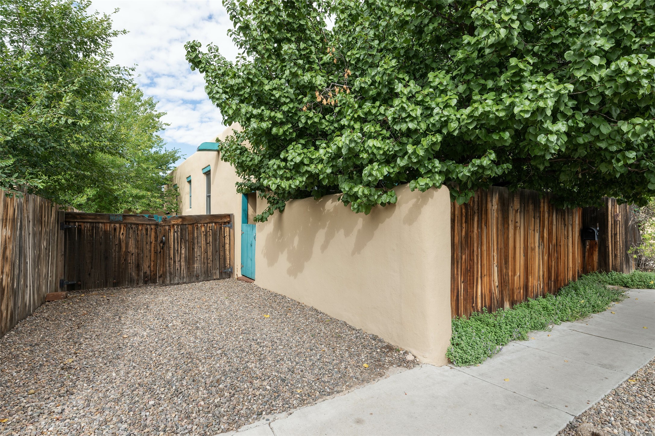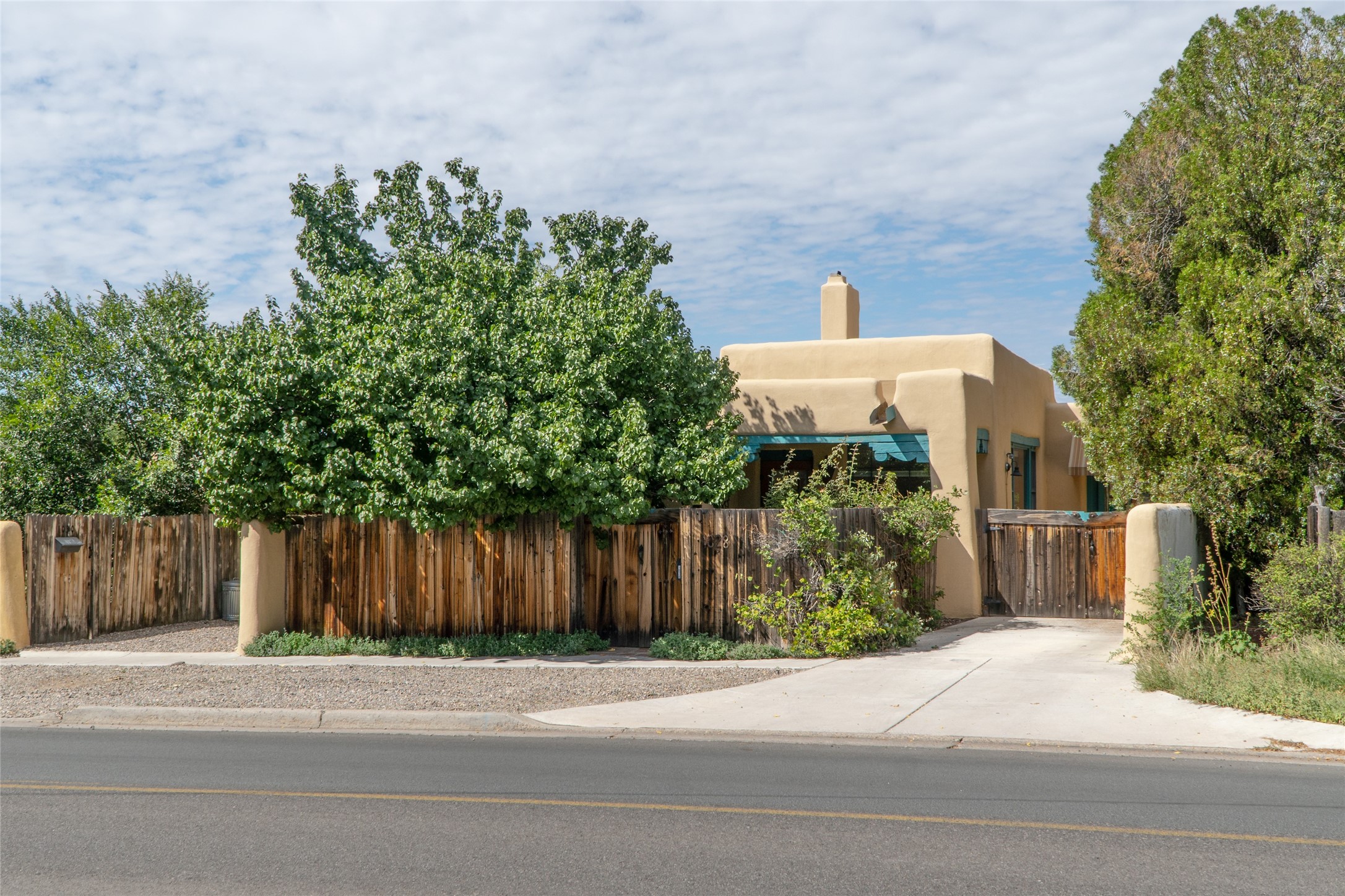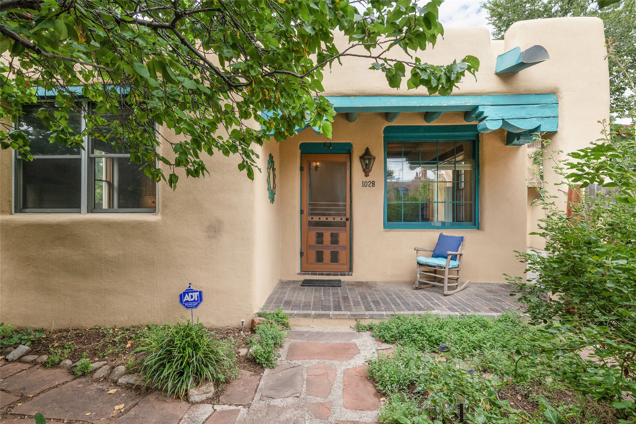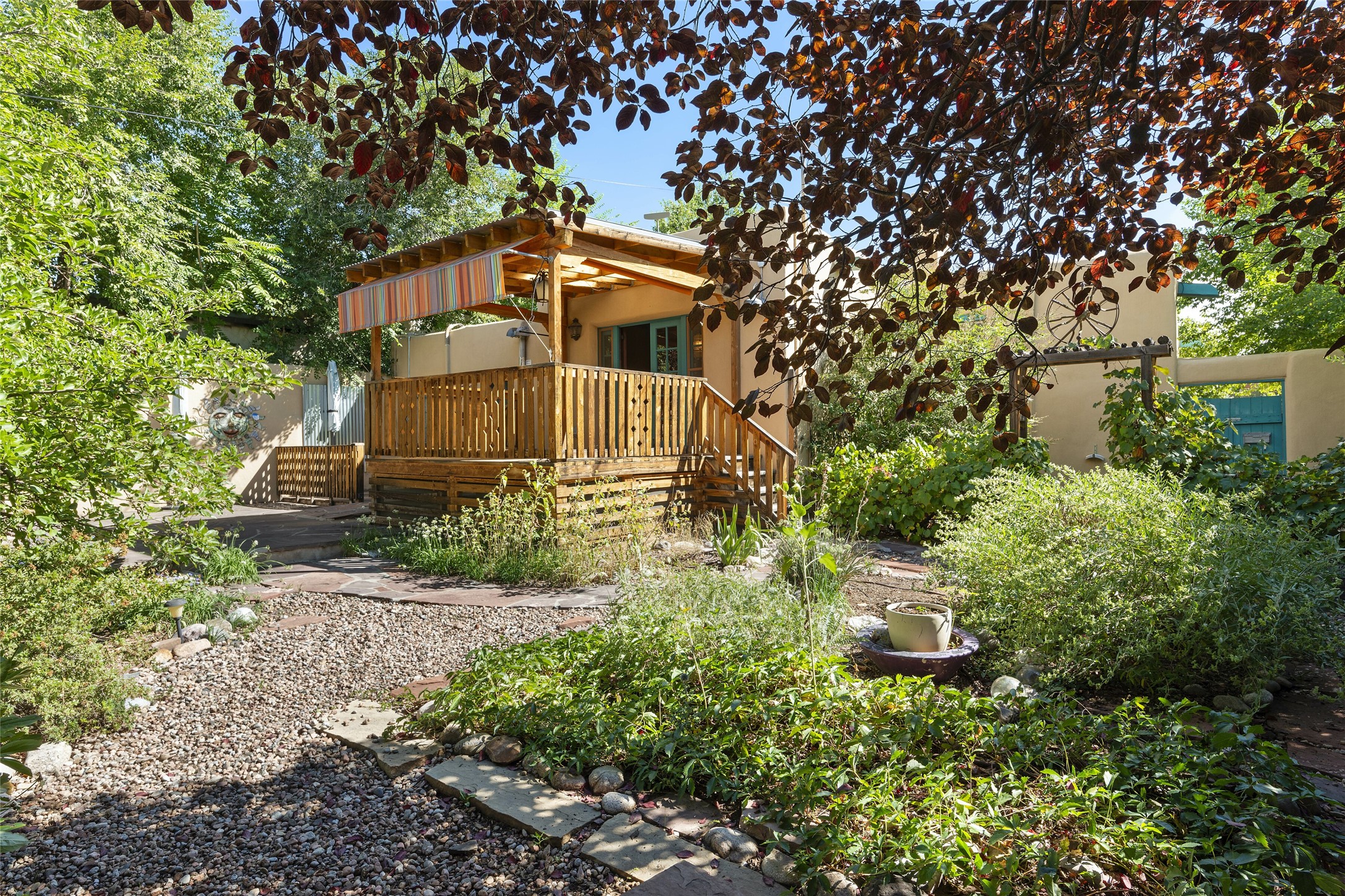 A hop and a skip to Clafoutis, Trader Joe's, Wholefoods around the corner, Santa Fe is on your doorstep. This delightful adobe home built in 1940 is a rare find, it exudes Santa Fe charm with vigas and beautiful, painted, wooden floors. Two of the bedrooms still have traditional cabinetry. The kitchen/dining area was plastered using American Clay, it has painted cabinetry and a genuine vintage Chambers range, just like Georgia O'Keefe's, with French doors leading out to the balcony and a glorious garden which is on drip. The attached garage was converted into a studio with a second bathroom. The studio can be used as a flex room or a third bedroom. The house was updated in 2014 forward, with a new bathroom, new water heater, galvanized pipes were replaced between 2016-2018. In 2020 it was re-stuccoed and a new roof put on with a transferable warranty until 2030. It has mini splits and a Whole House Water Filtration System was added. It has been loved and cared for and kept in good condition. The fireplace is non-functional.