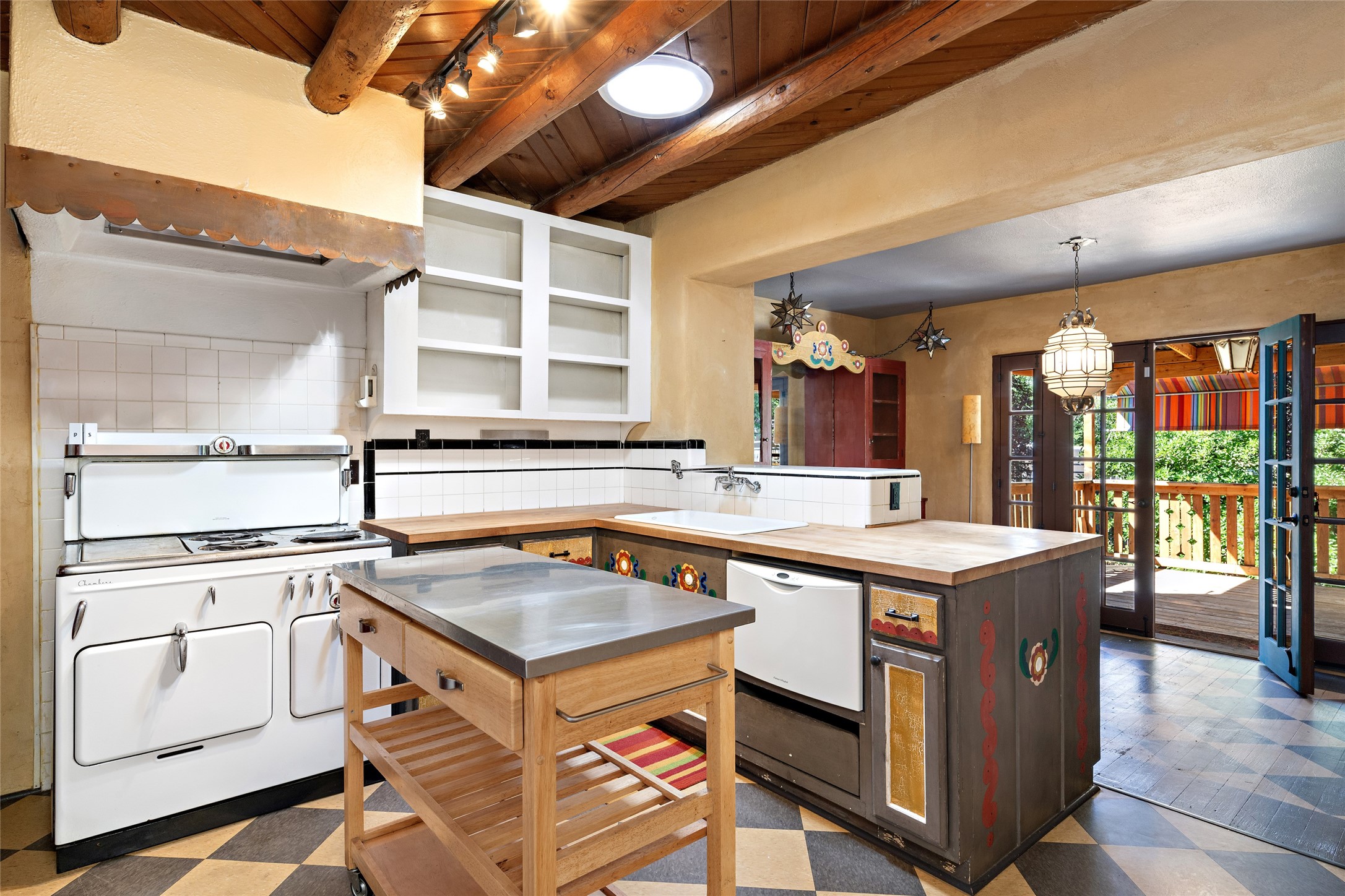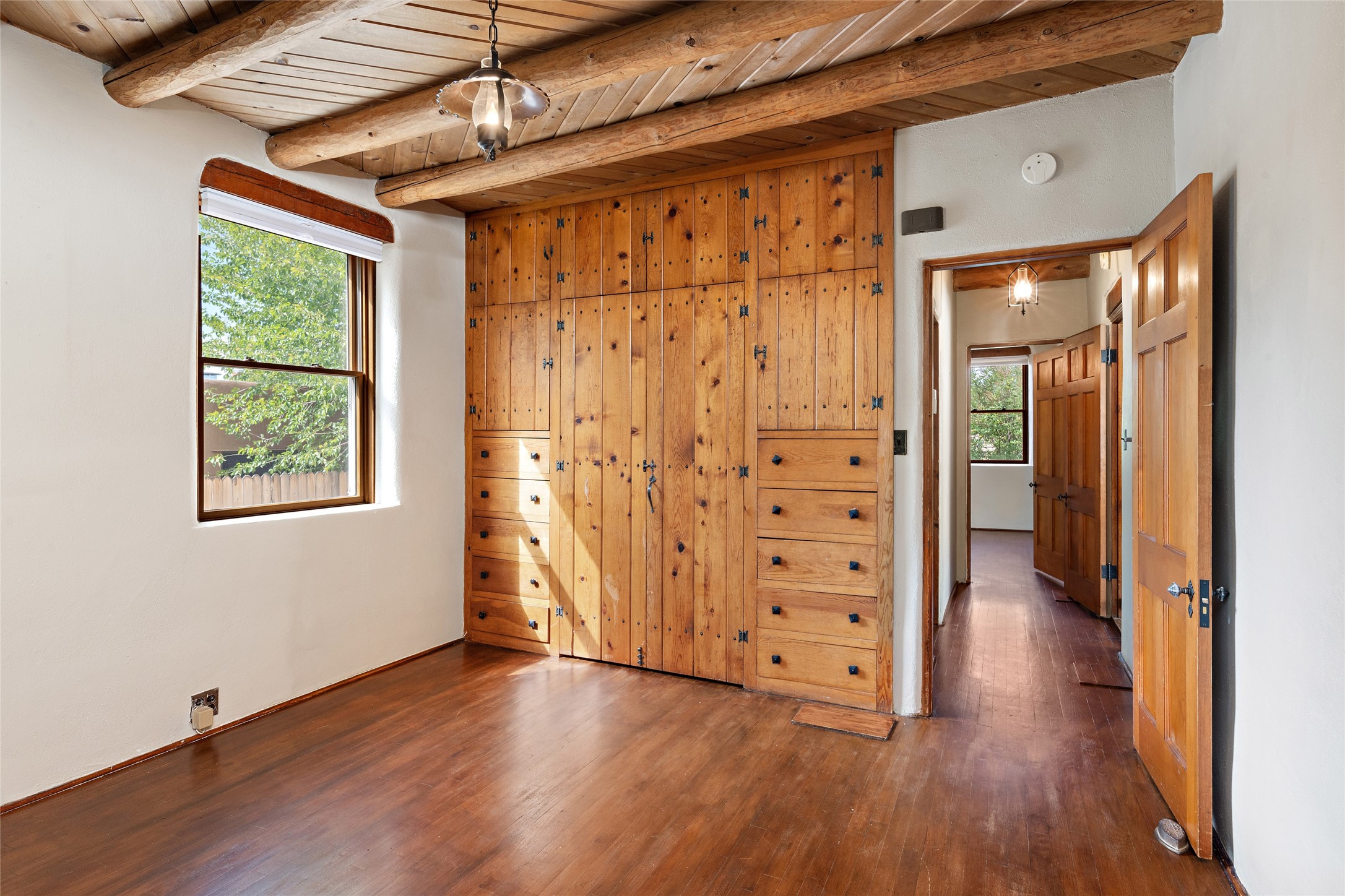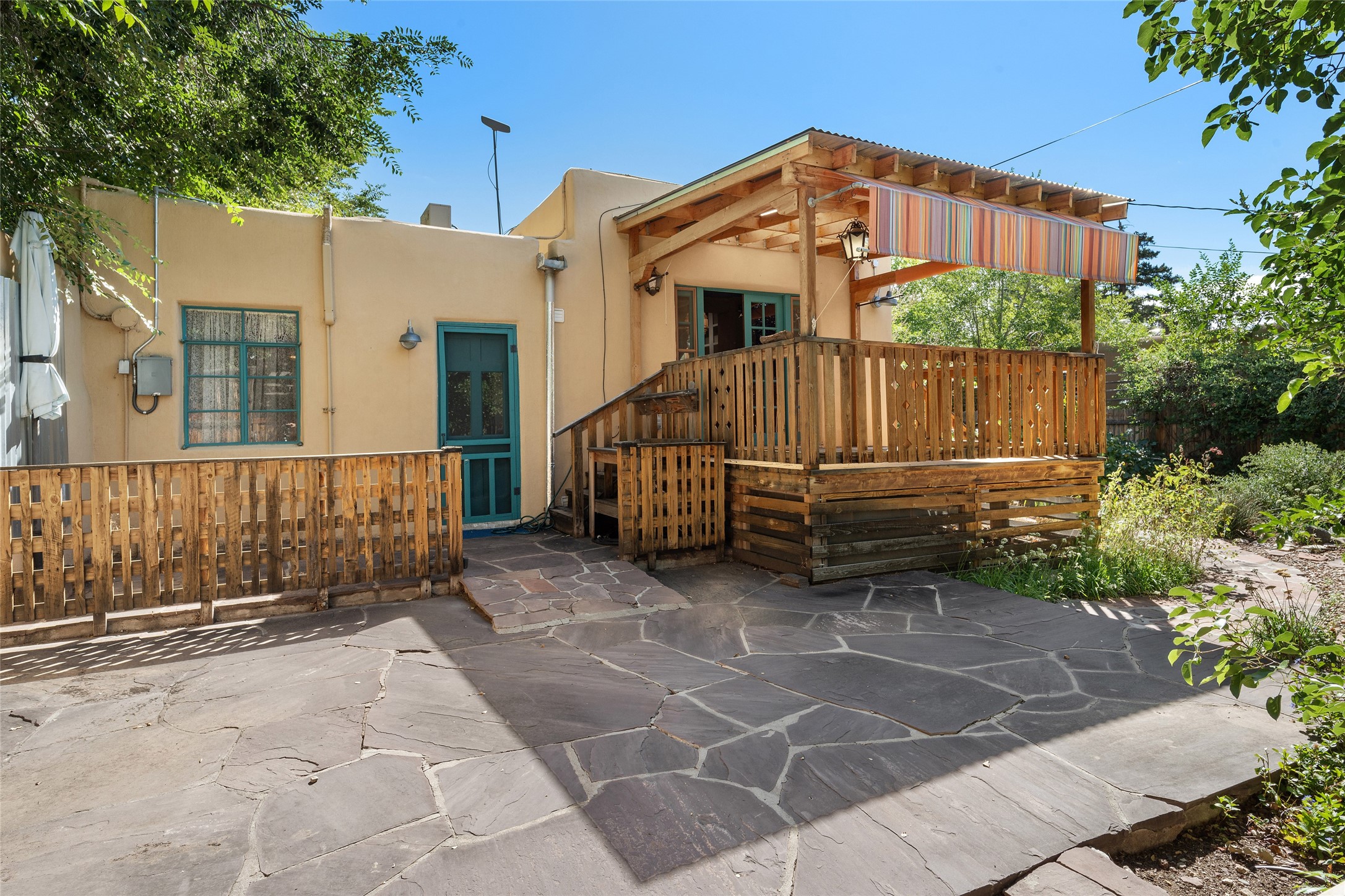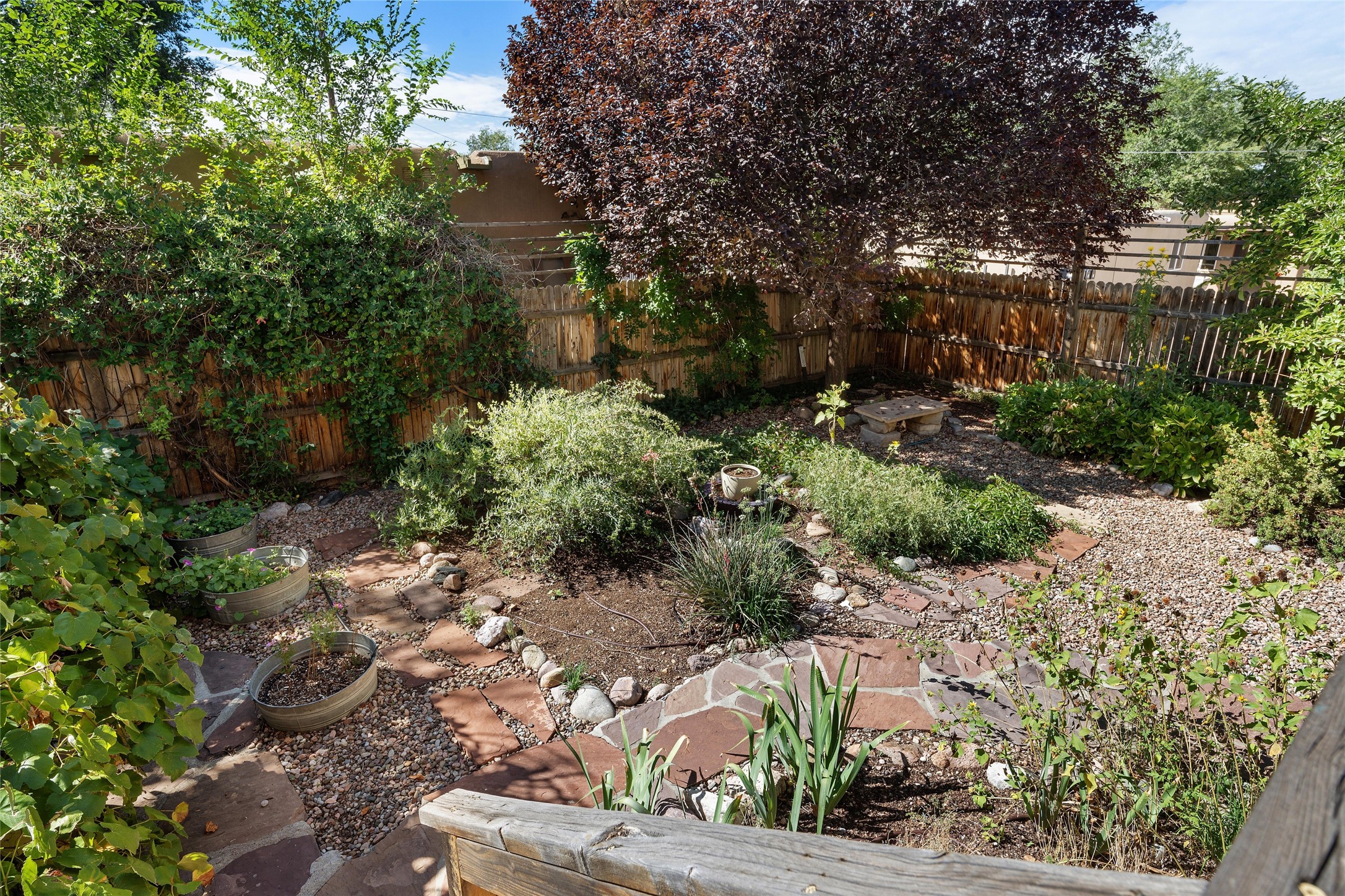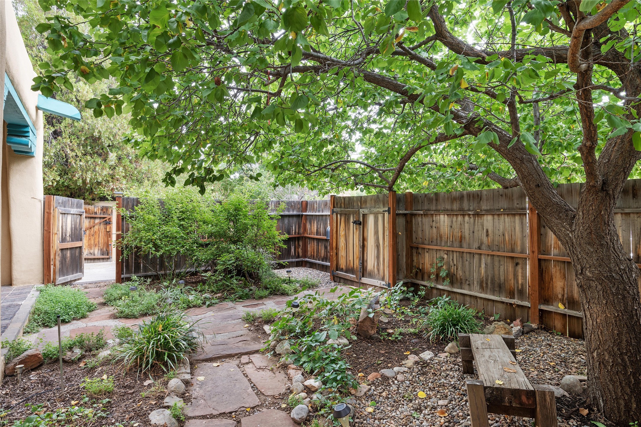 A hop and a skip to Clafoutis, Trader Joe's, Wholefoods around the corner, Santa Fe is on your doorstep. This delightful adobe home built in 1940 is a rare find, it exudes Santa Fe charm with vigas and beautiful, painted, wooden floors. Two of the bedrooms still have traditional cabinetry. The kitchen/dining area was plastered using American Clay, it has painted cabinetry and a genuine vintage Chambers range, just like Georgia O'Keefe's, with French doors leading out to the balcony and a glorious garden which is on drip. The attached garage was converted into a studio with a second bathroom. The studio can be used as a flex room or a third bedroom. The house was updated in 2014 forward, with a new bathroom, new water heater, galvanized pipes were replaced between 2016-2018. In 2020 it was re-stuccoed and a new roof put on with a transferable warranty until 2030. It has mini splits and a Whole House Water Filtration System was added. It has been loved and cared for and kept in good condition. The fireplace is non-functional.
